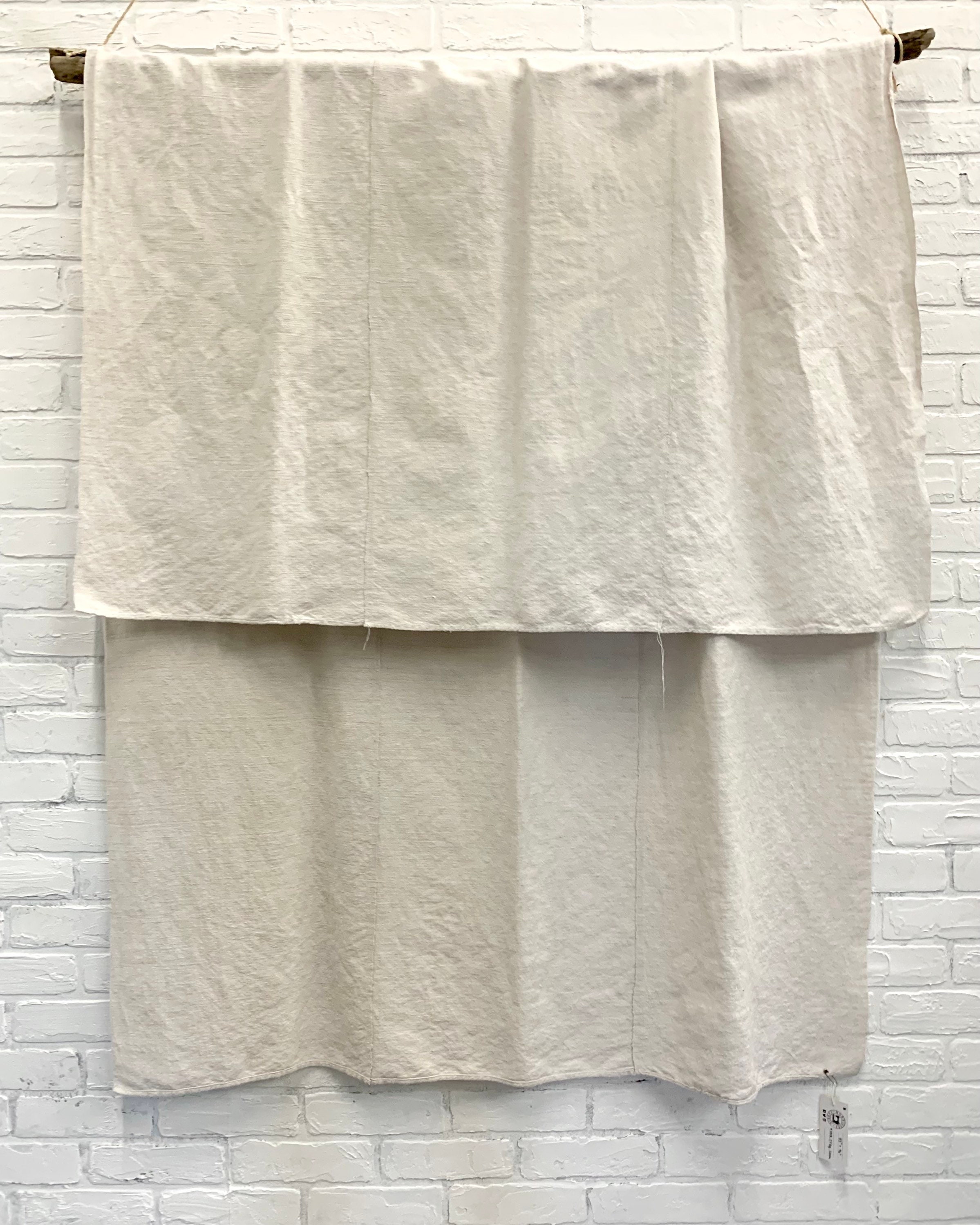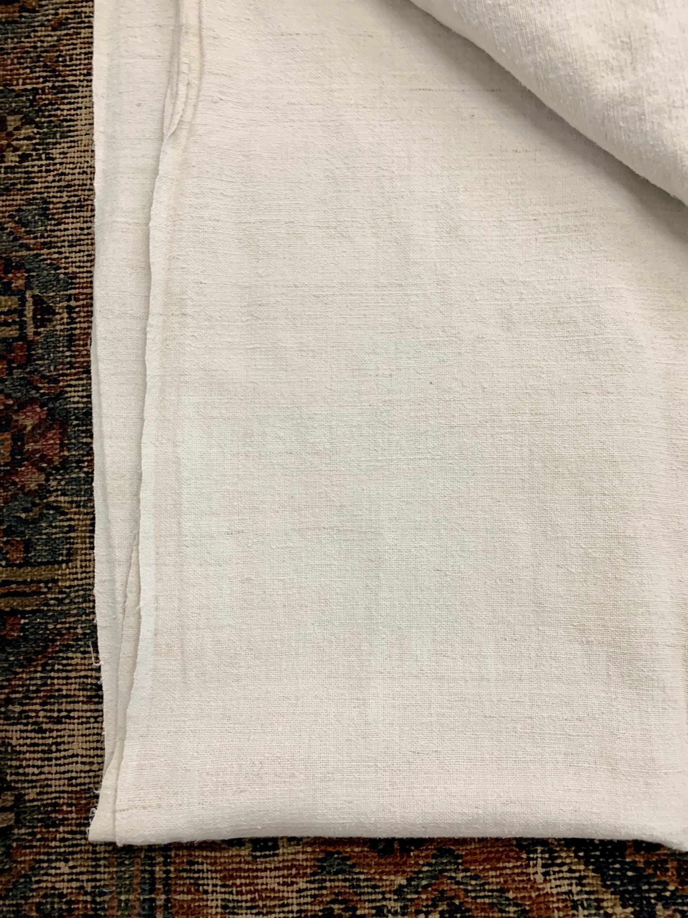 This is a nicely textured laundered linen in a soft natural color. Textiles of this size were used to cover fruit and vegetable wagons. Two or three narrower strips are joined to make one larger cloth.