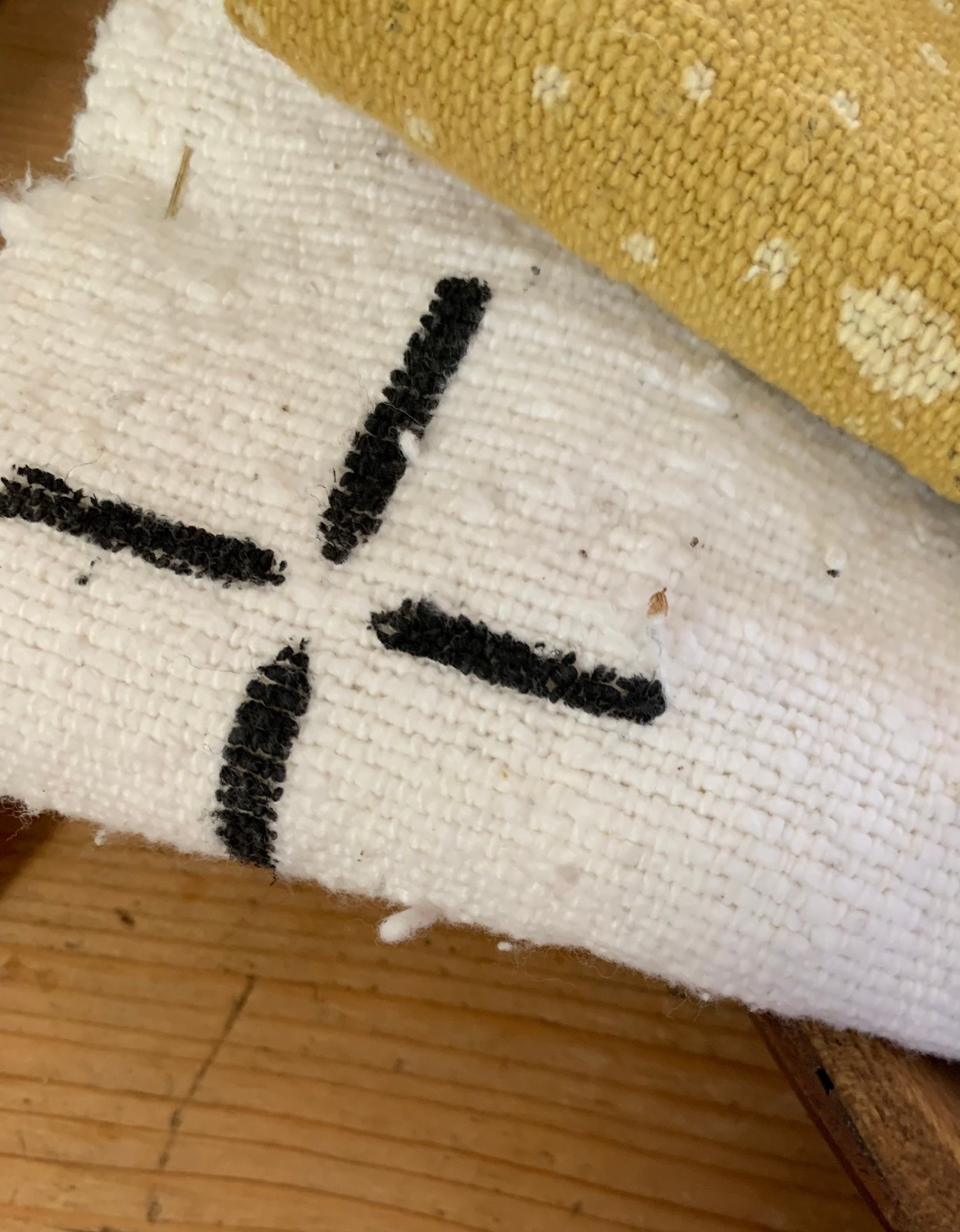 African Mud Cloth: table runner size! Washed and ready to use. Authentic white mud cloth with a simple black print cross design. Also called Bogolan. The ends are raw edges.