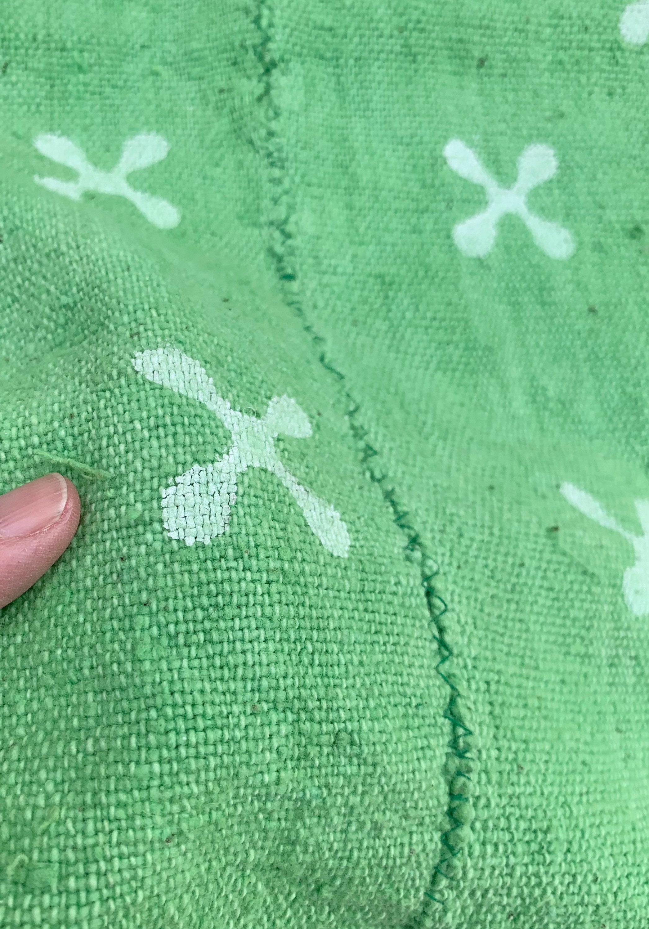 African mud cloth in a fresh spring green with a white print. Great as a throw, pillow covers, or upholstery. Washed and ready to use.