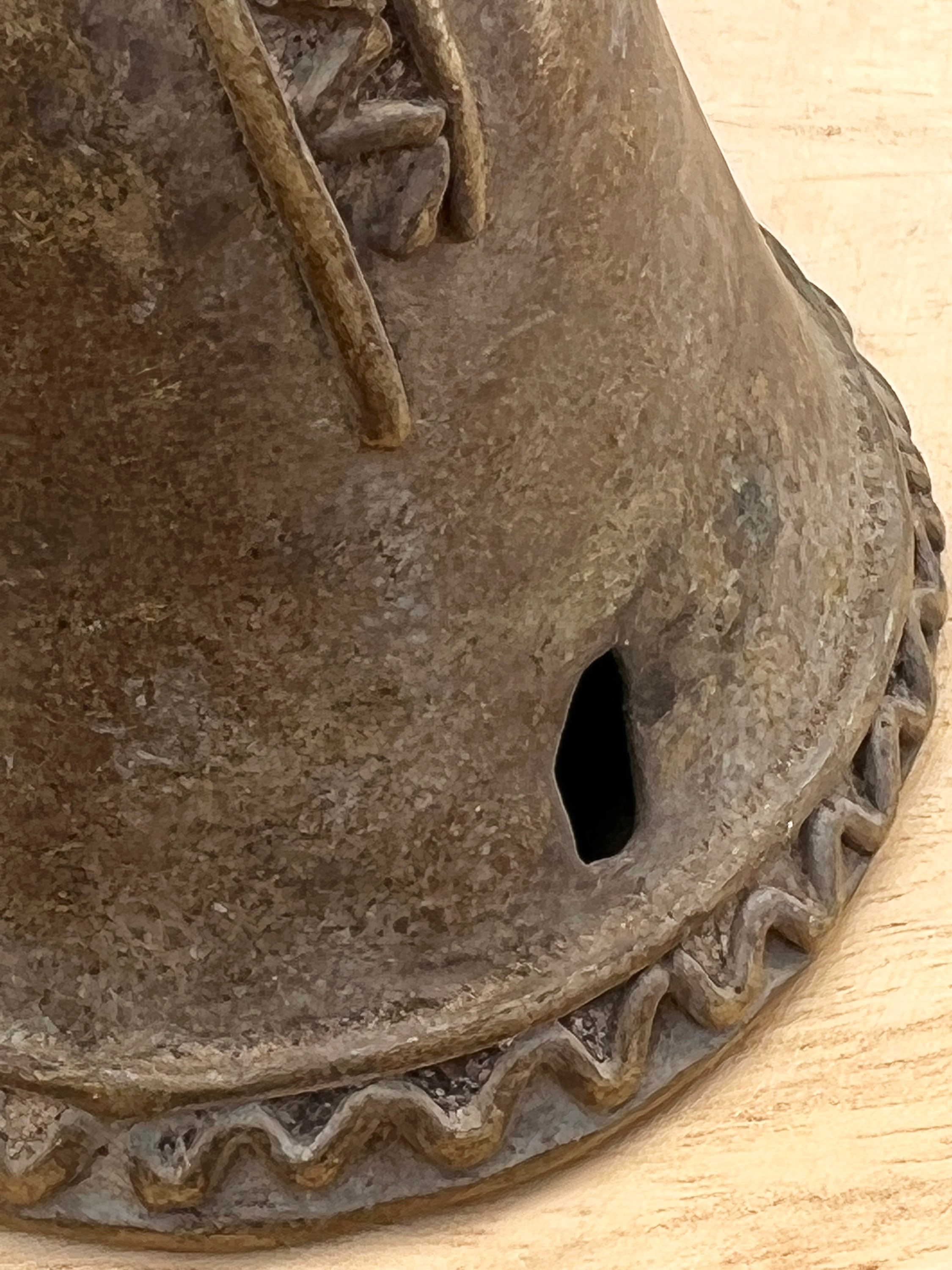 Rustic antique patina and zig-zag raised relief details along the top and around the base. Dents and irregular shape add personality. This bell does function and has a classic cow bell tone.
