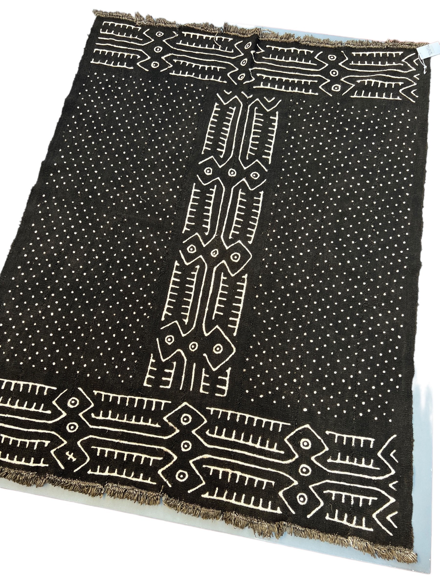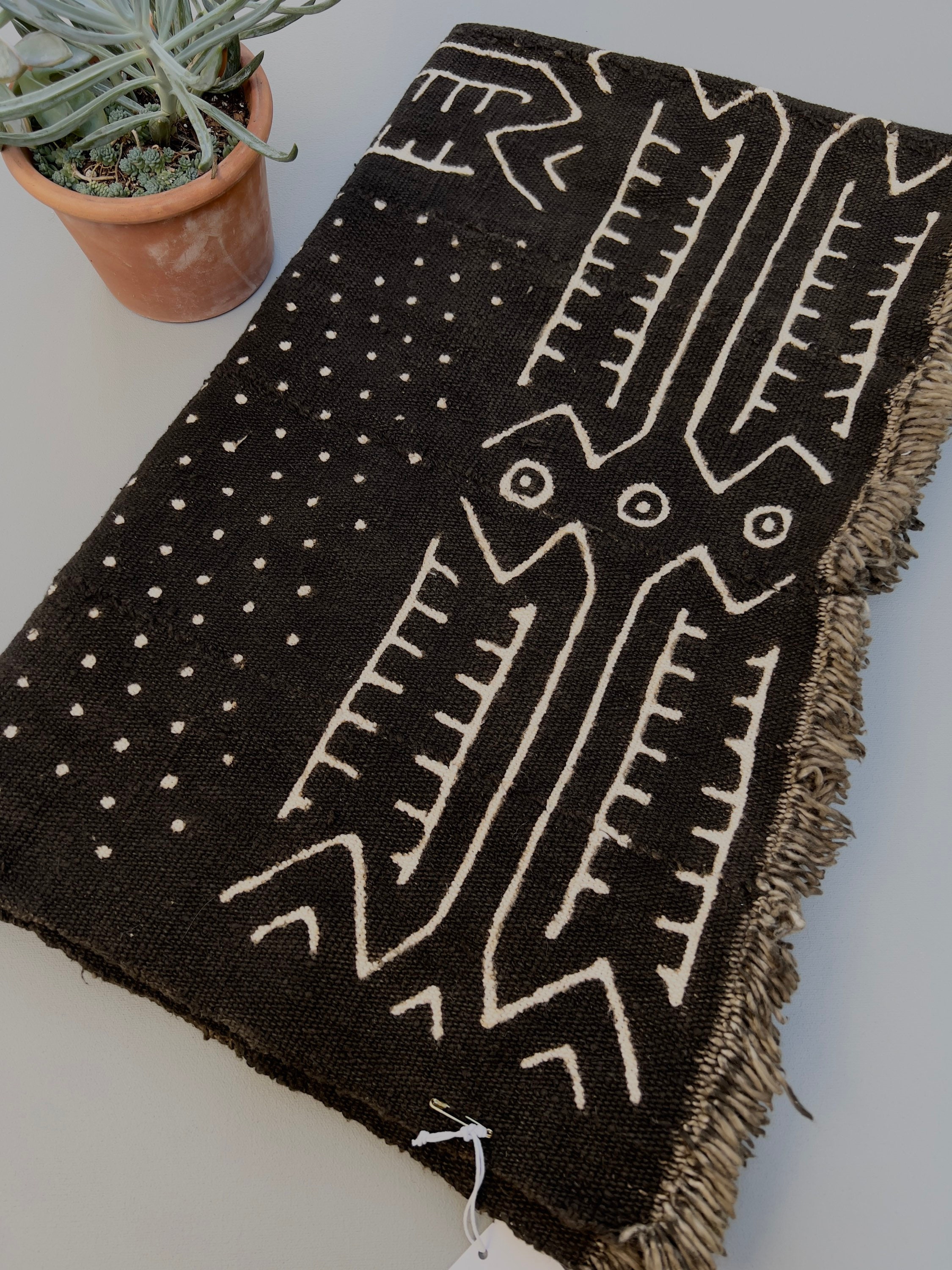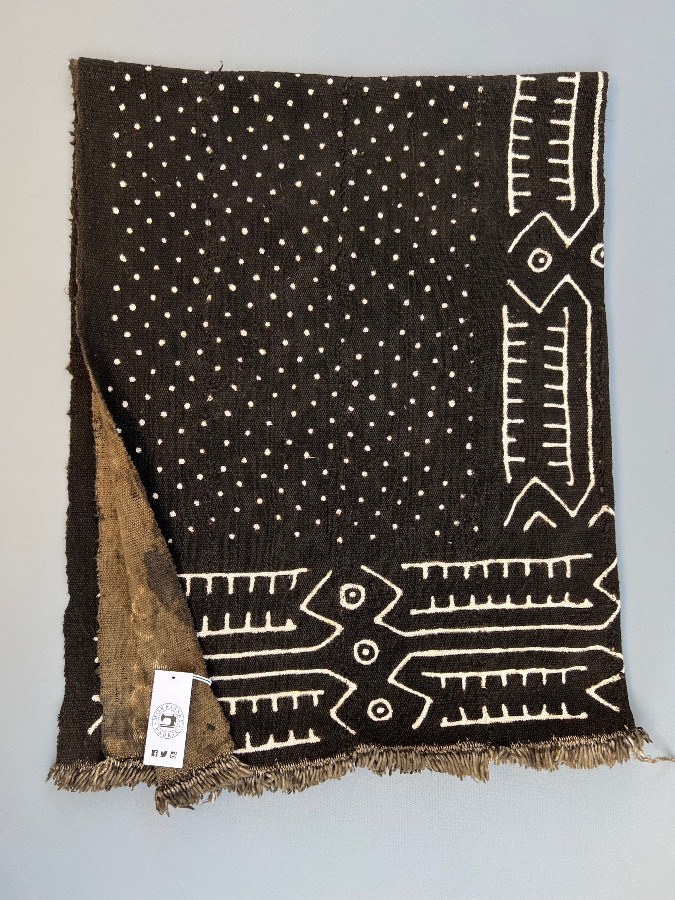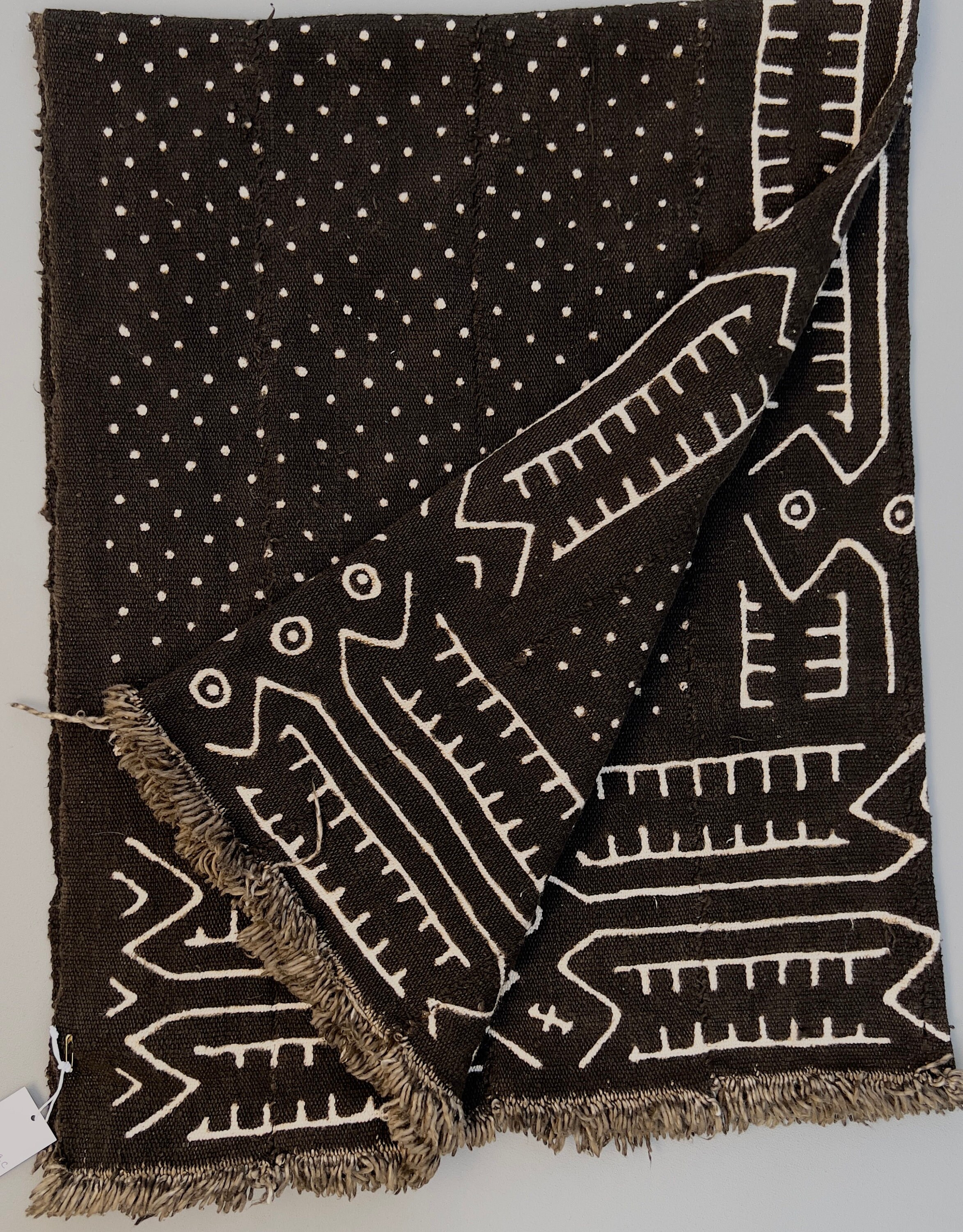 Washed and ready to use. Bogolan mud cloth dyed black with a neutral color African pattern. Made in Mali.