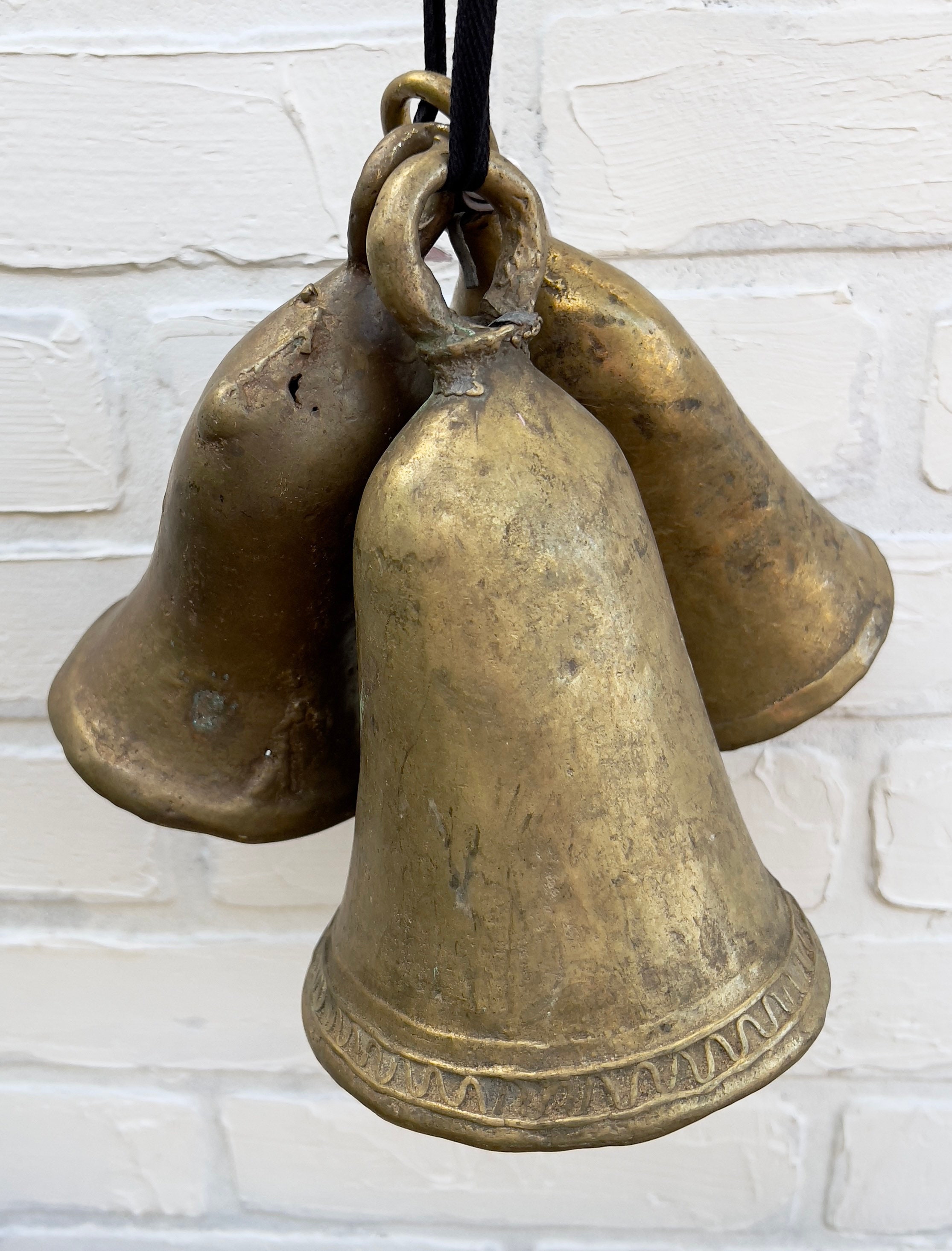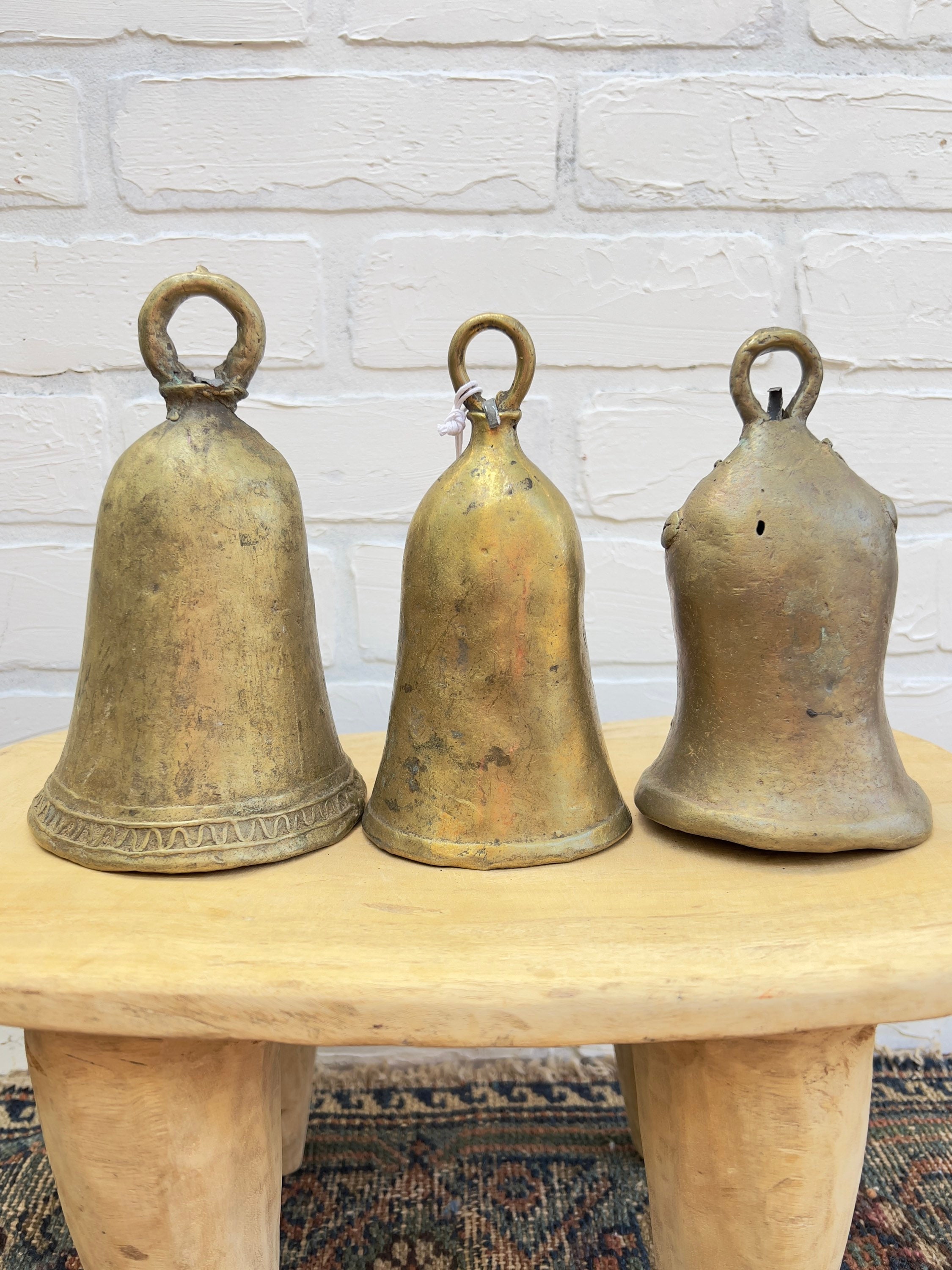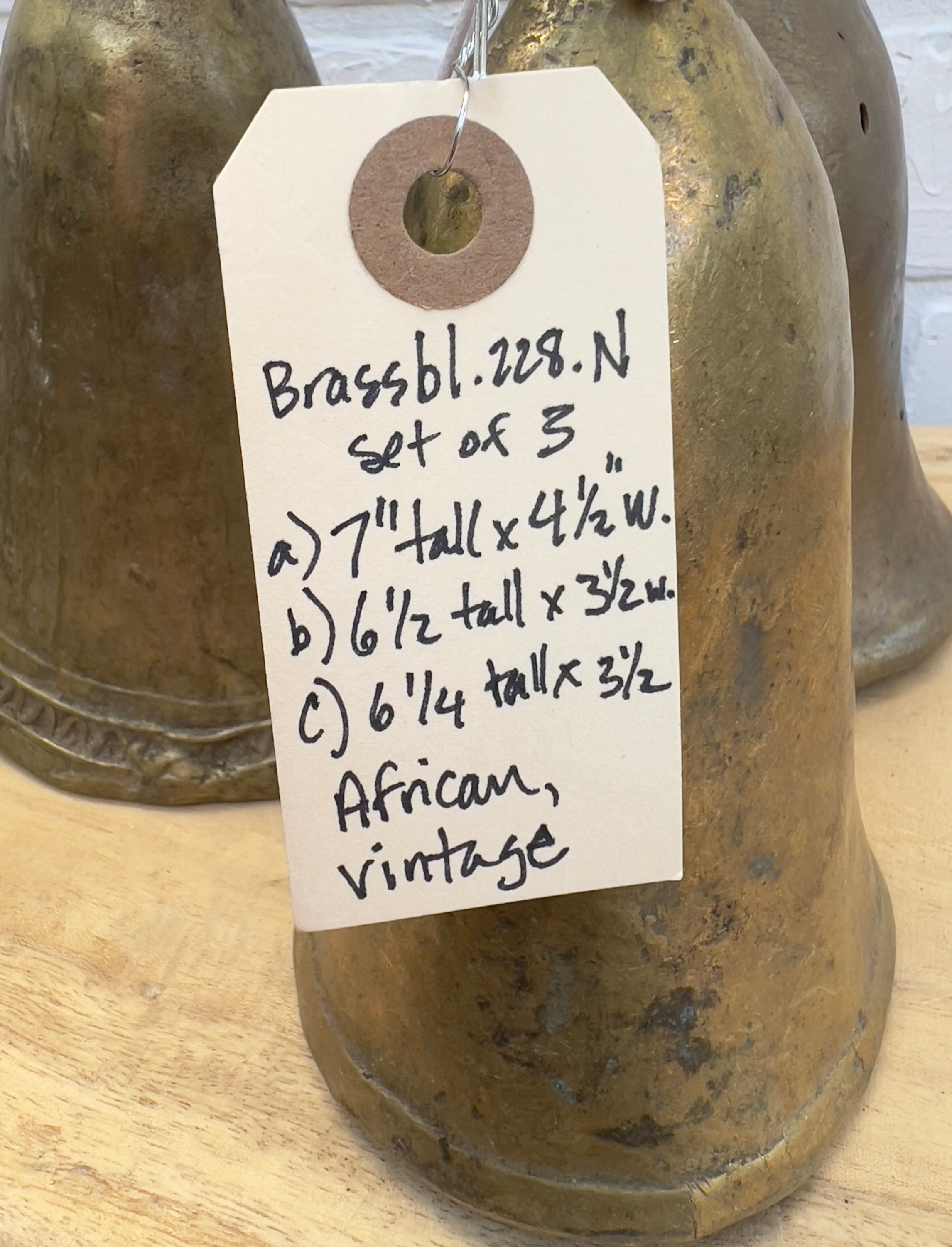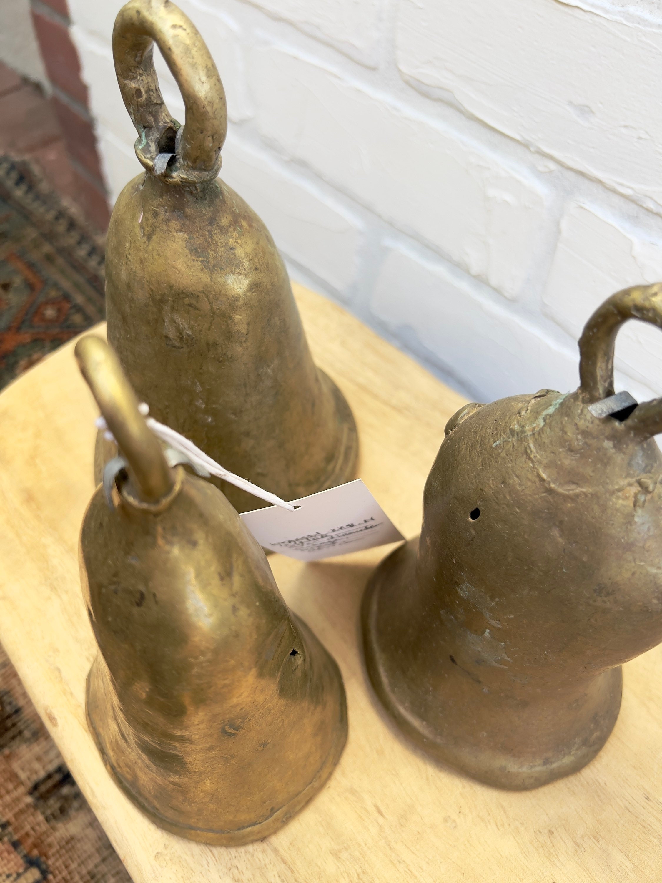 Fantastic vintage African bells. Set of 3 large bells hand made in solid brass originating from South Sudan. Rustic yet bright antique patina. Each bell is unique yet similar in size. Dents, cracks, small holes, and irregular shapes add personality. These bells function and have a classic bell tone.