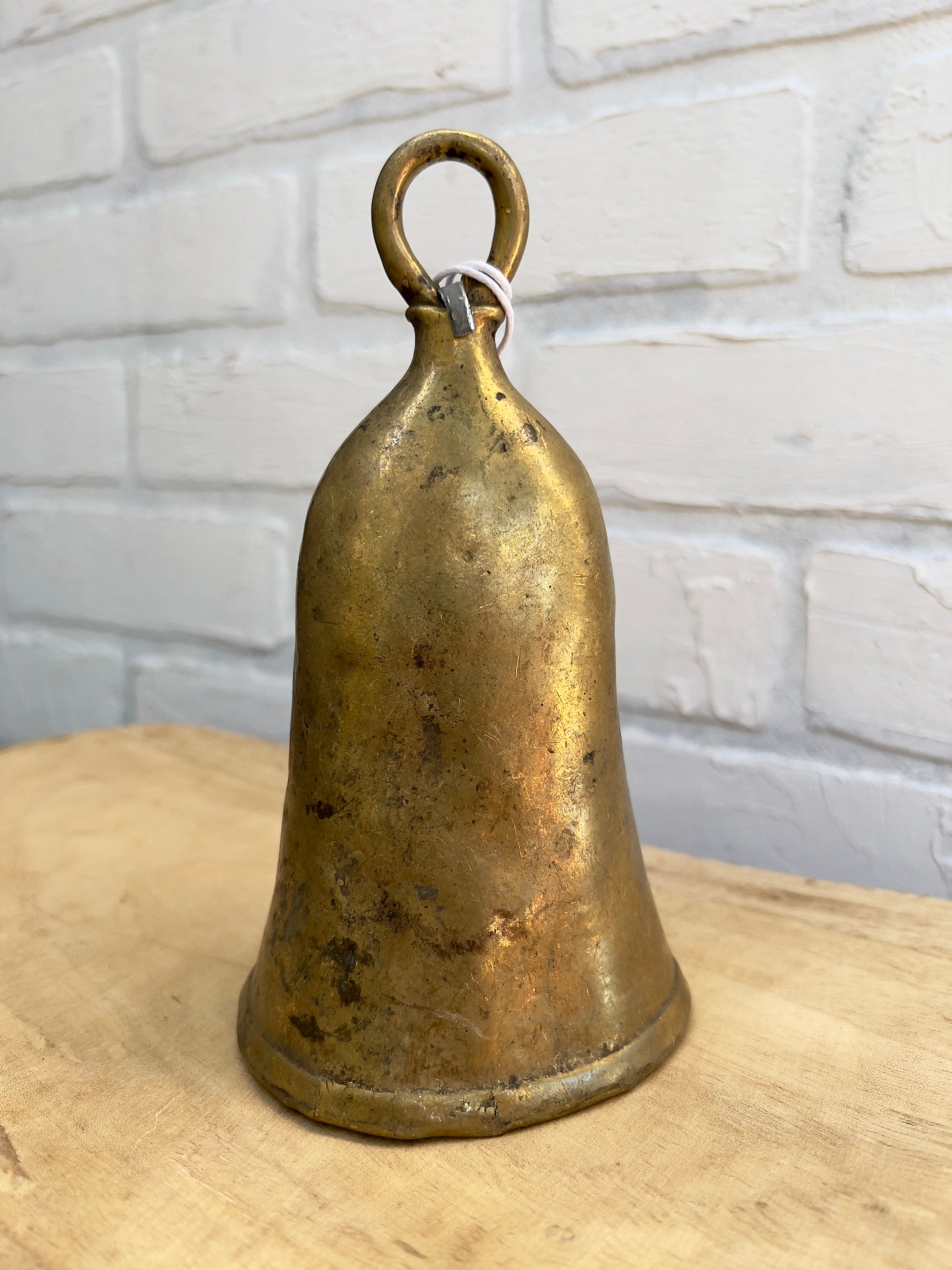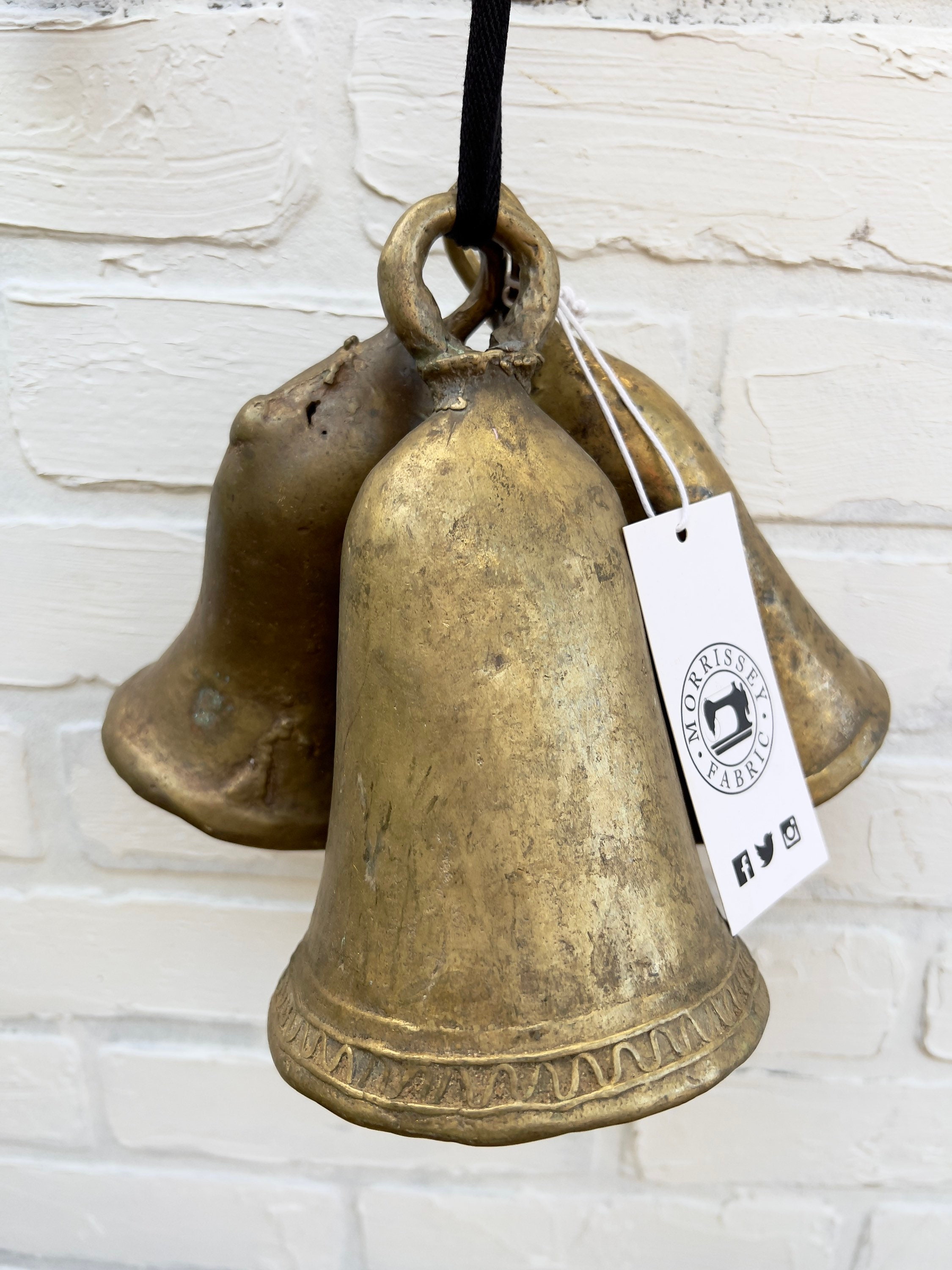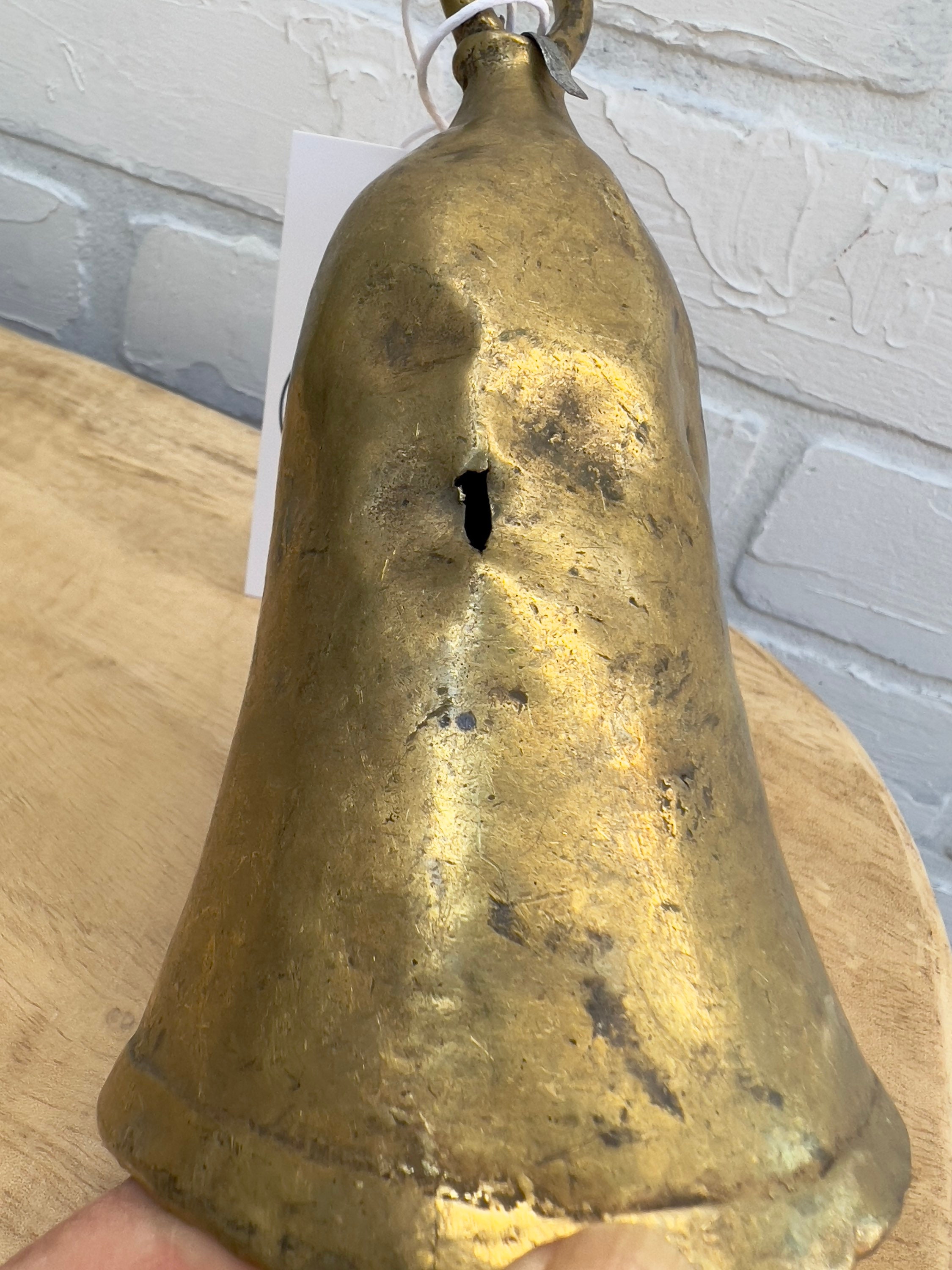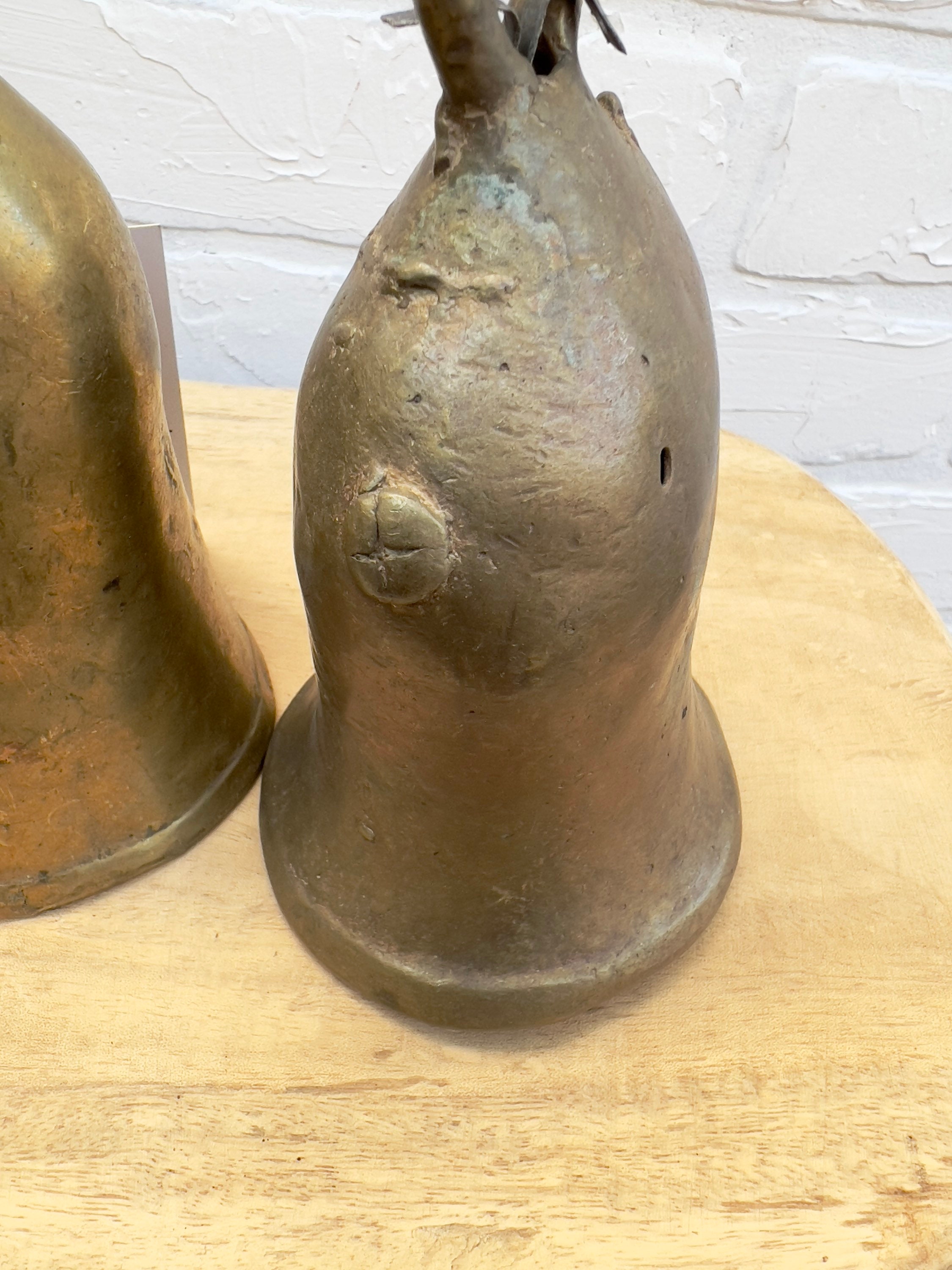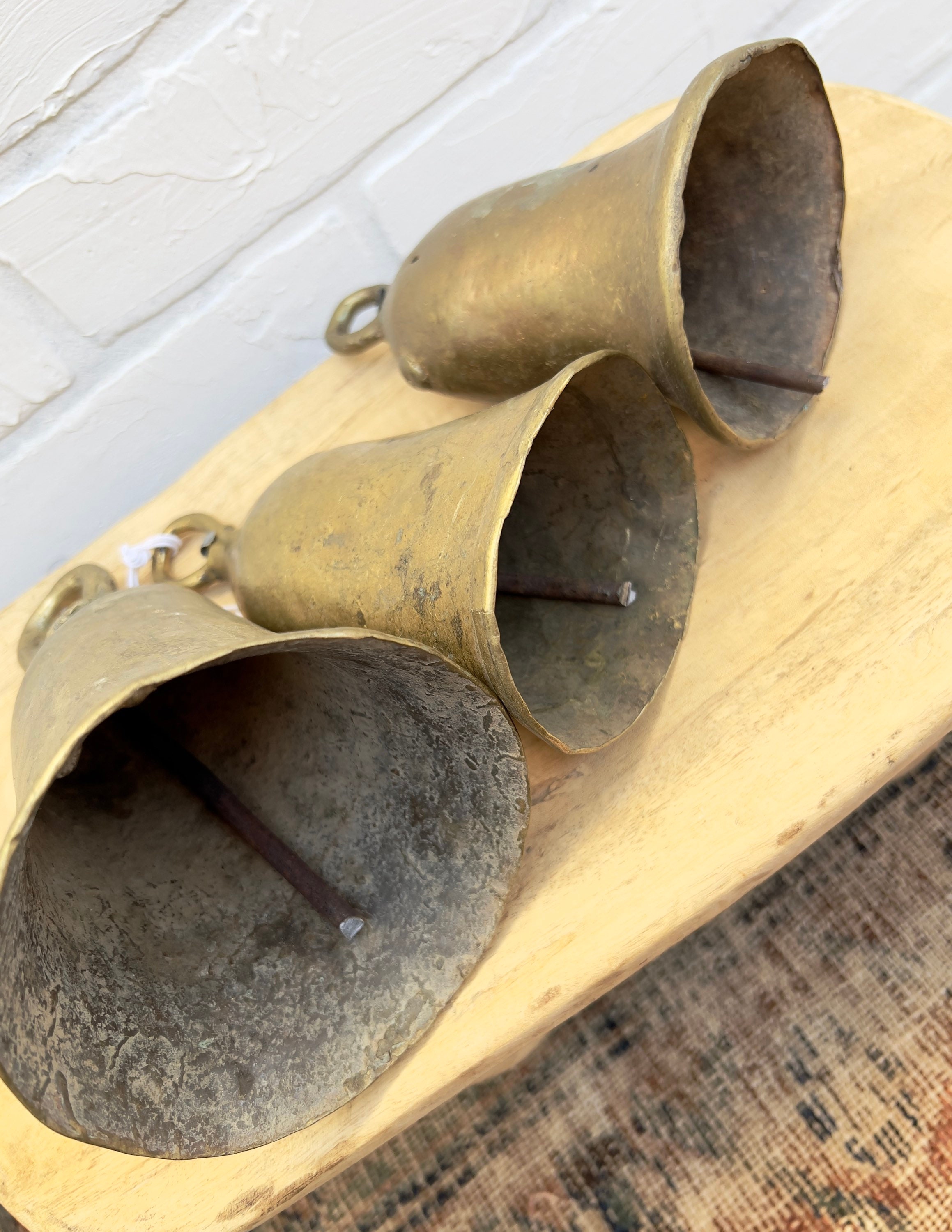 Fantastic vintage African bells. Set of 3 large bells hand made in solid brass originating from South Sudan. Rustic yet bright antique patina. Each bell is unique yet similar in size. Dents, cracks, small holes, and irregular shapes add personality. These bells function and have a classic bell tone.