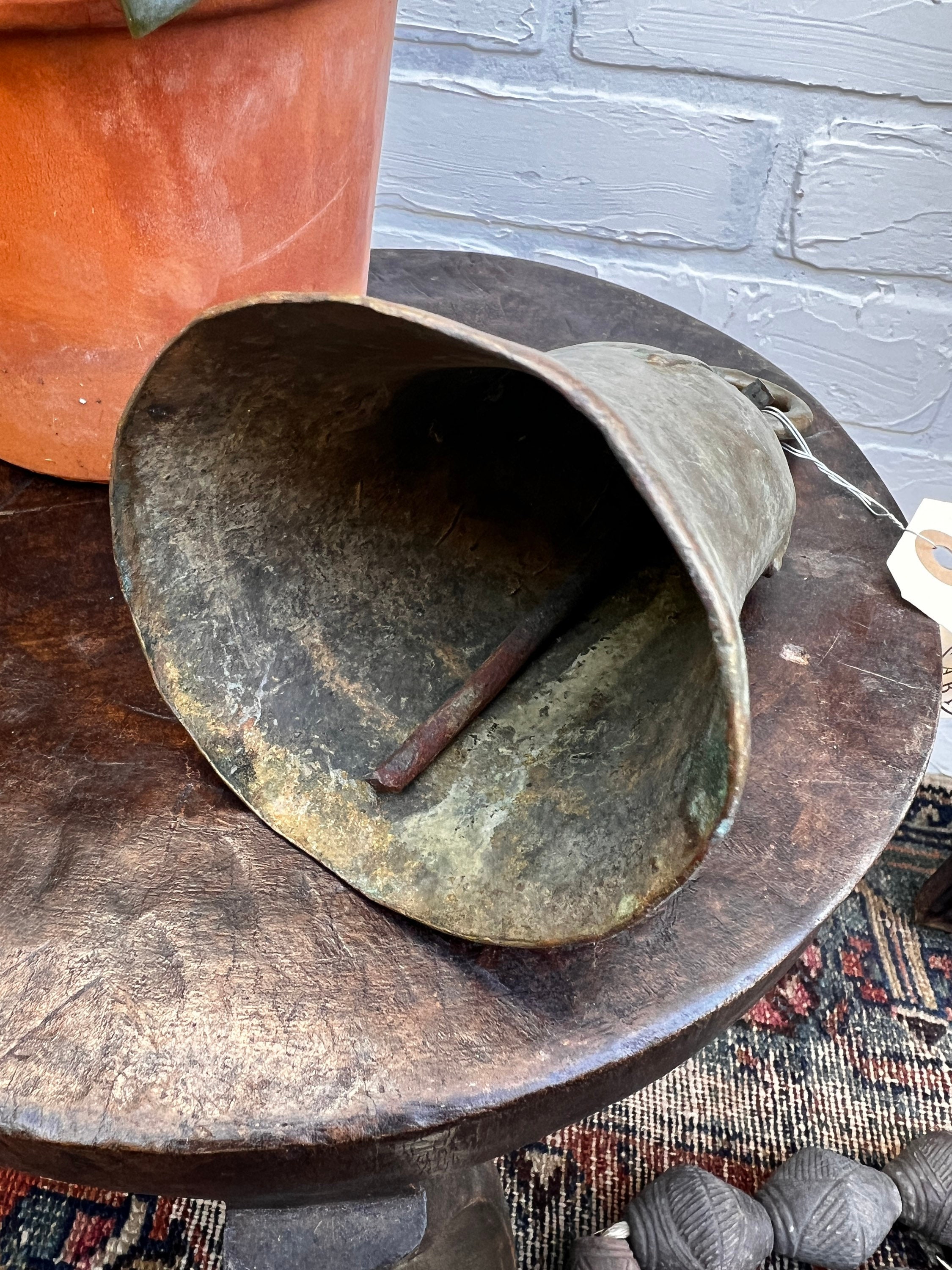 Large vintage cow bell, hand made in solid brass. This listing is for the large bell in front on the right in the photo with five bells.