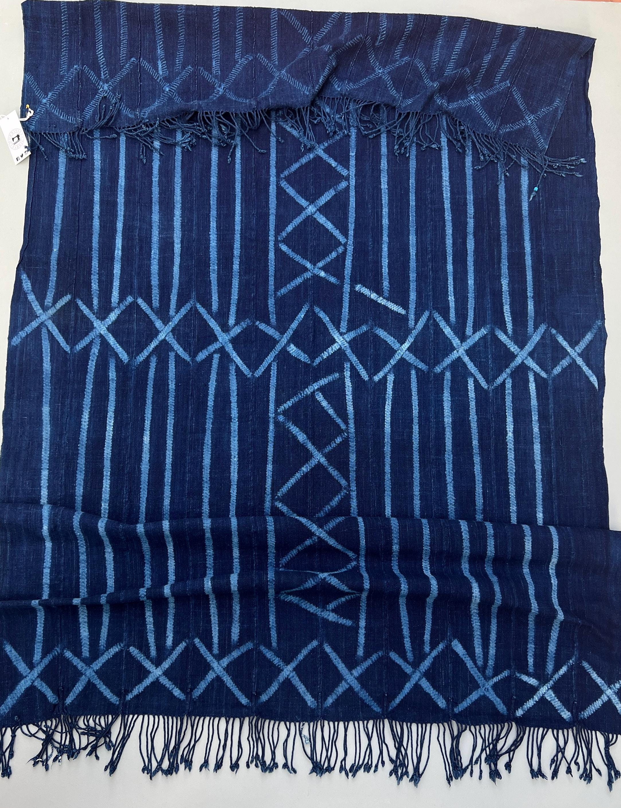 Vintage African Mud Cloth Throw for home decor. Large hand made mudcloth throw with shibori tie dyed geometric patterns. Very sturdy denim throw with fringe details that’s cleaned and ready to use. The colors are navy blue with light blue designs.