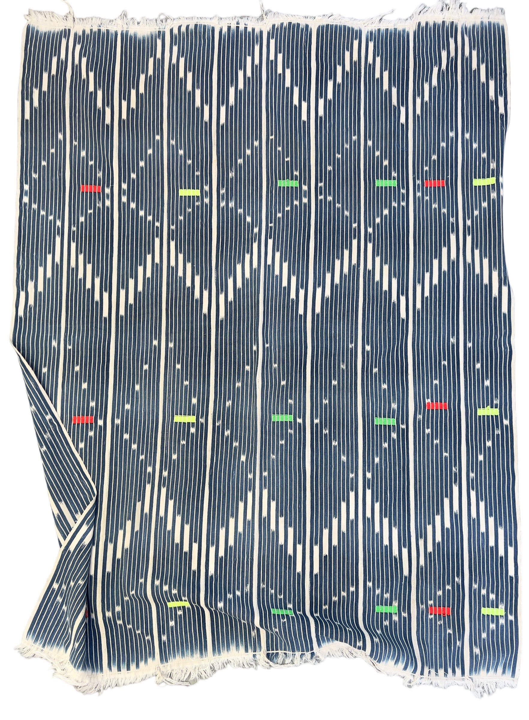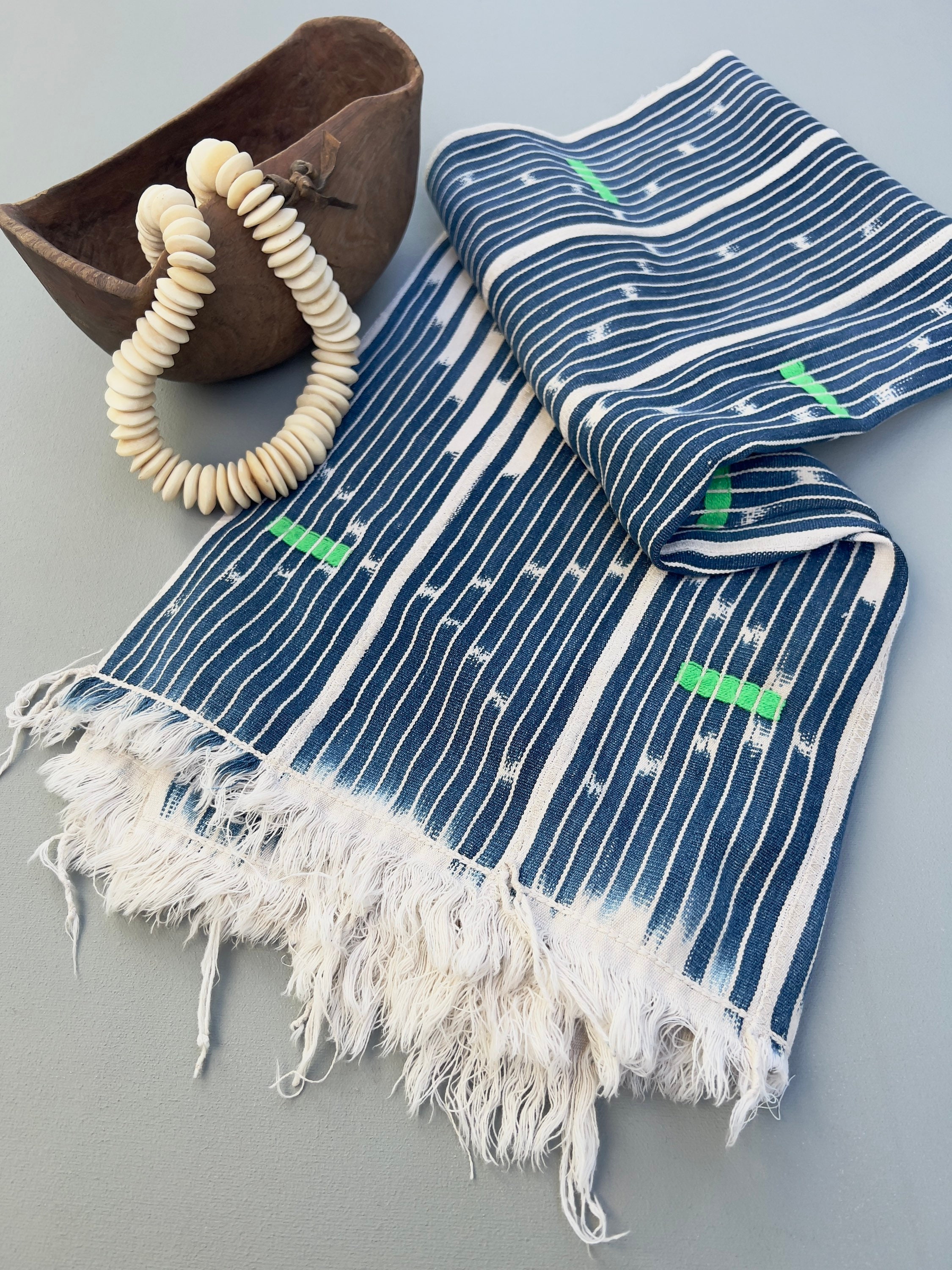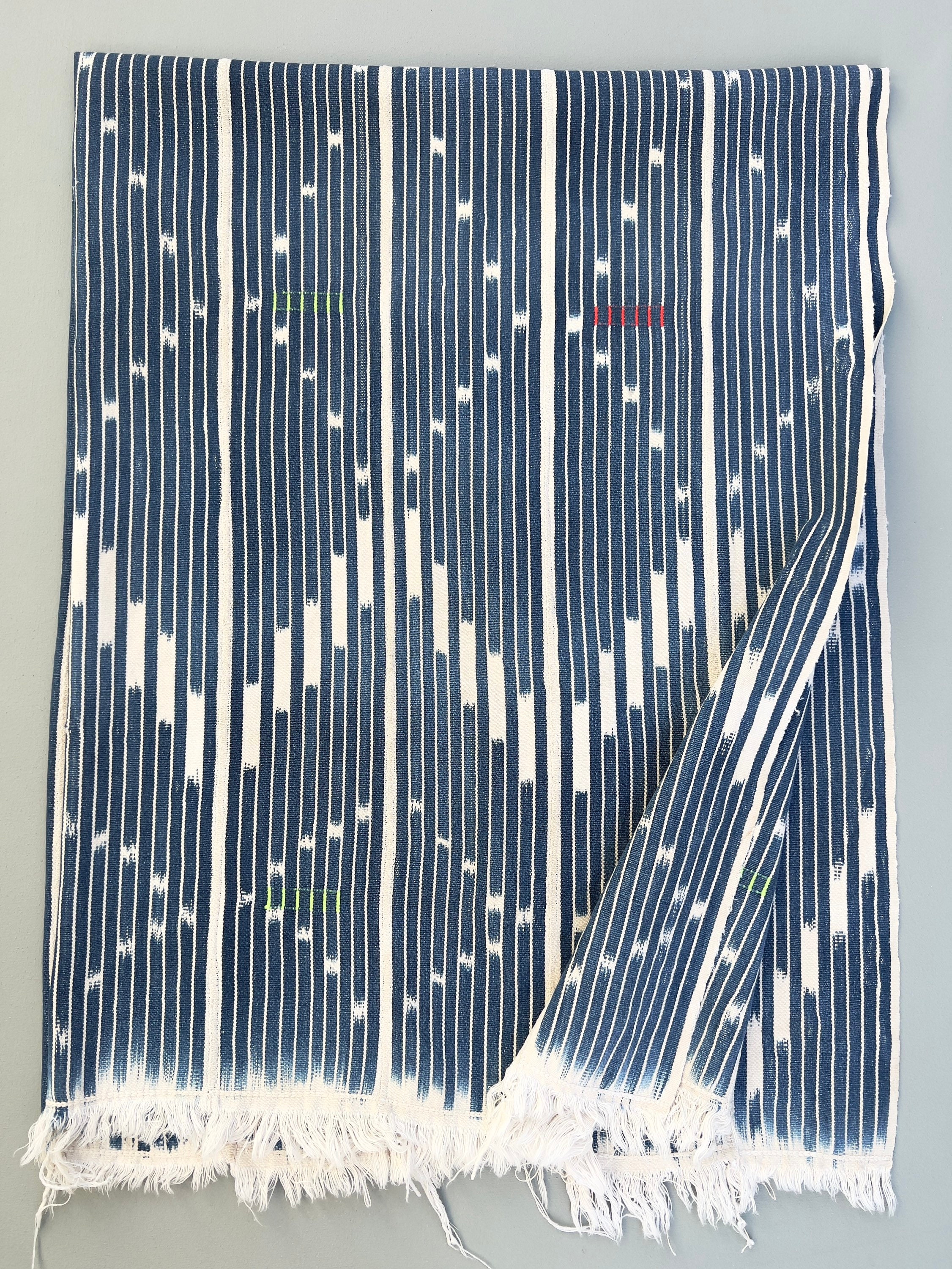 African mud cloth throw, Vintage African Baule cloth: Make pillows or use for apparel or home decor throw. Classic indigo blue with soft white ikat pattern with soft white fringe. Novelty embroidery details in bright color threads.
