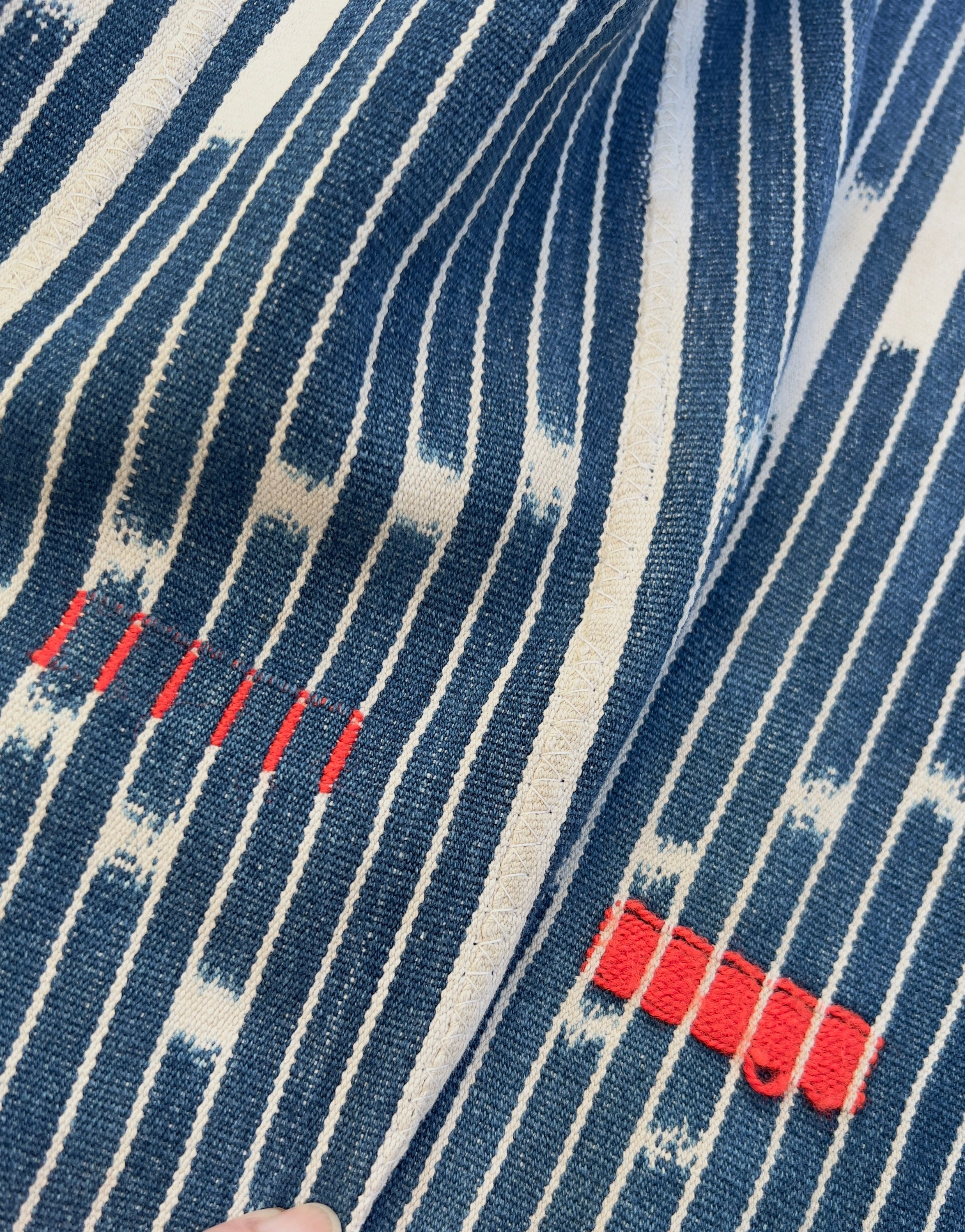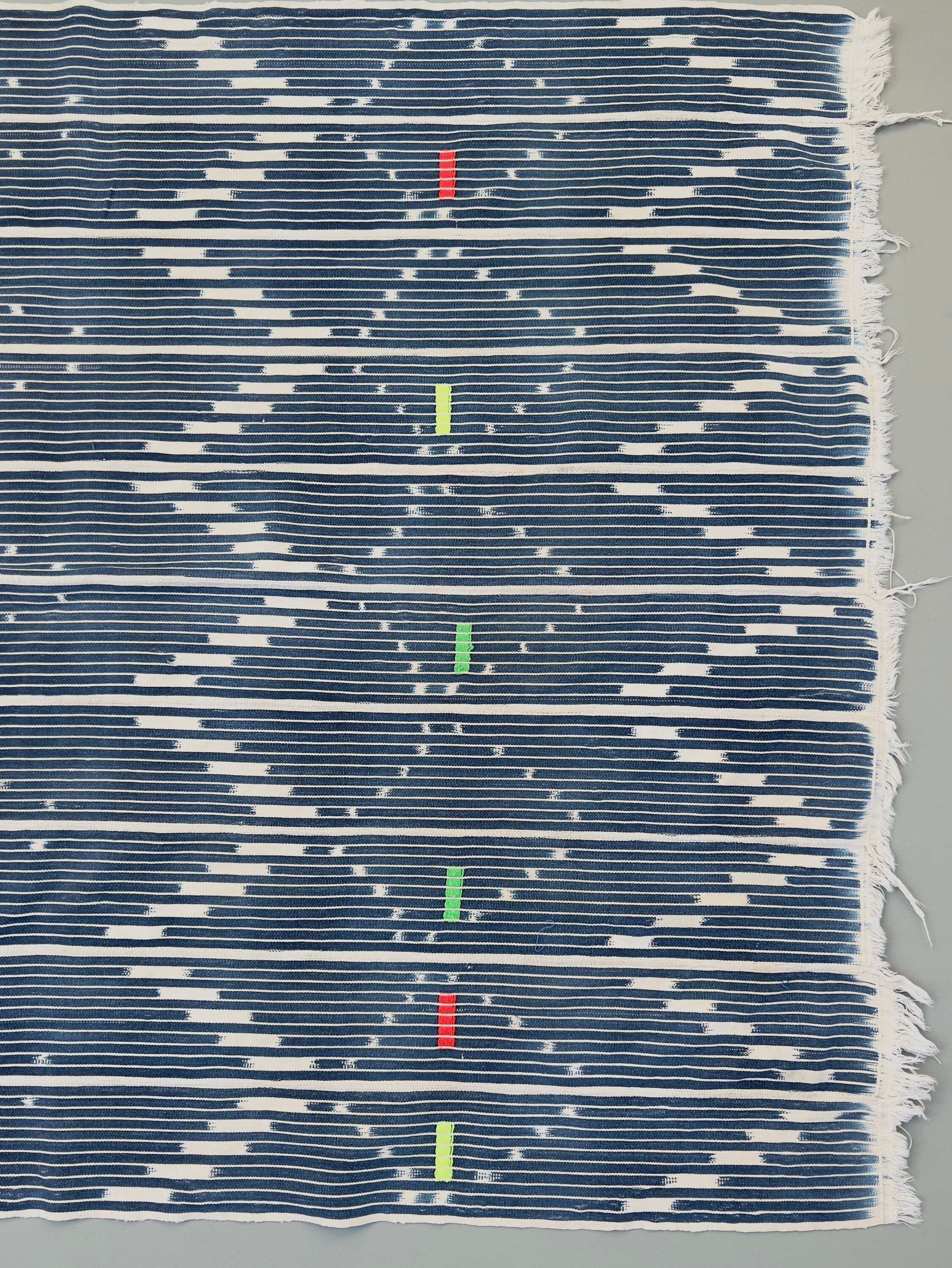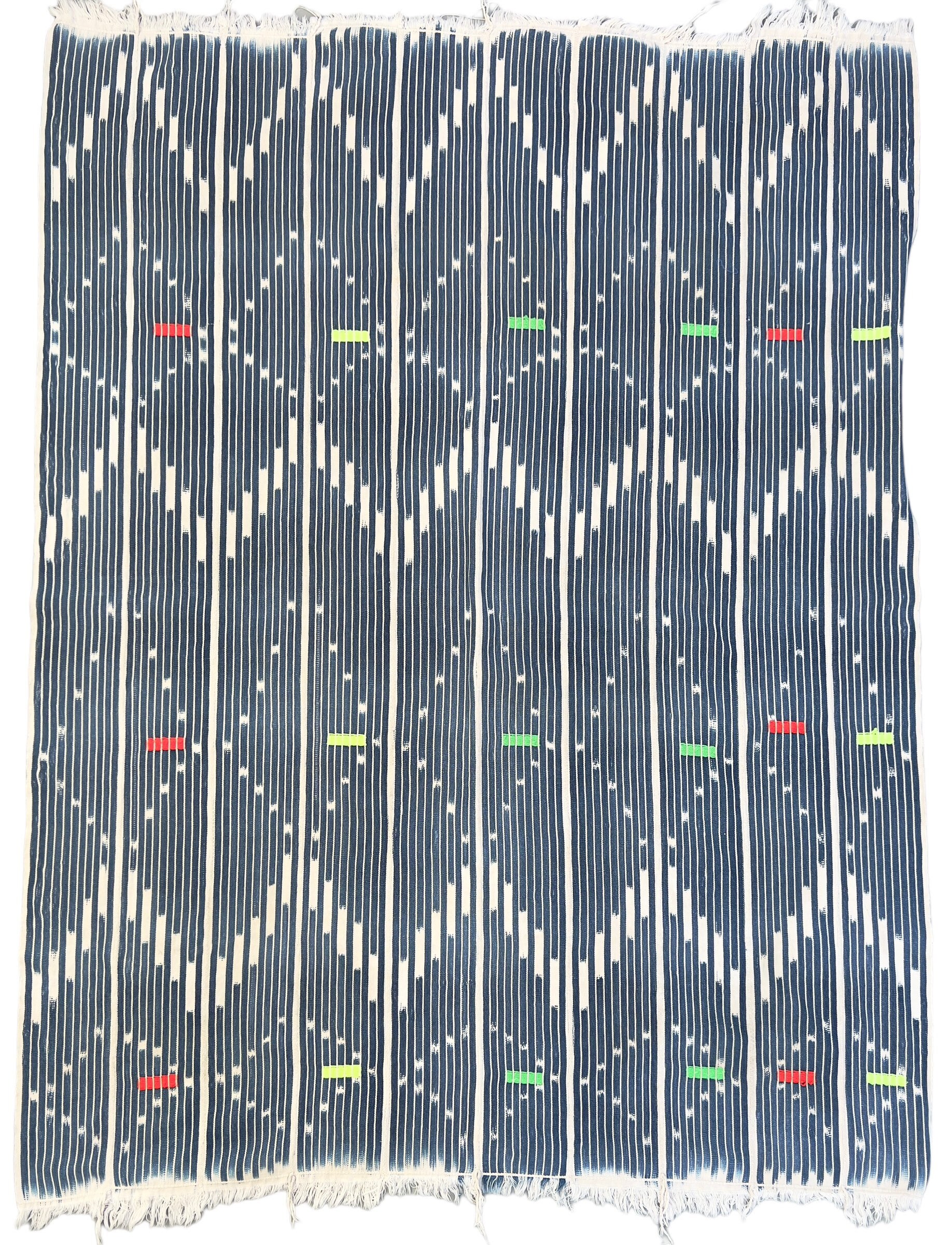 African mud cloth throw, Vintage African Baule cloth: Make pillows or use for apparel or home decor throw. Classic indigo blue with soft white ikat pattern with soft white fringe. Novelty embroidery details in bright color threads.