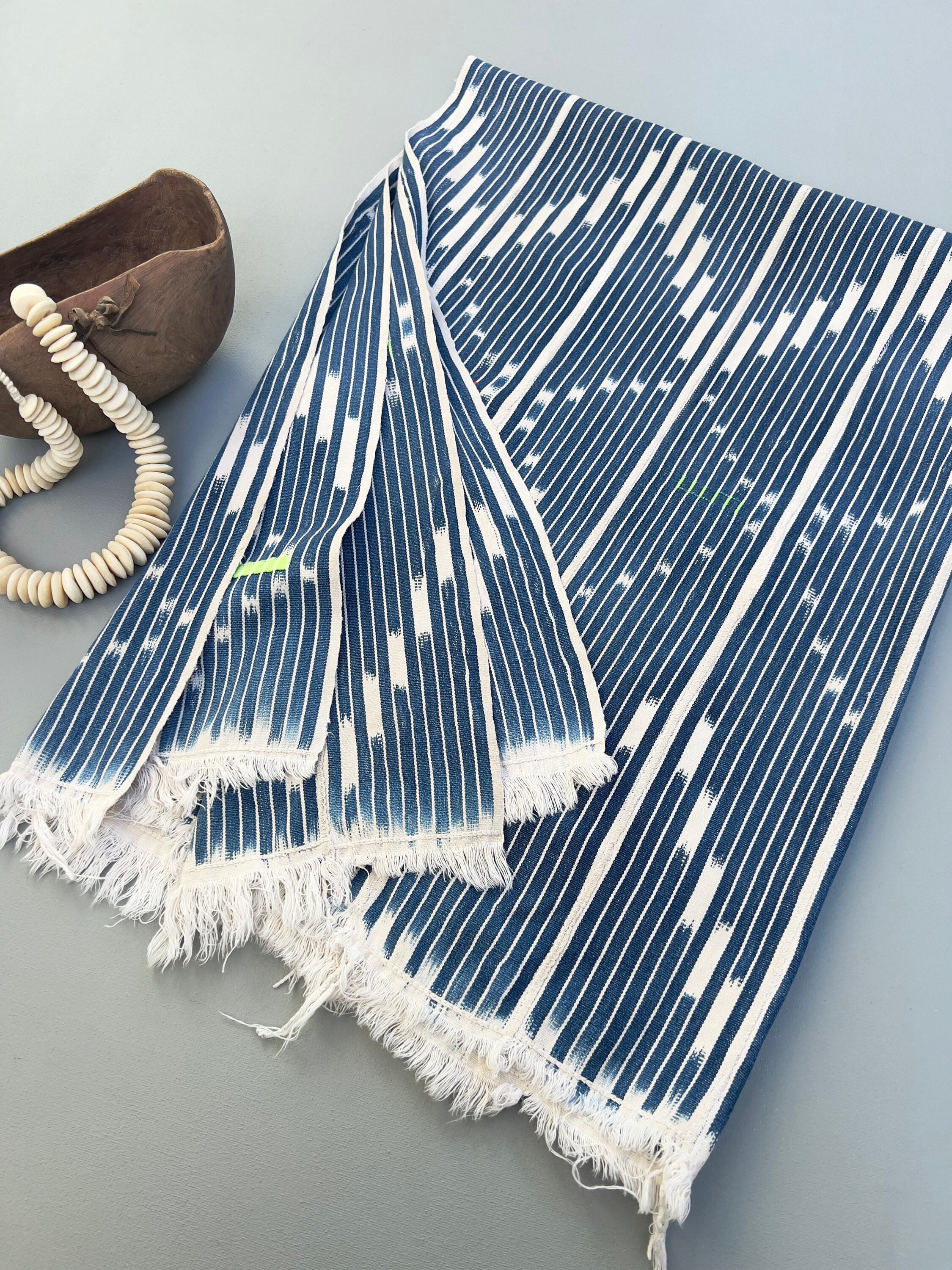 Hand crafted cotton and each is one-of-a-kind. Both length ends have softer hand made fringe details.
