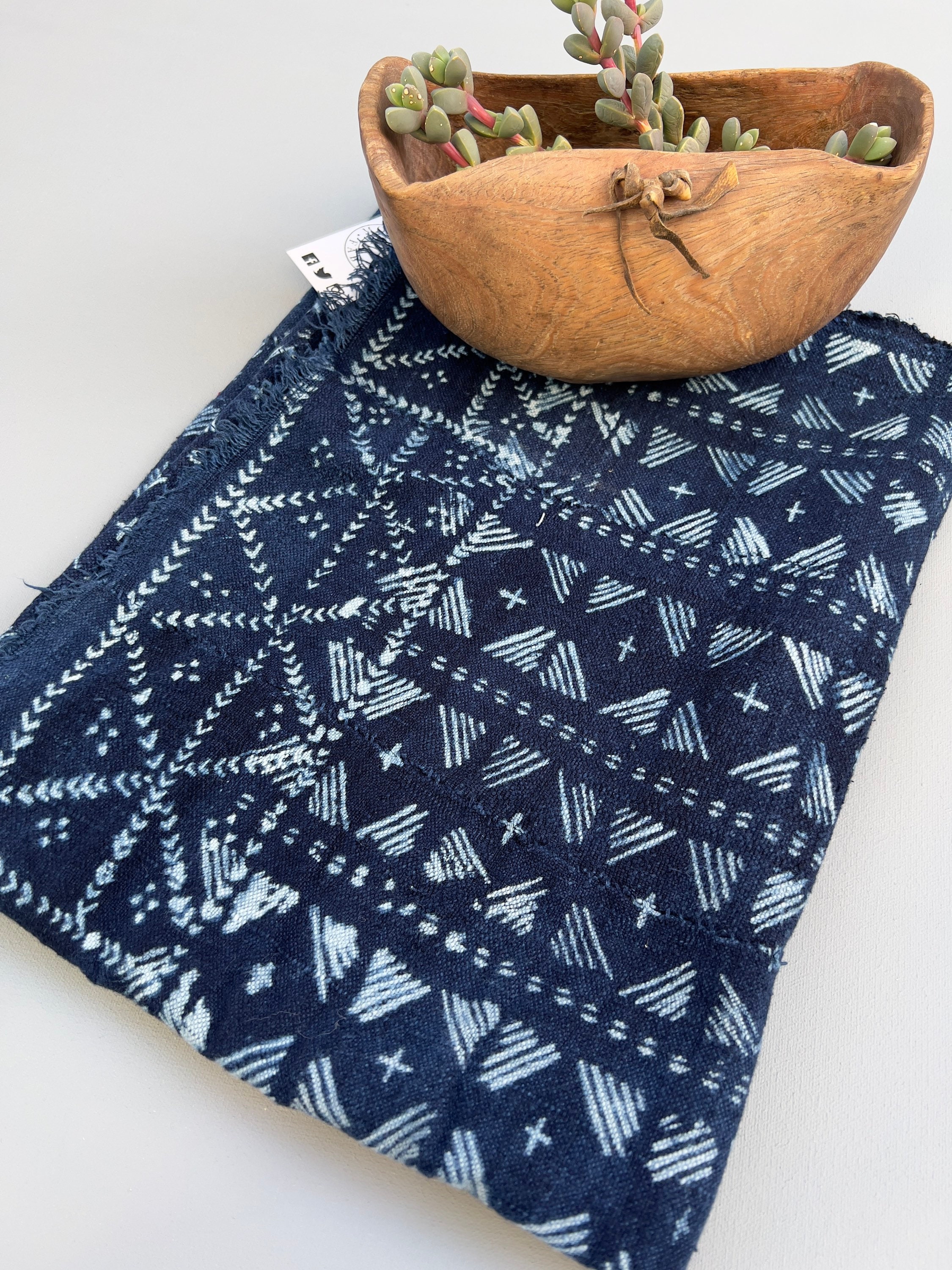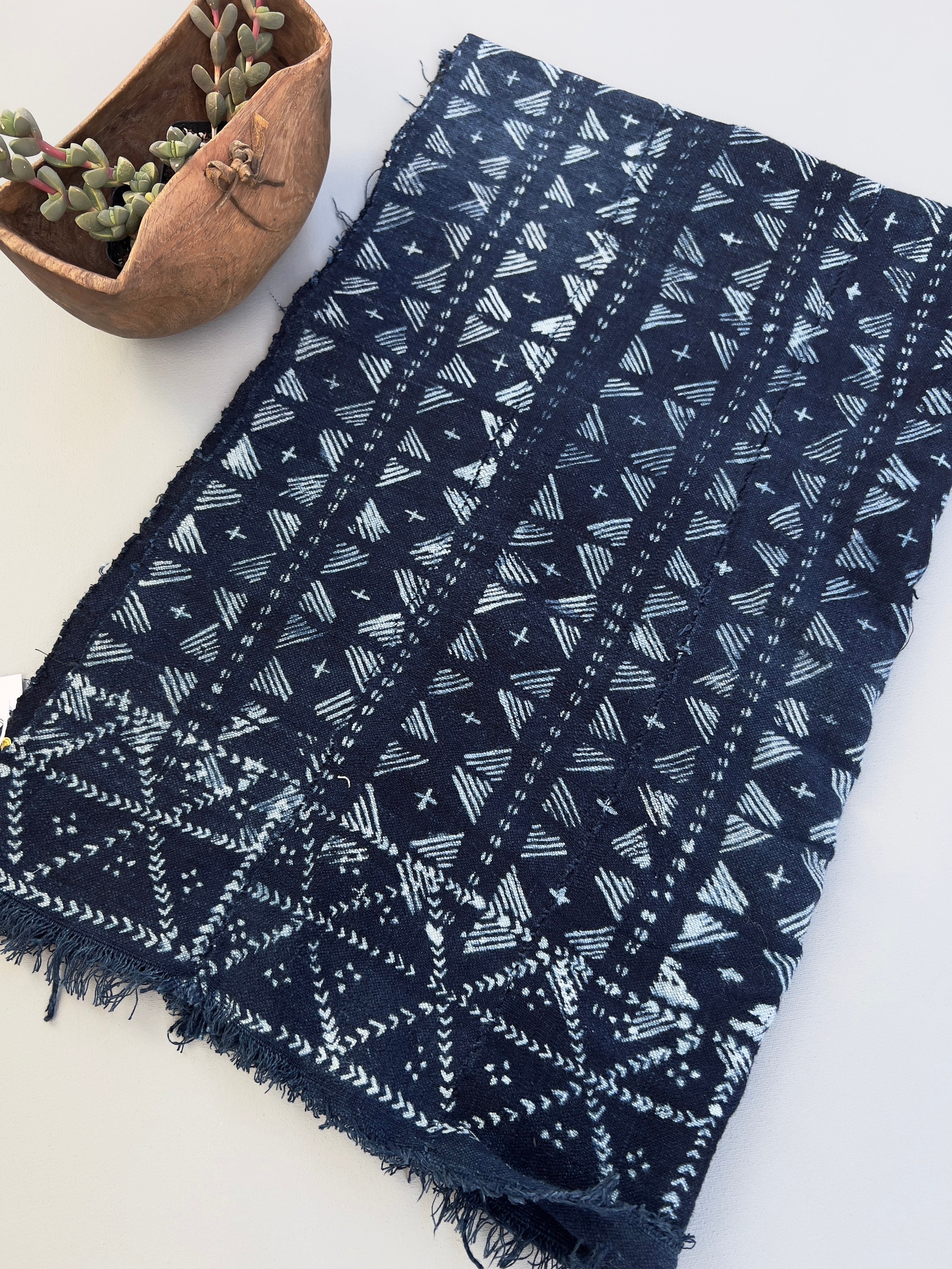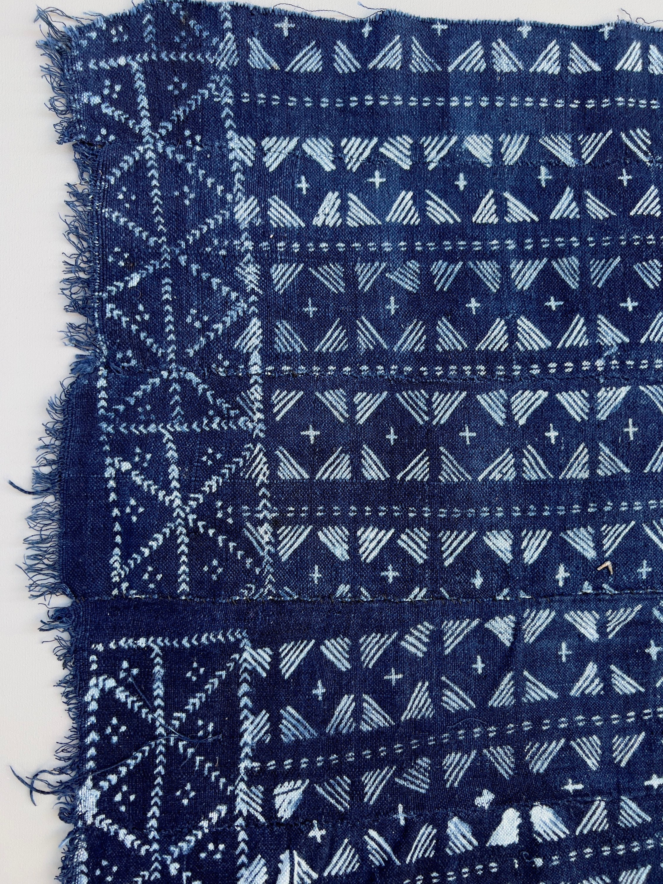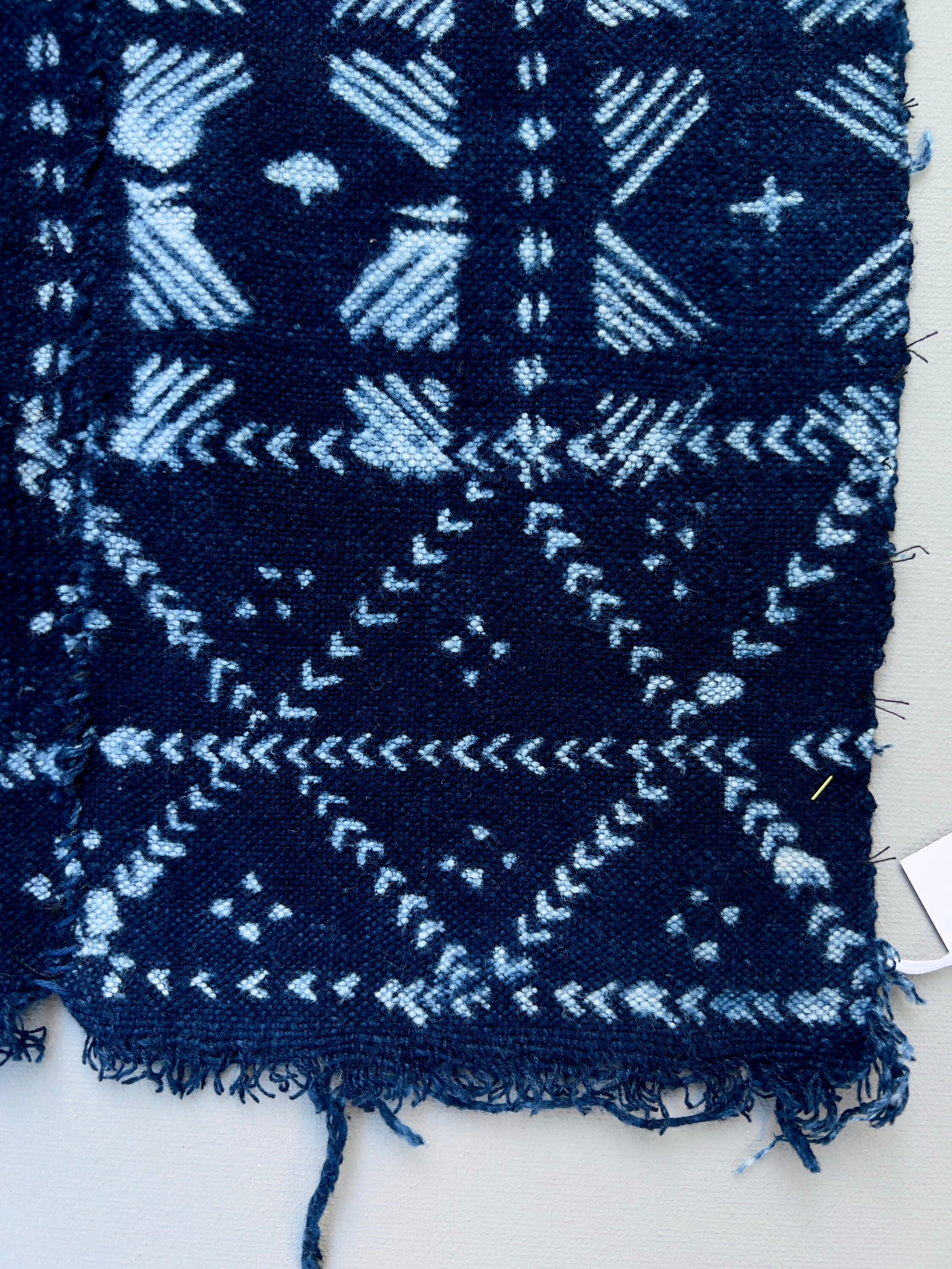 Mud cloth indigo batik fabric. African indigo strip cloth. Casual indigo blue and white cotton fabric. This graphic mud cloth has a global, coastal, or bohemian look. Hand stitching joins the narrow strips of cloth to make one wider textile. From Mali, Africa.
