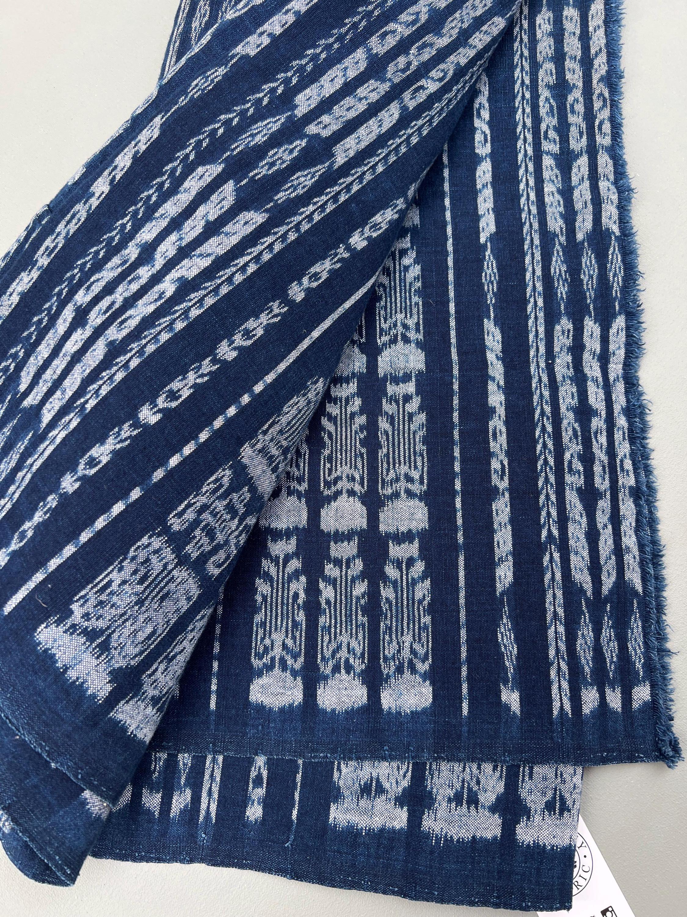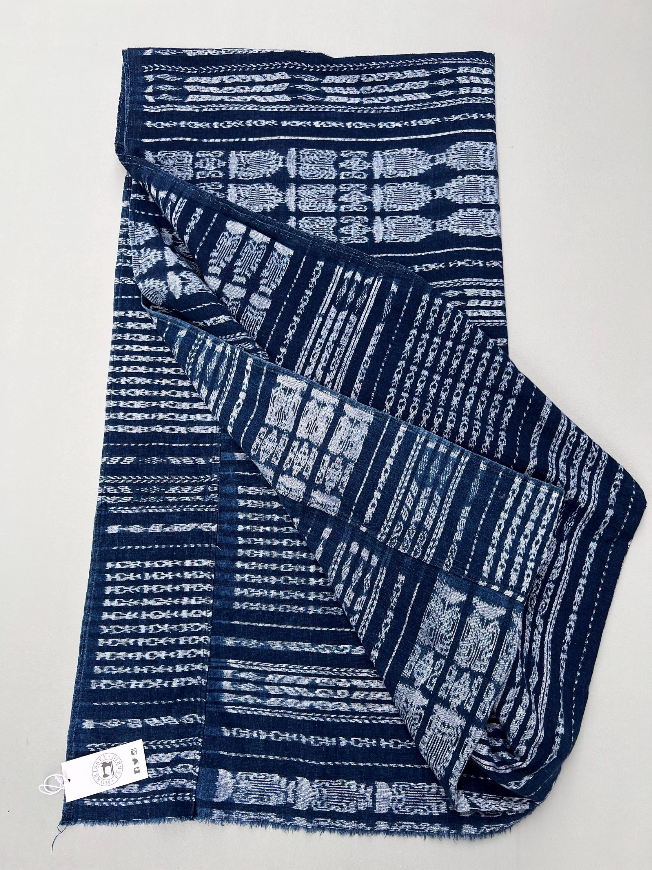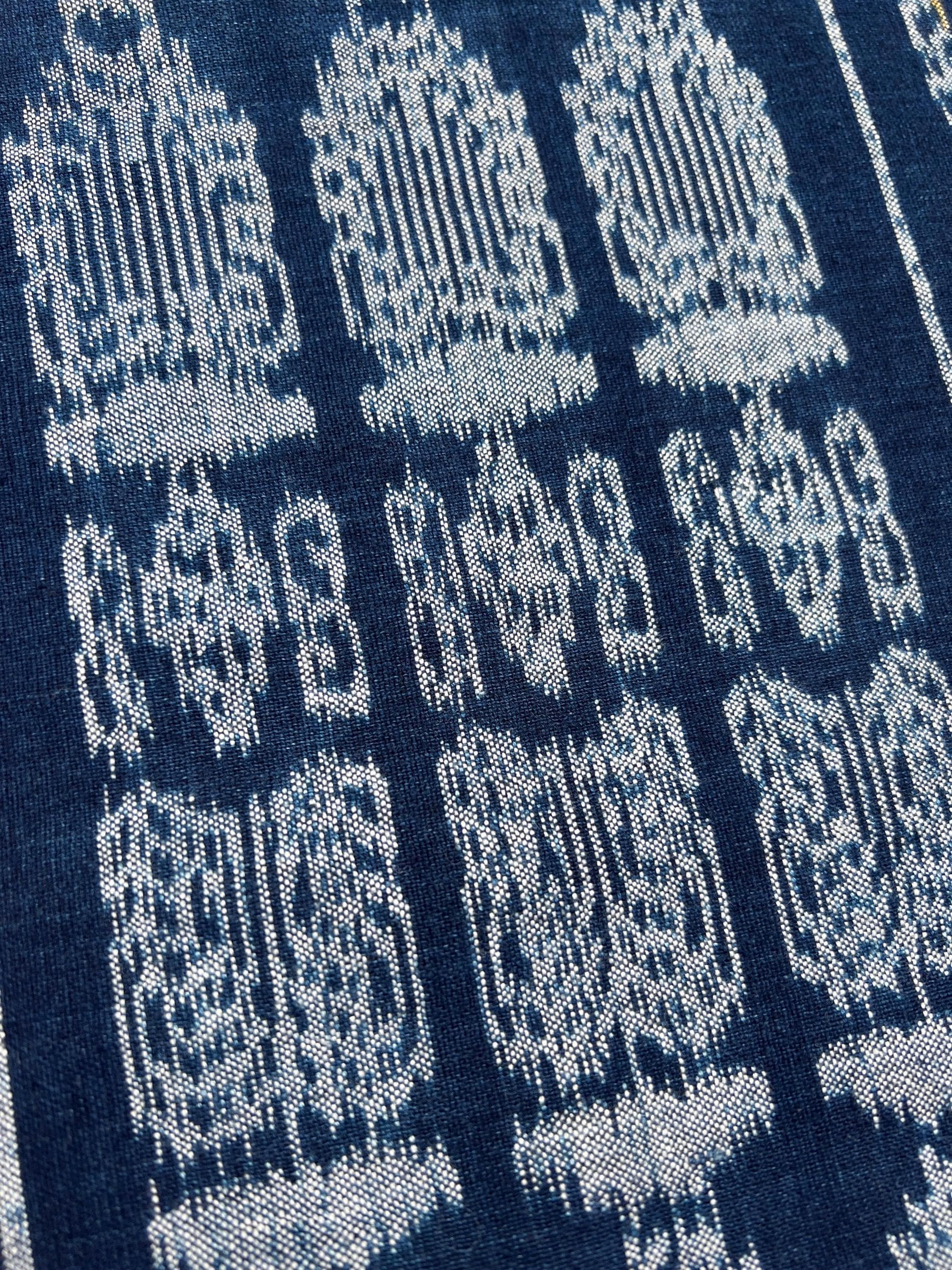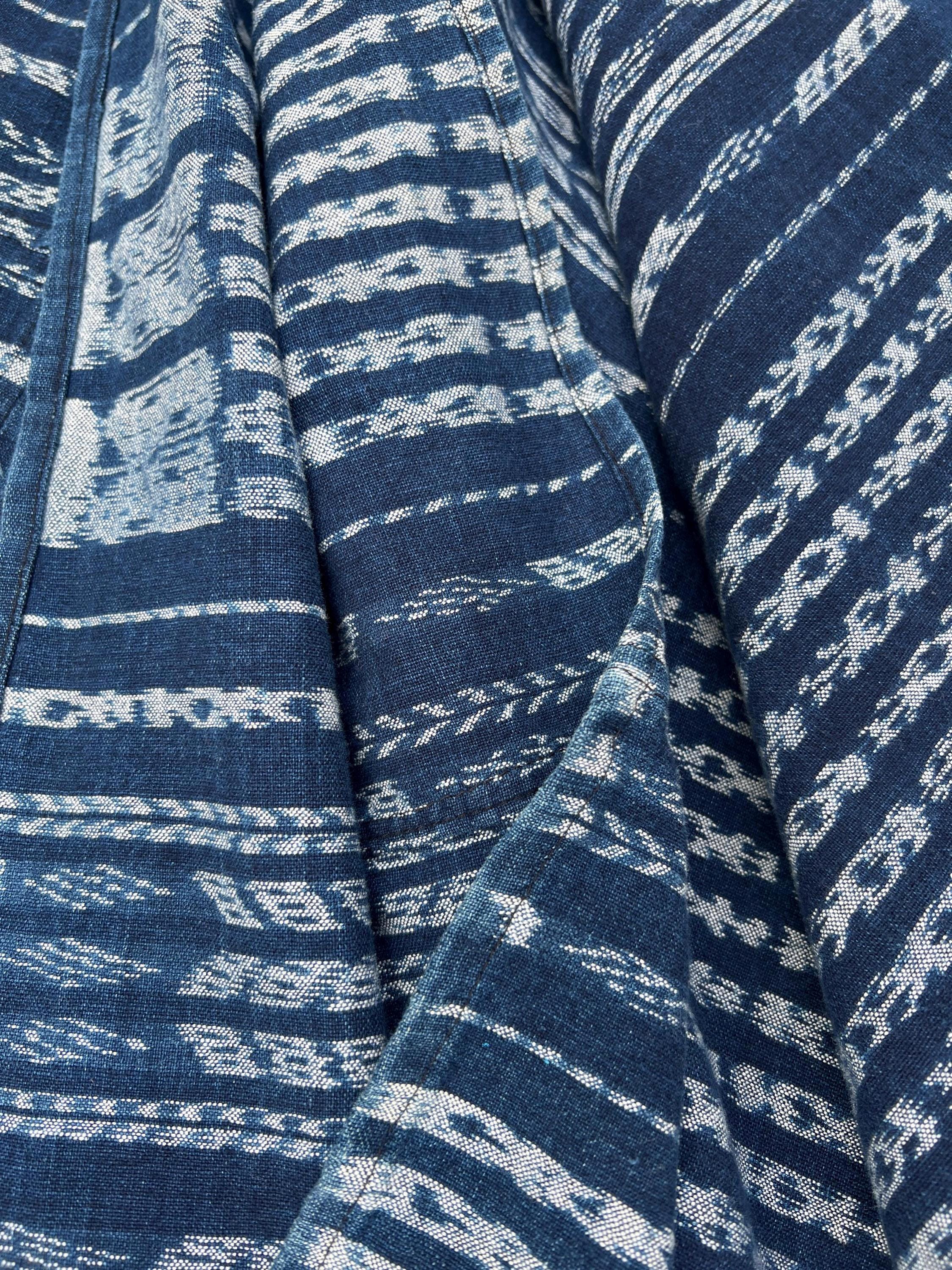 Vintage Guatemalan indigo Corte textile in a denim blue and white Ikat detail stripes. Use this textile for a Boho decor throw, pillow covers, slip covers, or use to make a tote bag or apparel! Great denim alternative. A fabric favorite for upholstery or loads of pillows.