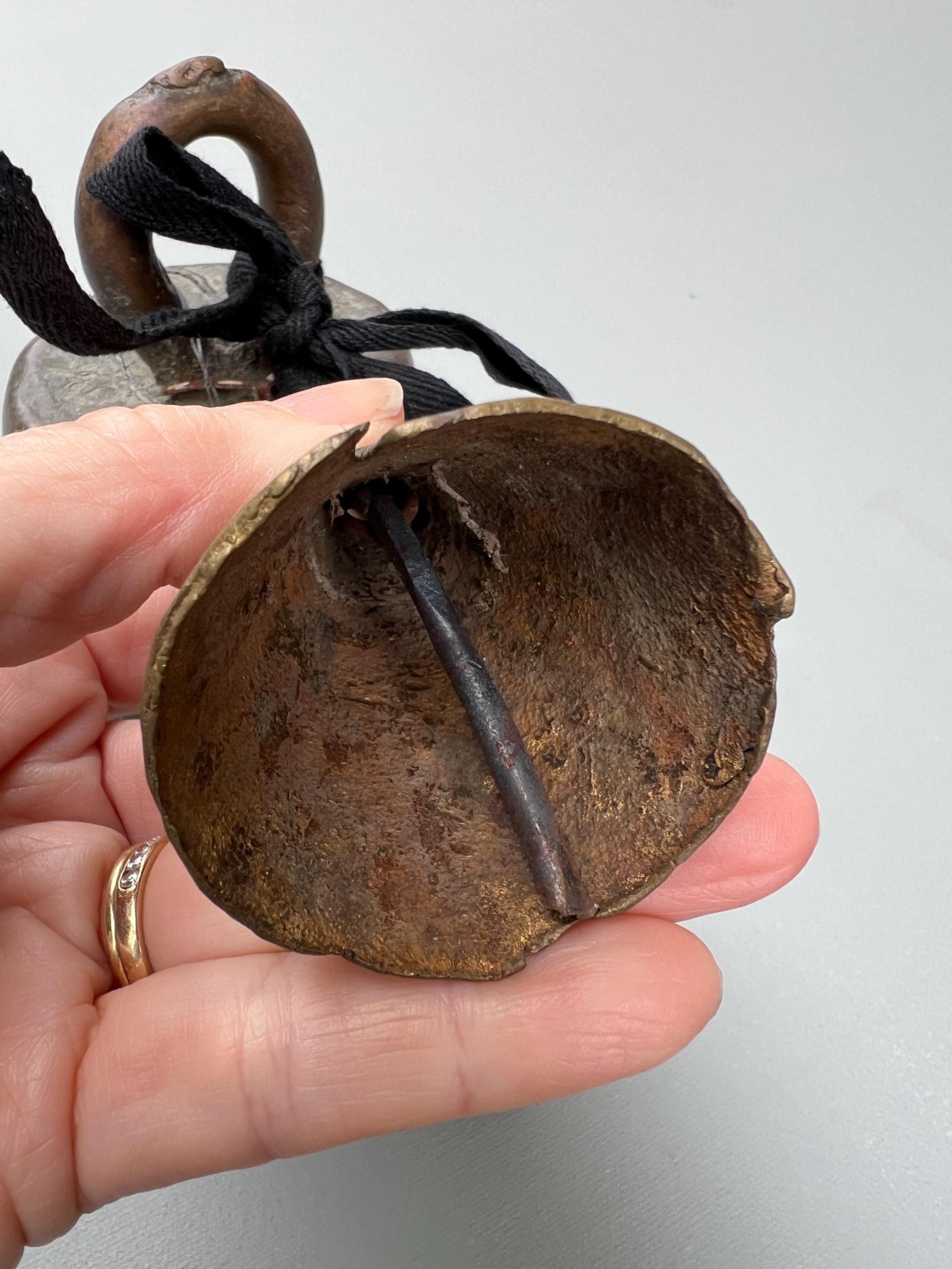 Lovely antique patina, dents, and irregular shape add personality. The bells function and have a classic bell tone.