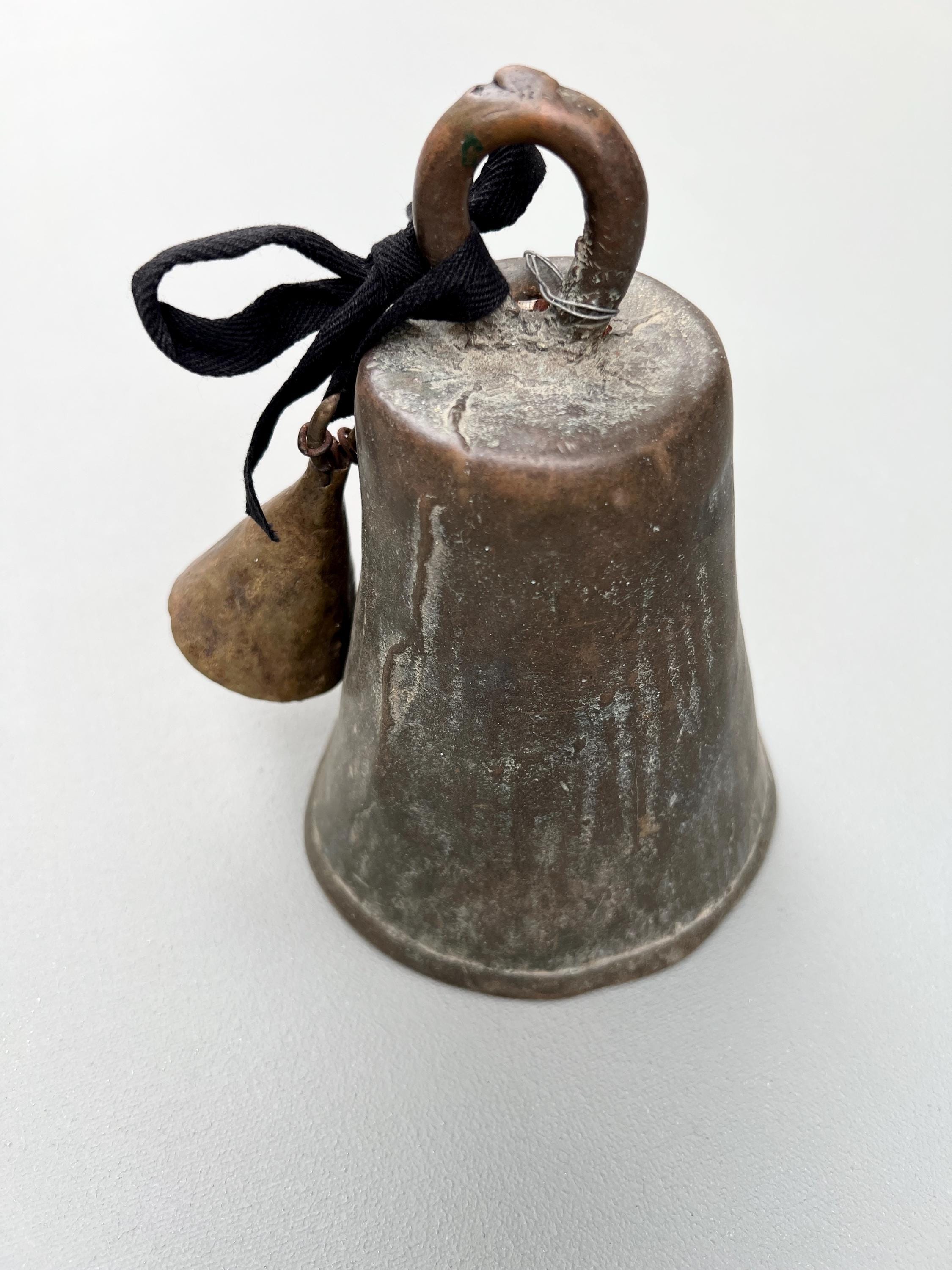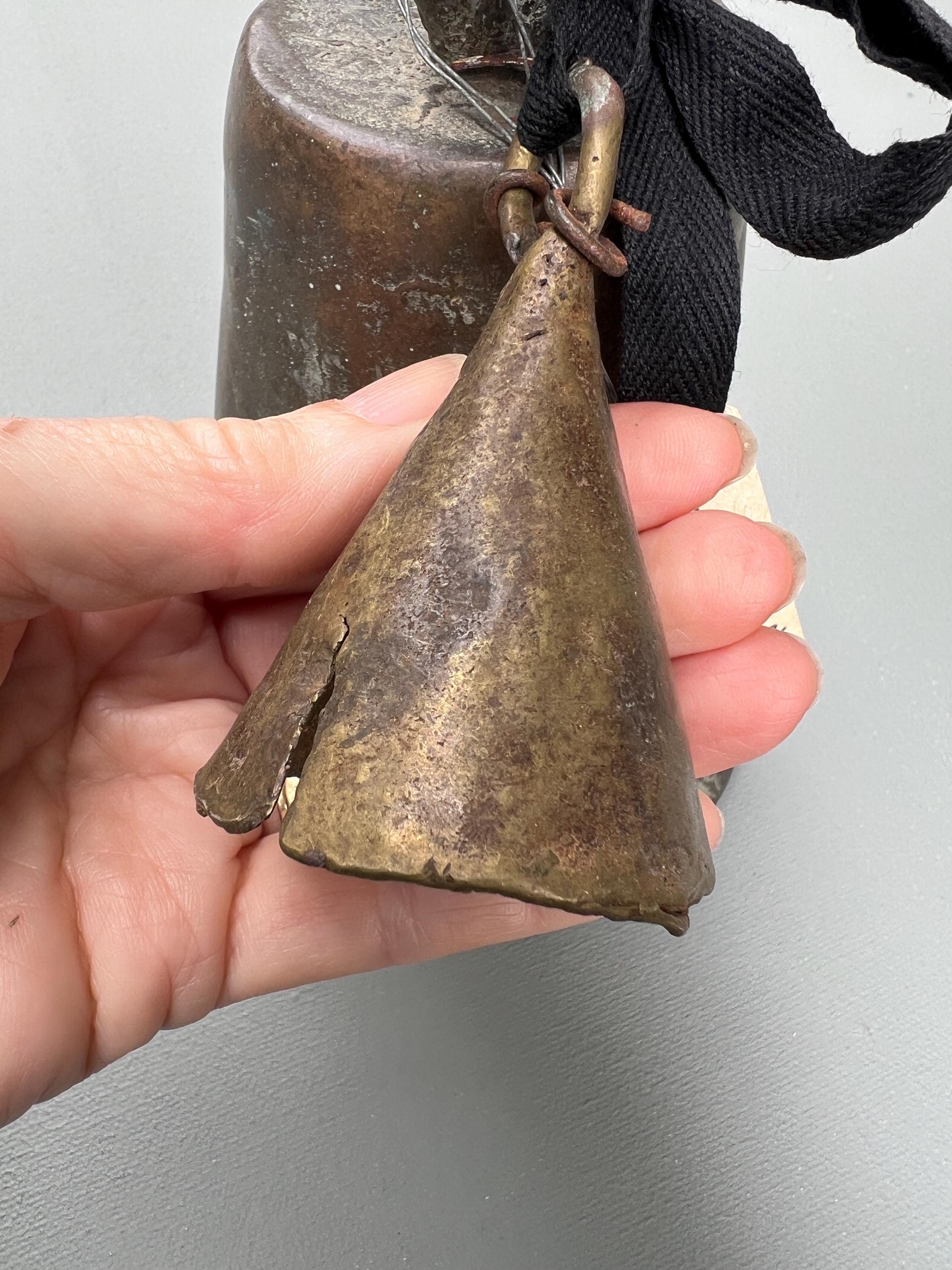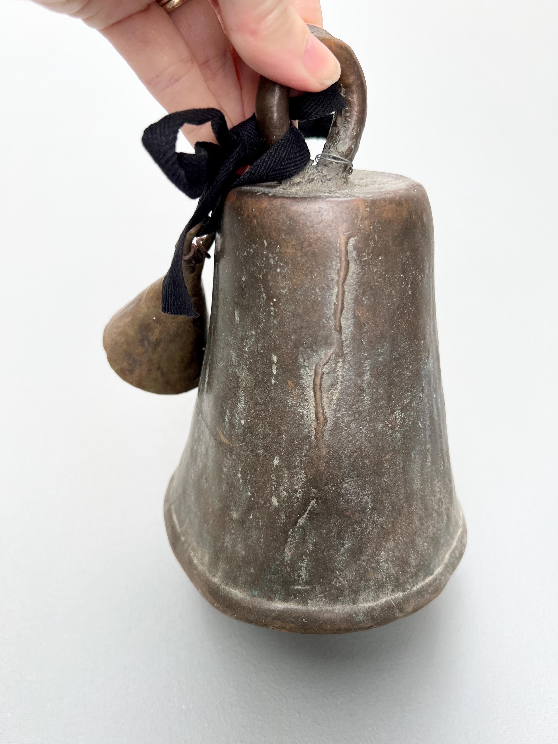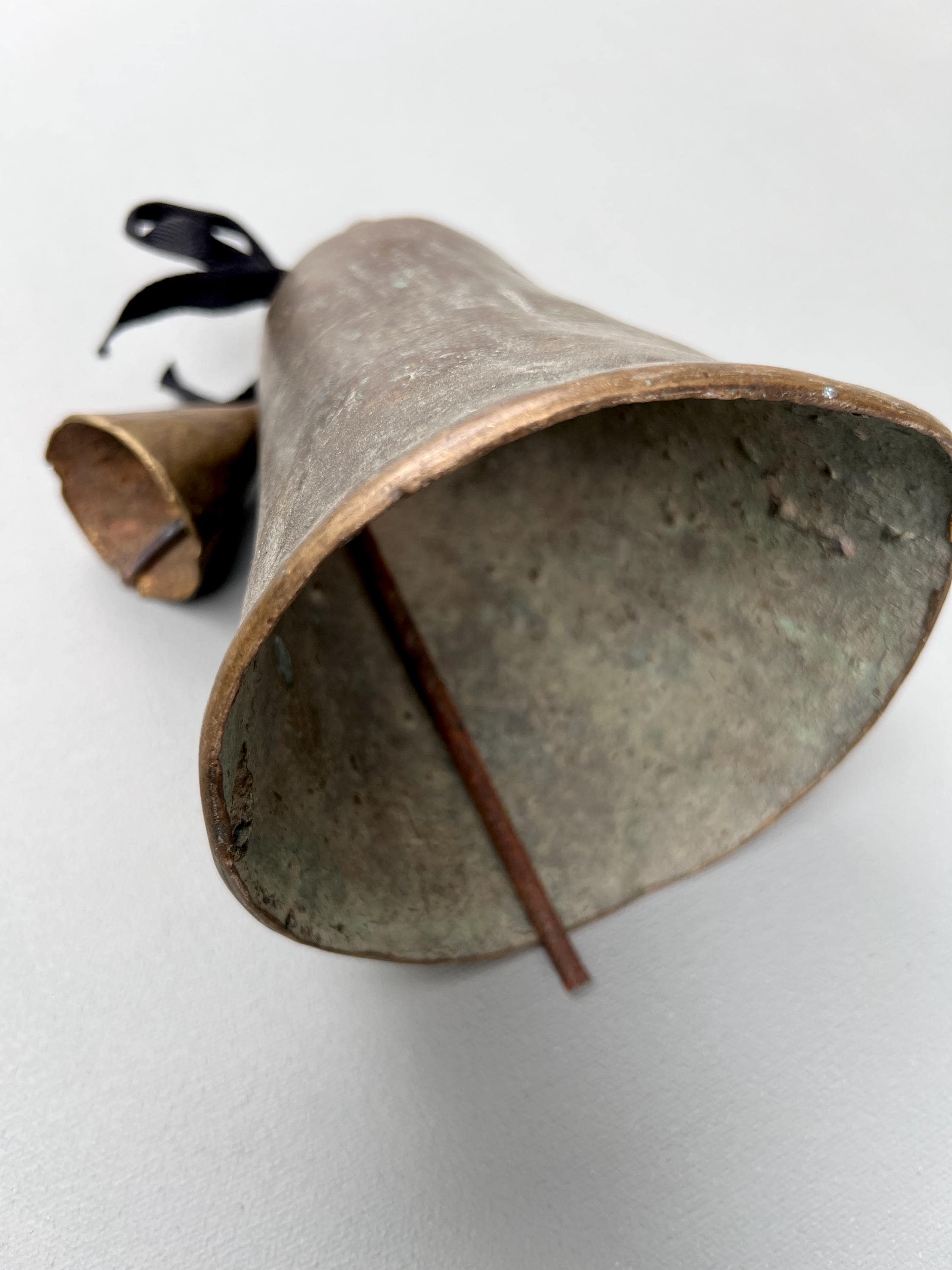 Bronze pair of African bells. Hand made, large and heavy cow bell and smaller goat bell. Made of solid bronze originating from South Sudan.