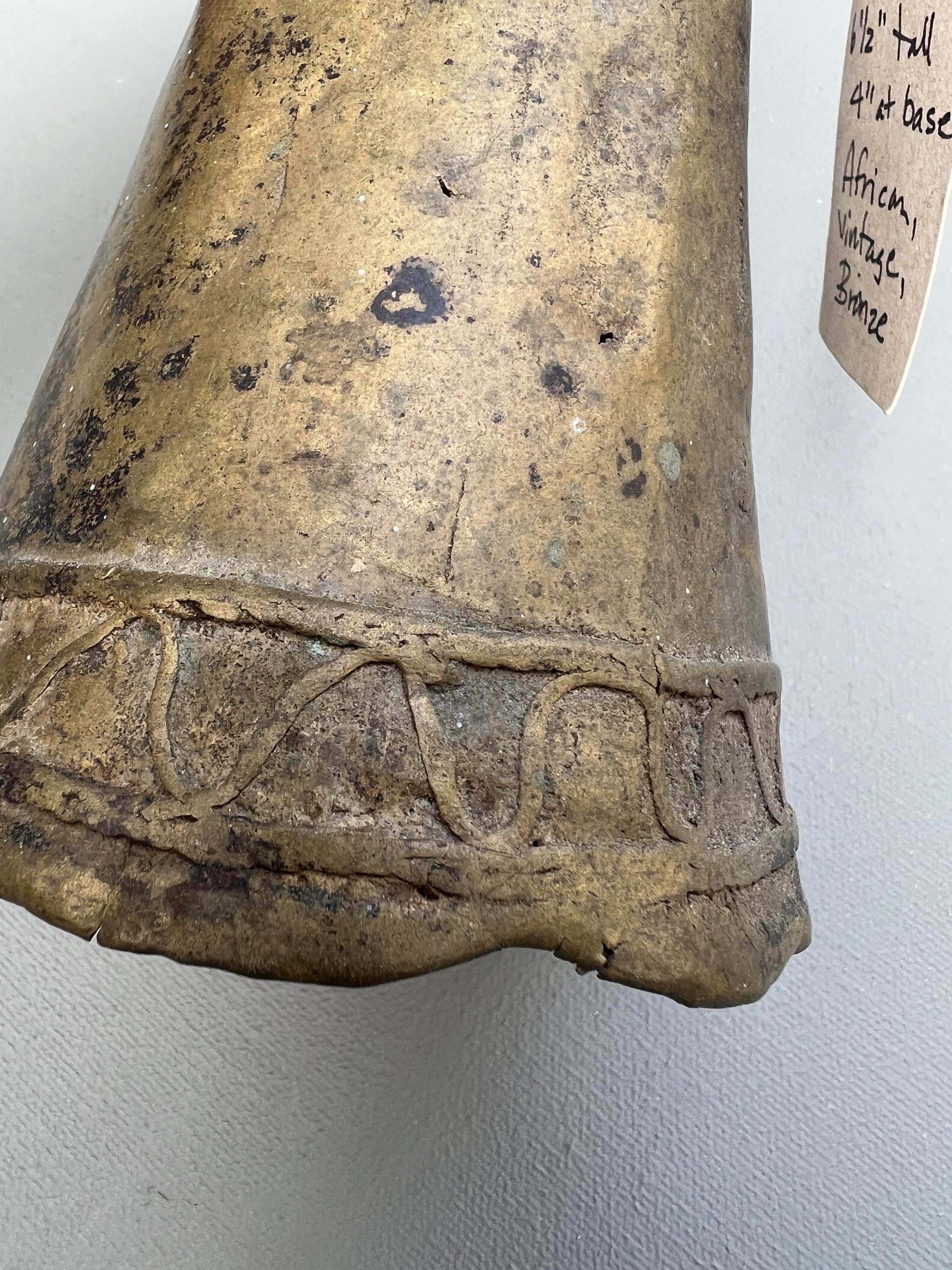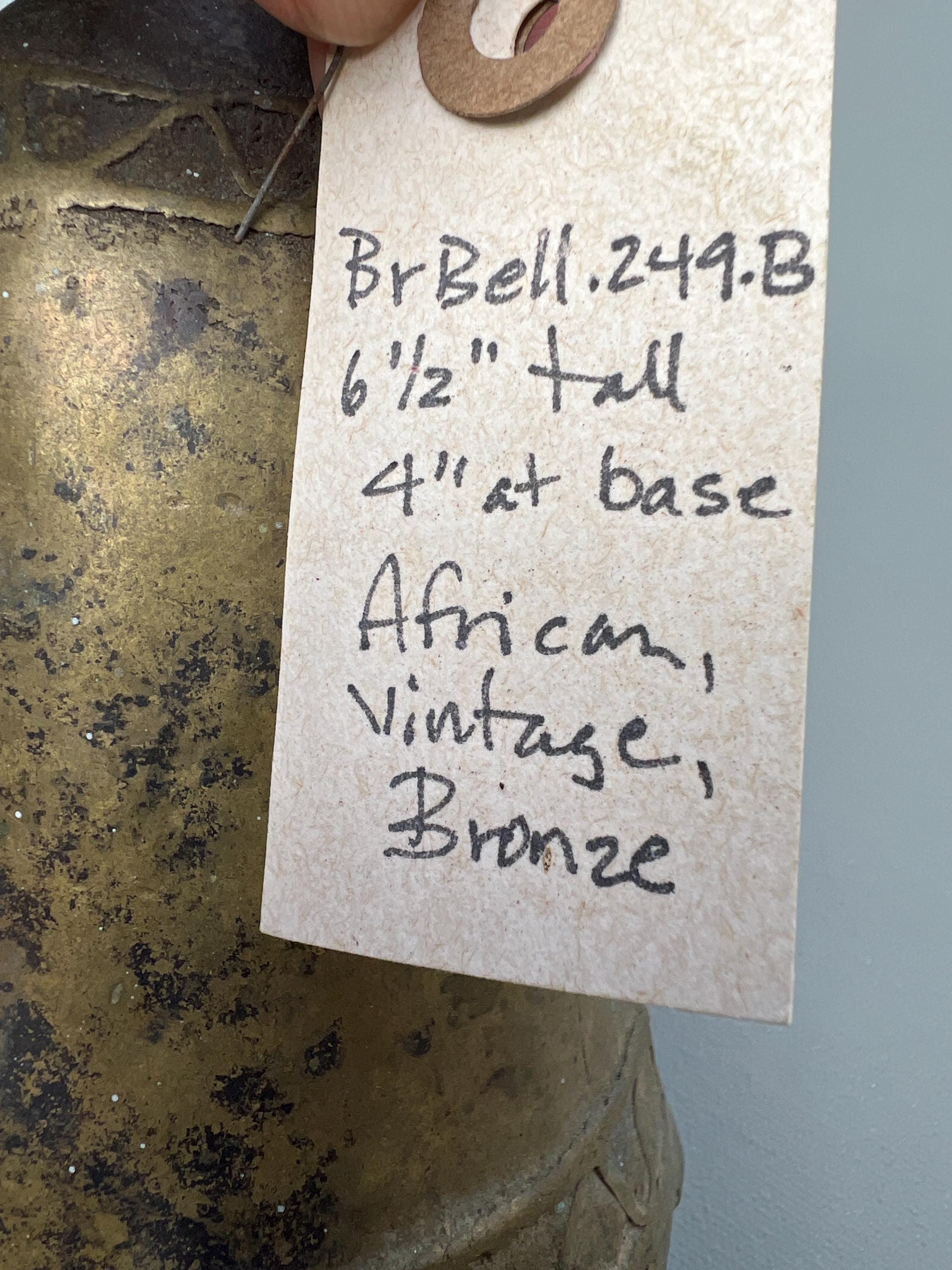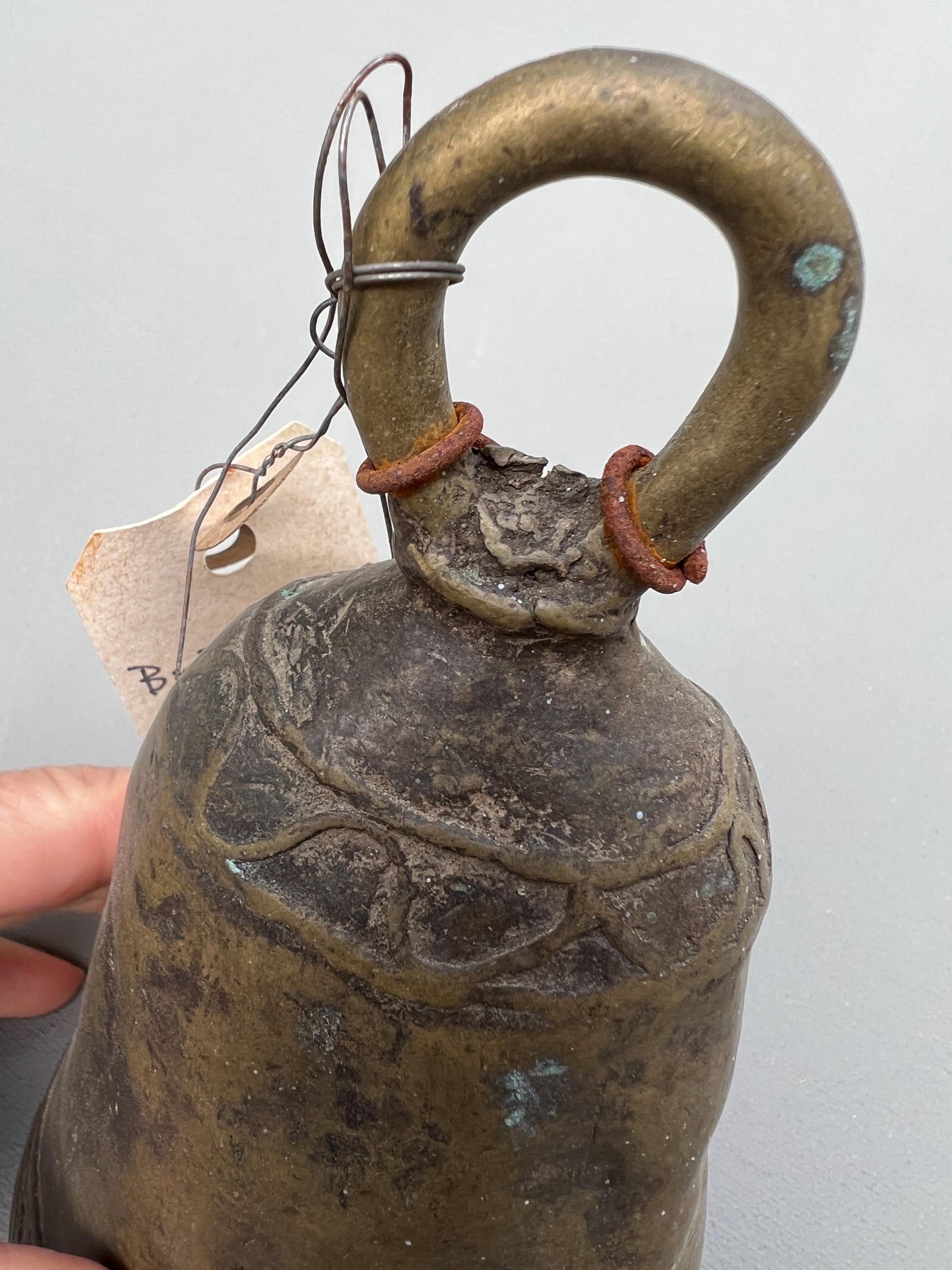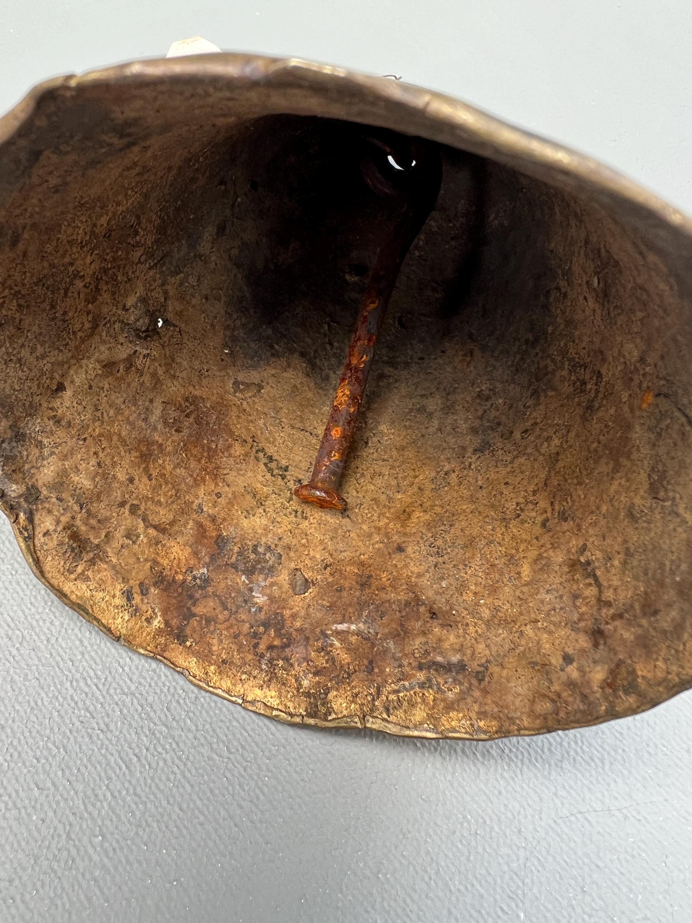 Vintage bronze farm bell. One of a kind hand made in solid bronze originating from Southern Sudan. Rustic antique patina. Dents, cracks, and irregular shapes add personality. This bell functions and has a classic bell tone.