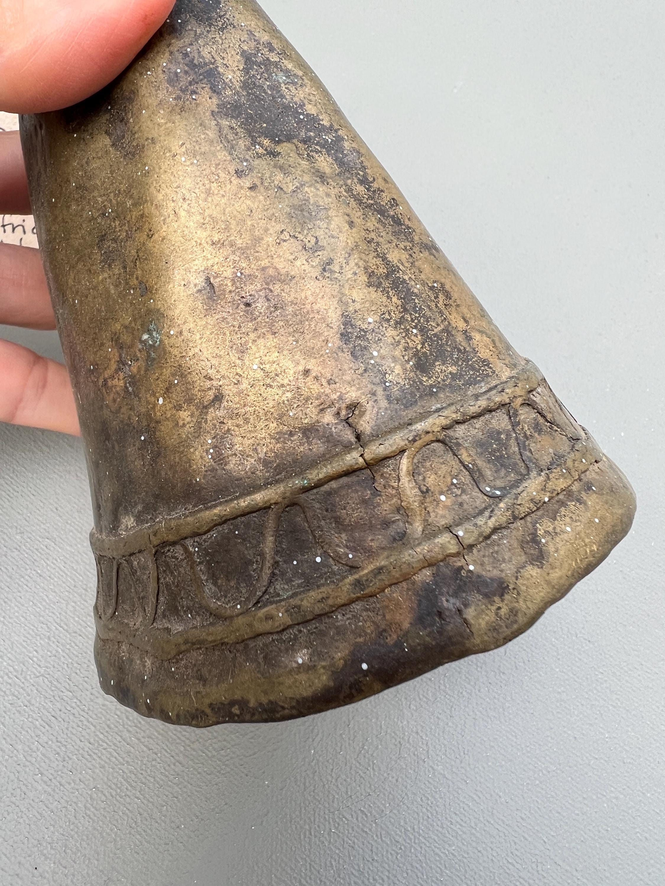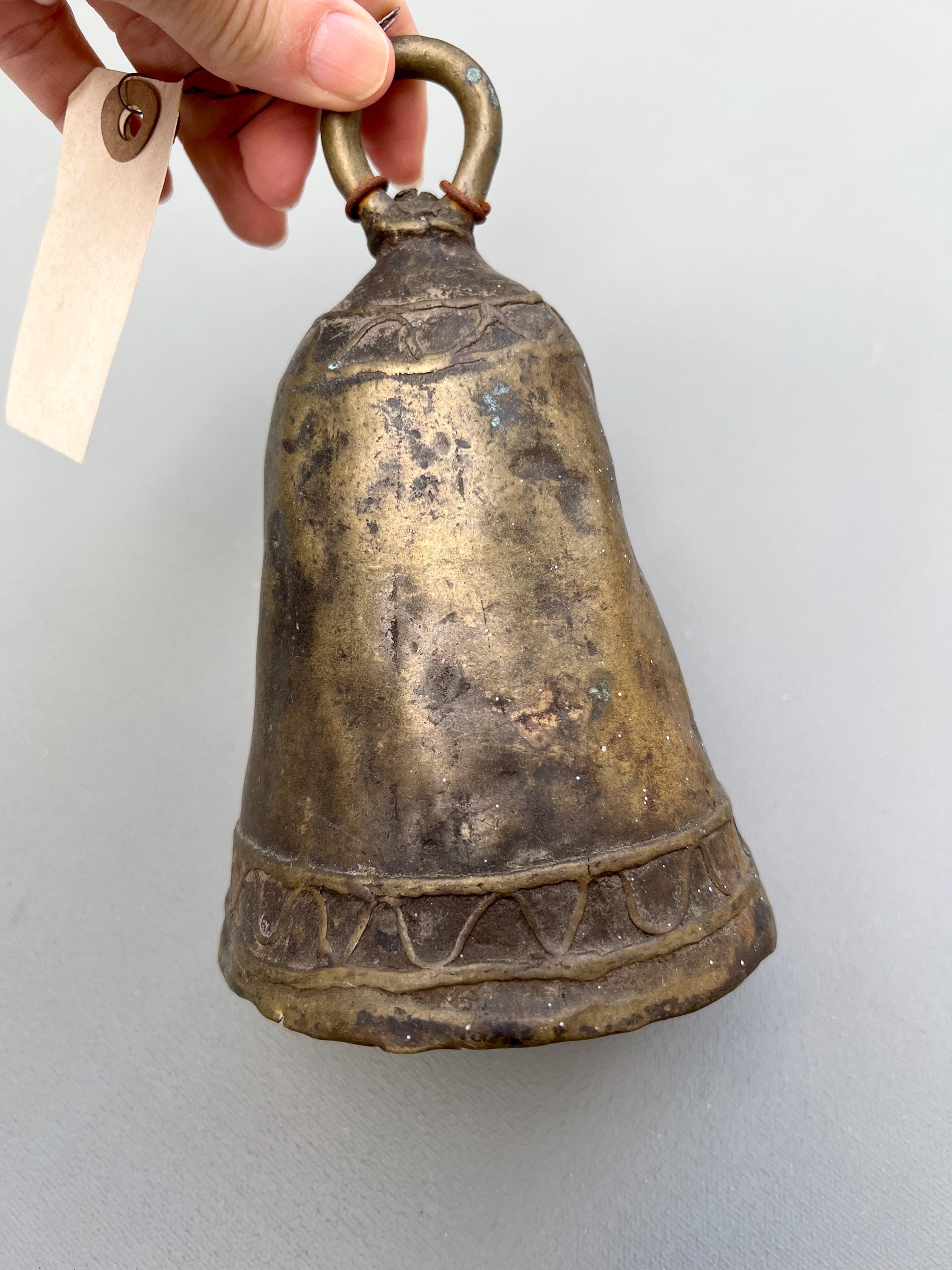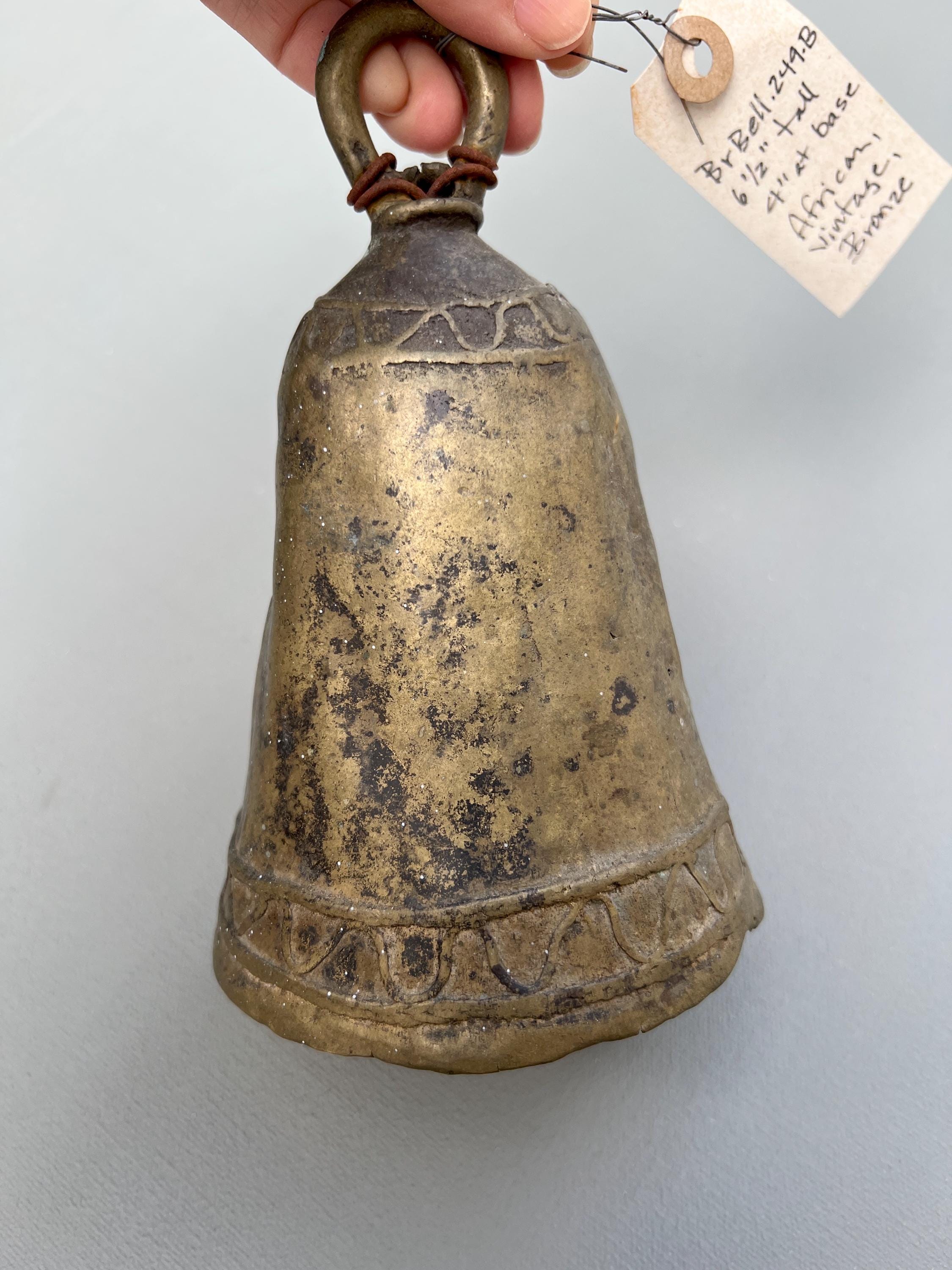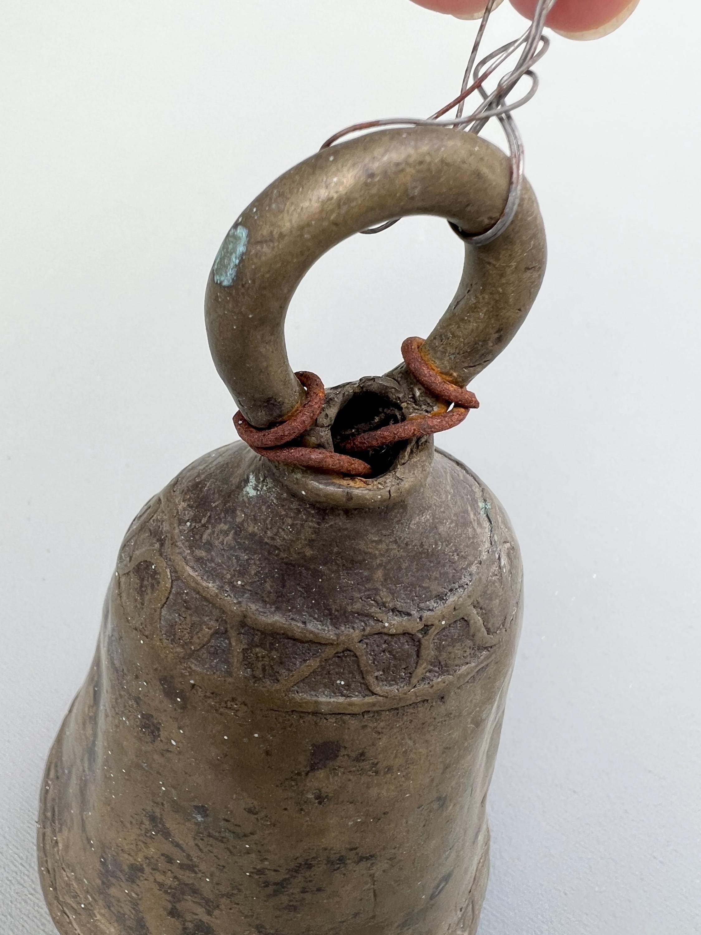 Vintage bronze farm bell. One of a kind hand made in solid bronze originating from Southern Sudan. Rustic antique patina. Dents, cracks, and irregular shapes add personality. This bell functions and has a classic bell tone.