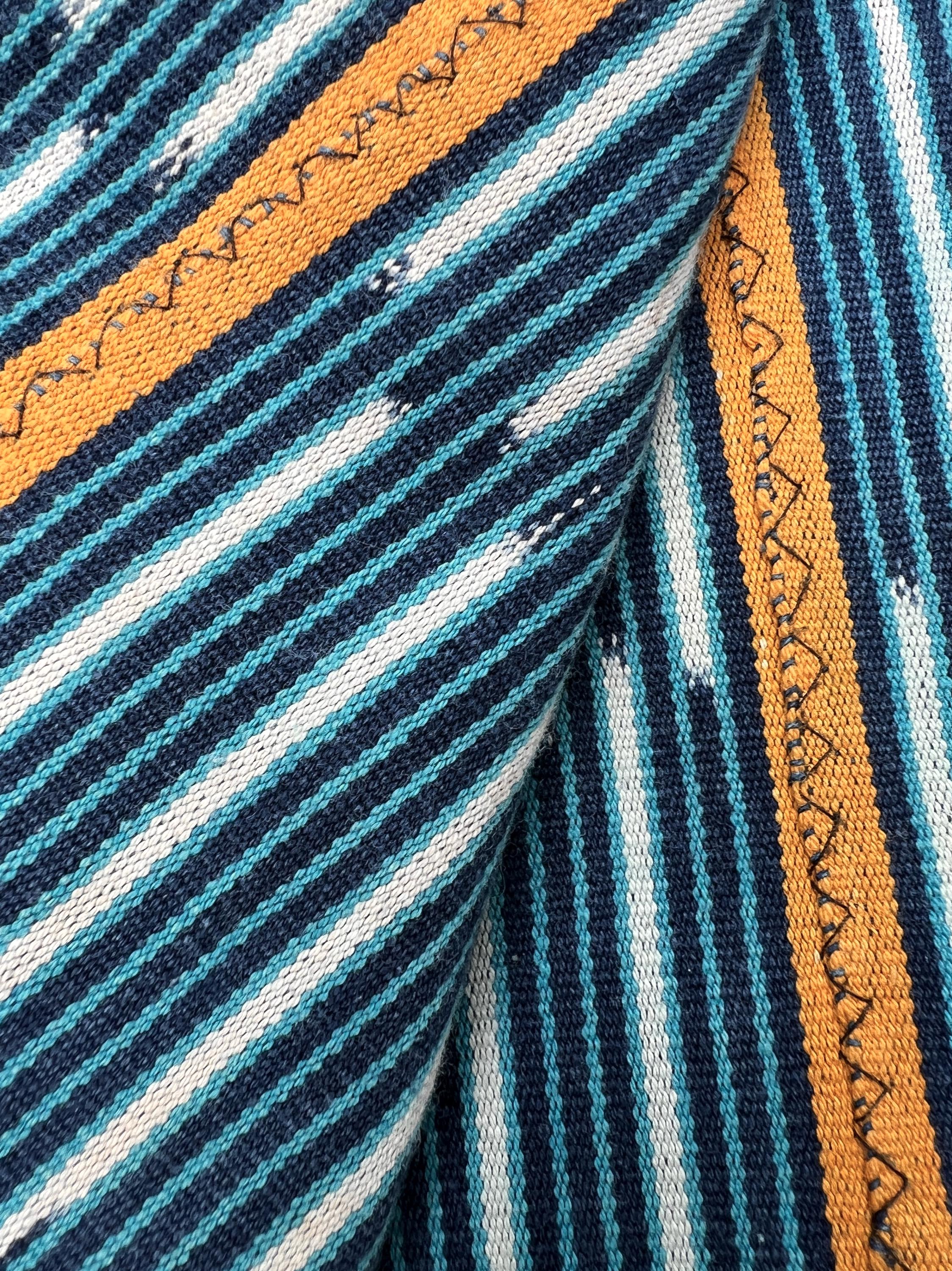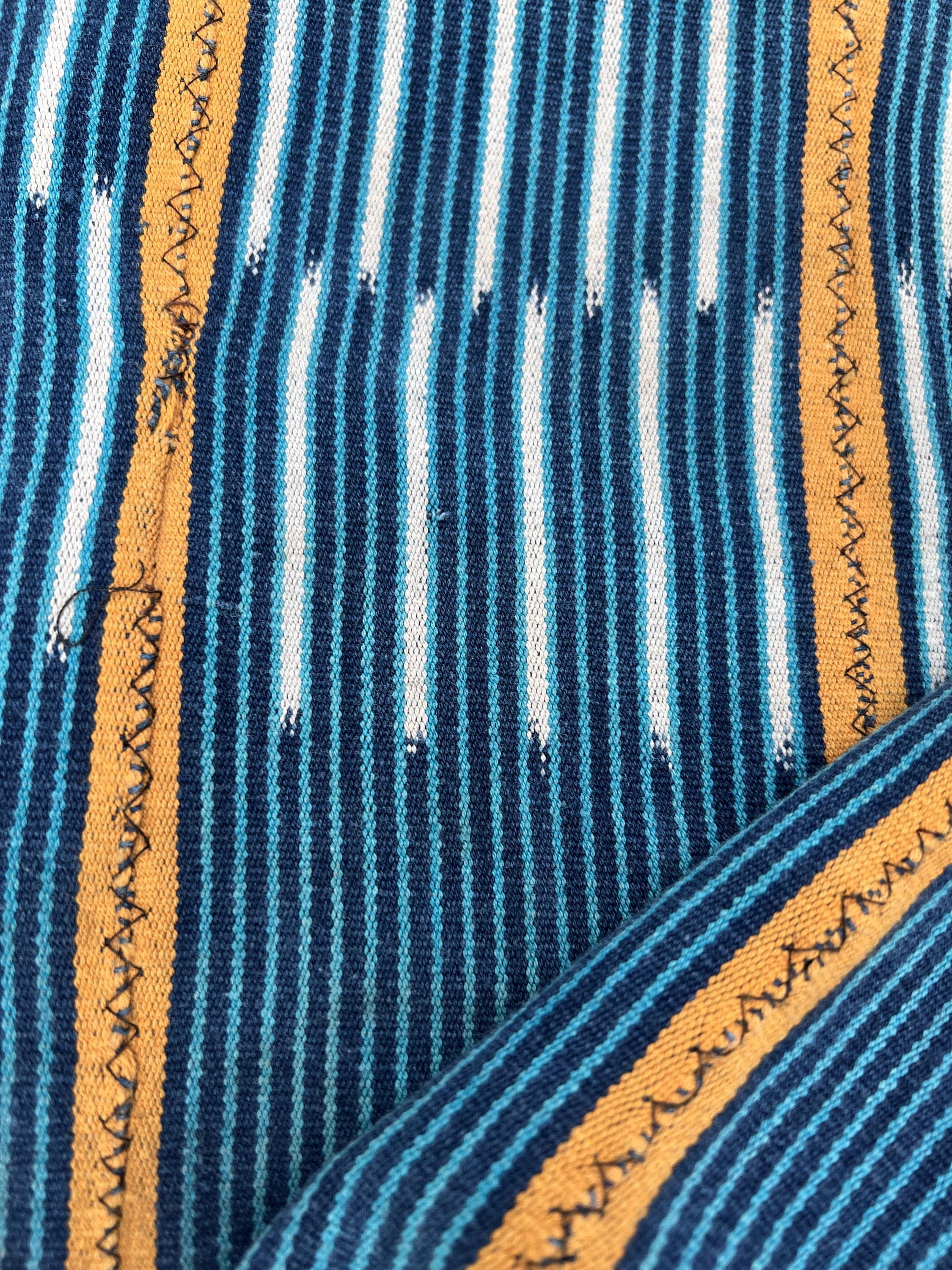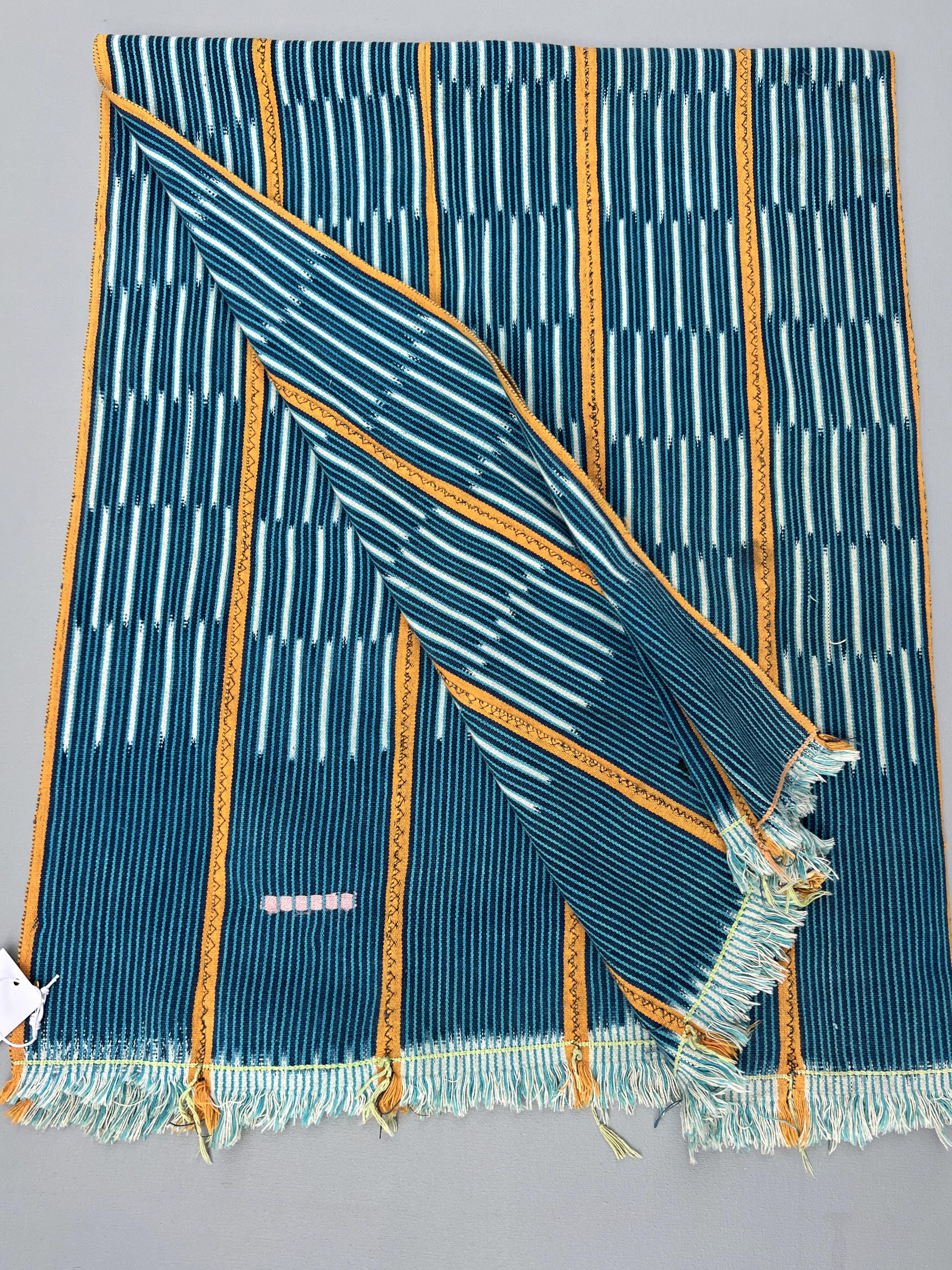 Vintage boho throw blanket, Indigo blue, light teal/turquoise, orange, and white with bright accents. A lovely African fabric for a coastal, cultural decor project. Ethnic global style. Unique textile that’s one of a kind.