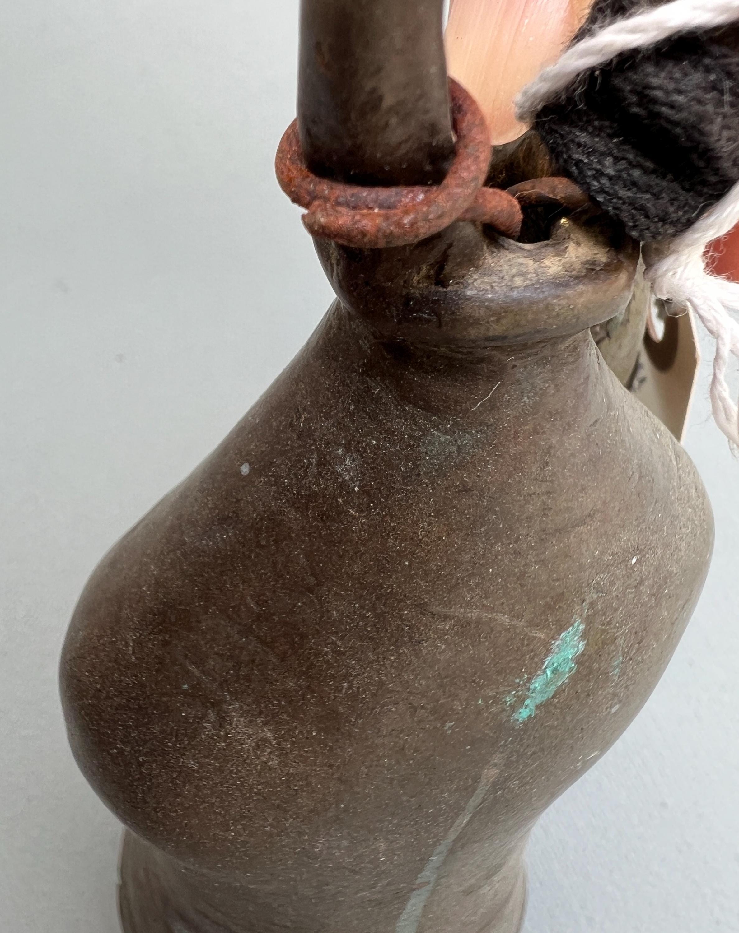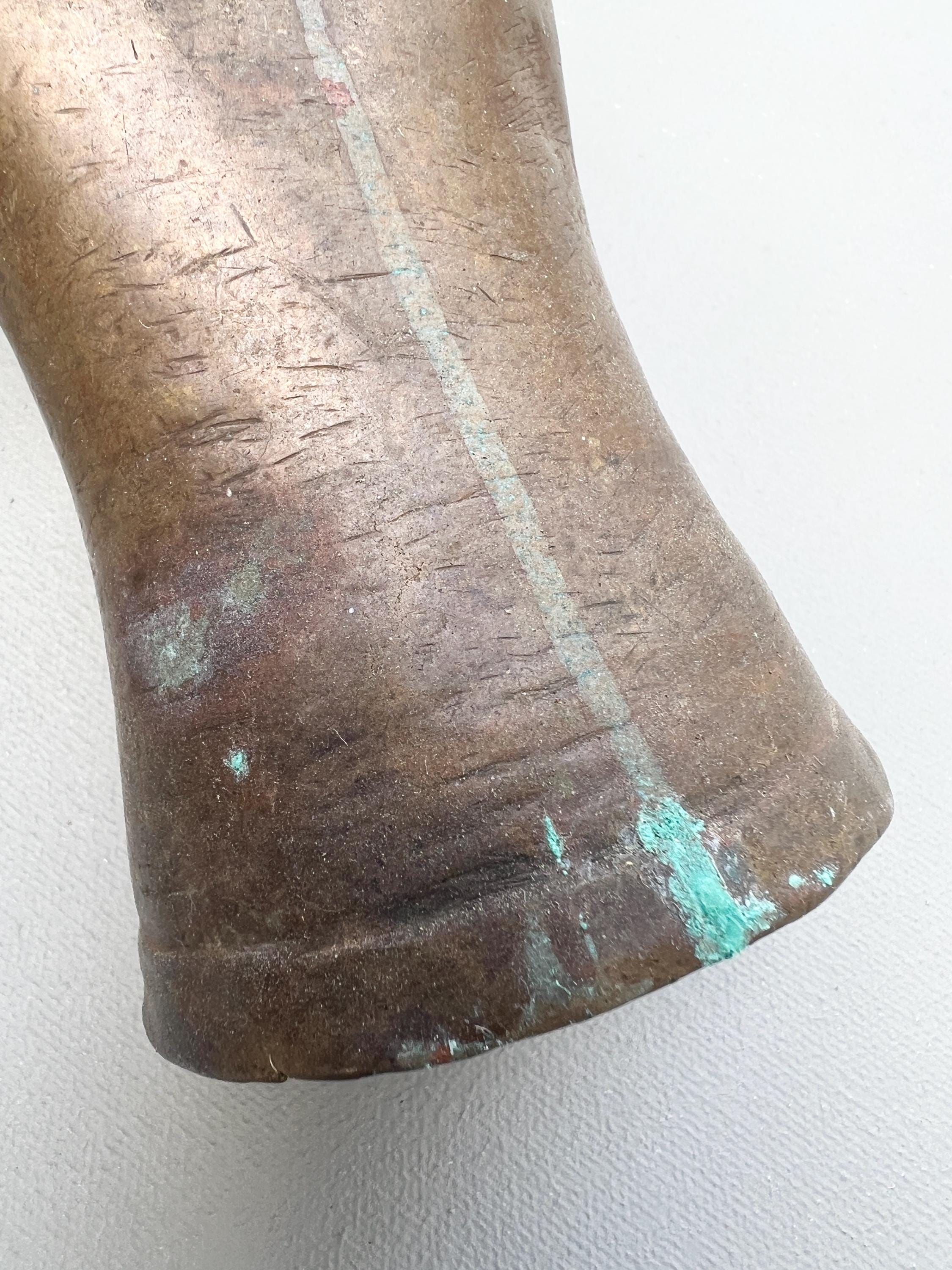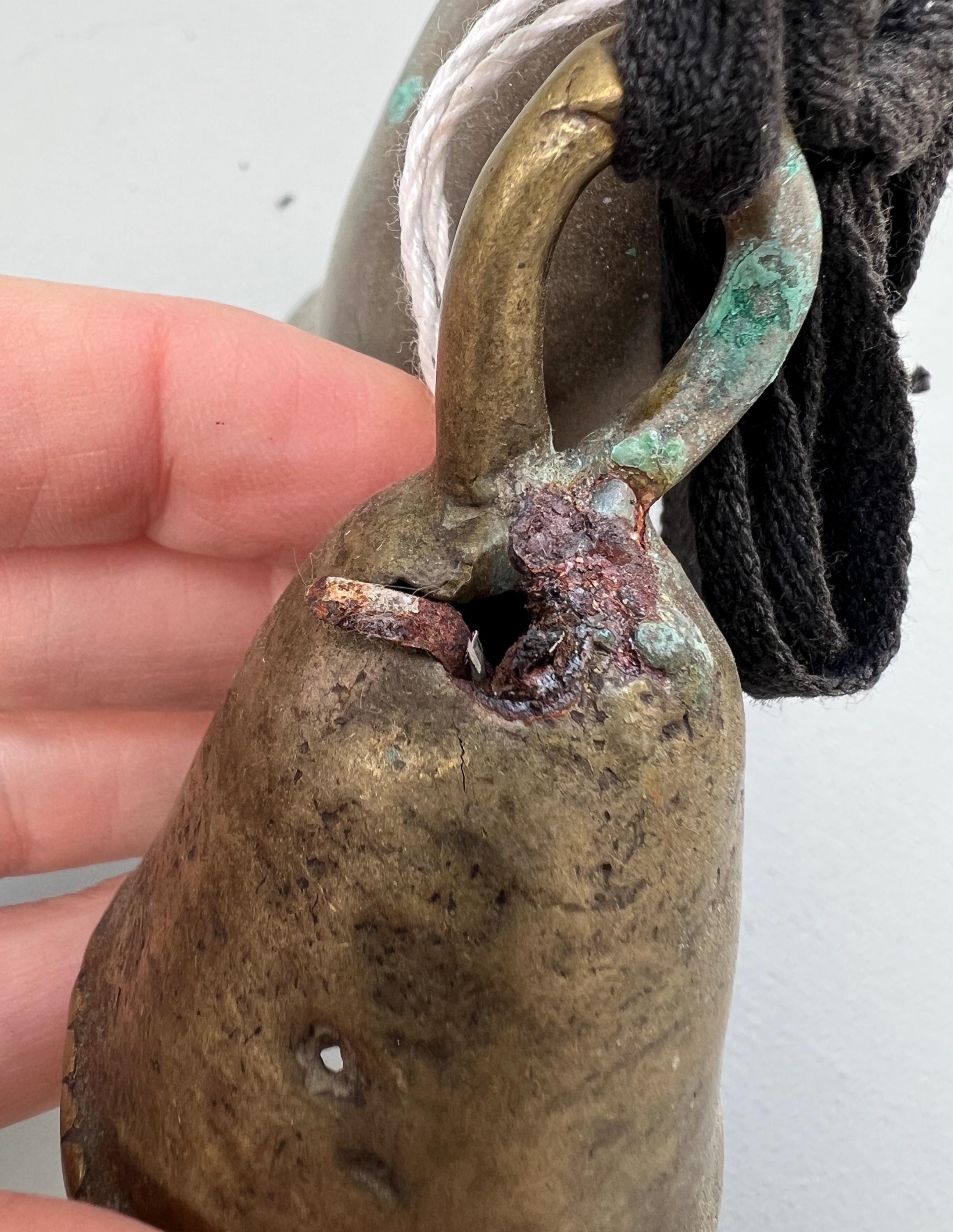 Rustic antique patina and simple band along the base. Dents, cracks, holes, and irregular shape add personality. These bells do function and have a classic bell tone.