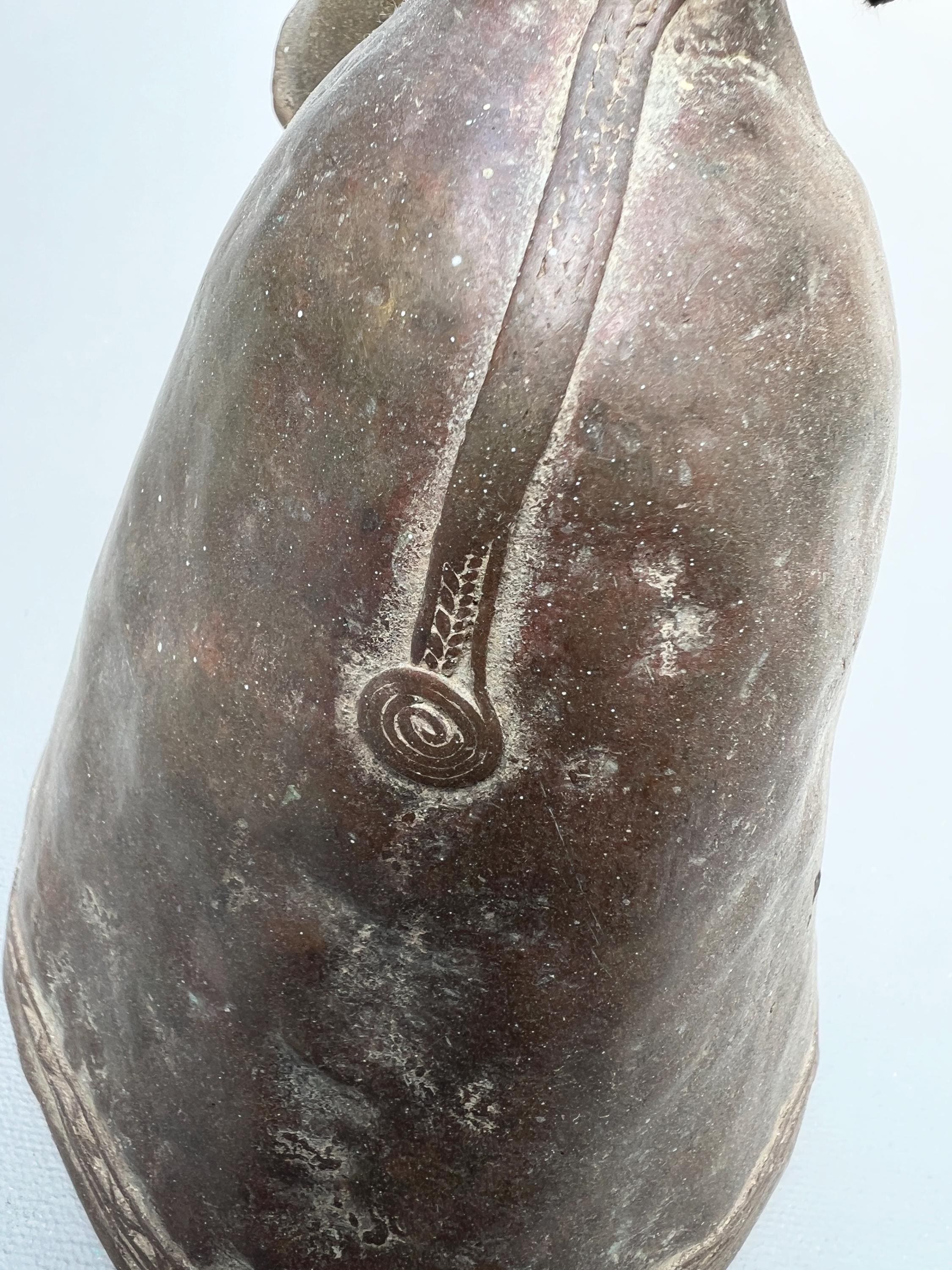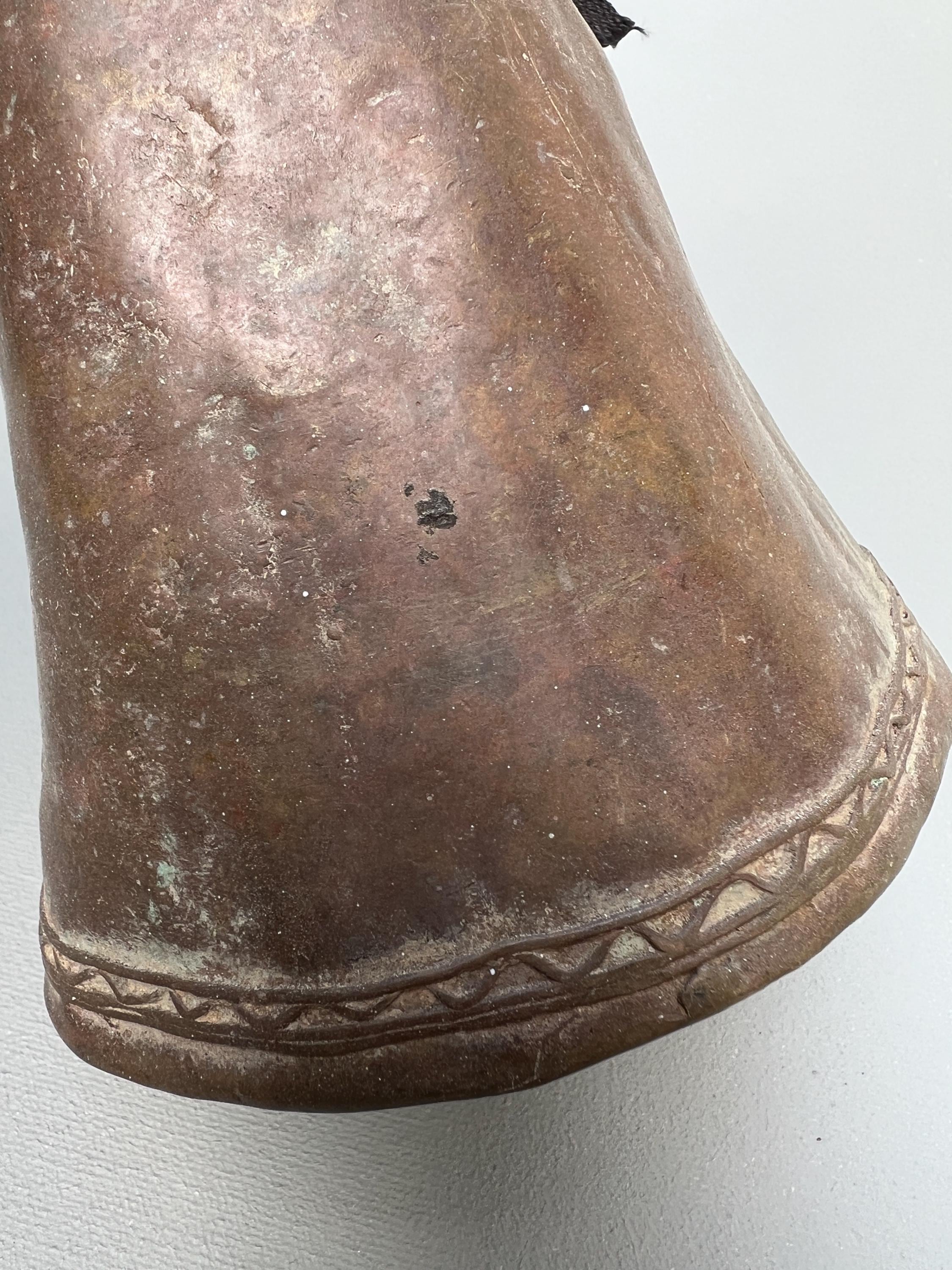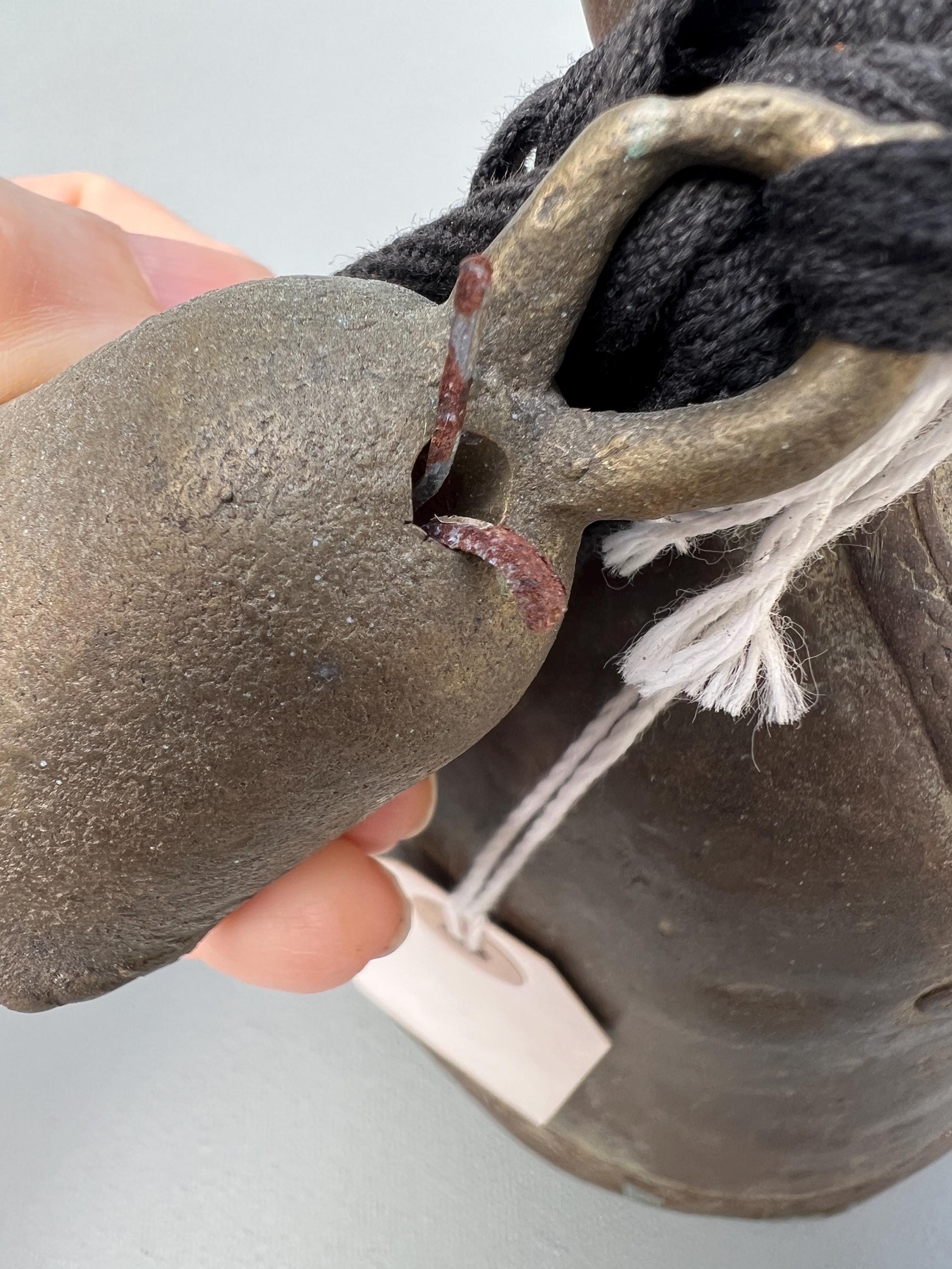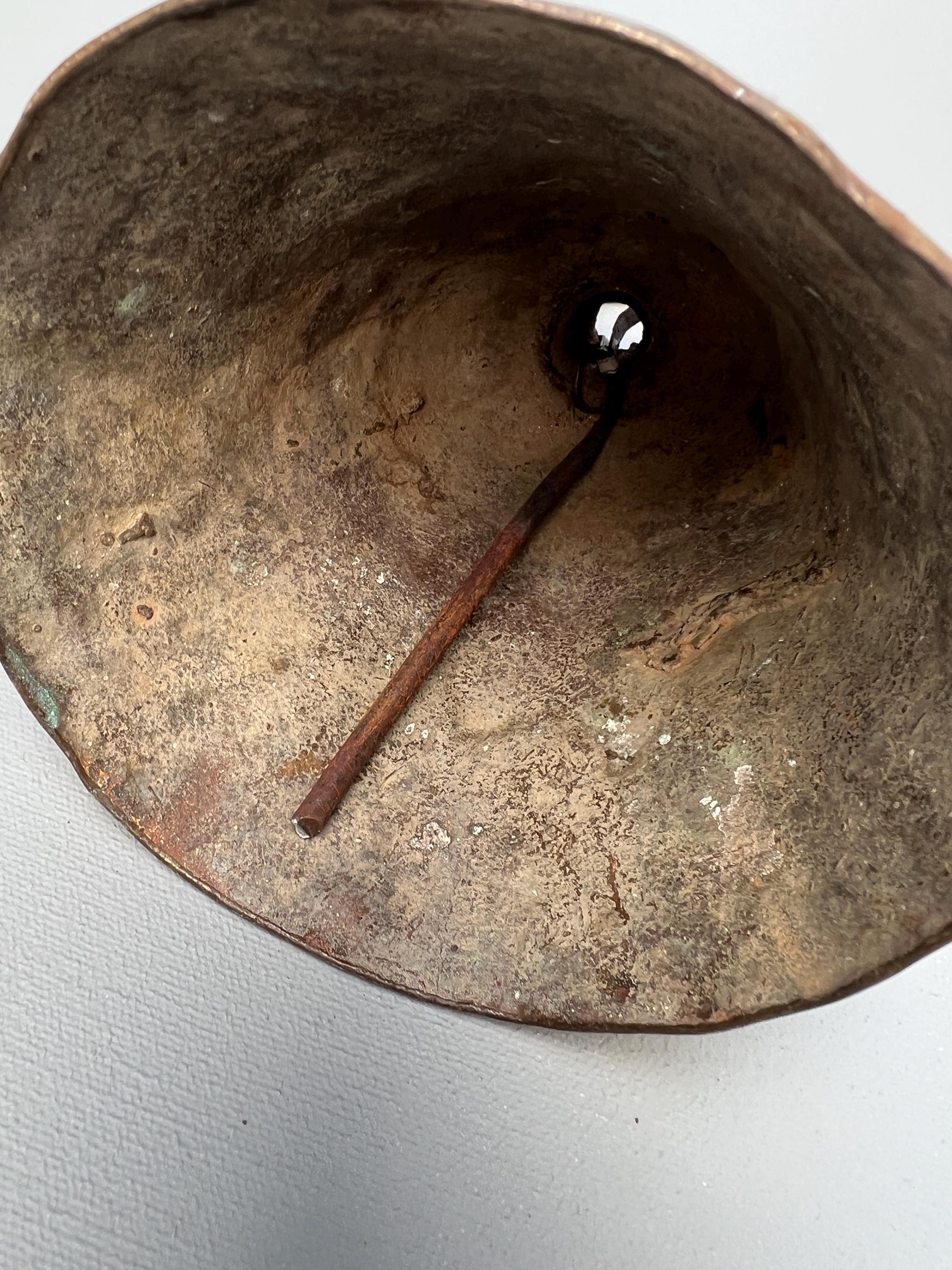 Rustic antique patina and simple raised relief band along the base. Dents, cracks, holes, and irregular shape add personality. These bells do function and have a classic bell tone.