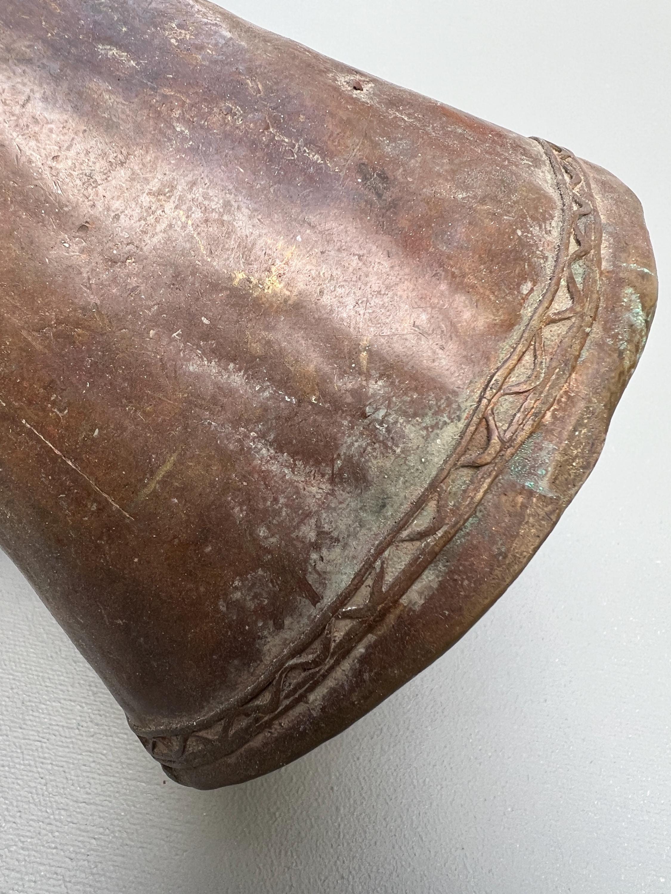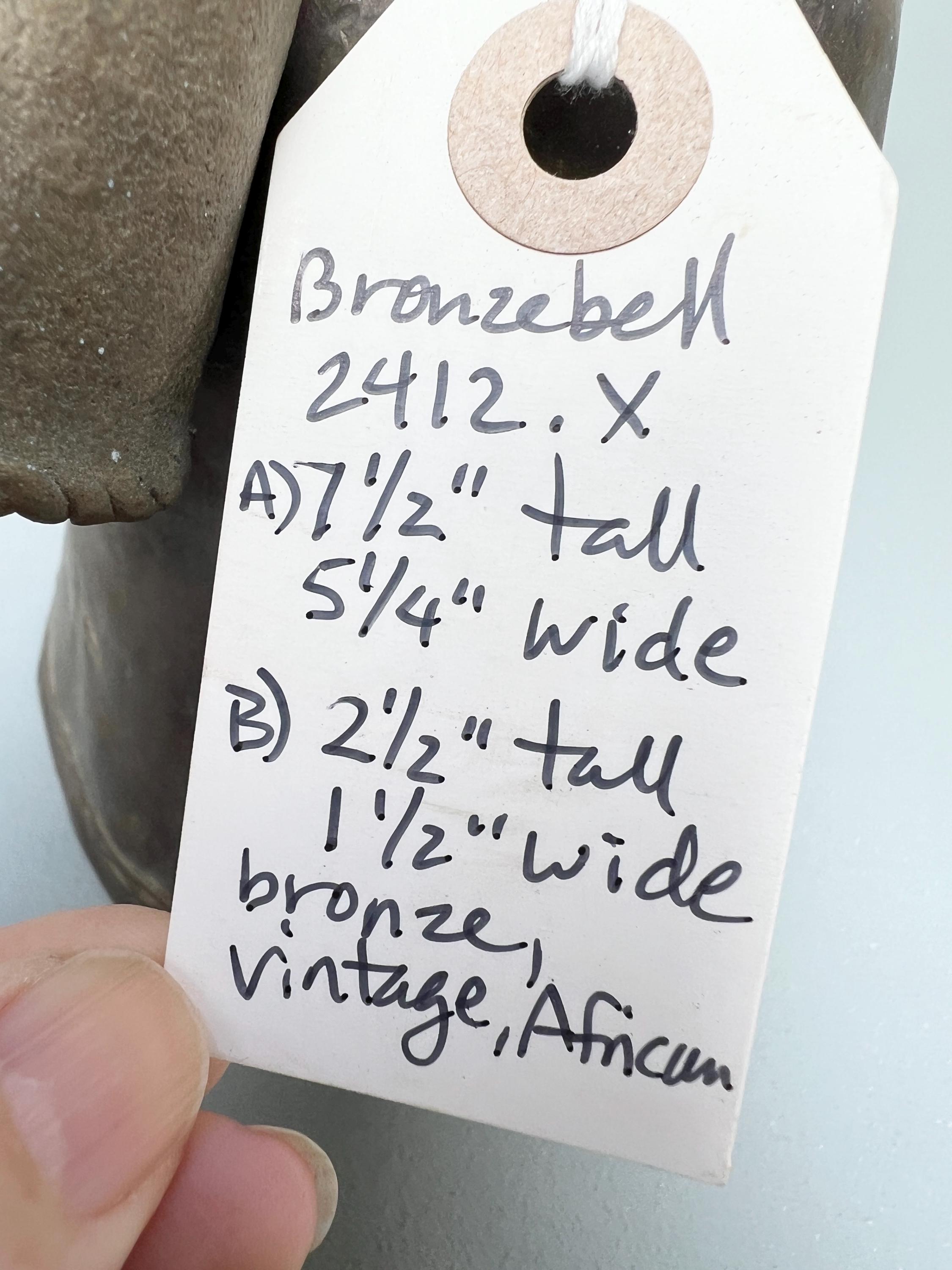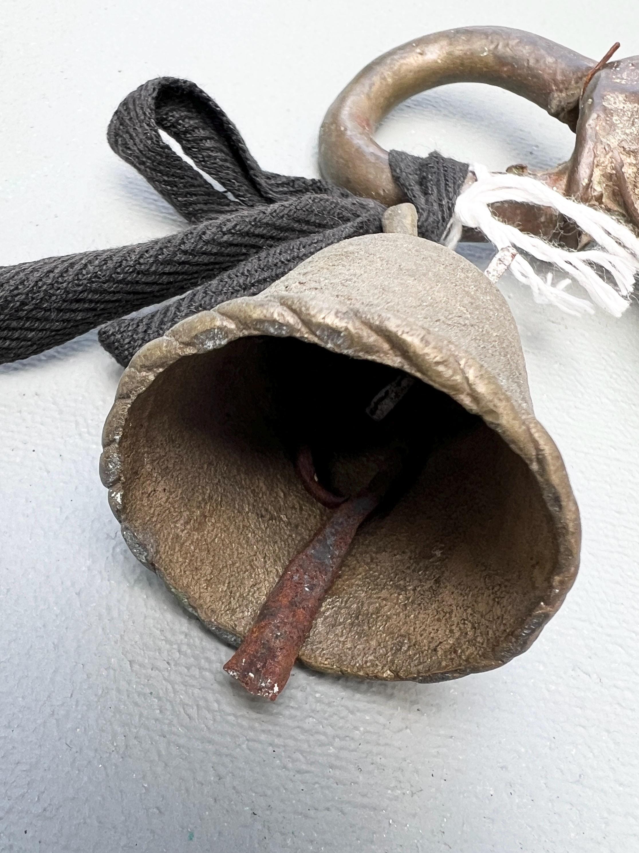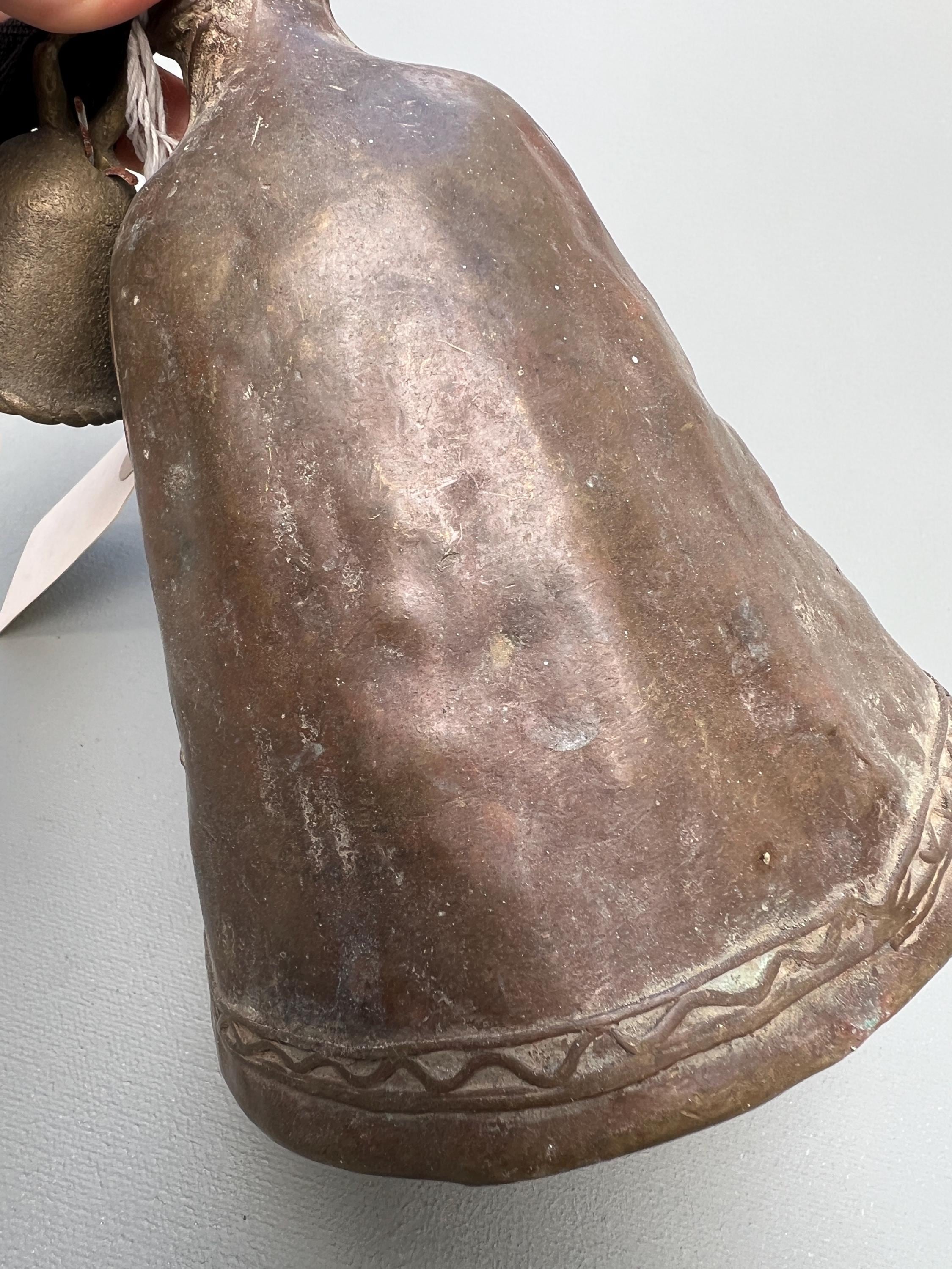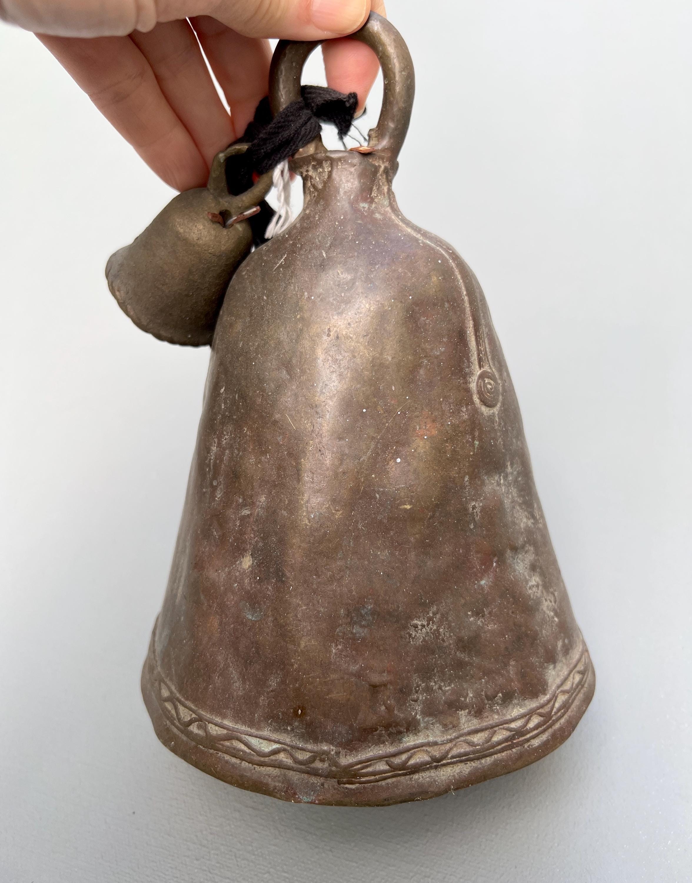 Bells- large and a small bronze bells make a handsome set. Primitive, hand made, and solid bronze this listing is for the set of two in the photos.