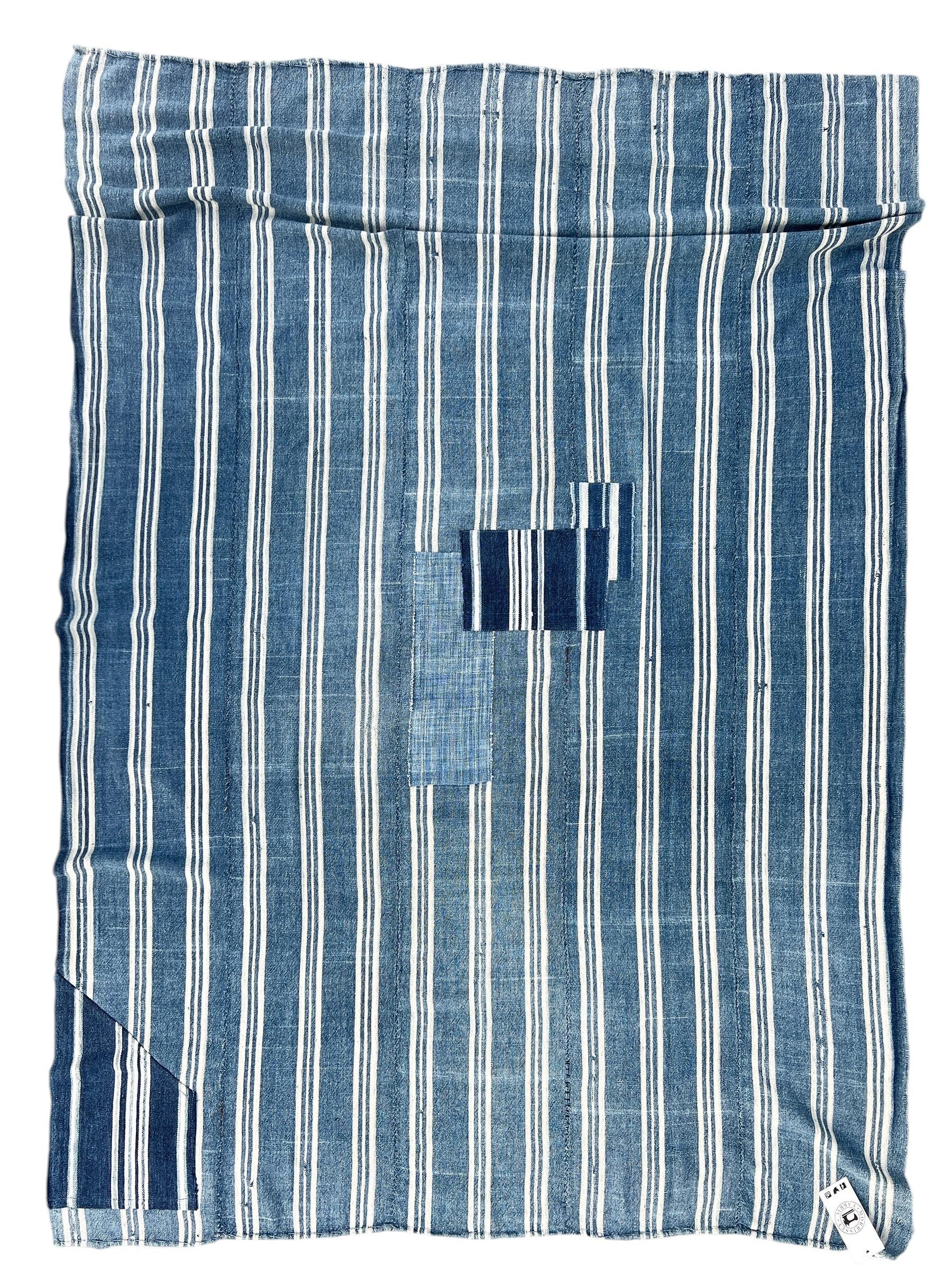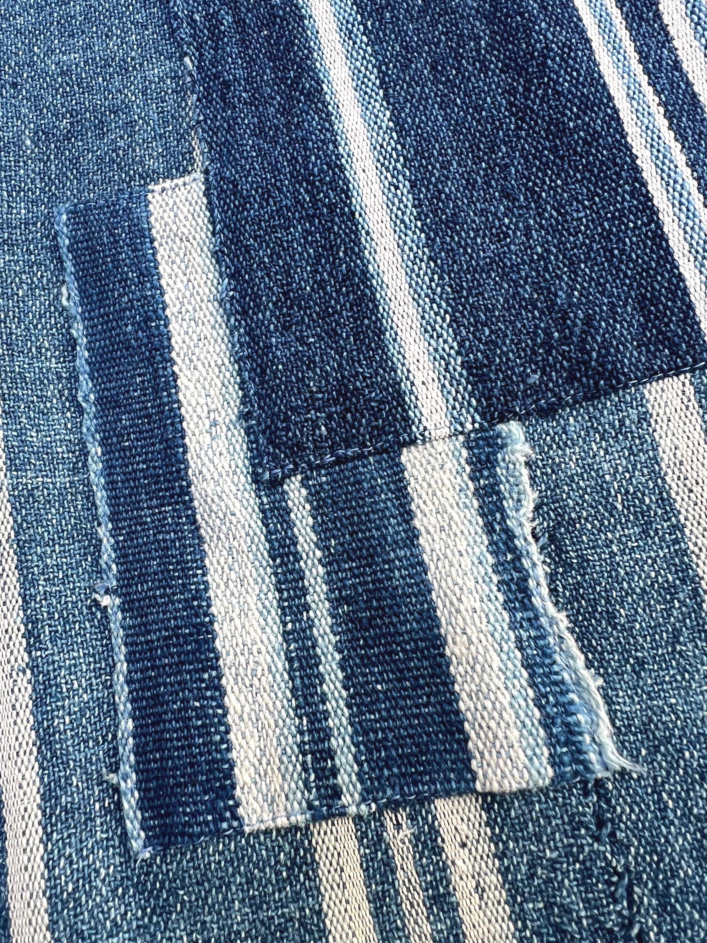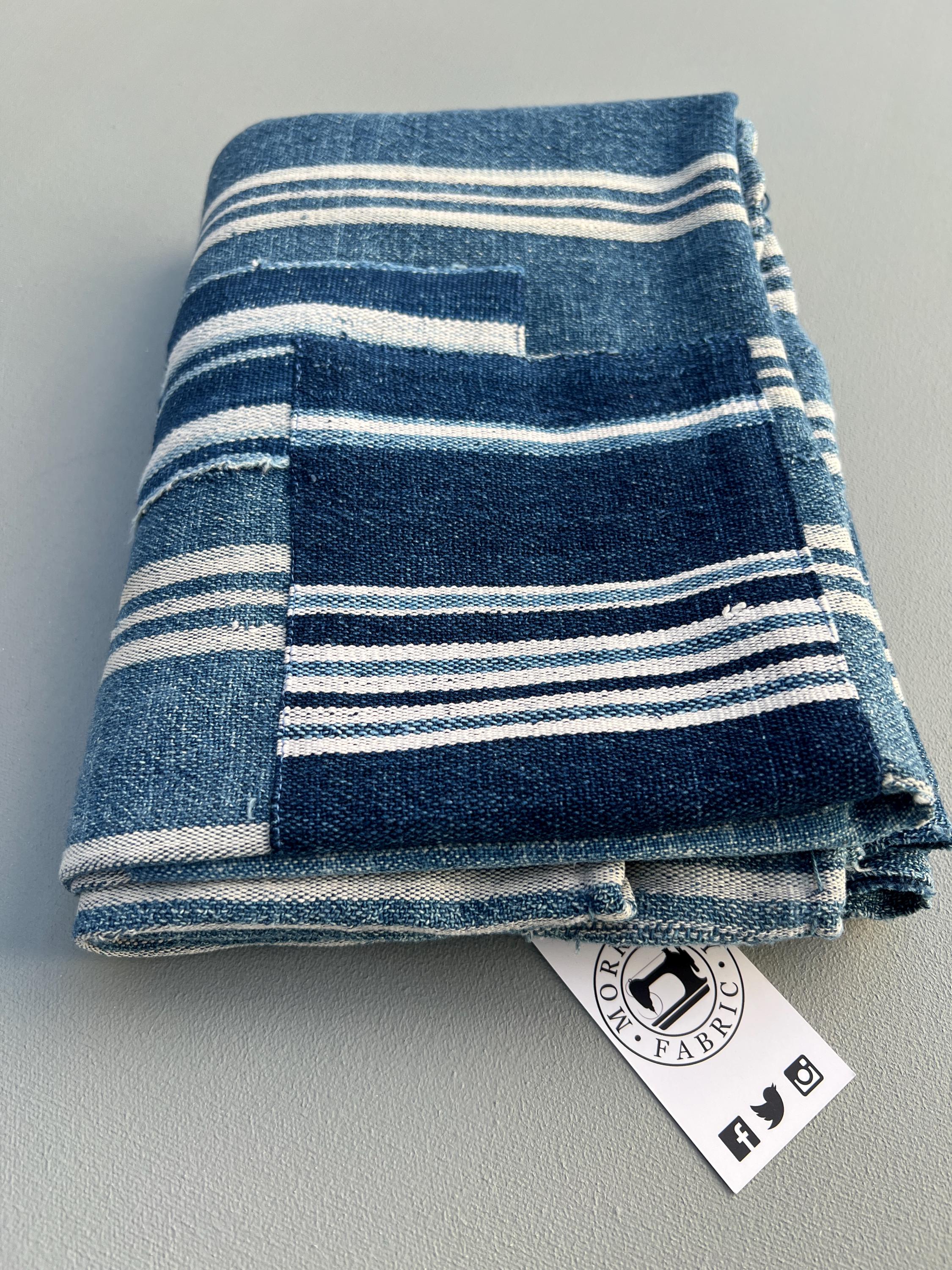 Striped throw with patches, Vintage African Indigo mud cloth fabric, blue and white striped textile from Mali, Africa. Great piece for a throw or repurpose into pillows or a garment. Hand stitched seams. Yarn dyed stripes so you can use either side. Unique patchwork to up-cycle this vintage fabric.