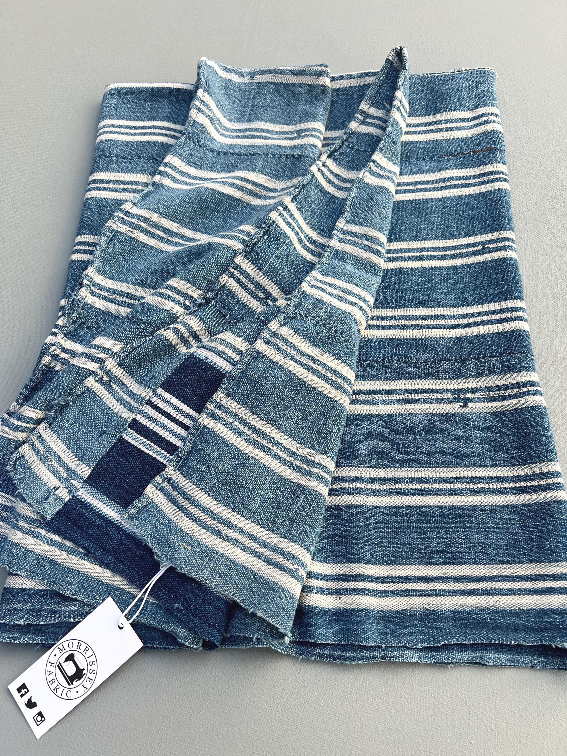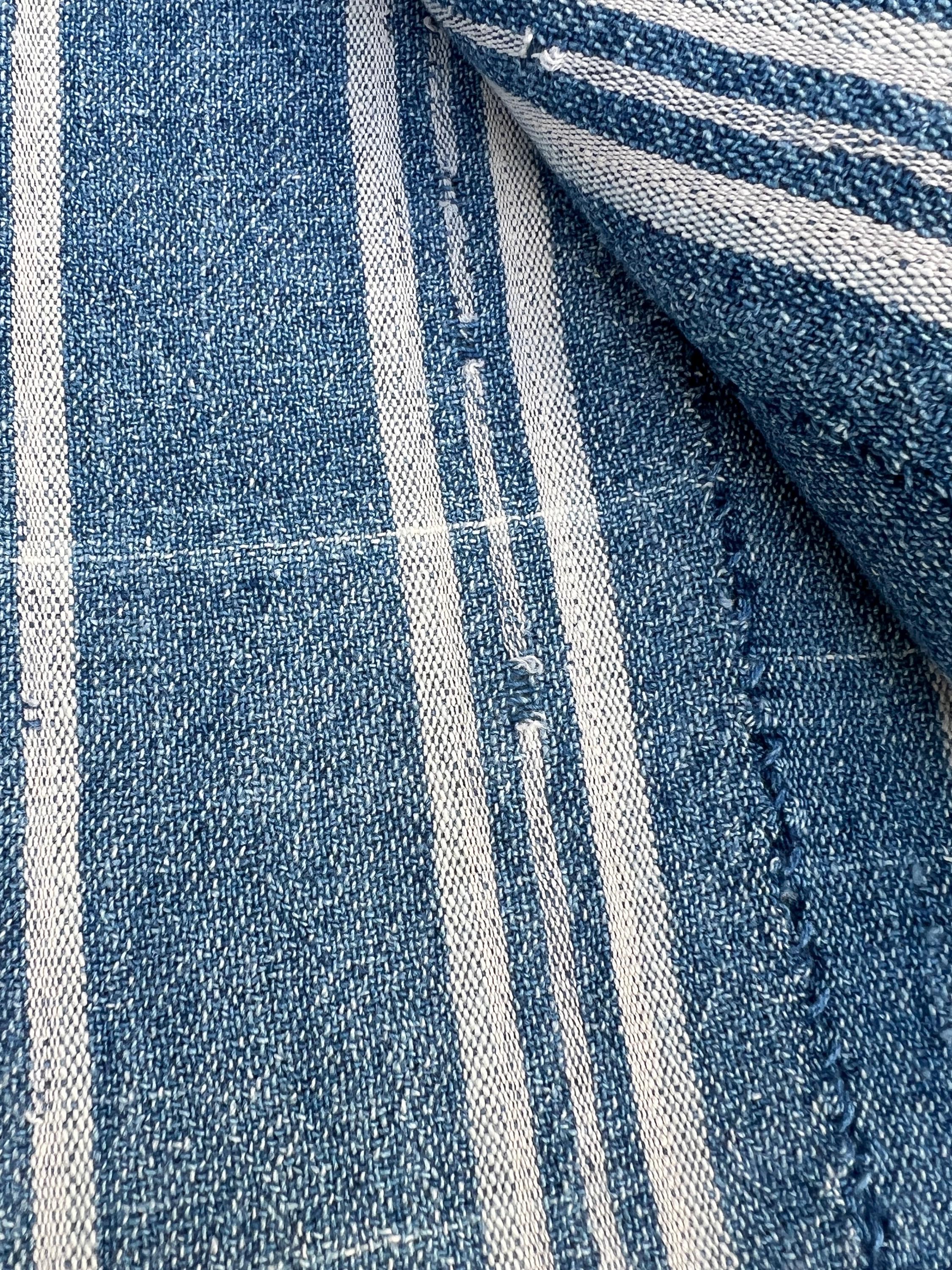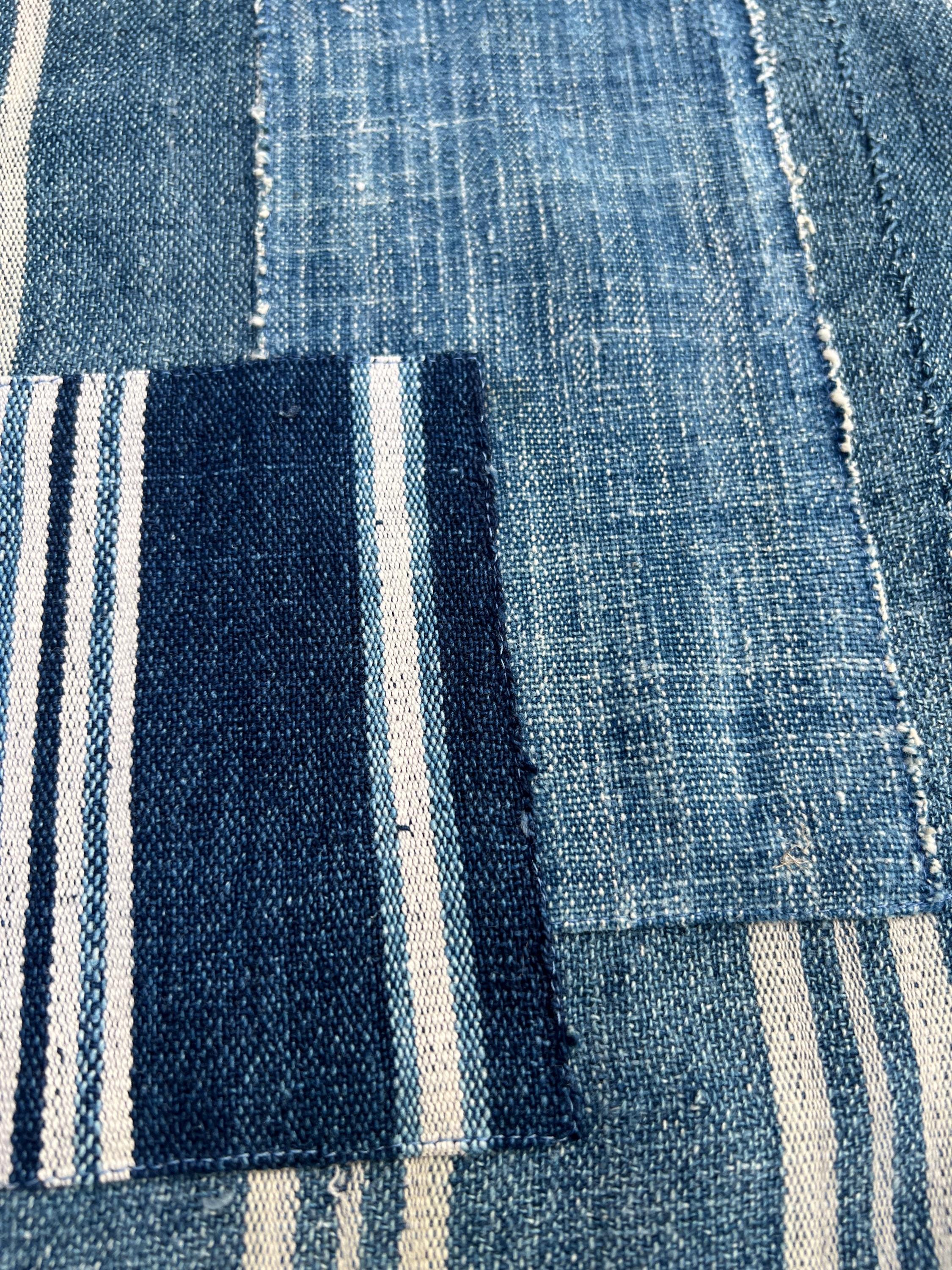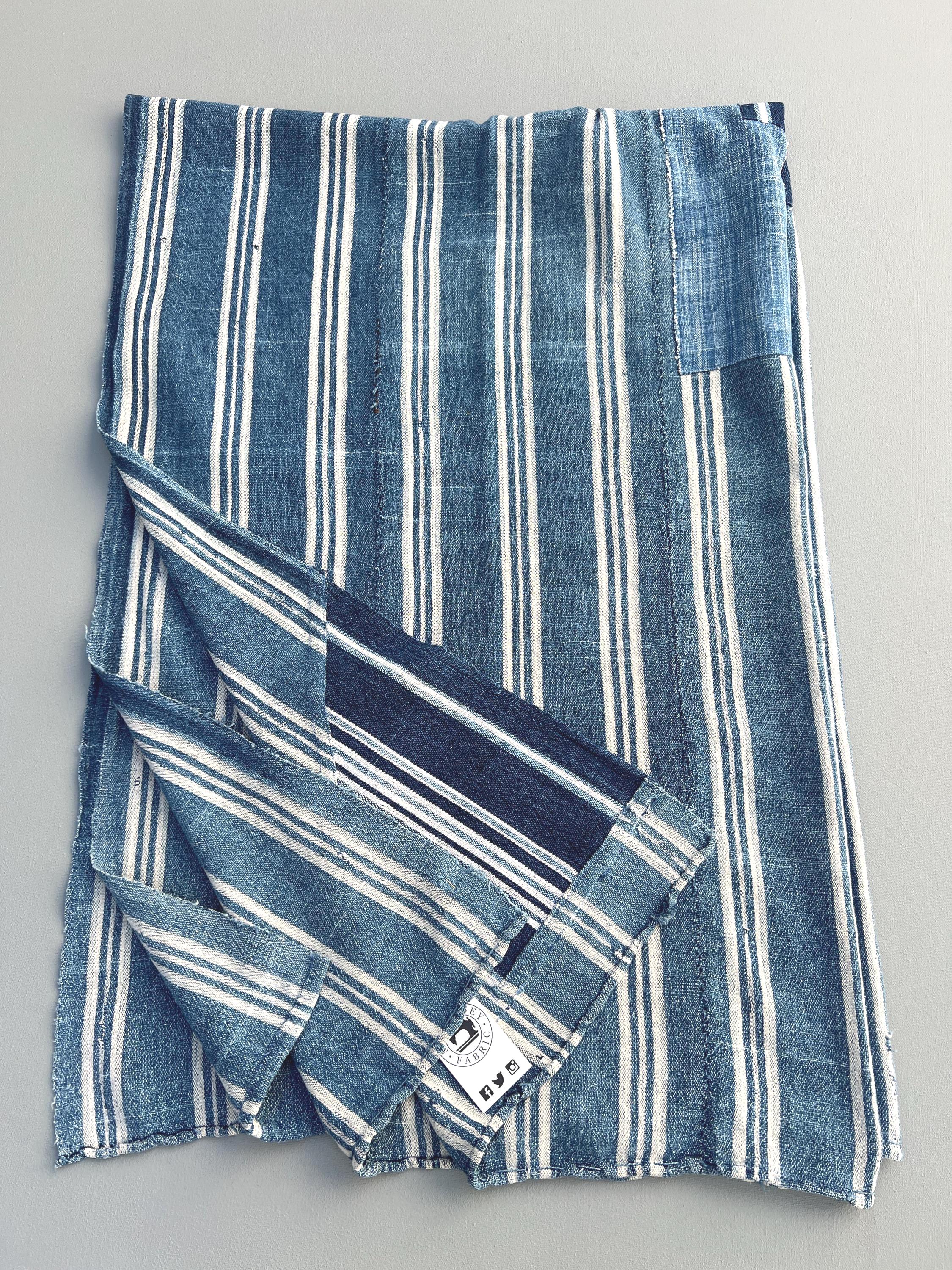 Striped throw with patches, Vintage African Indigo mud cloth fabric, blue and white striped textile from Mali, Africa. Great piece for a throw or repurpose into pillows or a garment. Hand stitched seams. Yarn dyed stripes so you can use either side. Unique patchwork to up-cycle this vintage fabric.