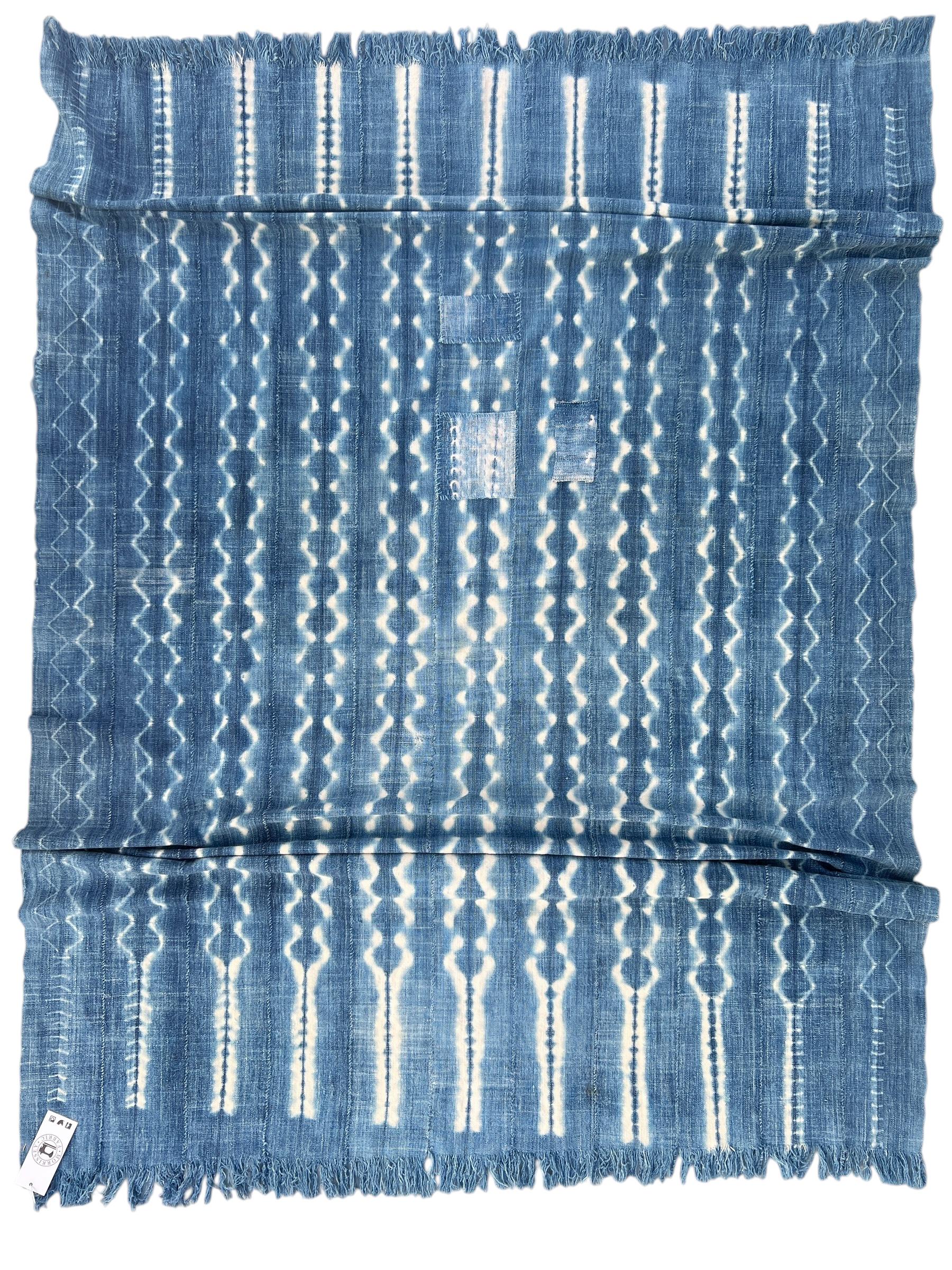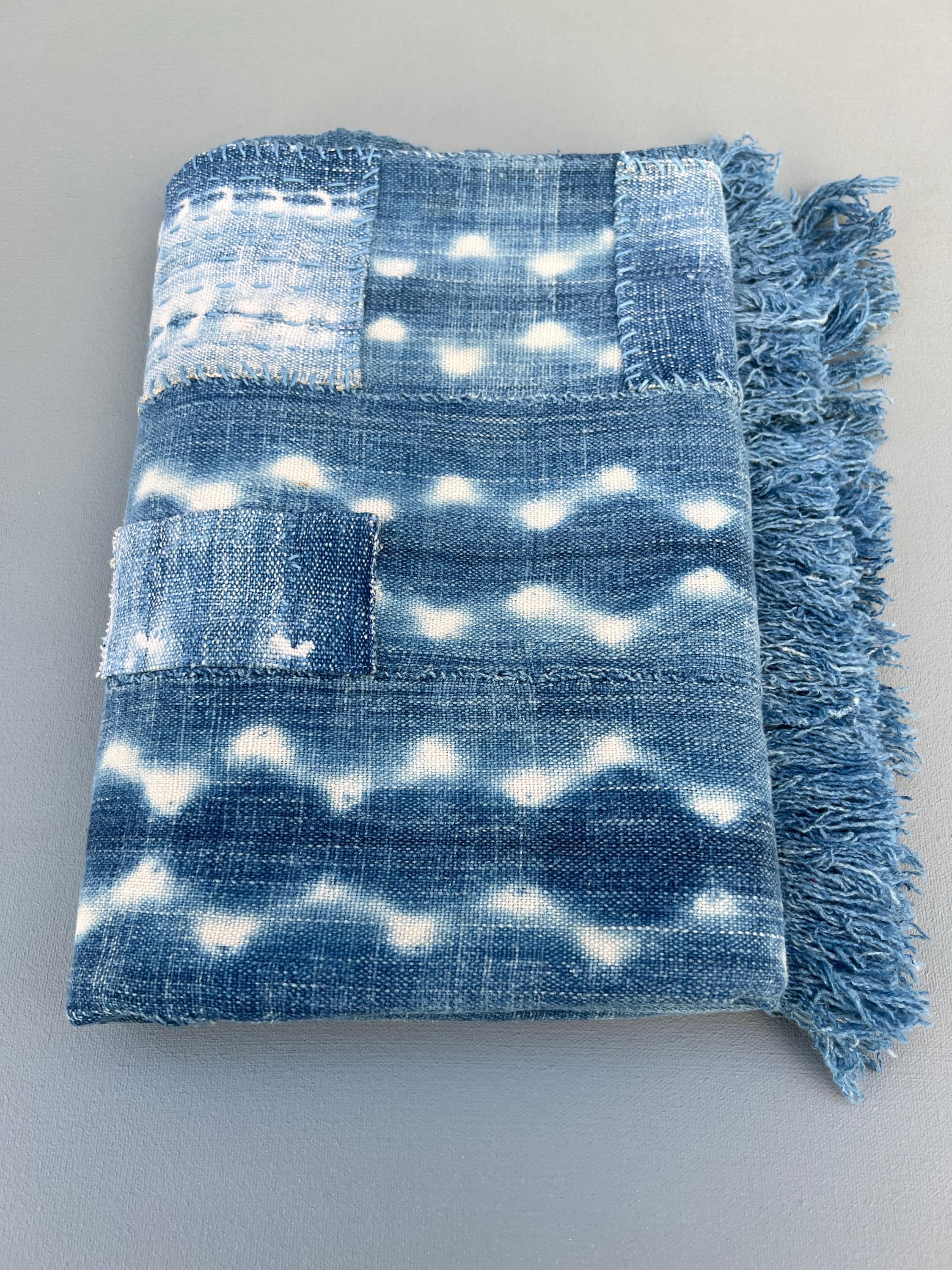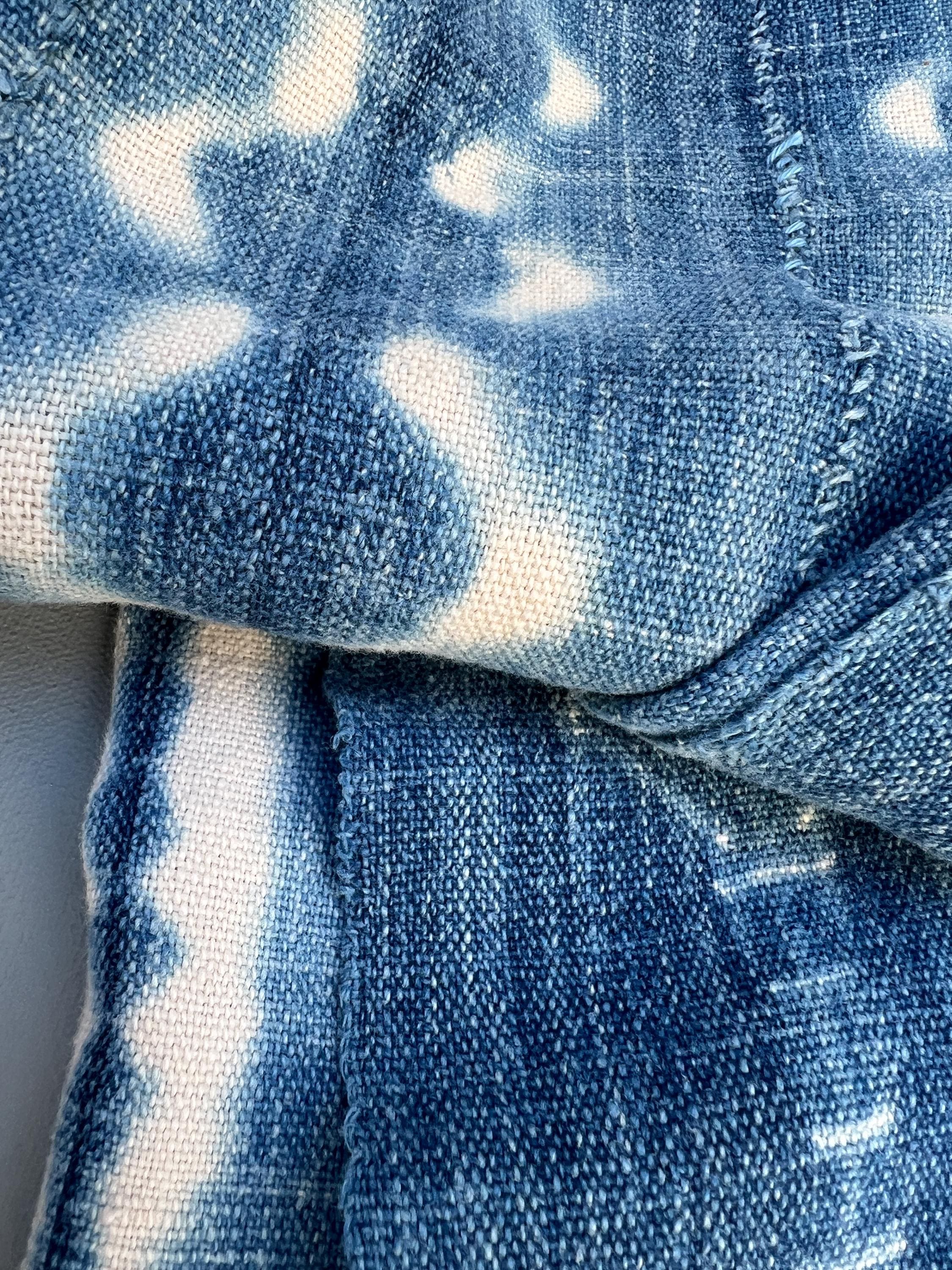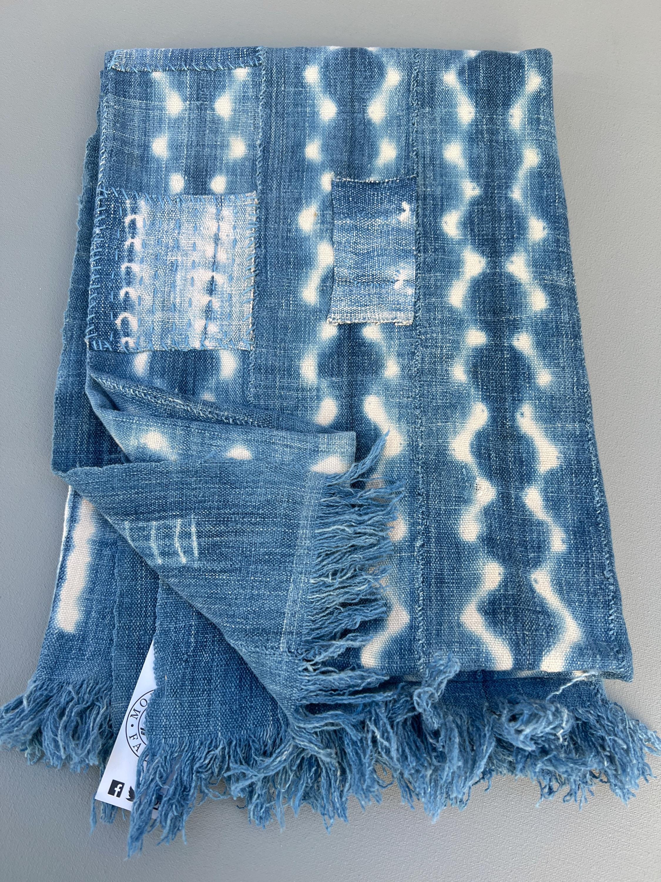 Gorgeous unique Indigo mud cloth throw that’s one of a kind. Super soft. Wonderful example of a textural hand dyed African textile that’s hand sewn with repair patches. Pure cotton dyed to indigo blue and white with classic shibori designs. This is not one of the common lighter weight textiles seen in the market, it has a more substantial yarn and it's larger too.
