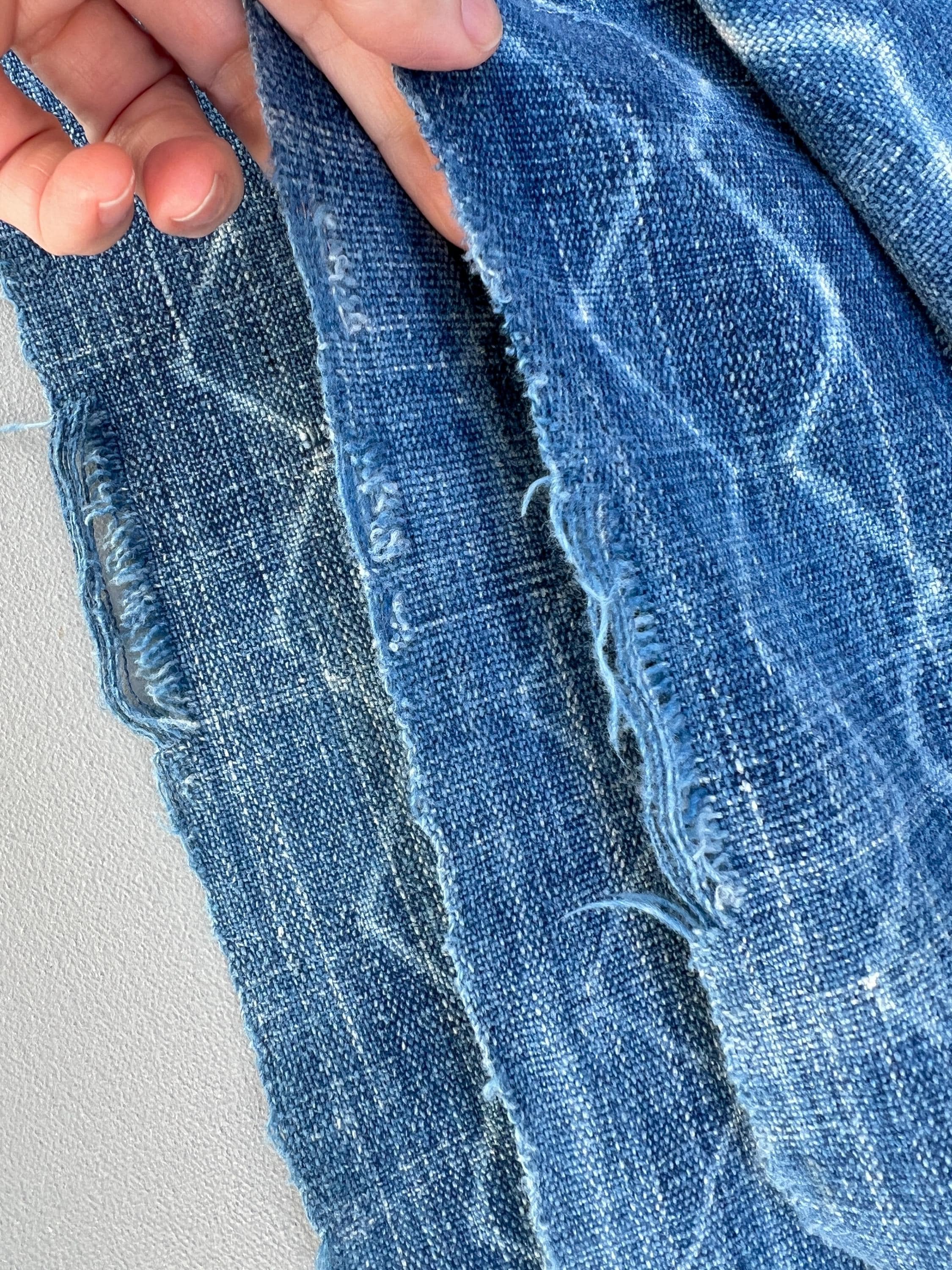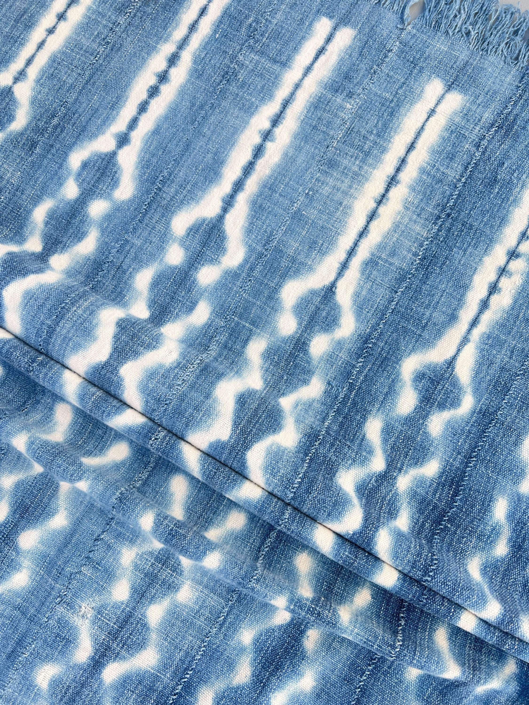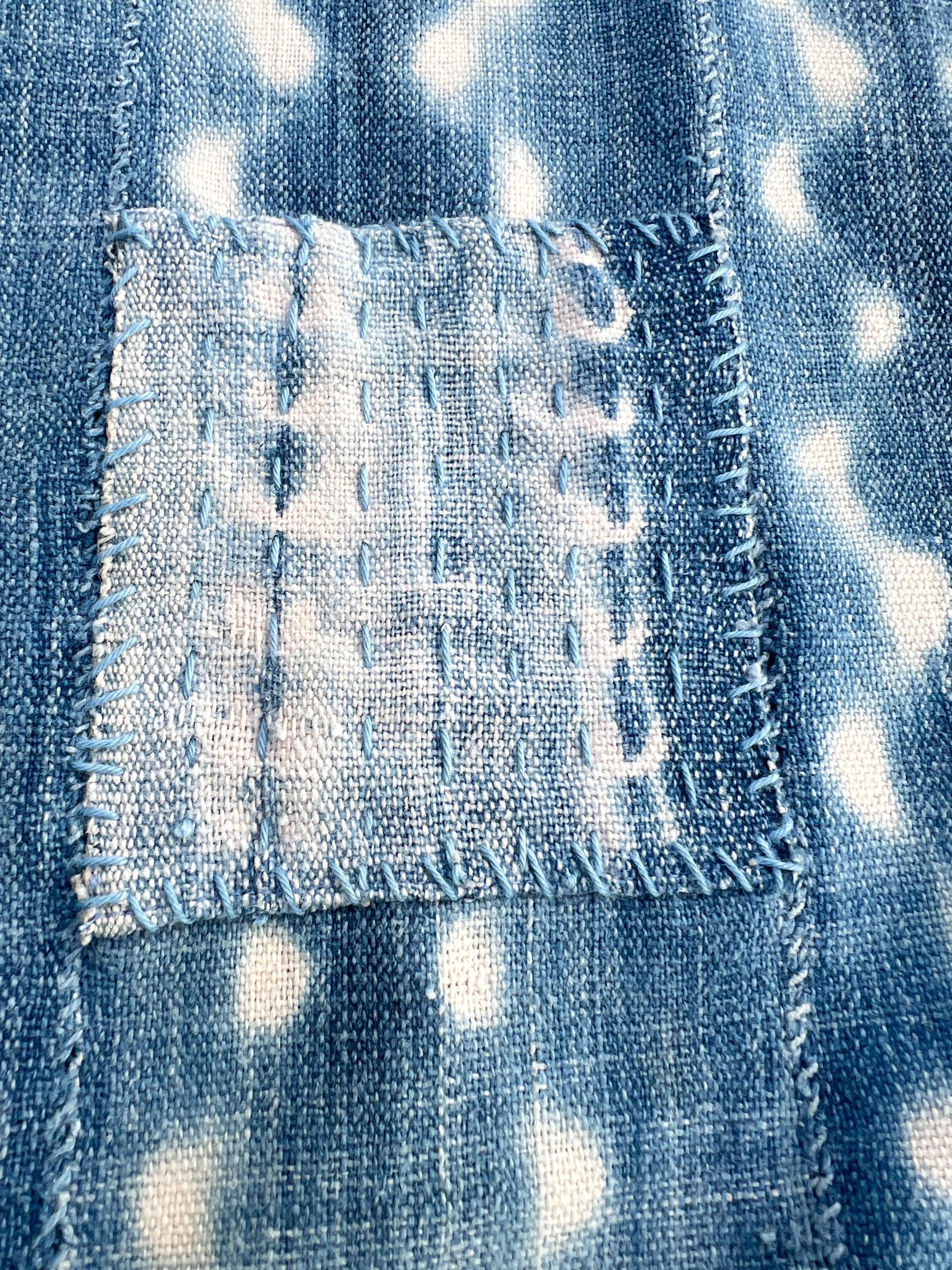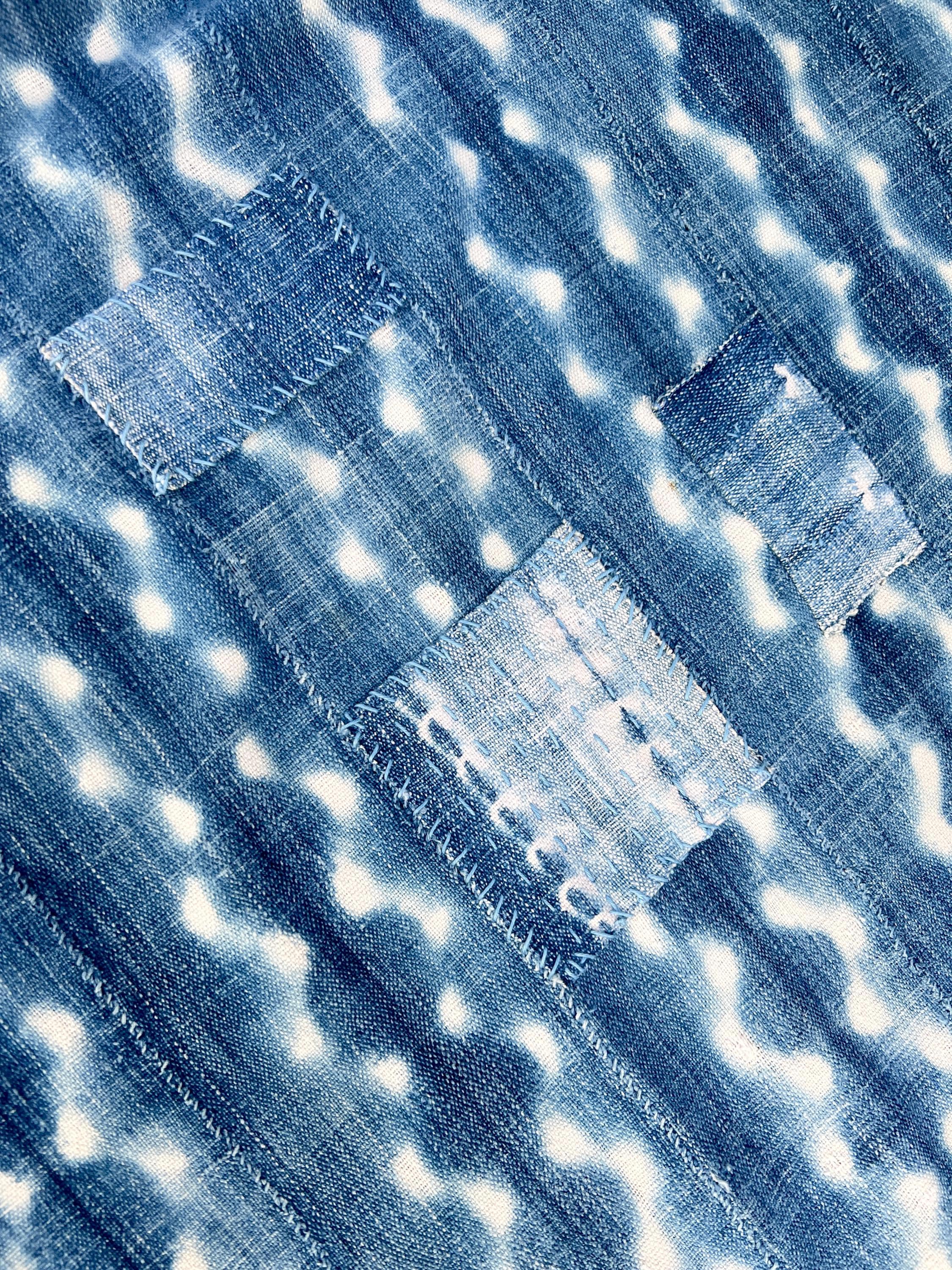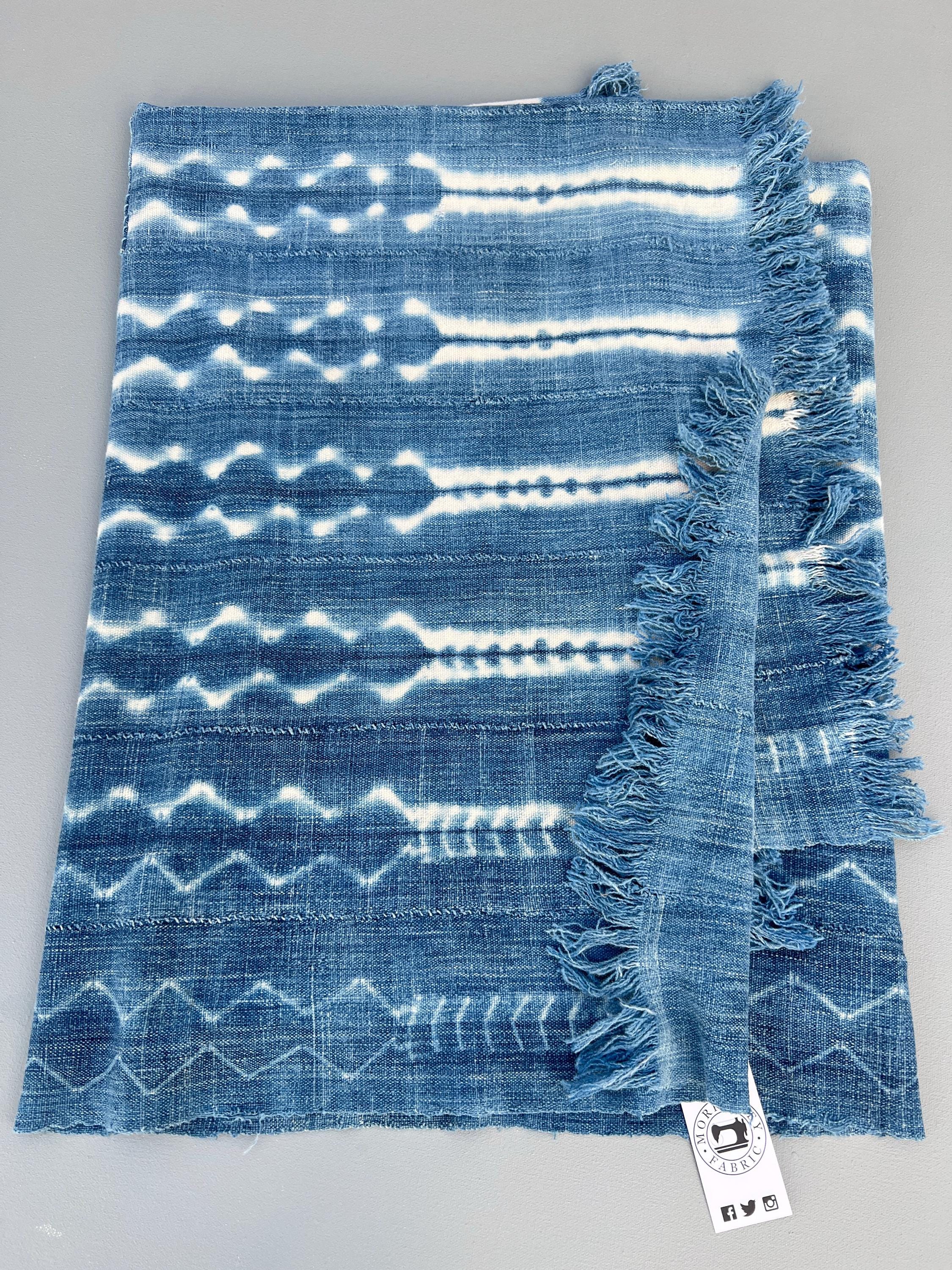 Gorgeous unique Indigo mud cloth throw that’s one of a kind. Super soft. Wonderful example of a textural hand dyed African textile that’s hand sewn with repair patches. Pure cotton dyed to indigo blue and white with classic shibori designs. This is not one of the common lighter weight textiles seen in the market, it has a more substantial yarn and it's larger too.