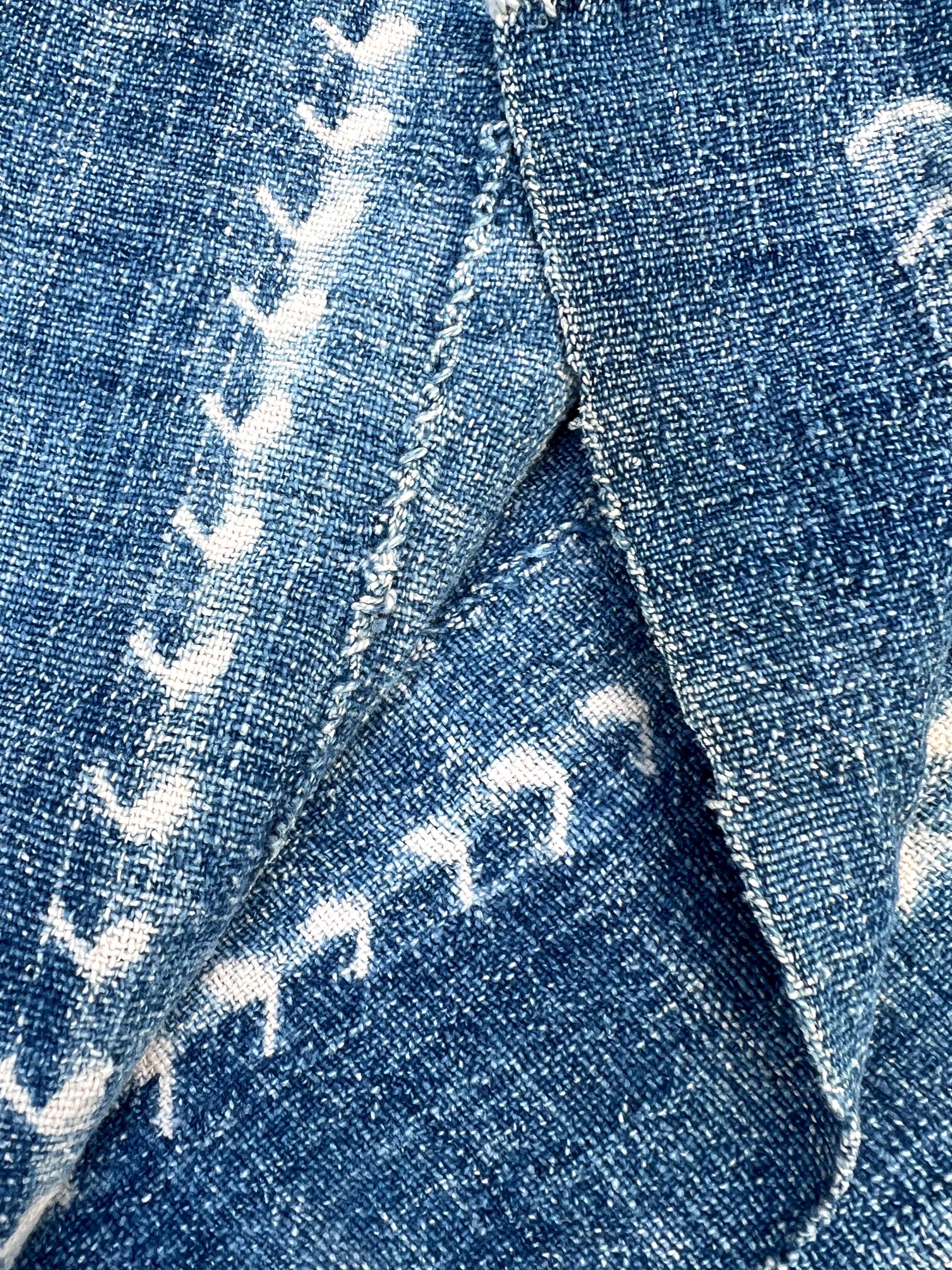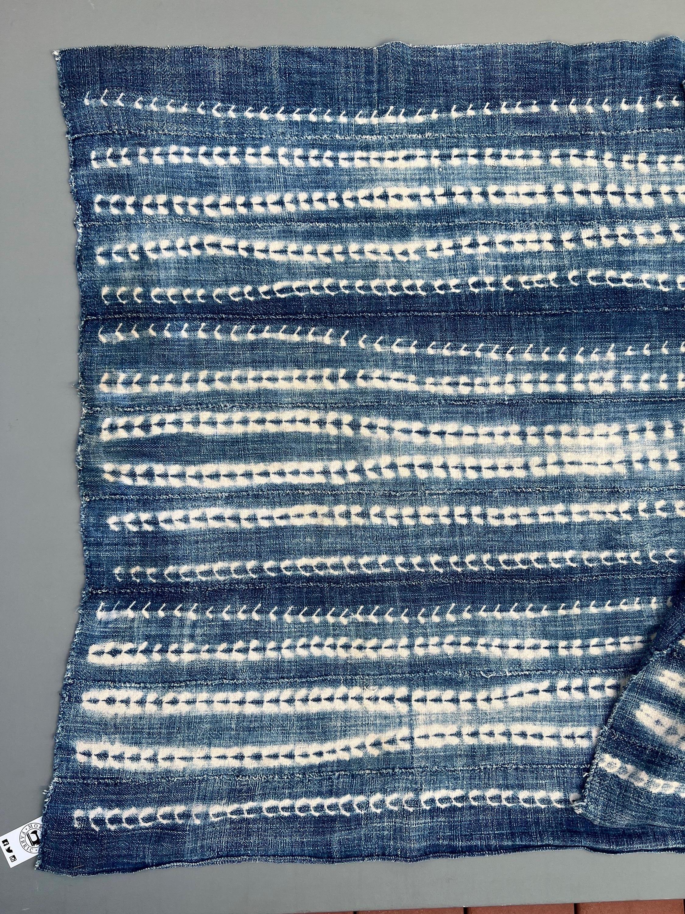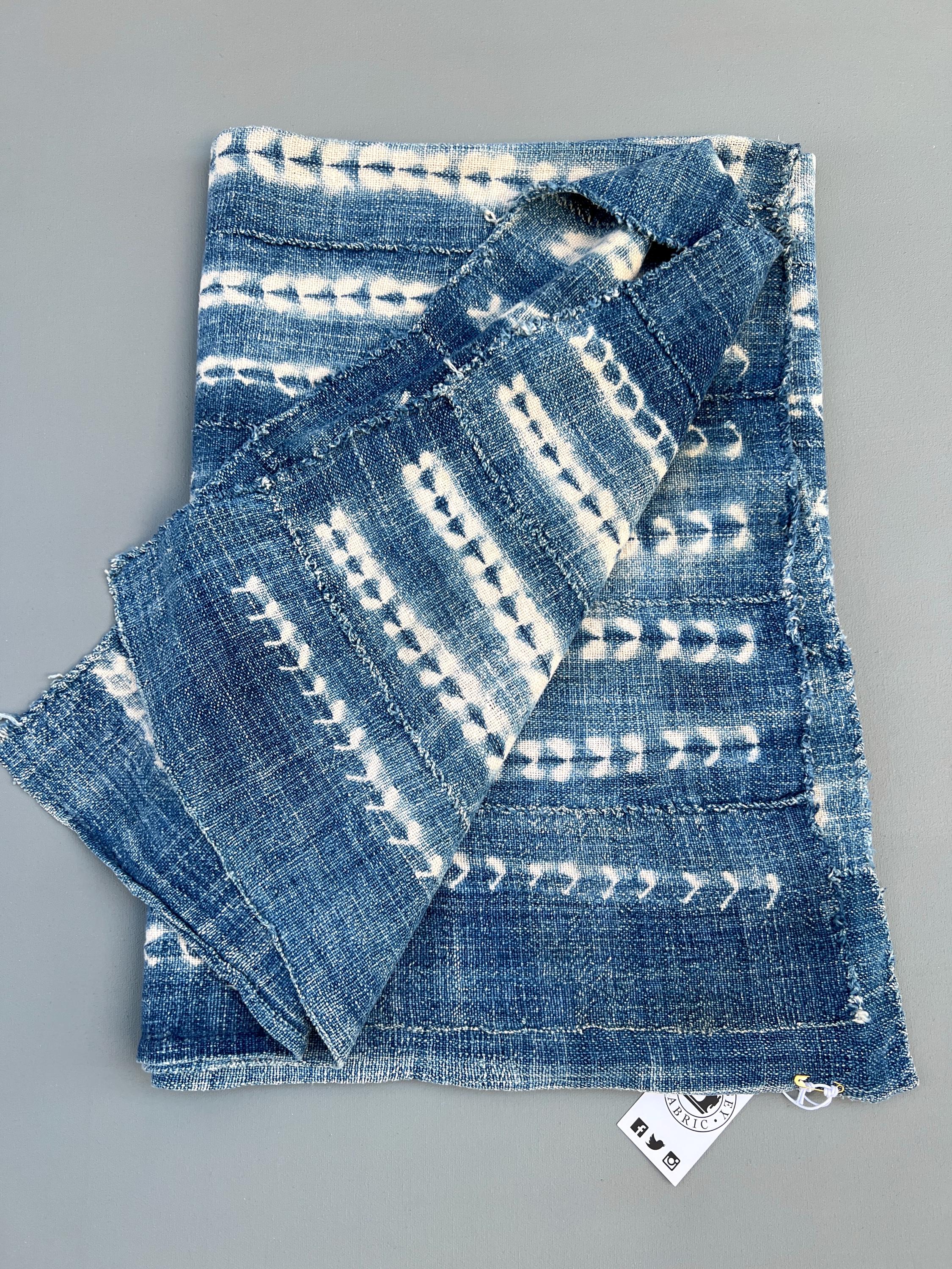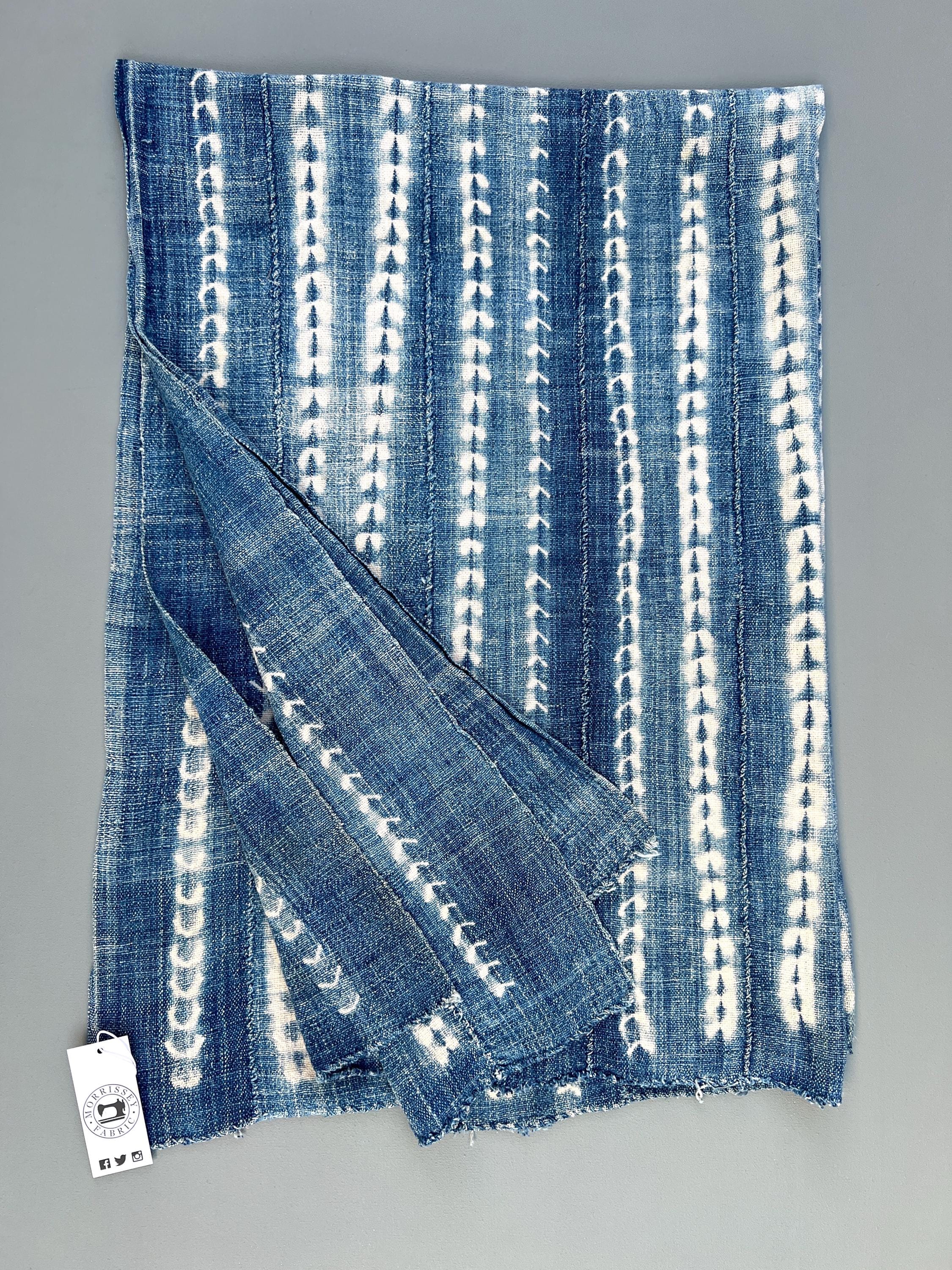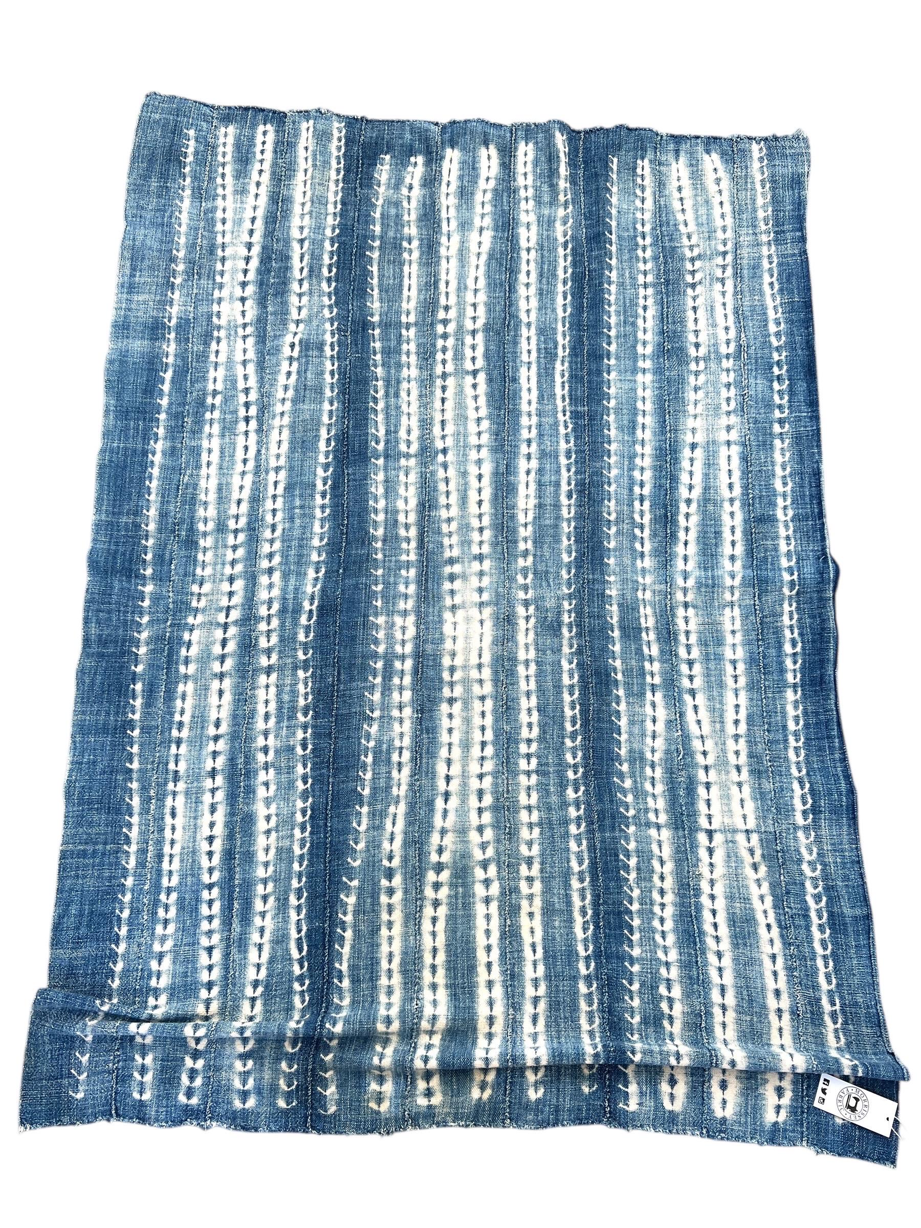 Hand made Indigo mud cloth throw in a hard to find textured weave. Lovely authentic fading. High quality African textile that’s hand sewn/hand dyed into a collectible piece. Pure cotton dyed to indigo blue and white with classic shibori designs. This is not one of the common lighter weight textiles seen in the market.