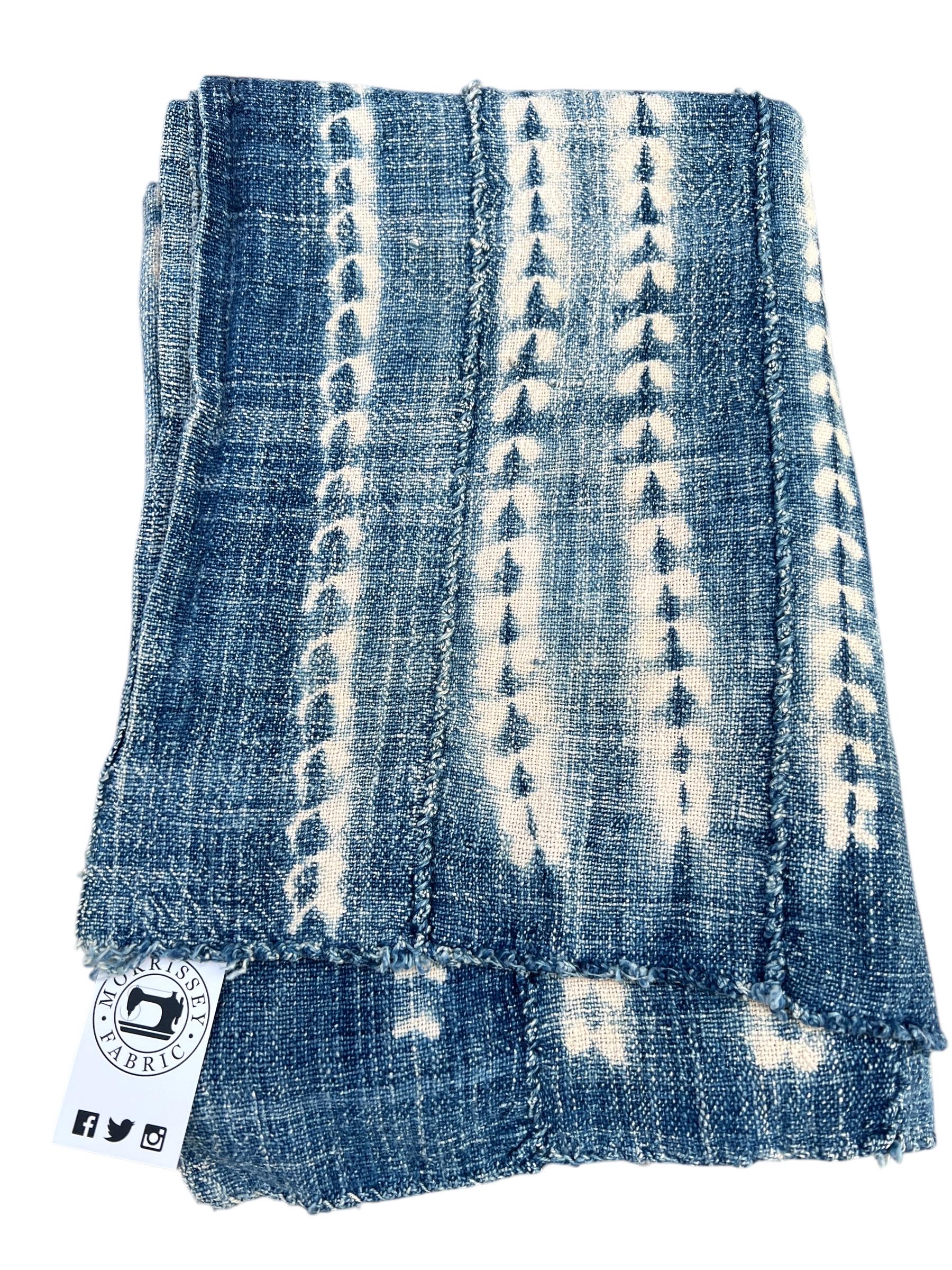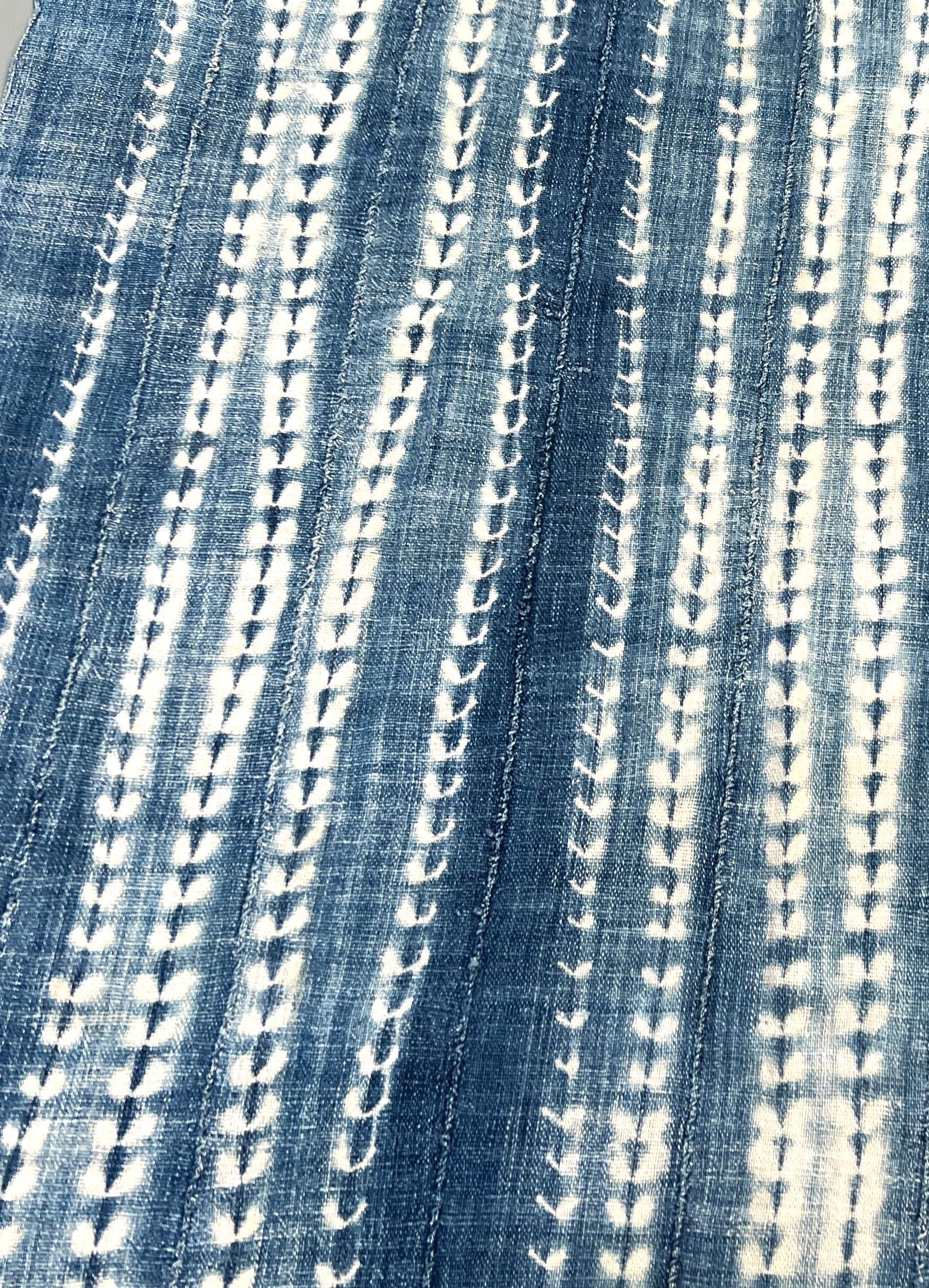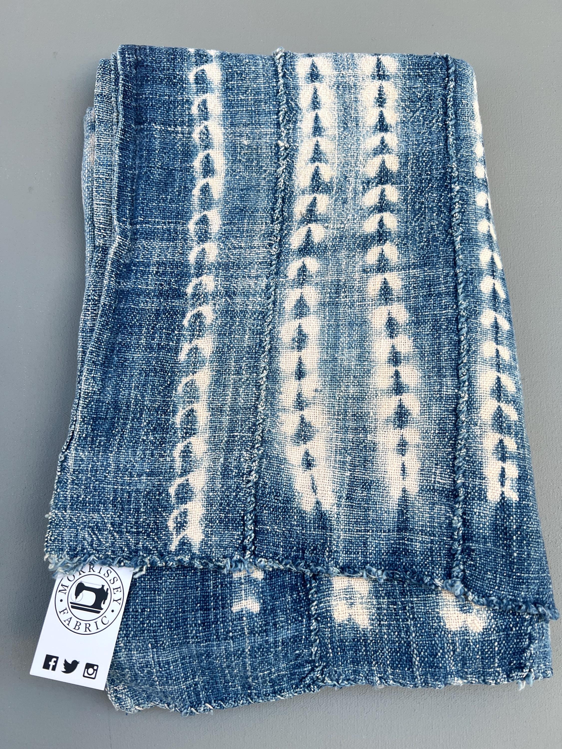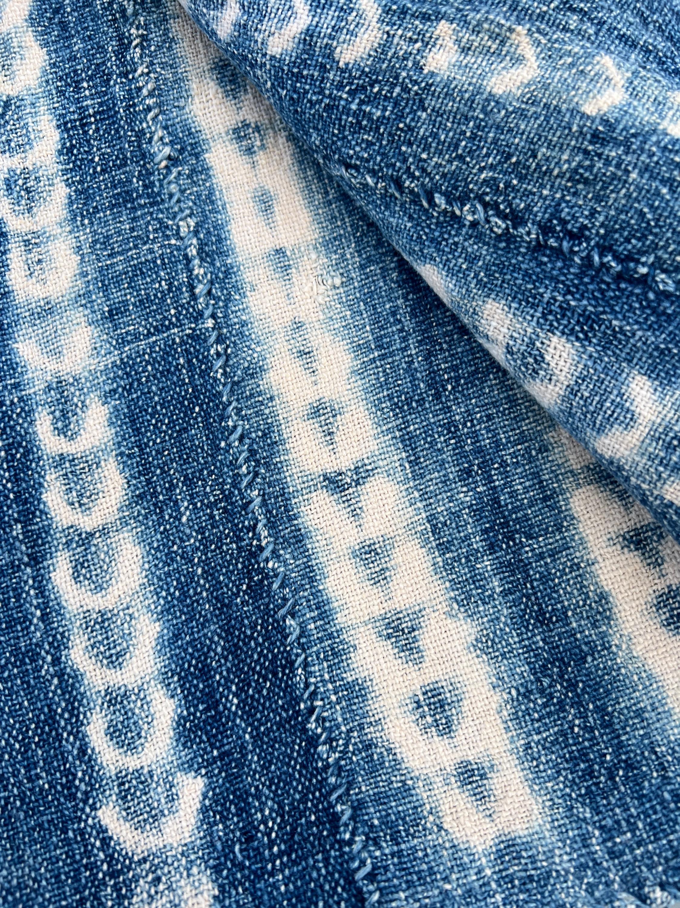 Hand made Indigo mud cloth throw in a hard to find textured weave. Lovely authentic fading. High quality African textile that’s hand sewn/hand dyed into a collectible piece. Pure cotton dyed to indigo blue and white with classic shibori designs. This is not one of the common lighter weight textiles seen in the market.