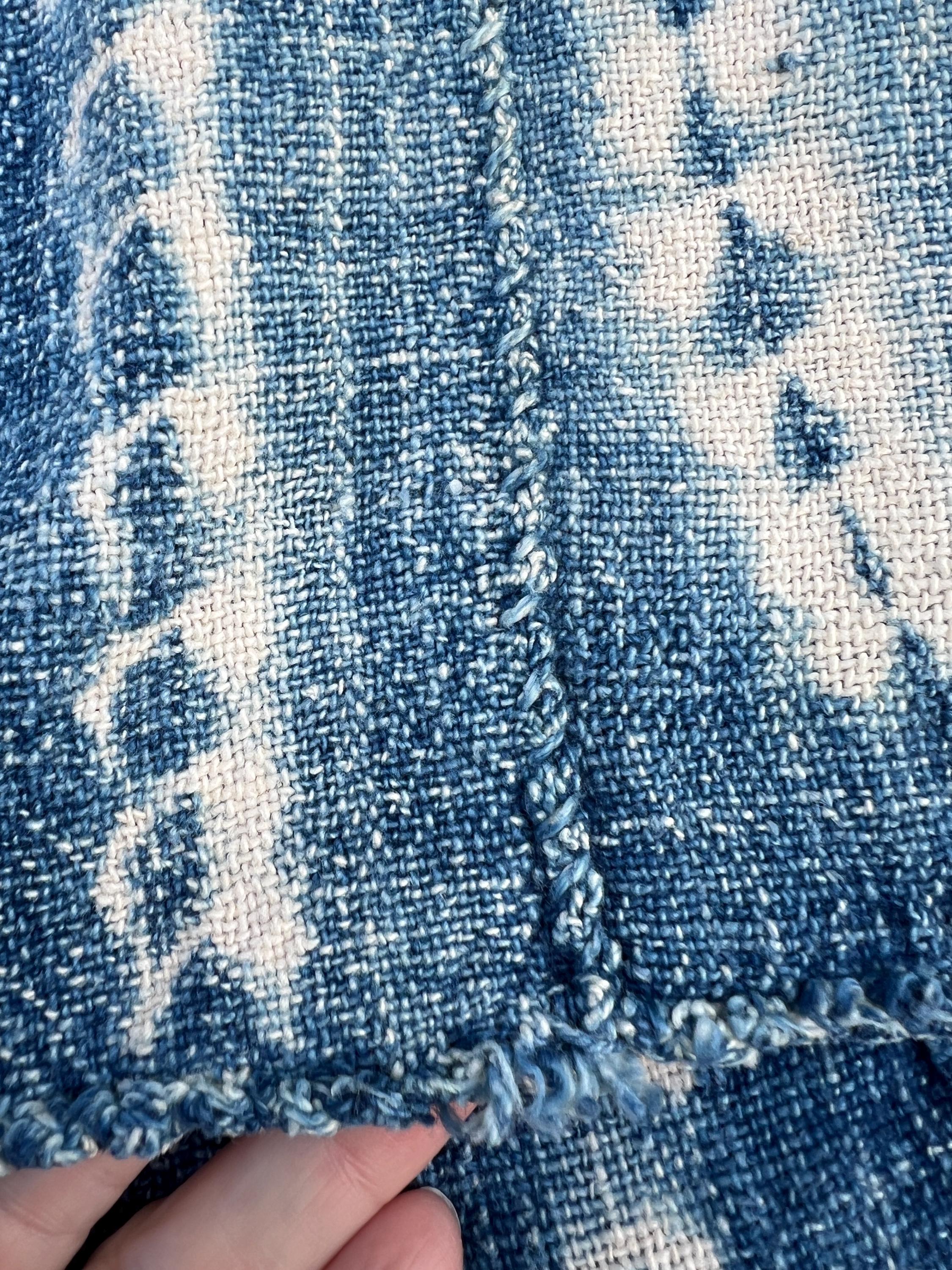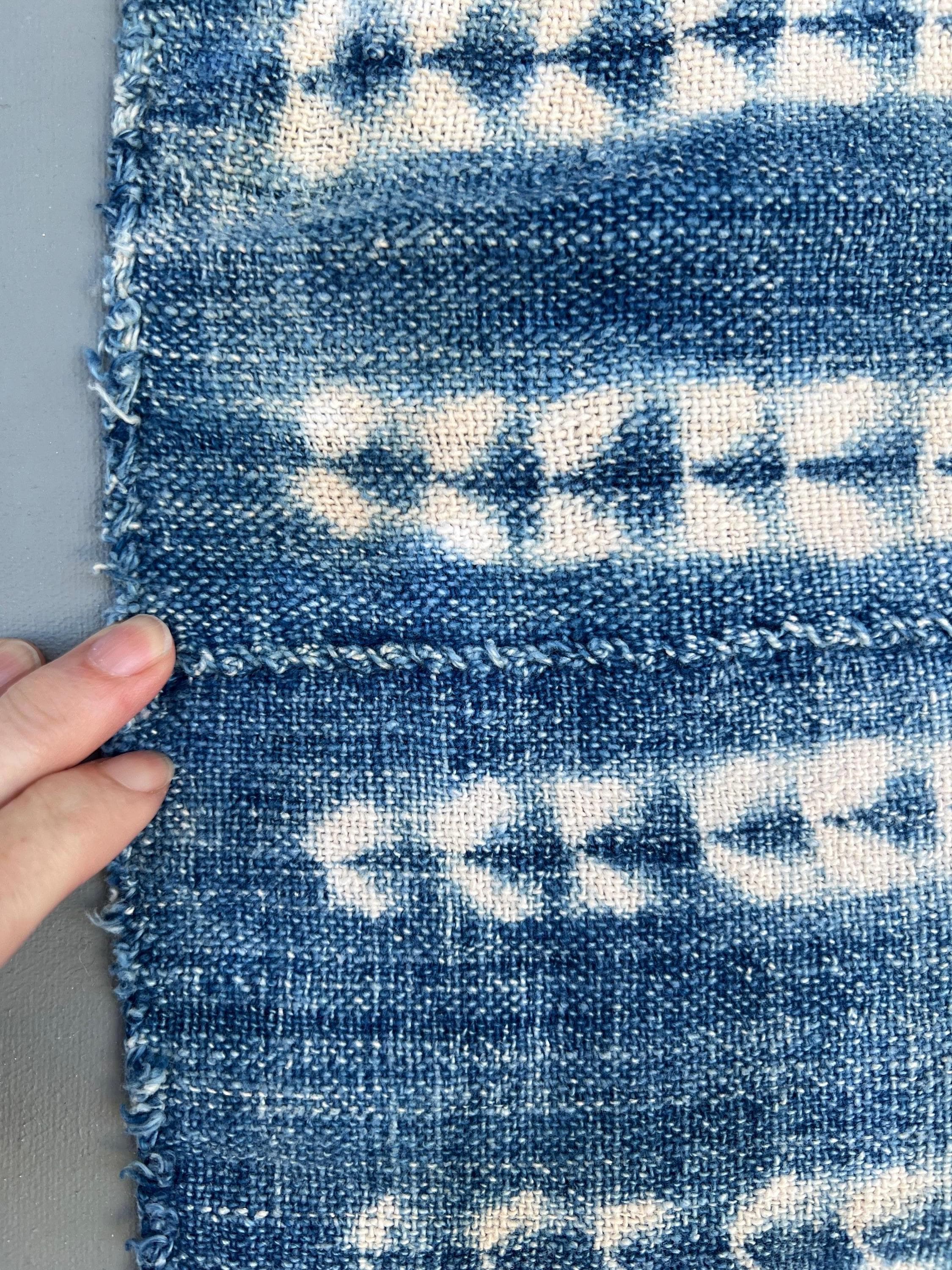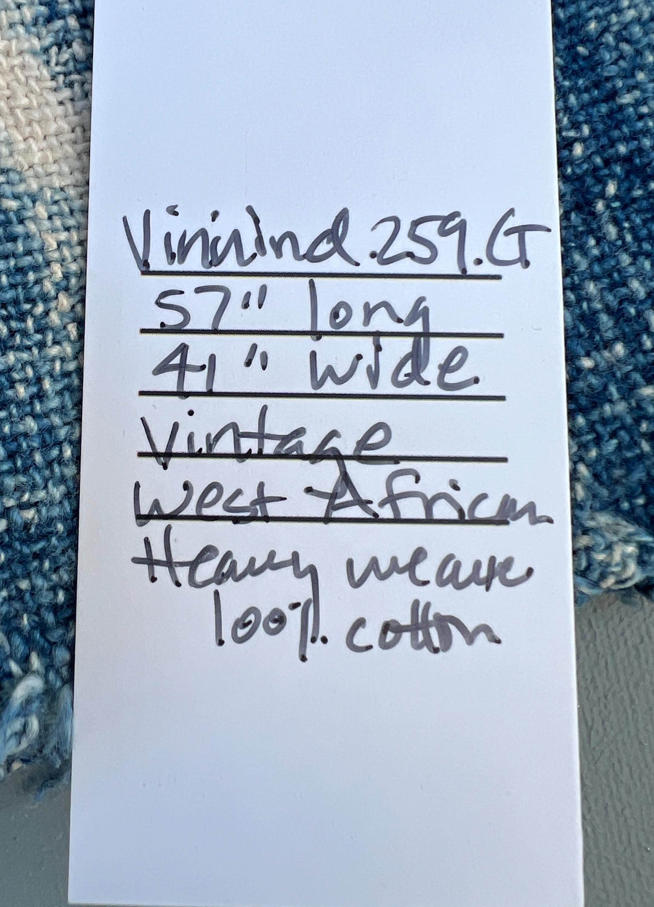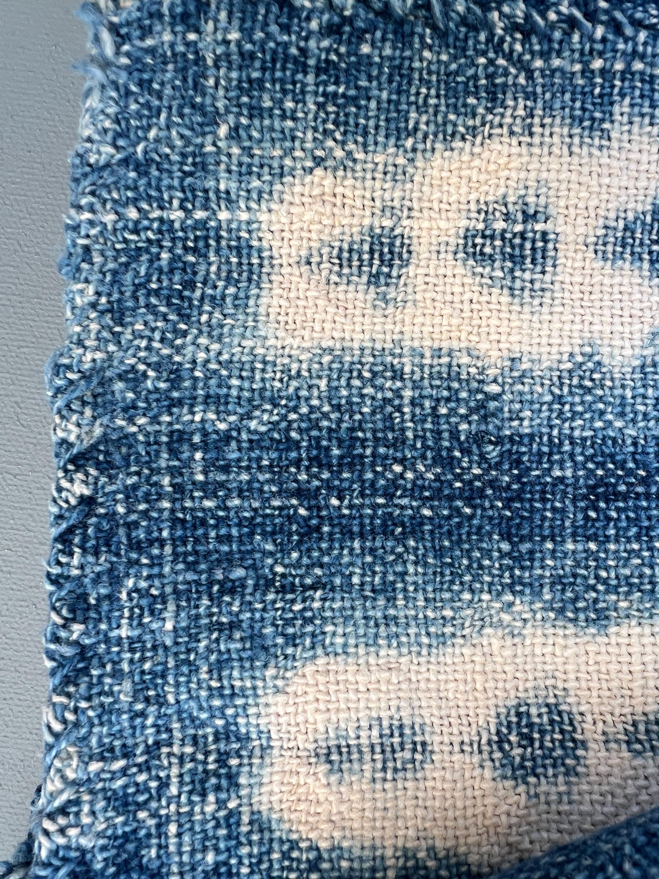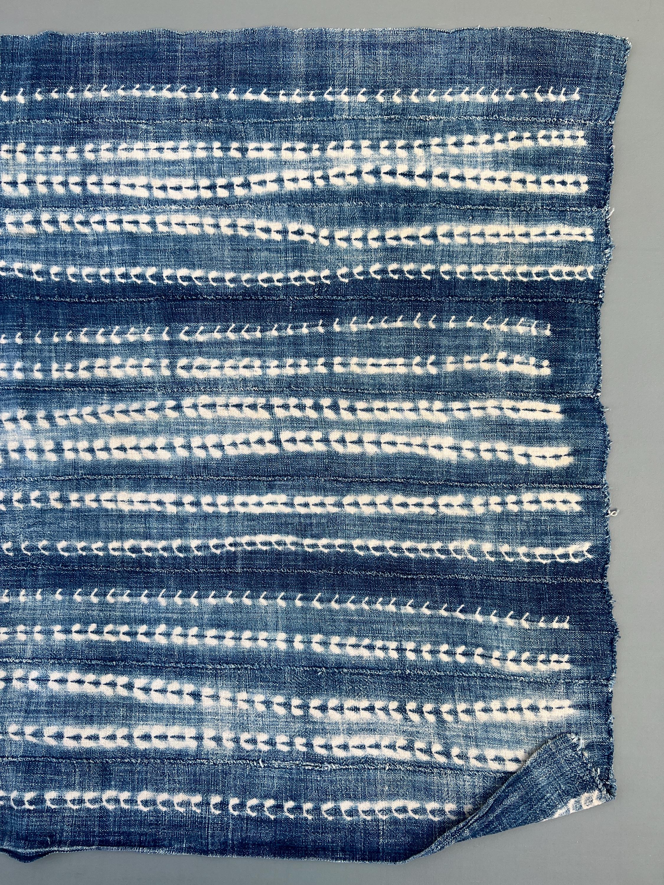 Hand made Indigo mud cloth throw in a hard to find textured weave. Lovely authentic fading. High quality African textile that’s hand sewn/hand dyed into a collectible piece. Pure cotton dyed to indigo blue and white with classic shibori designs. This is not one of the common lighter weight textiles seen in the market.