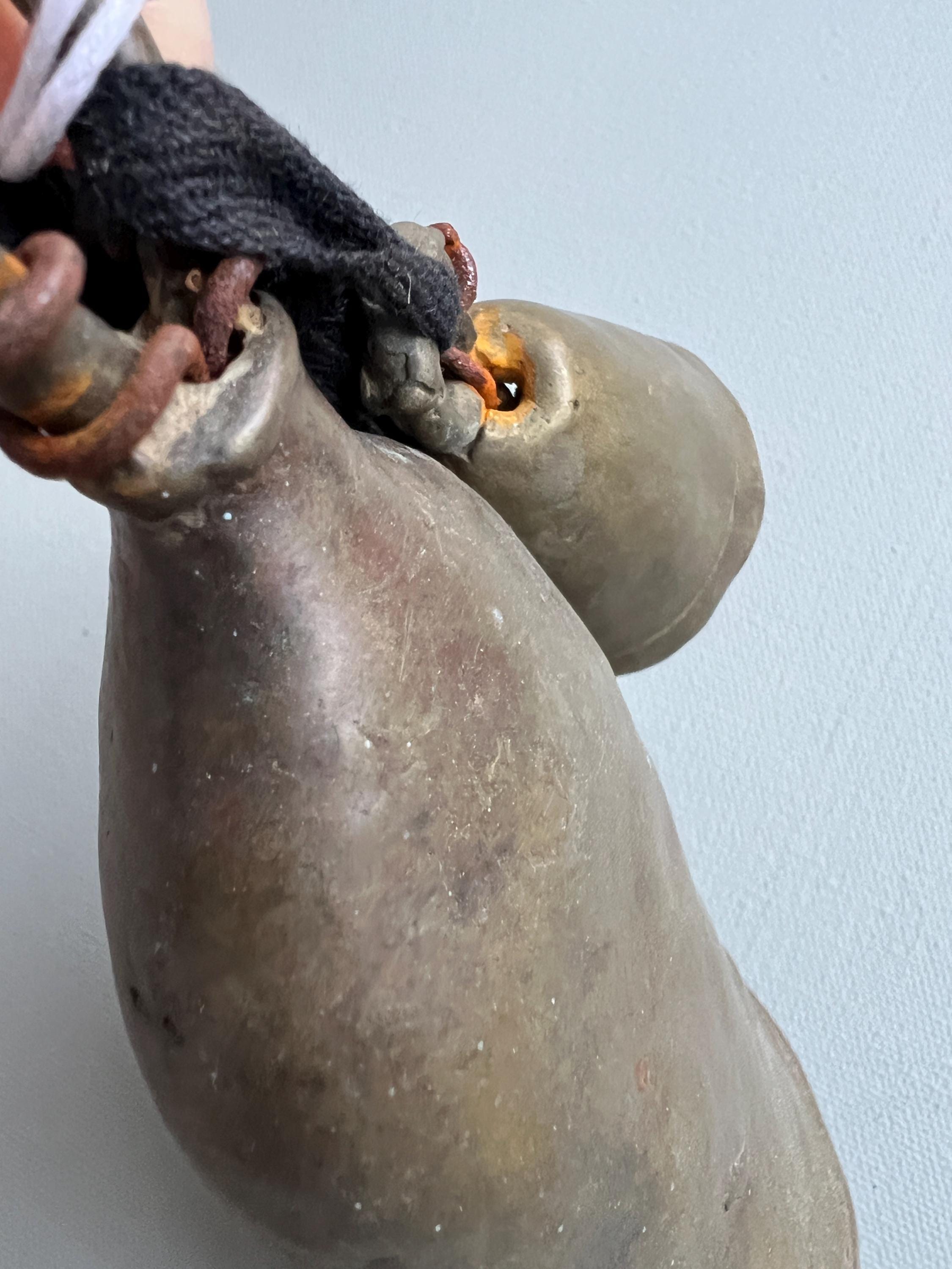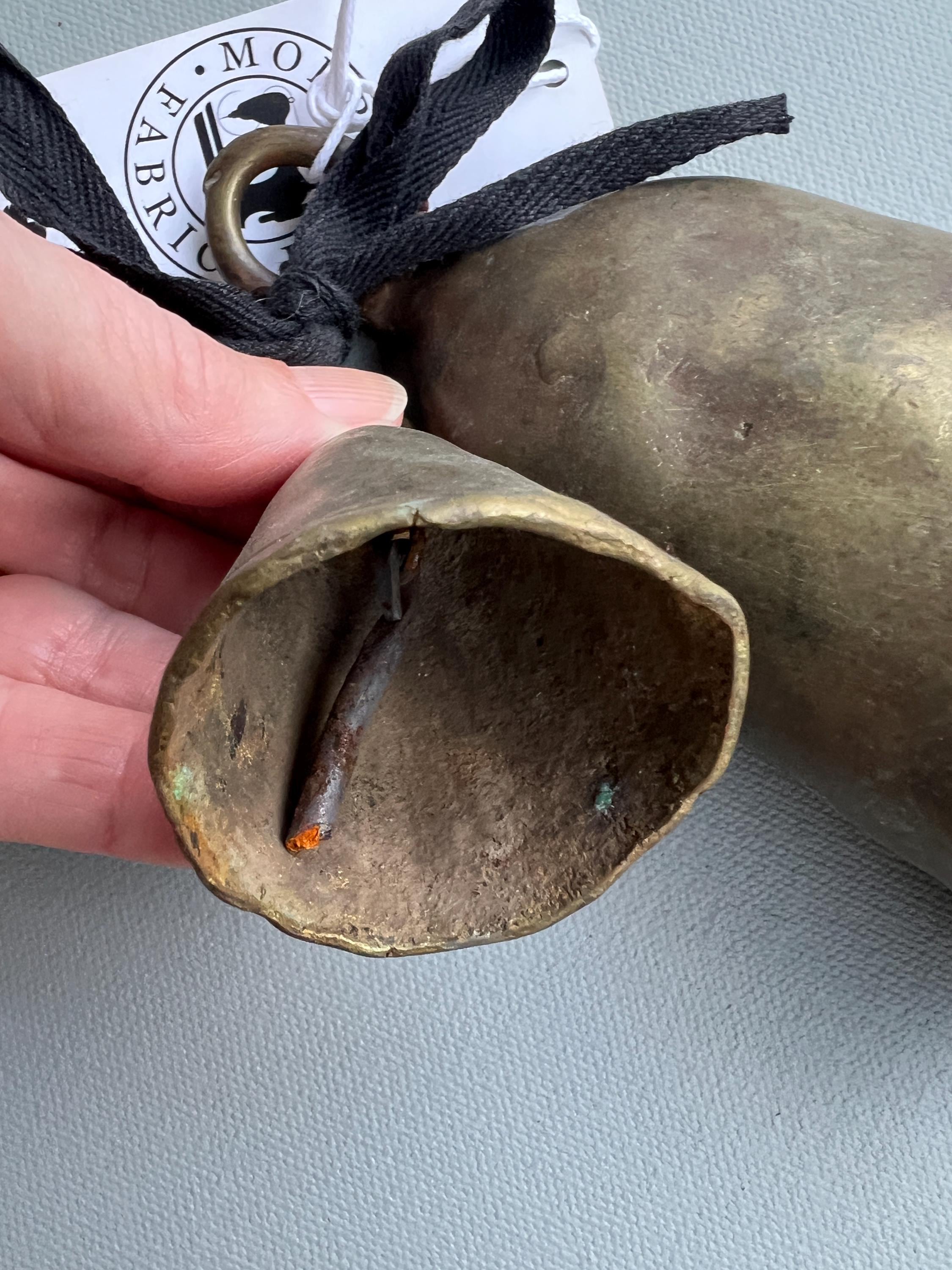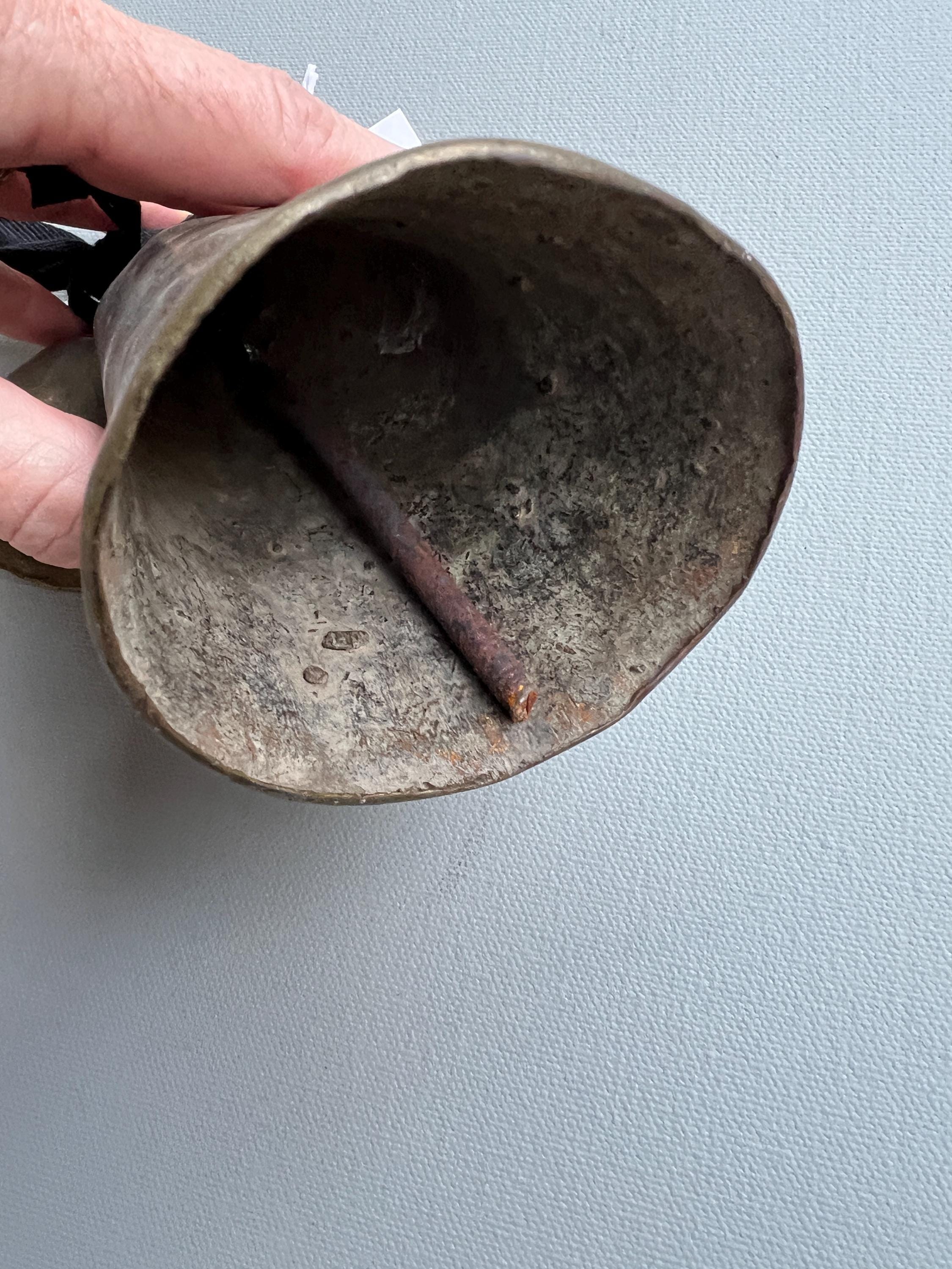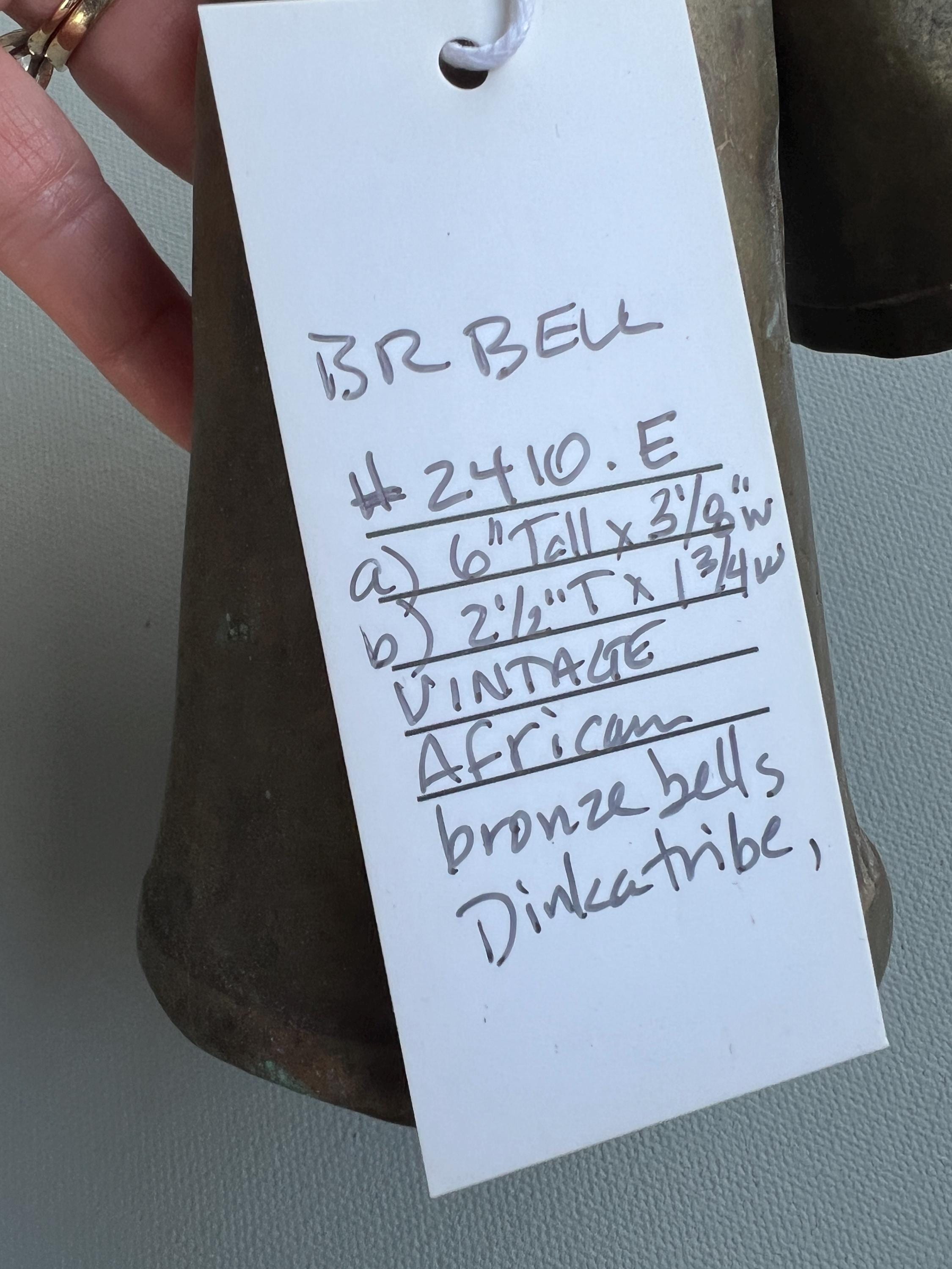 Vintage bronze African bells. Set of 2 rustic bells hand made in solid bronze originating from Southern Sudan. Each has lovely antique patina. Dents, cracks, and irregular shapes and rust add personality. These bells function and have a classic bell tone.