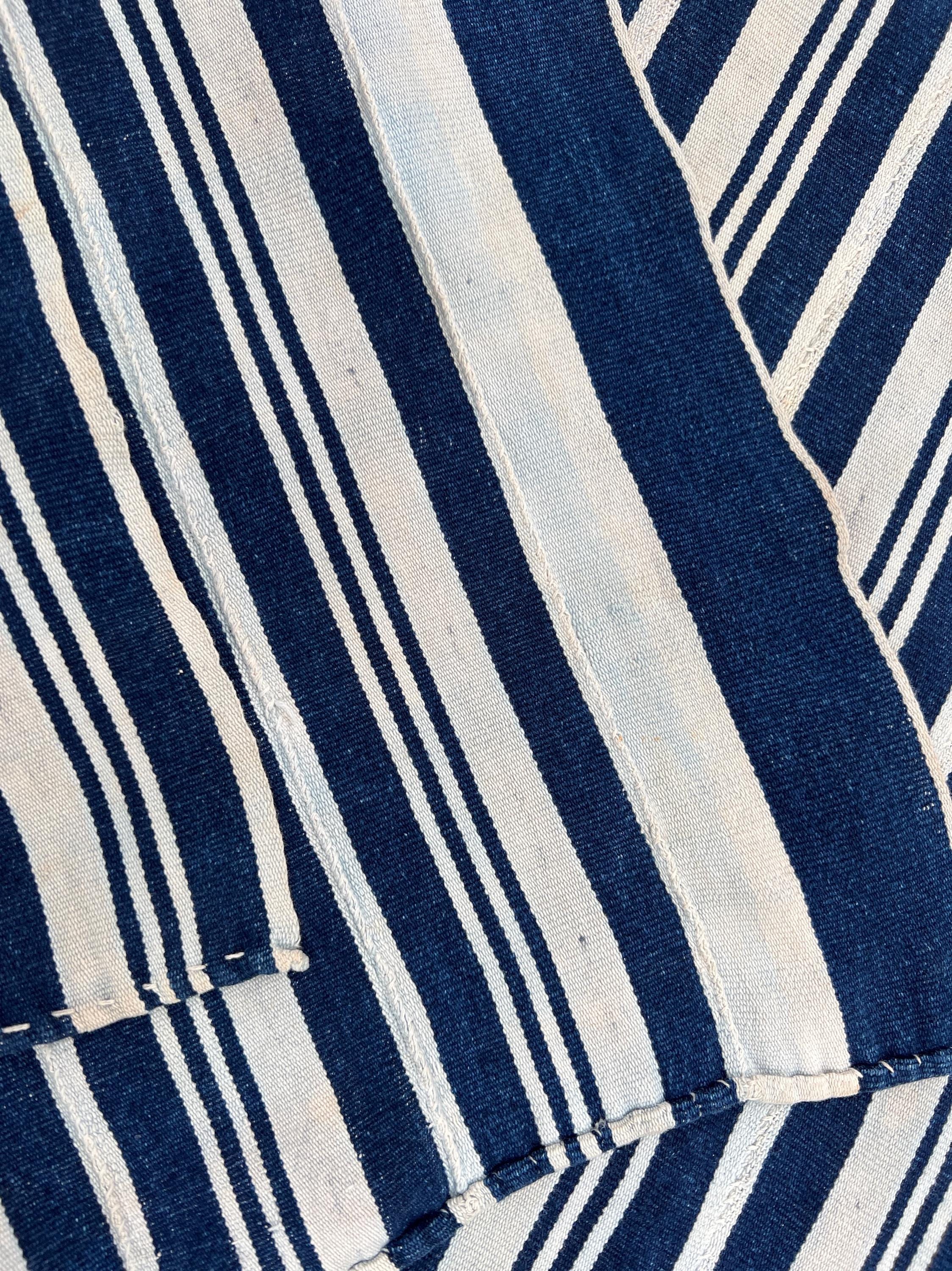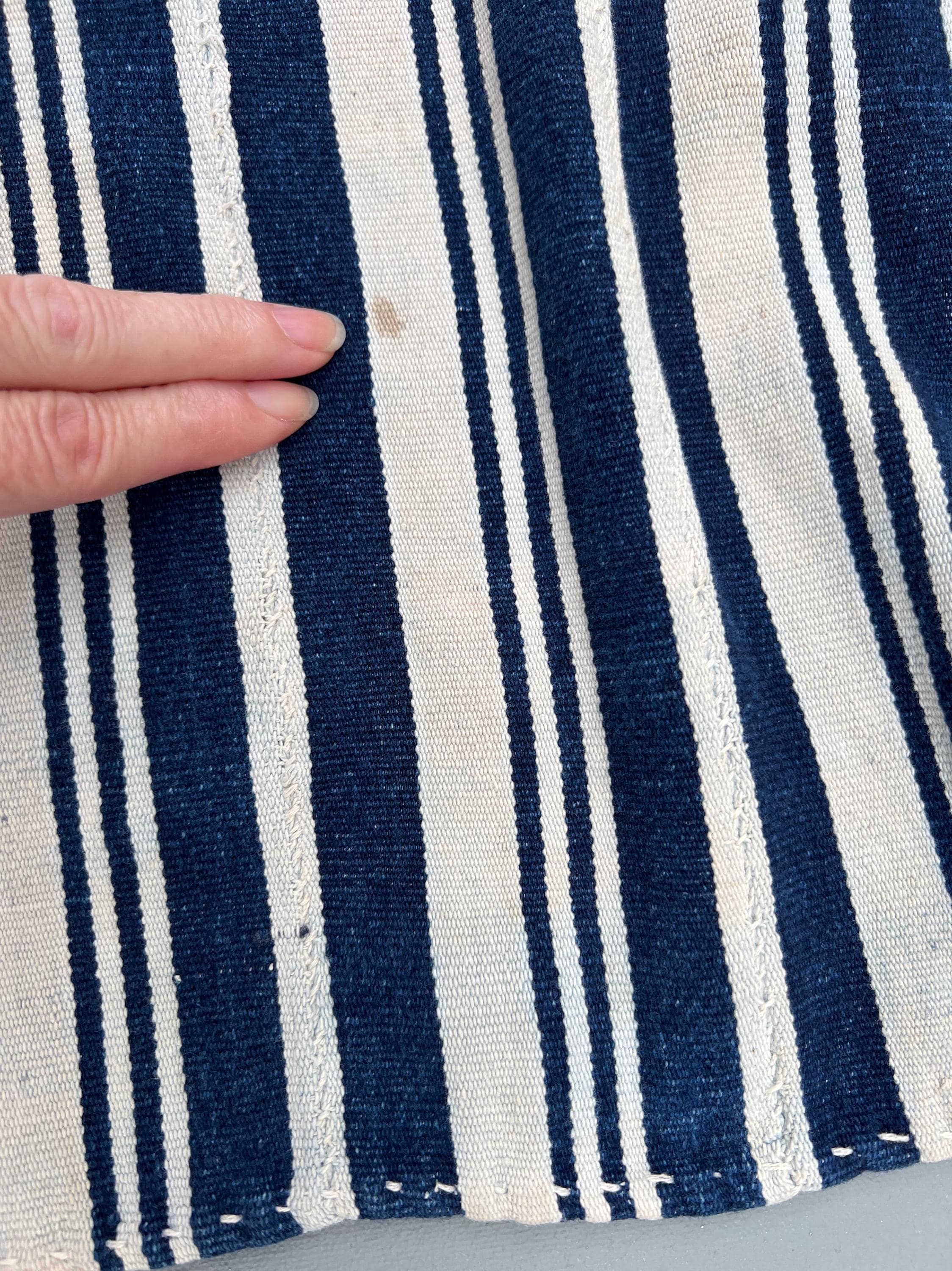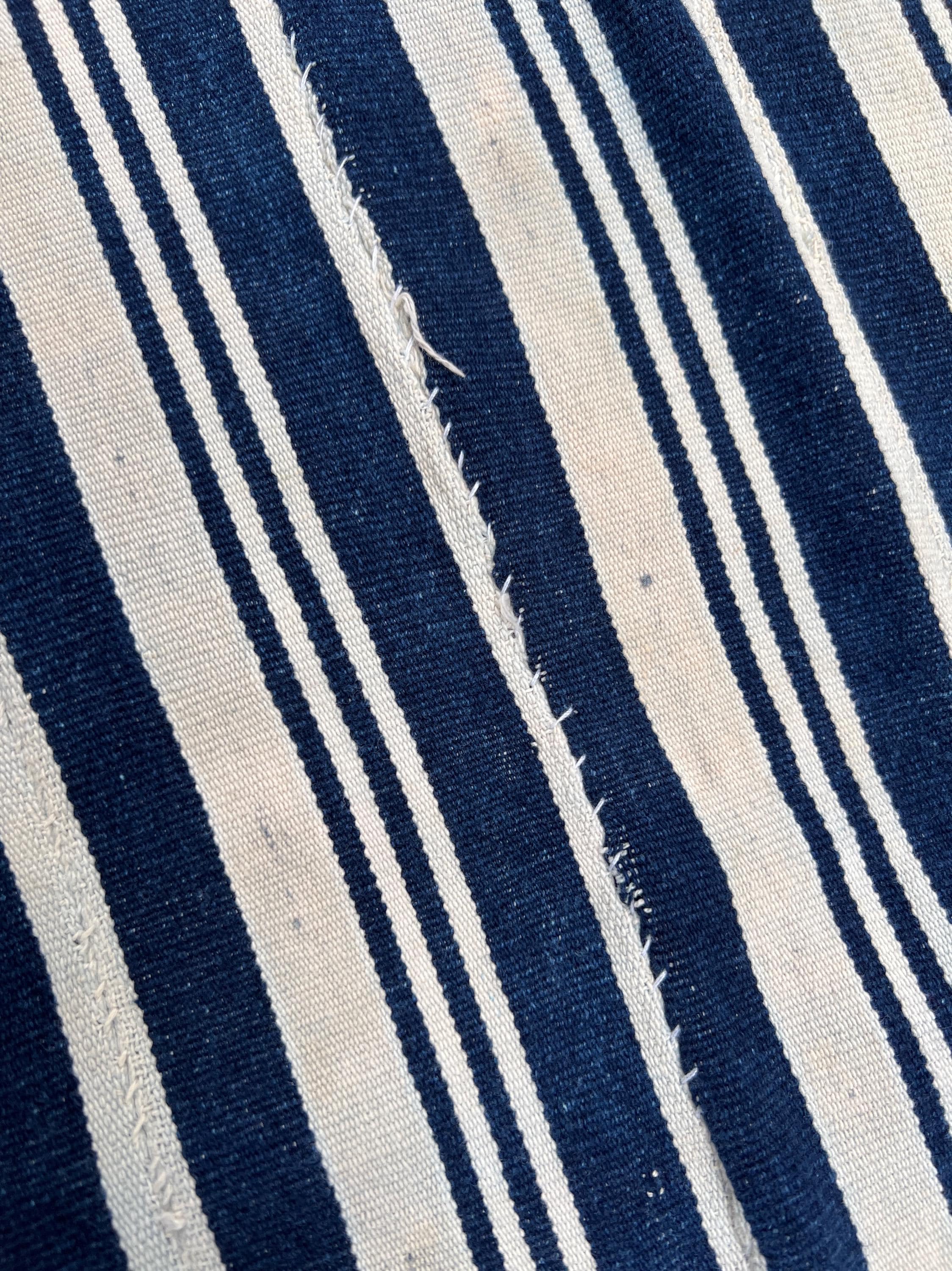 The stripes are not white but ivory with dark indigo blue and one strip has bold blue and ivory stripes. There are several hand mended seams and a loosely stitched hem at both length ends.