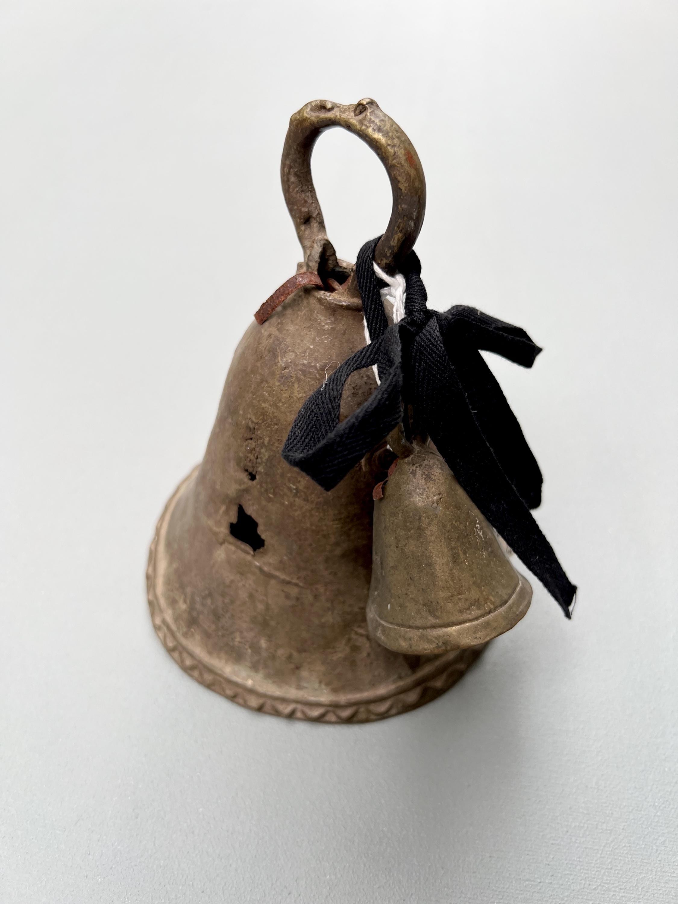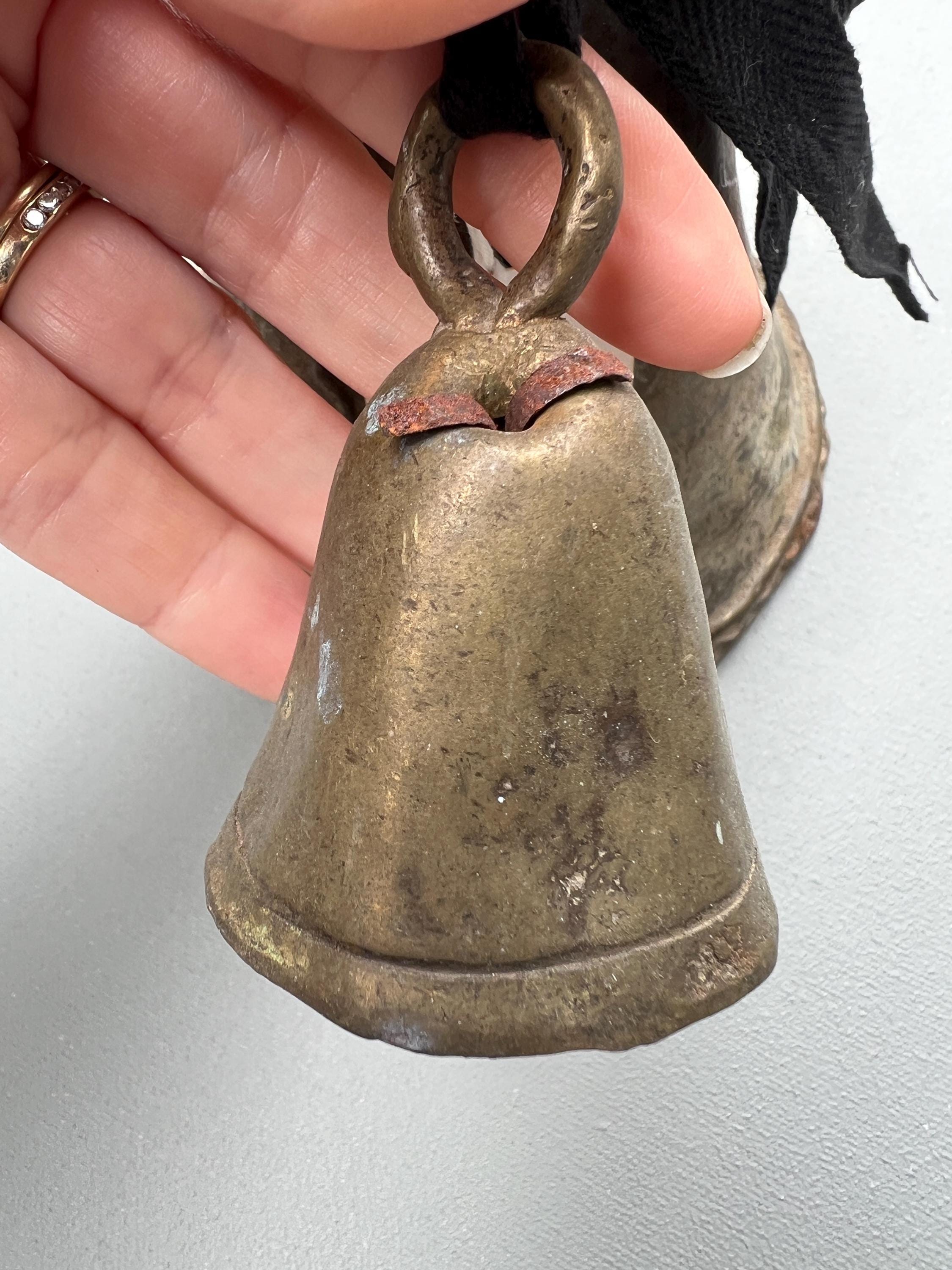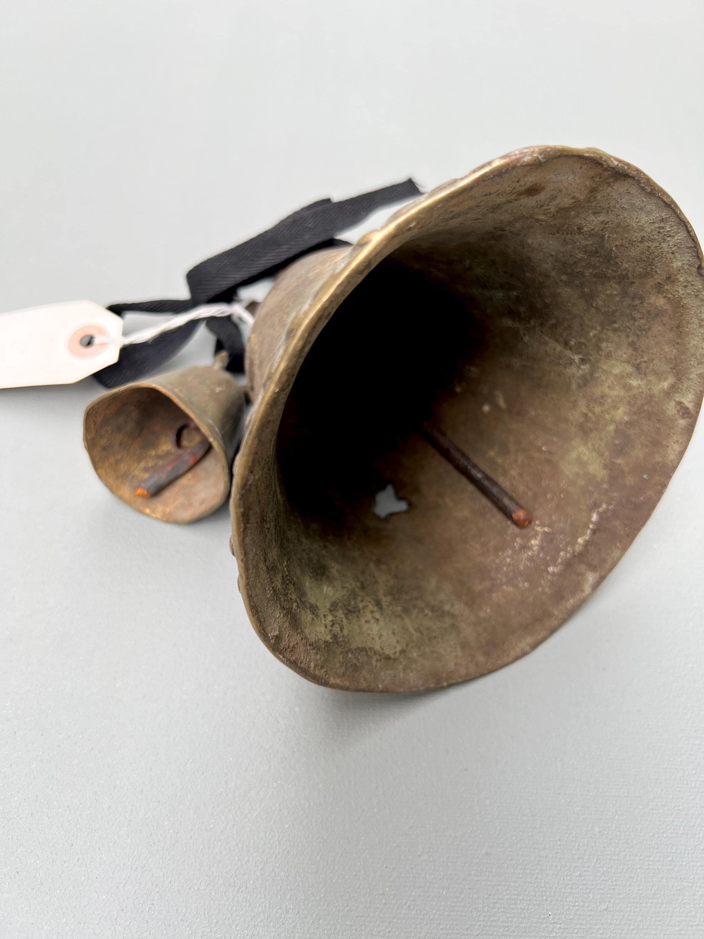 Bells- large and a small bronze bells make a handsome set. Primitive, hand made, and solid bronze this listing is for the set of two in the photos.