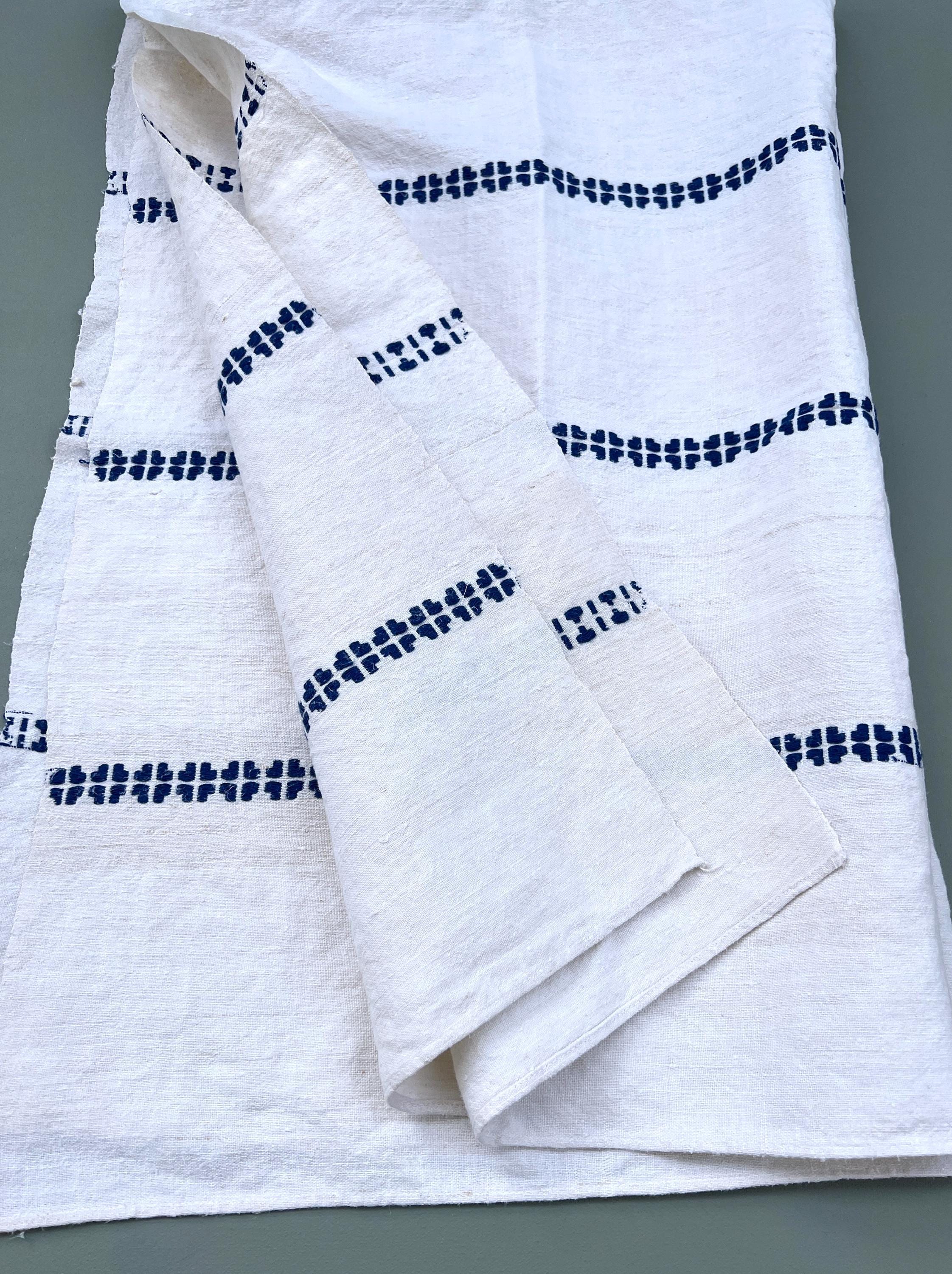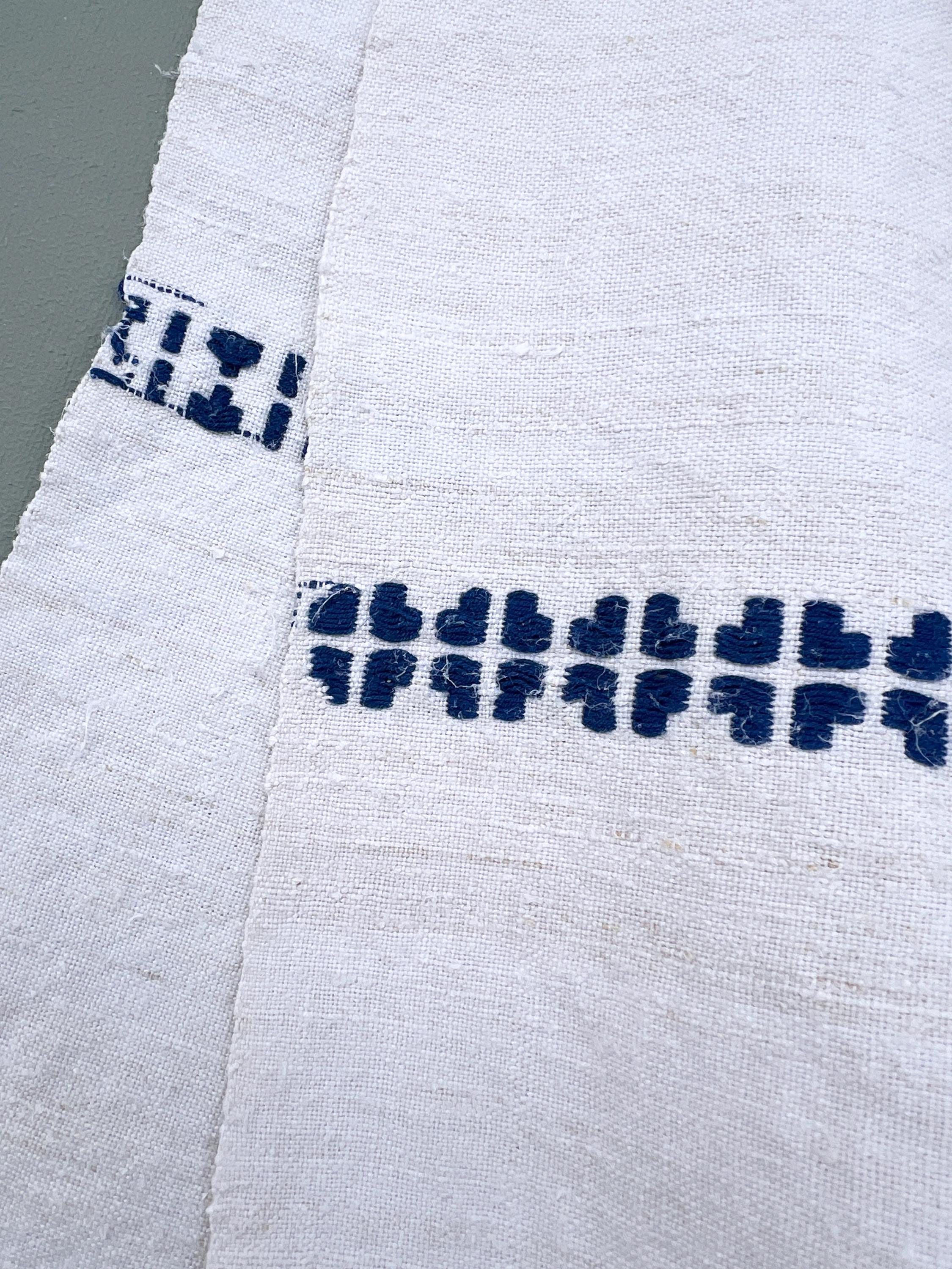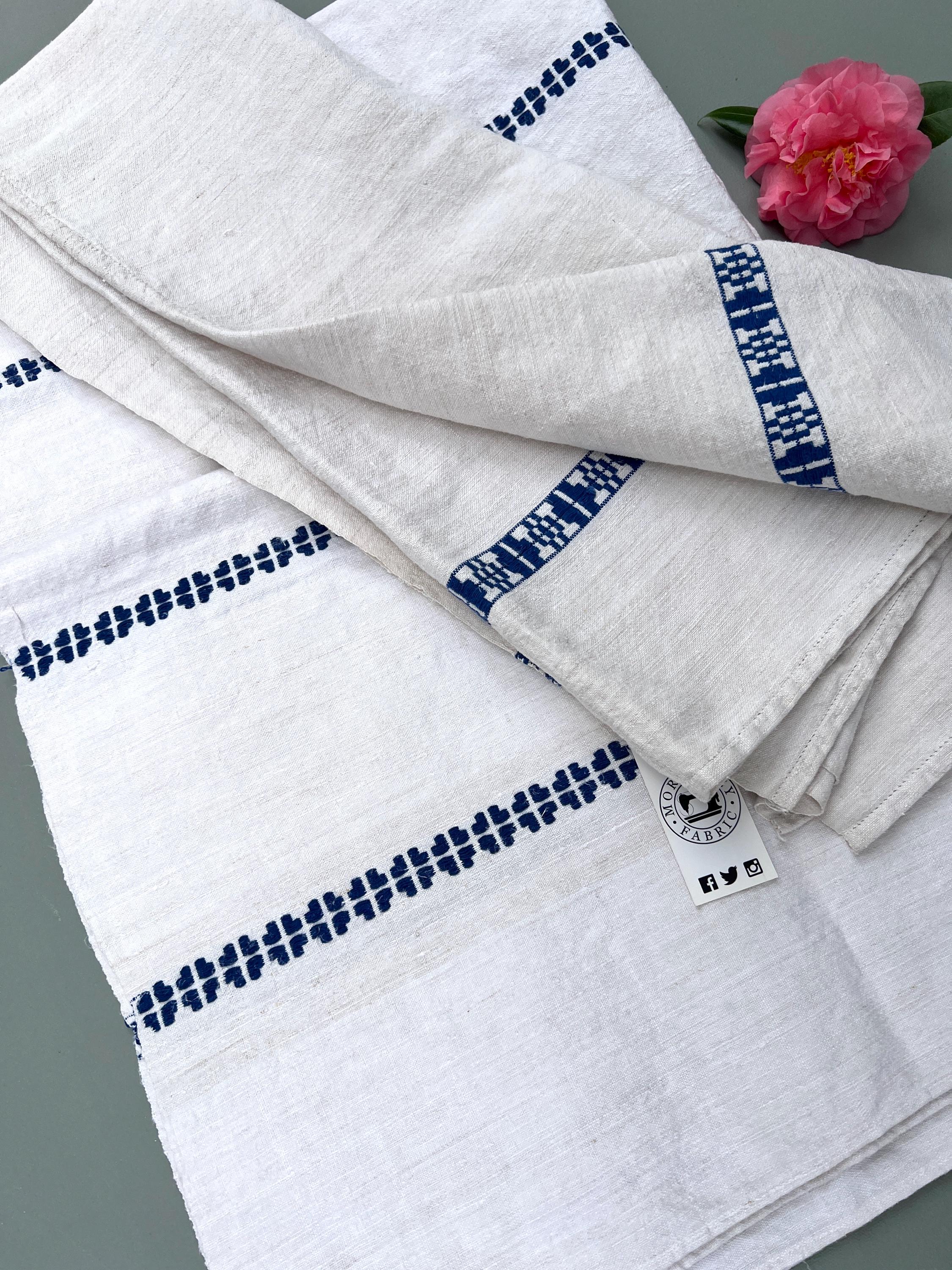 These textiles are, by nature, extremely Eco-friendly. The estimated age of this textile is 50 to 75 years old. This type of cloth was naturally home grown, home retted (in local lakes and ponds) and woven with minimal tools. These textiles are being re-cycled today showcasing the lovely craftsmanship of past generations. Another feature that makes these textiles eco-friendly is their durability. These textiles were designed to endure generations of constant use and will have an extremely long life. The timeless beauty of this linen makes these textiles the perfect choice for any home. An environmentally friendly choice.