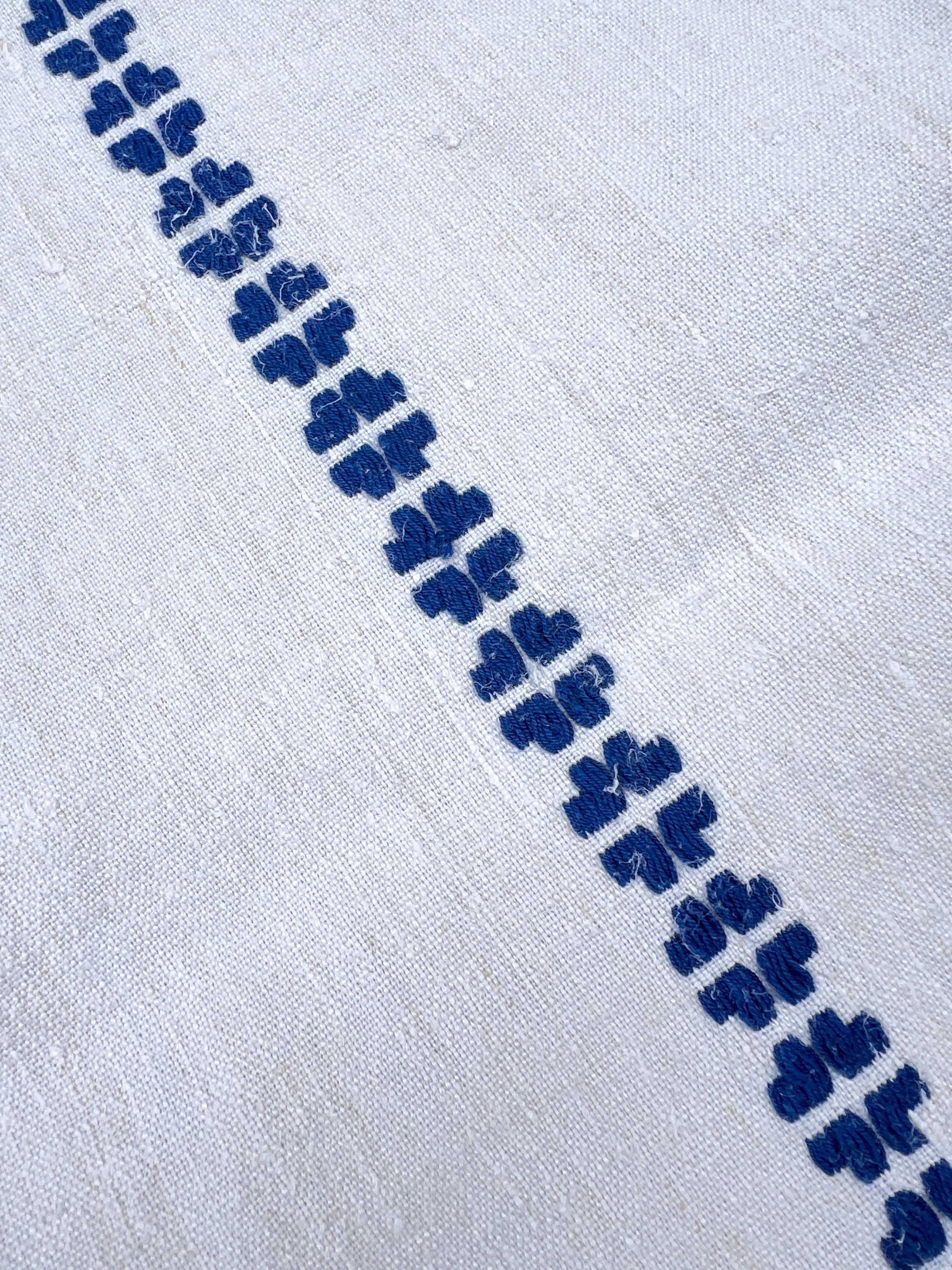 Vintage linen fabric, embroidered table cloth. European textile. This is a nicely textured laundered linen in a cool white/beige with blue embroidery designs. Two narrower pieces of fabric are joined to make one larger cloth.