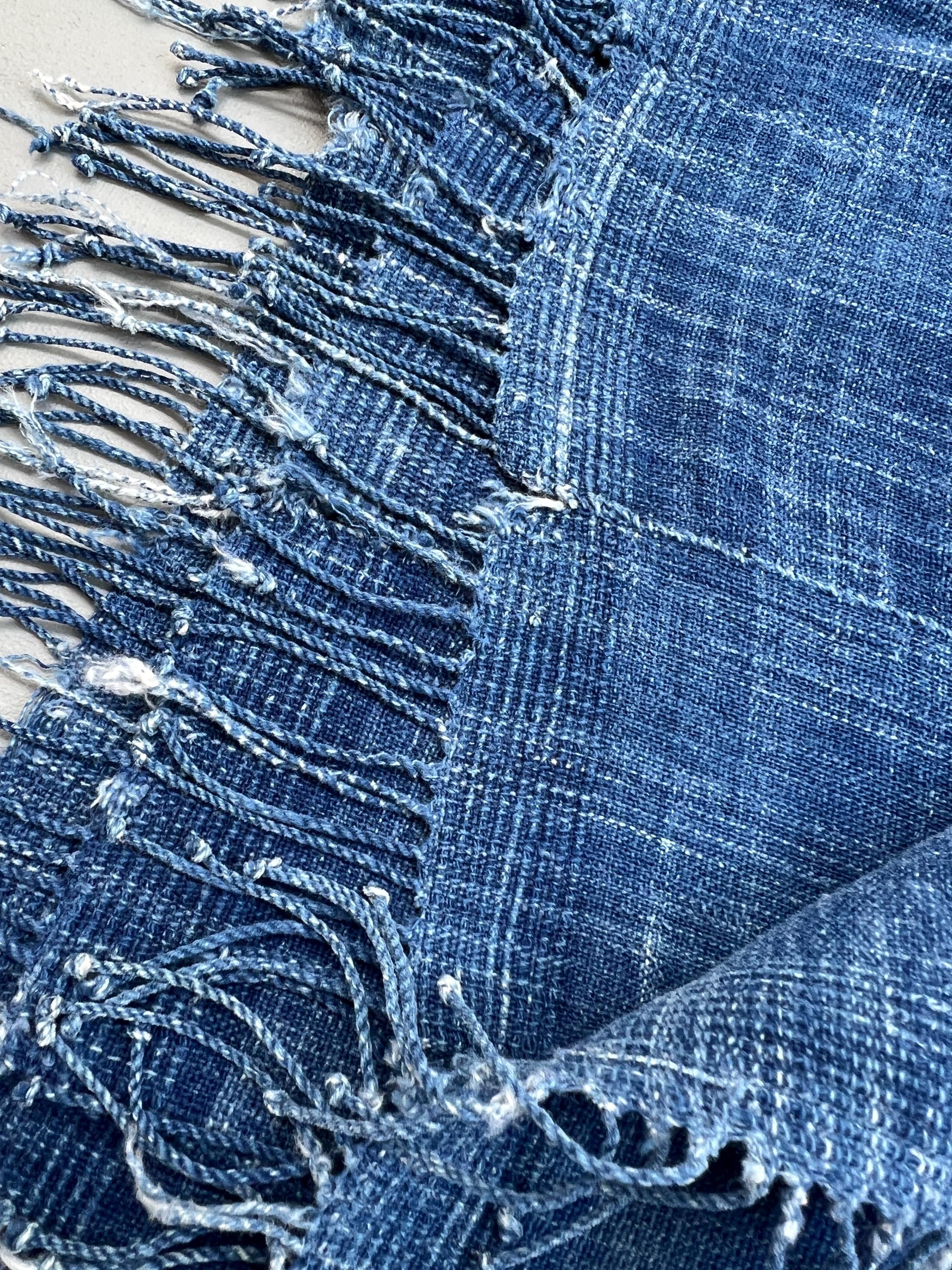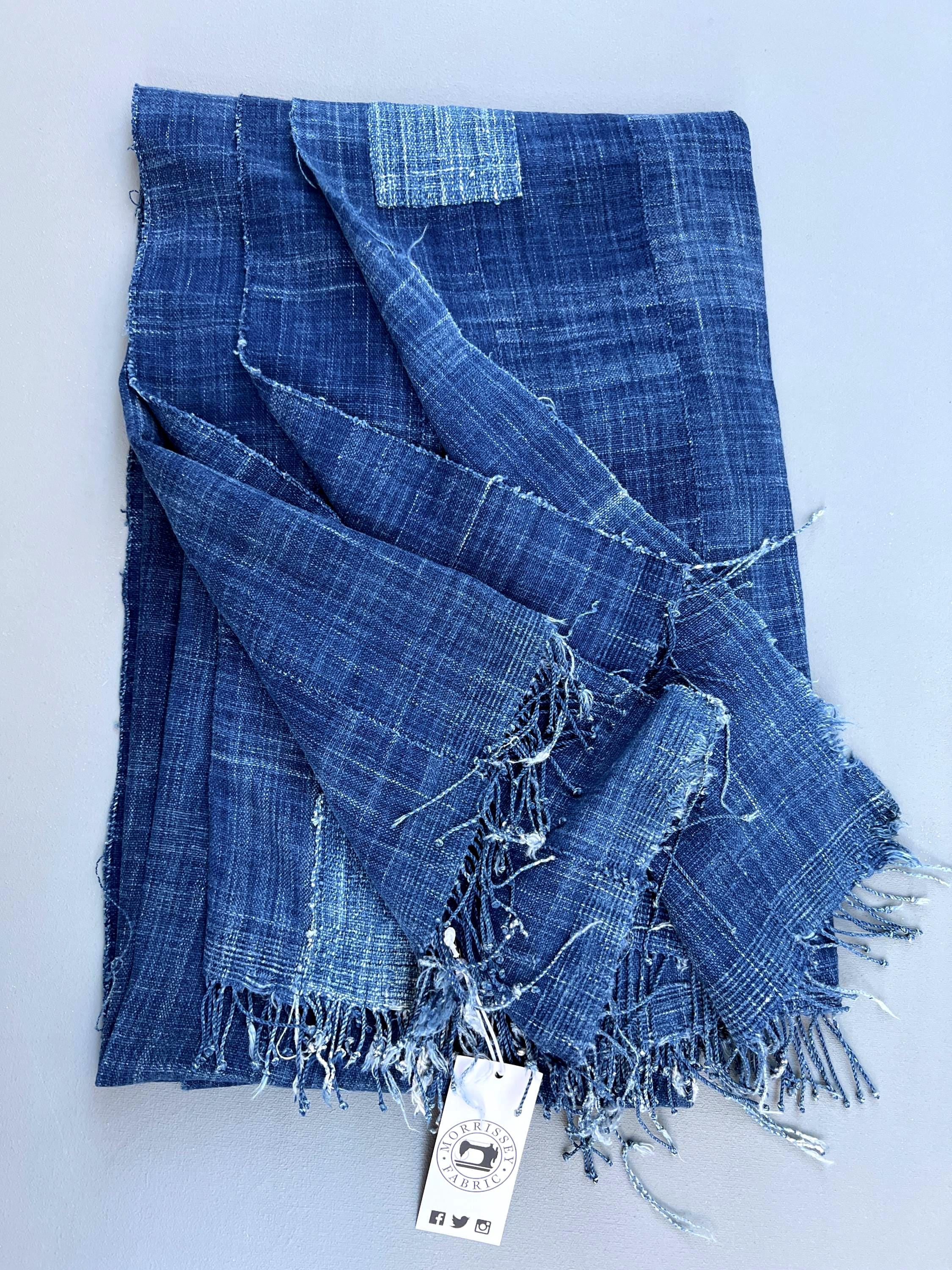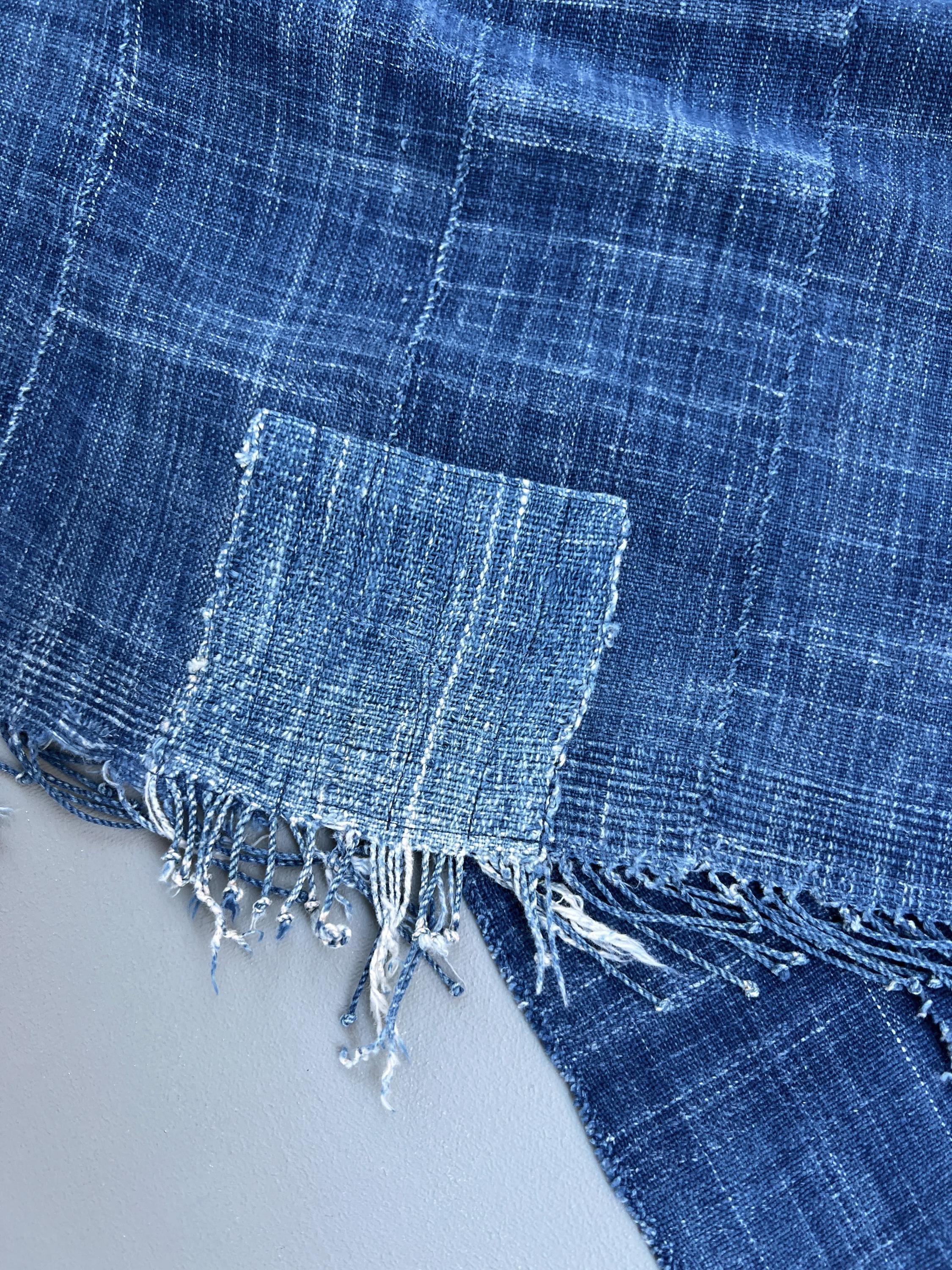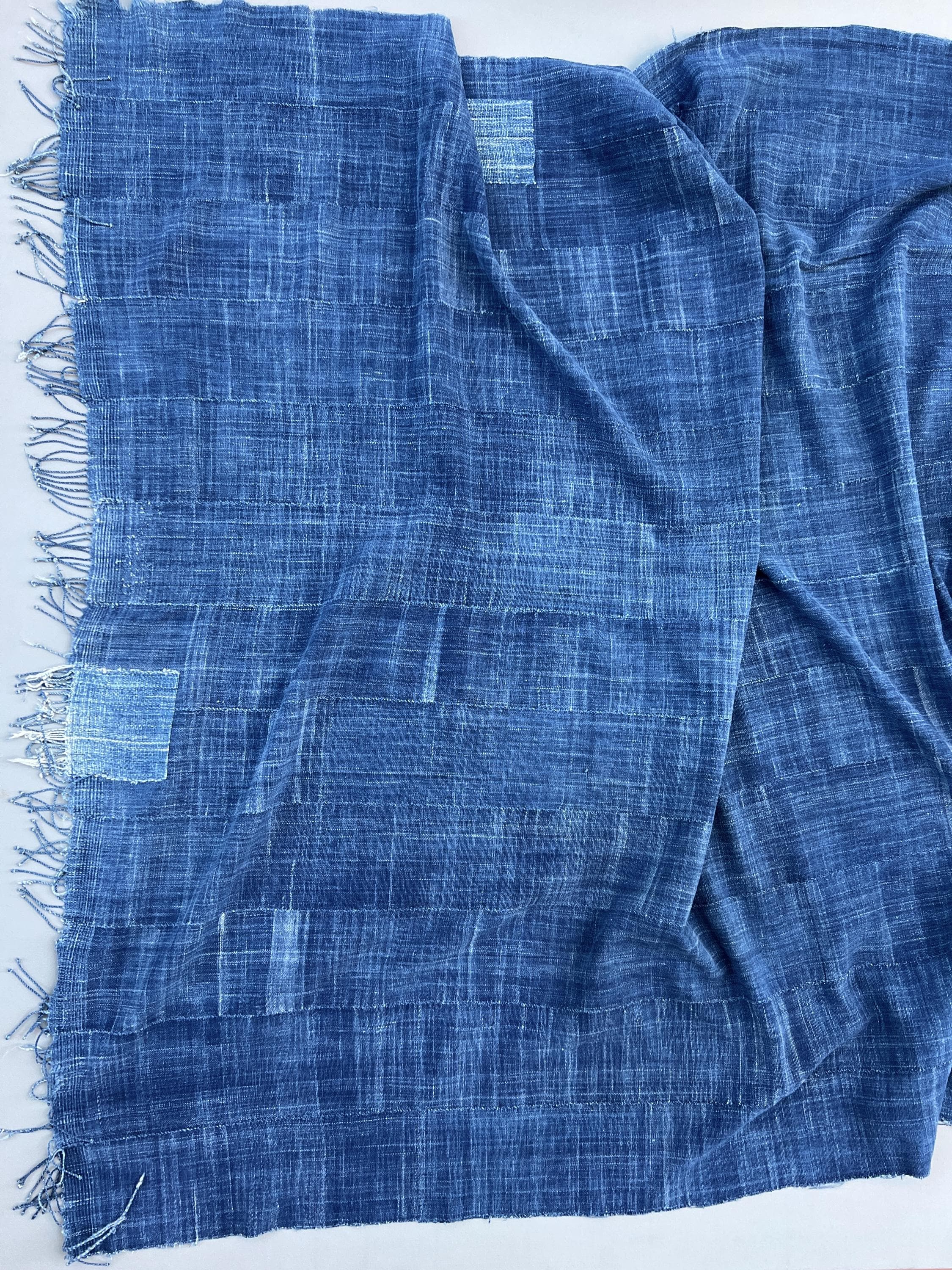 Large vintage indigo mud cloth with fringe and two repair patches. This unique textile is very clean but does have wear. Hand made textile from Burkina Faso. This throw (or wrap) is for someone who loves rustic blue jeans and doesn't mind some fraying, and enjoys the slightly worn look of a vintage find. This indigo has some light and dark areas of fading and wear. Truly a lovely piece for a coastal, farmhouse, or western vibe.