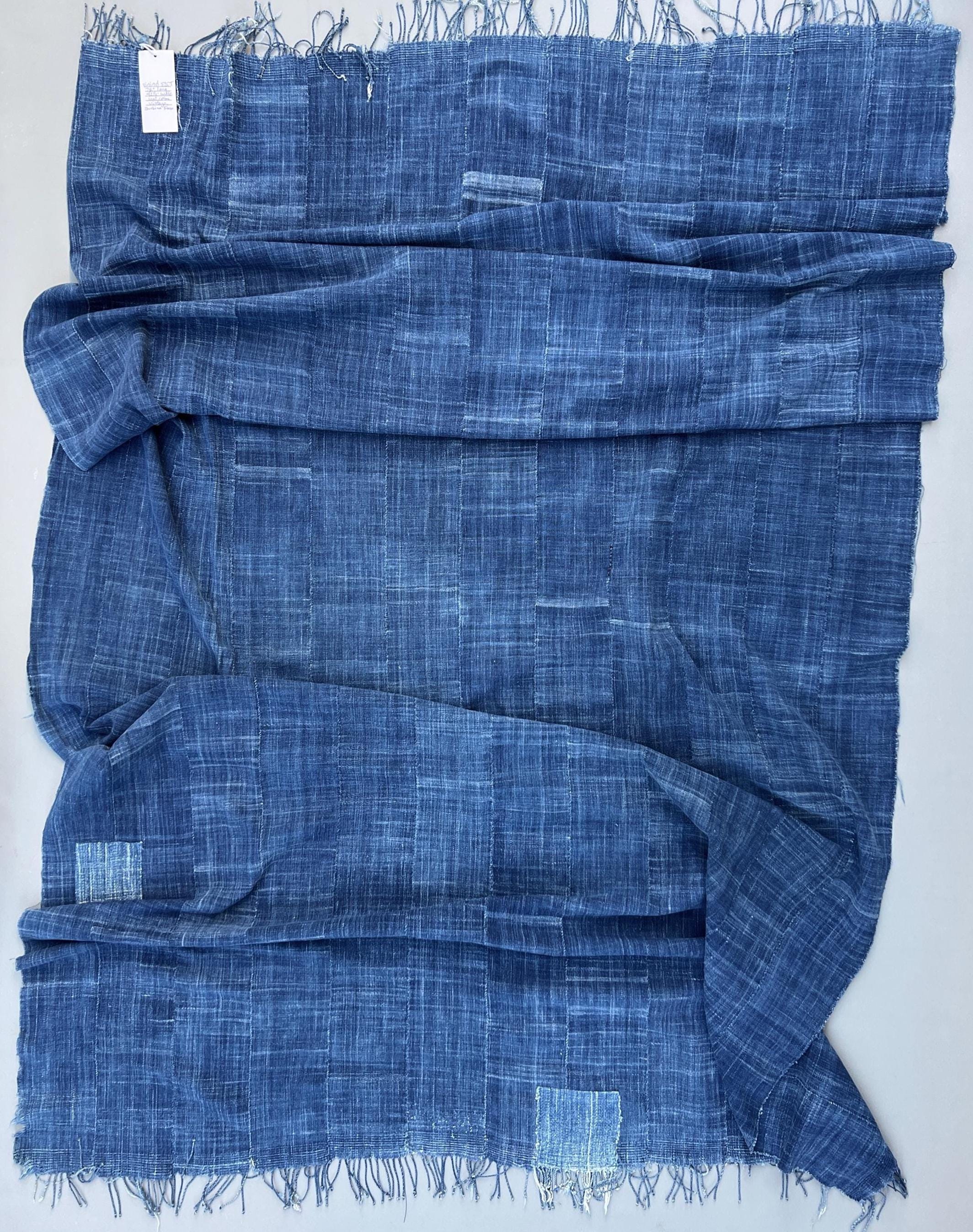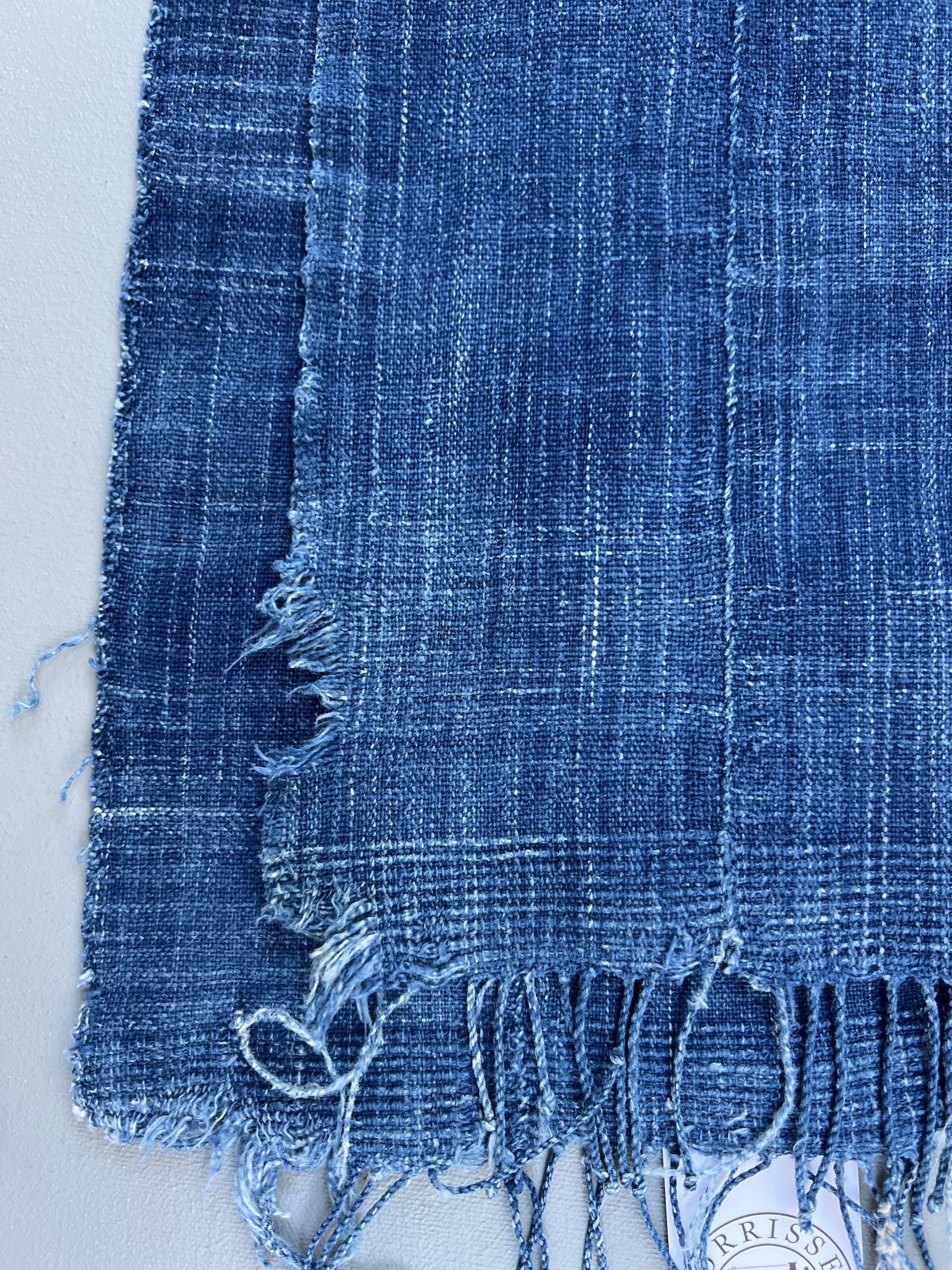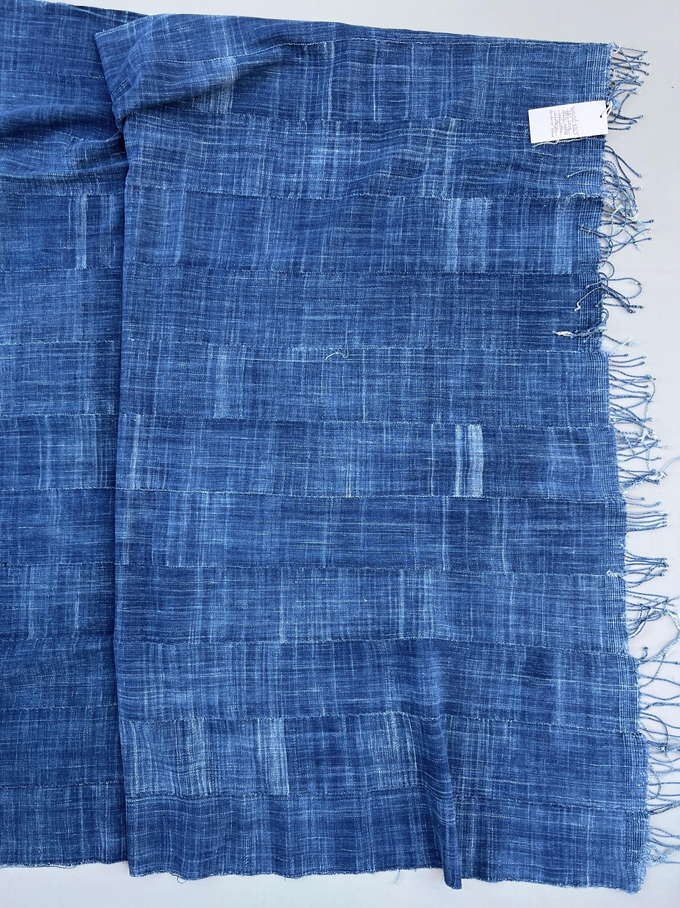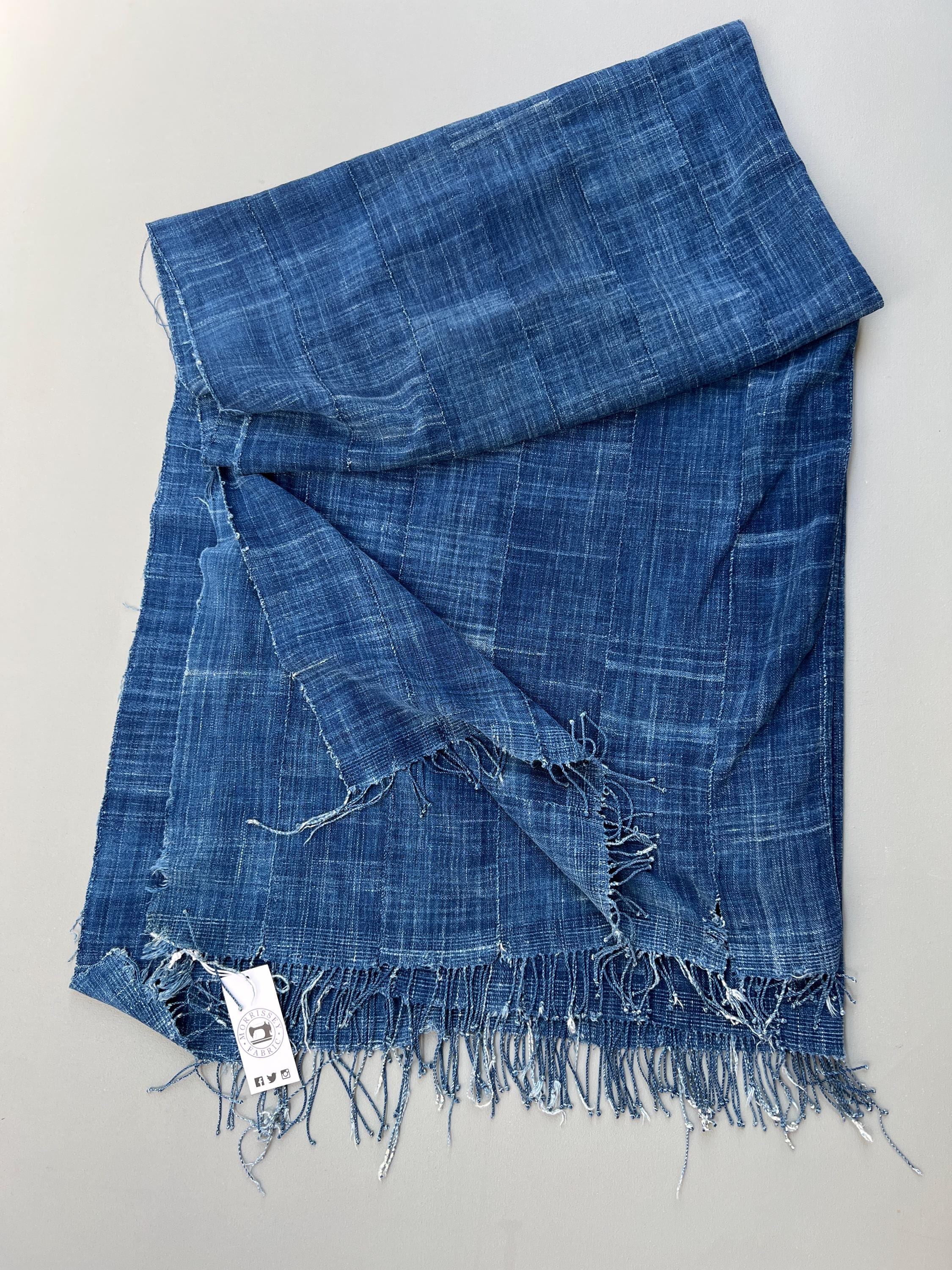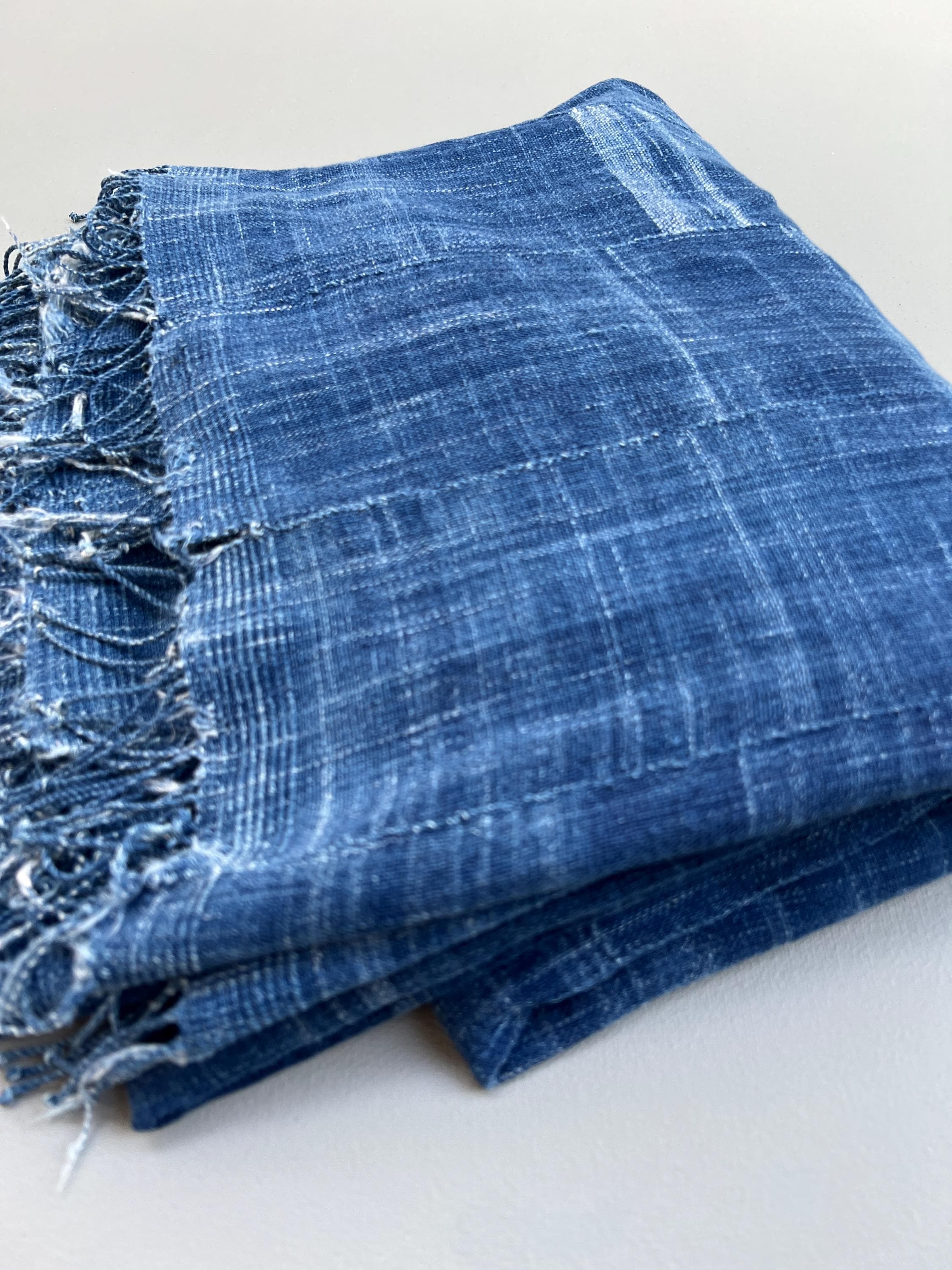 Large vintage indigo mud cloth with fringe and two repair patches. This unique textile is very clean but does have wear. Hand made textile from Burkina Faso. This throw (or wrap) is for someone who loves rustic blue jeans and doesn't mind some fraying, and enjoys the slightly worn look of a vintage find. This indigo has some light and dark areas of fading and wear. Truly a lovely piece for a coastal, farmhouse, or western vibe.