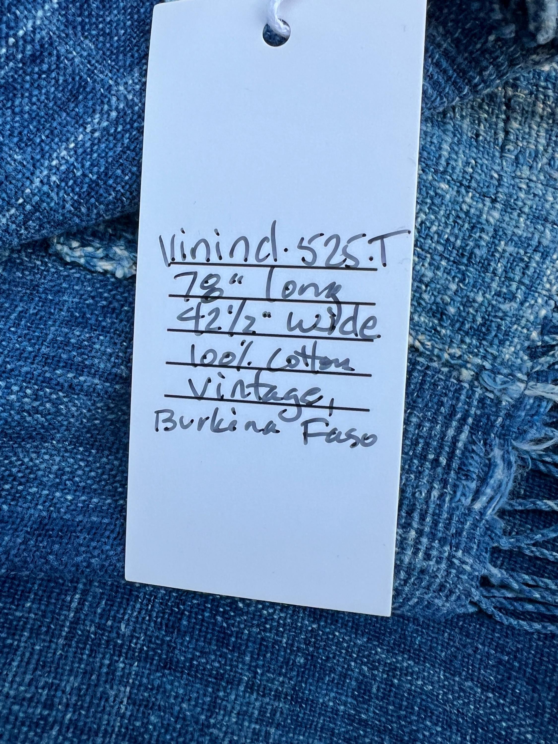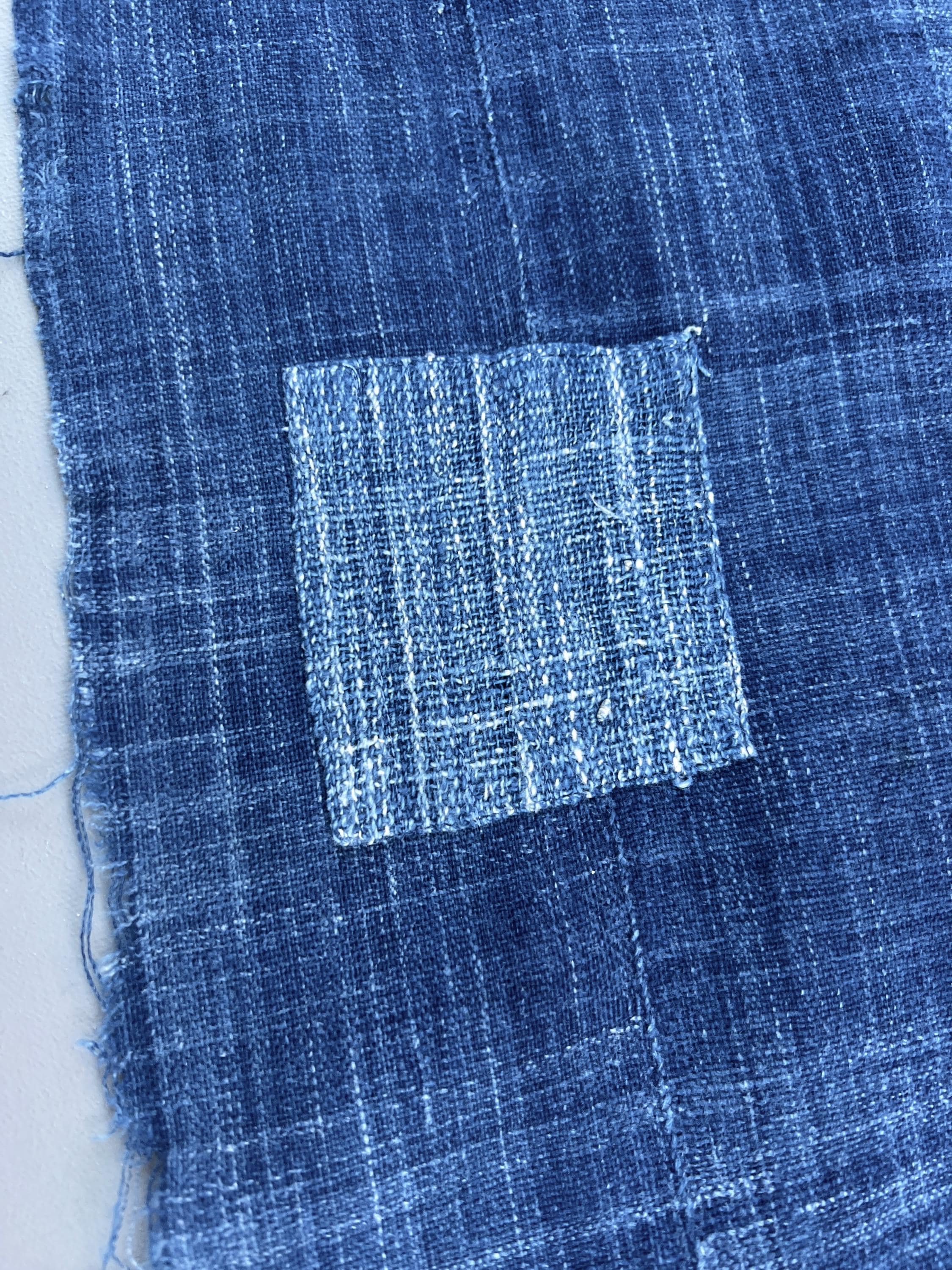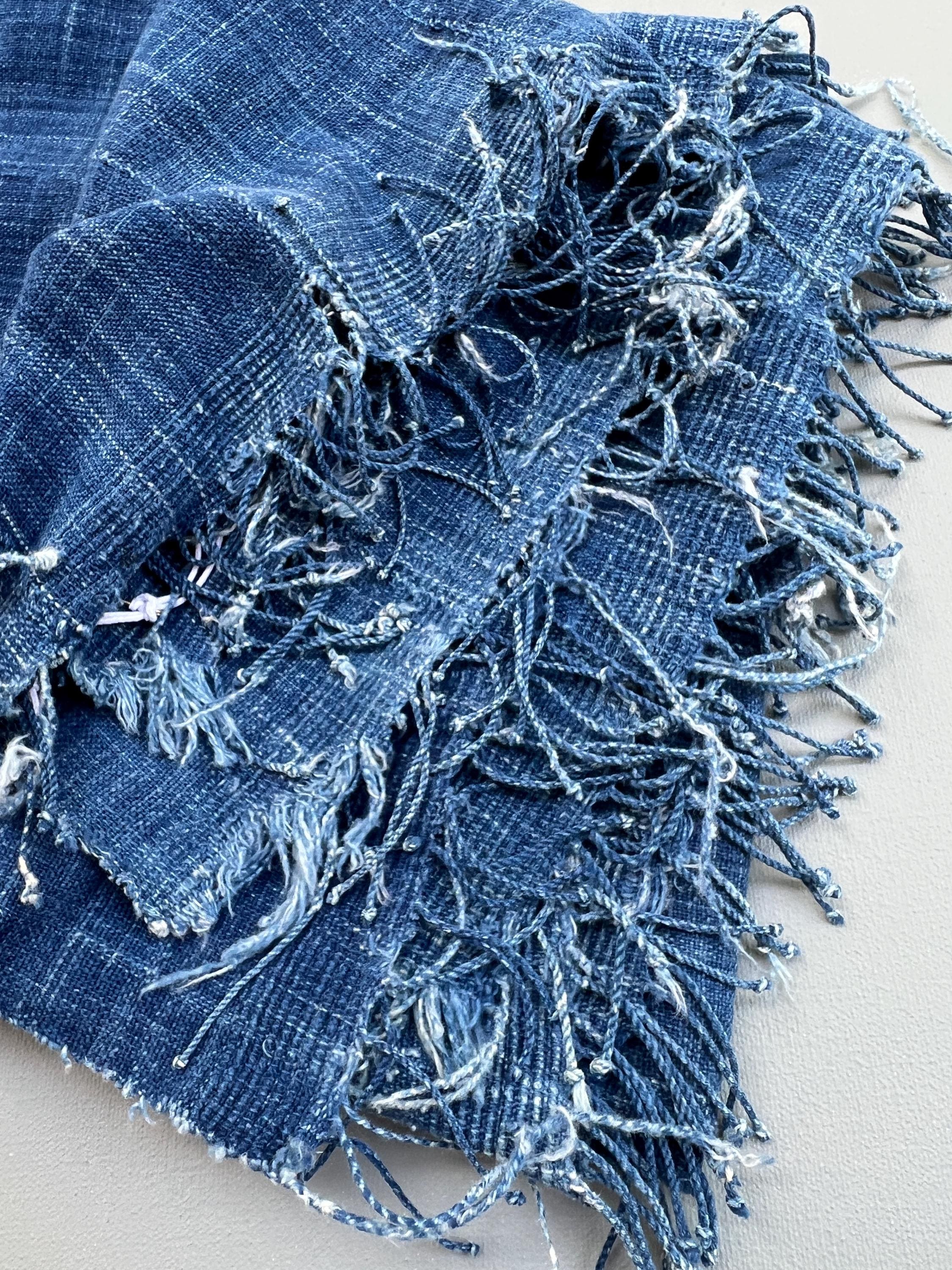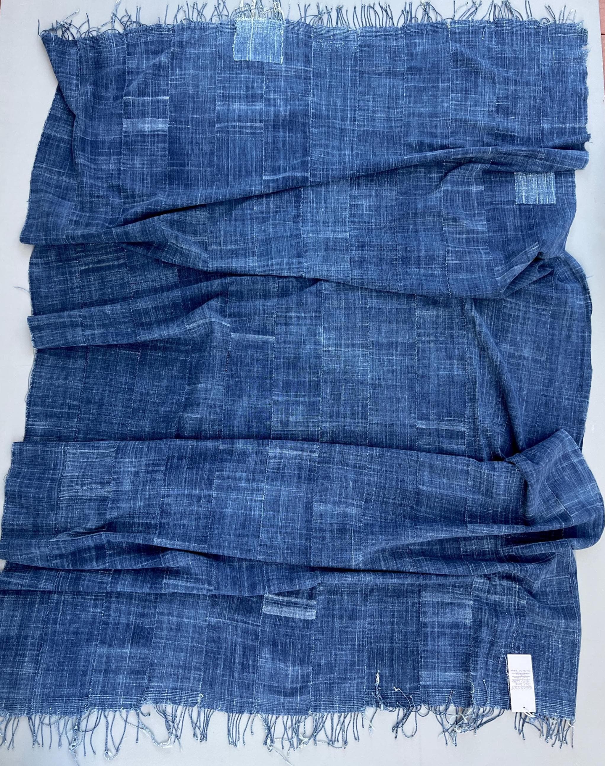 Large vintage indigo mud cloth with fringe and two repair patches. This unique textile is very clean but does have wear. Hand made textile from Burkina Faso. This throw (or wrap) is for someone who loves rustic blue jeans and doesn't mind some fraying, and enjoys the slightly worn look of a vintage find. This indigo has some light and dark areas of fading and wear. Truly a lovely piece for a coastal, farmhouse, or western vibe.