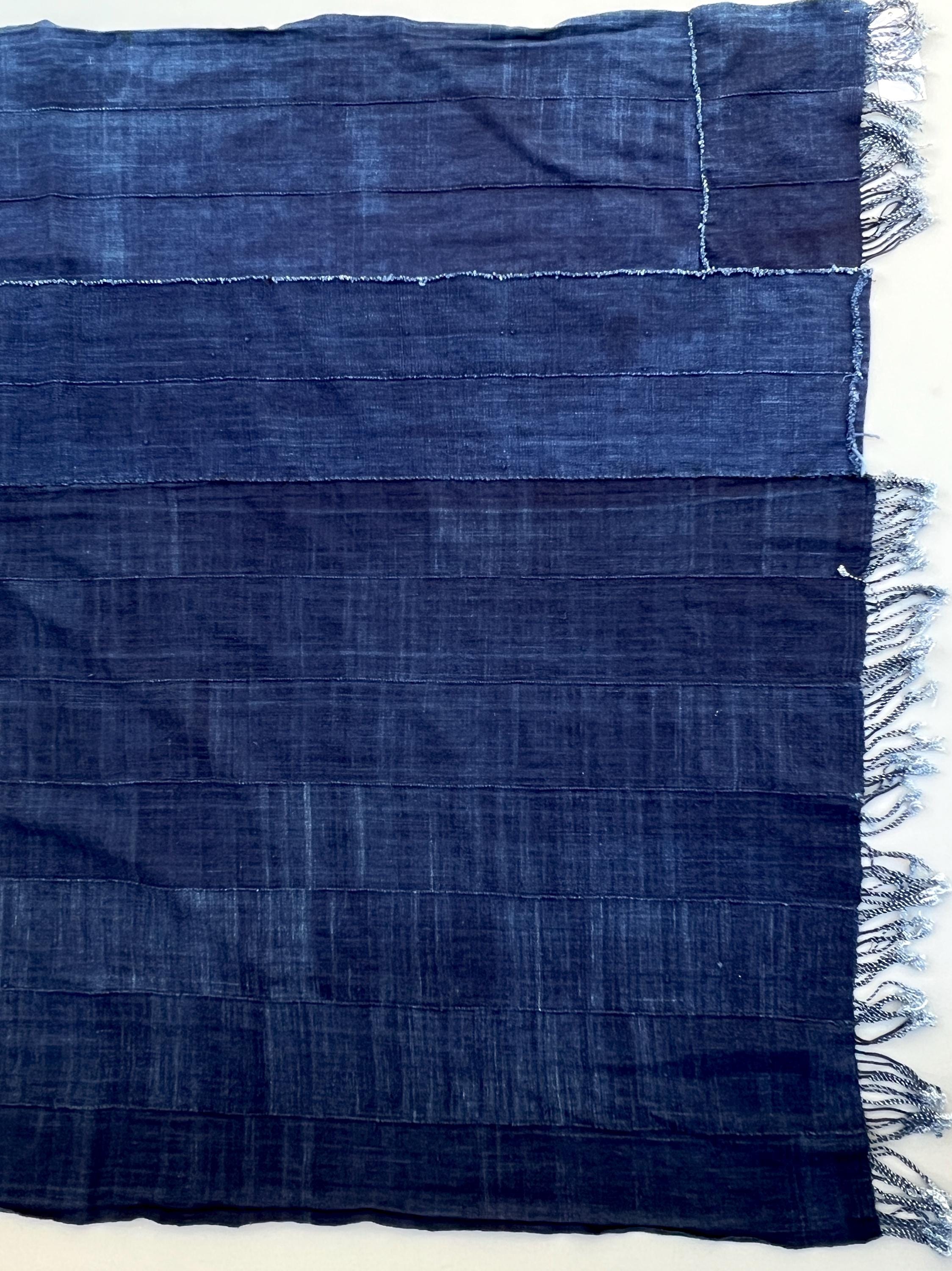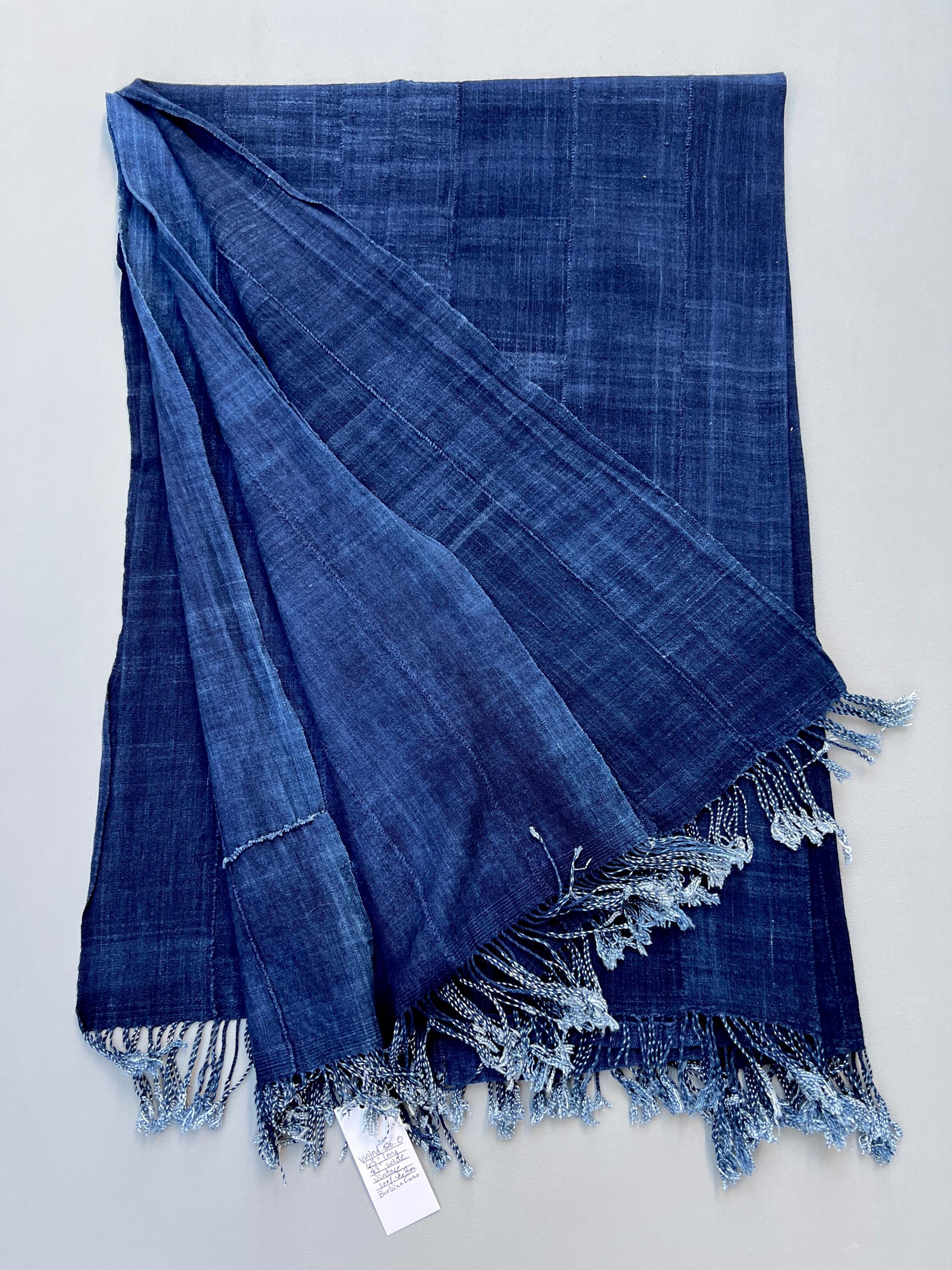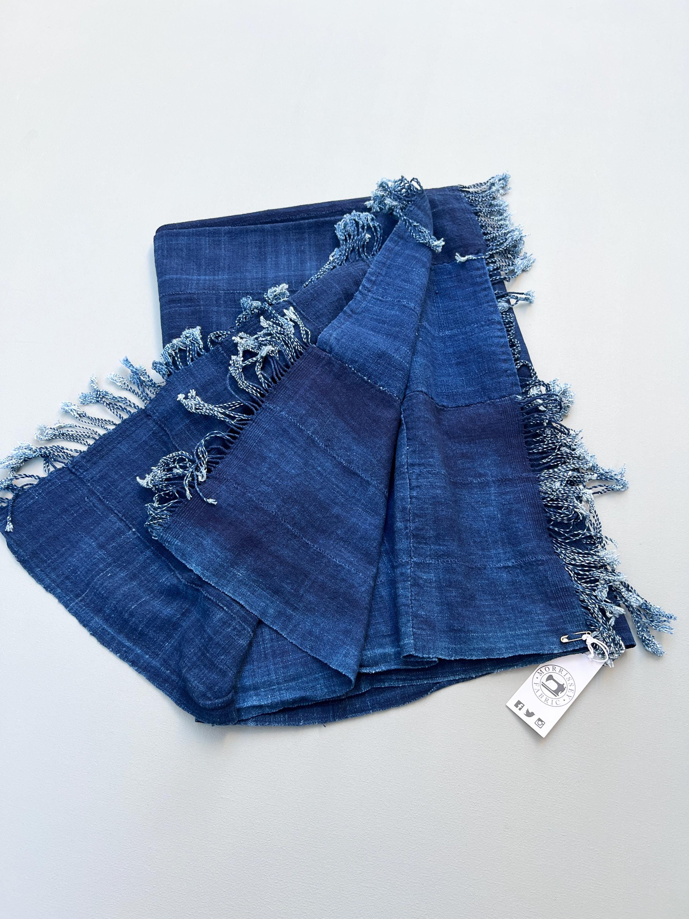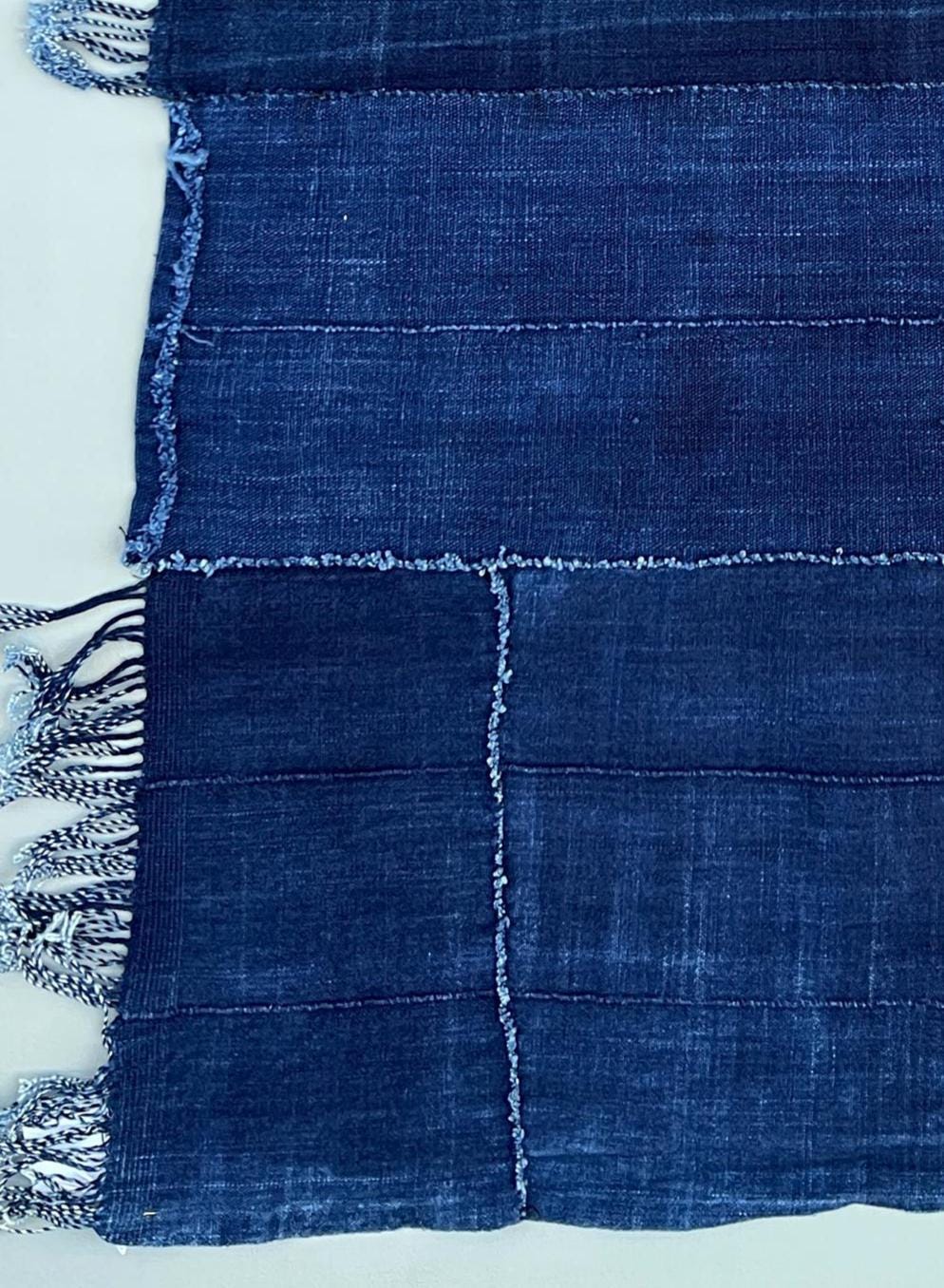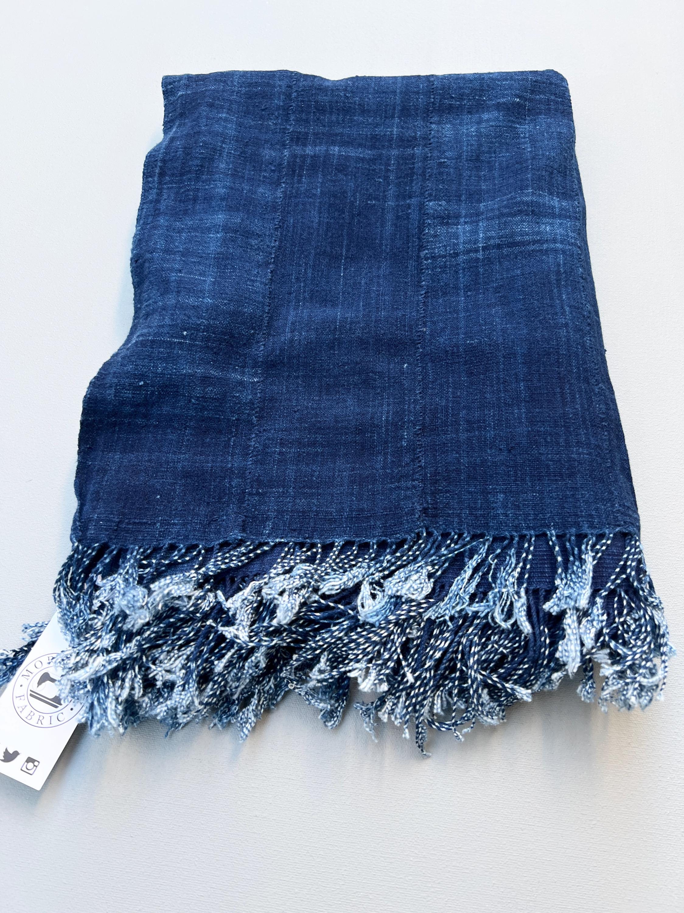 Dark blue African Indigo textile- very clean vintage mud cloth in rich dark blue. Use as a rustic bed throw or make into pillows. Heavy enough for light upholstery. Blue jeans-like cotton fabric with fringe- Hand made textile vintage piece from Burkina Faso, Africa.
