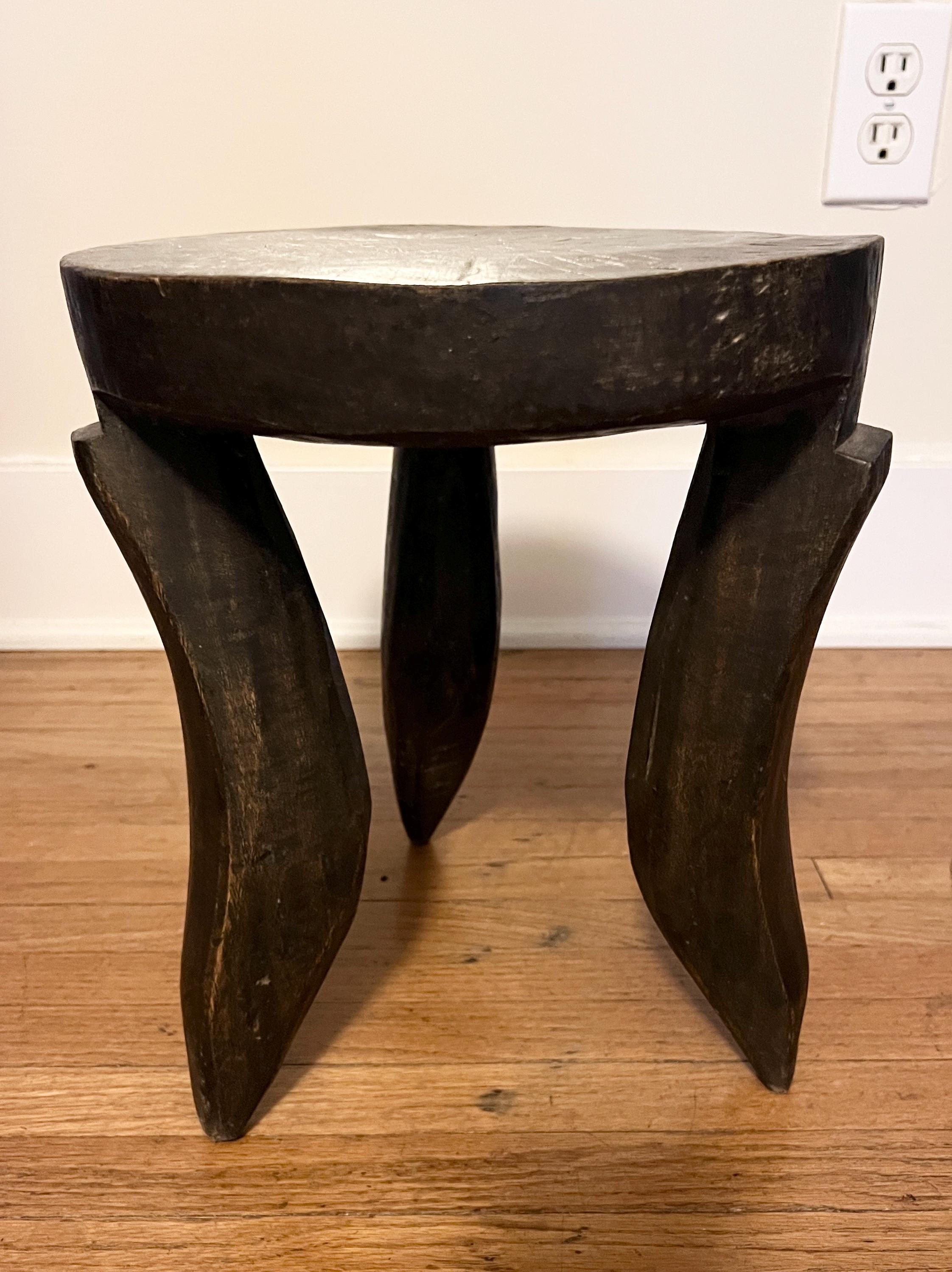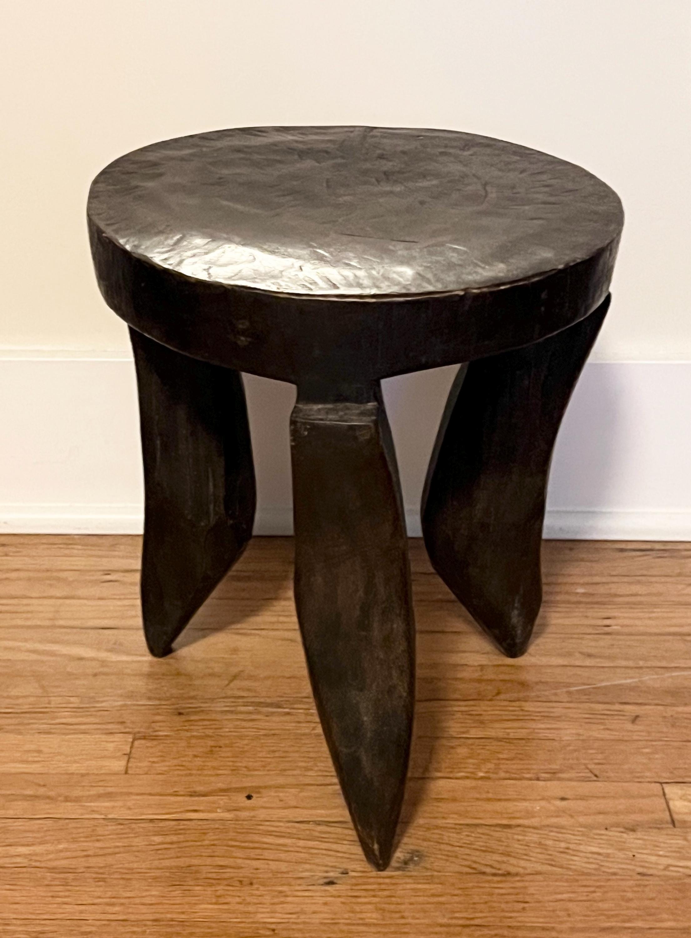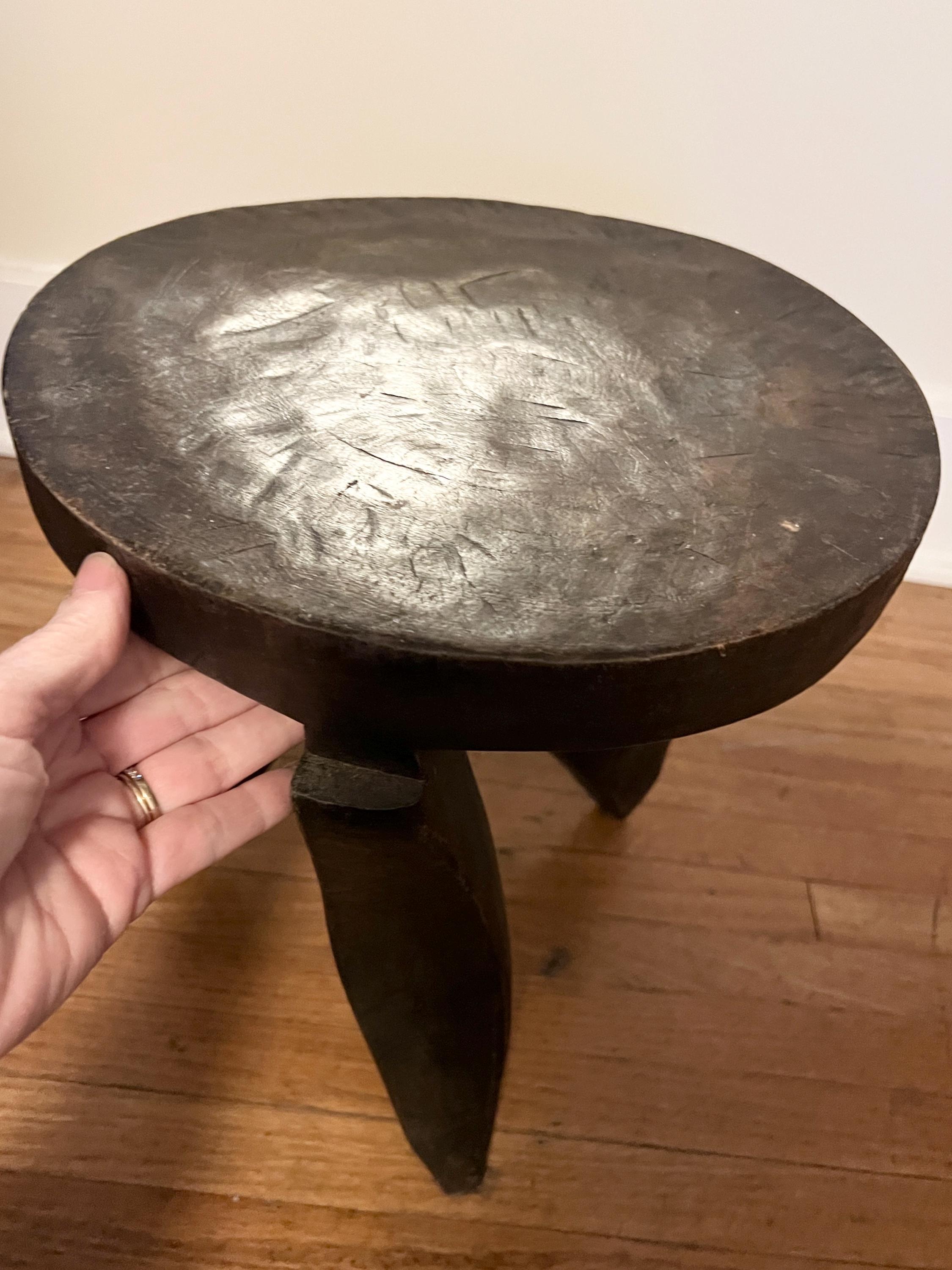 Hand carved African stool made of solid wood. Colored by hand to look like dark mahogany or ebony. This vintage rustic stool design will make an excellent plant stand or table top display accessory.
