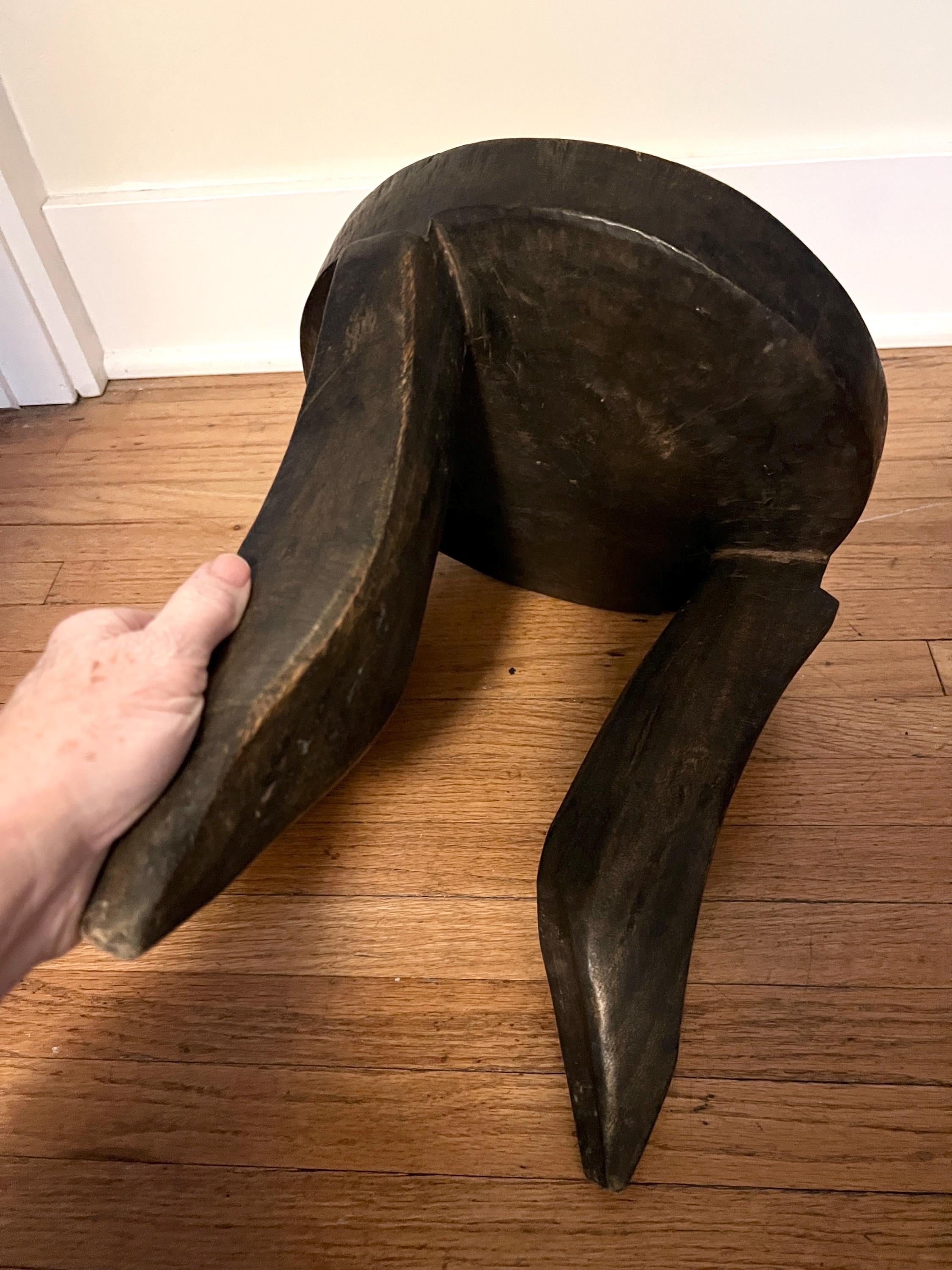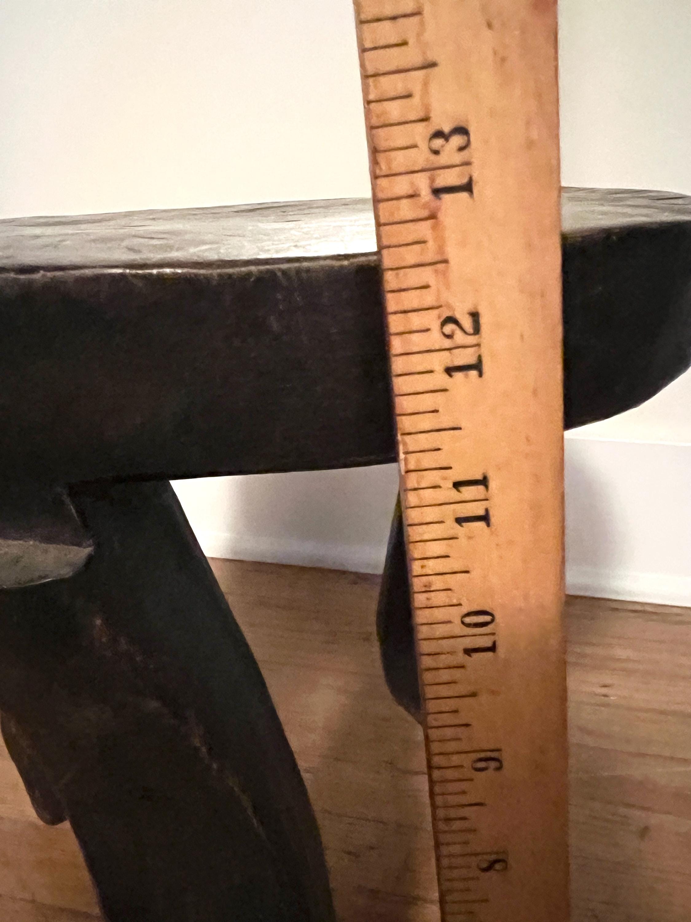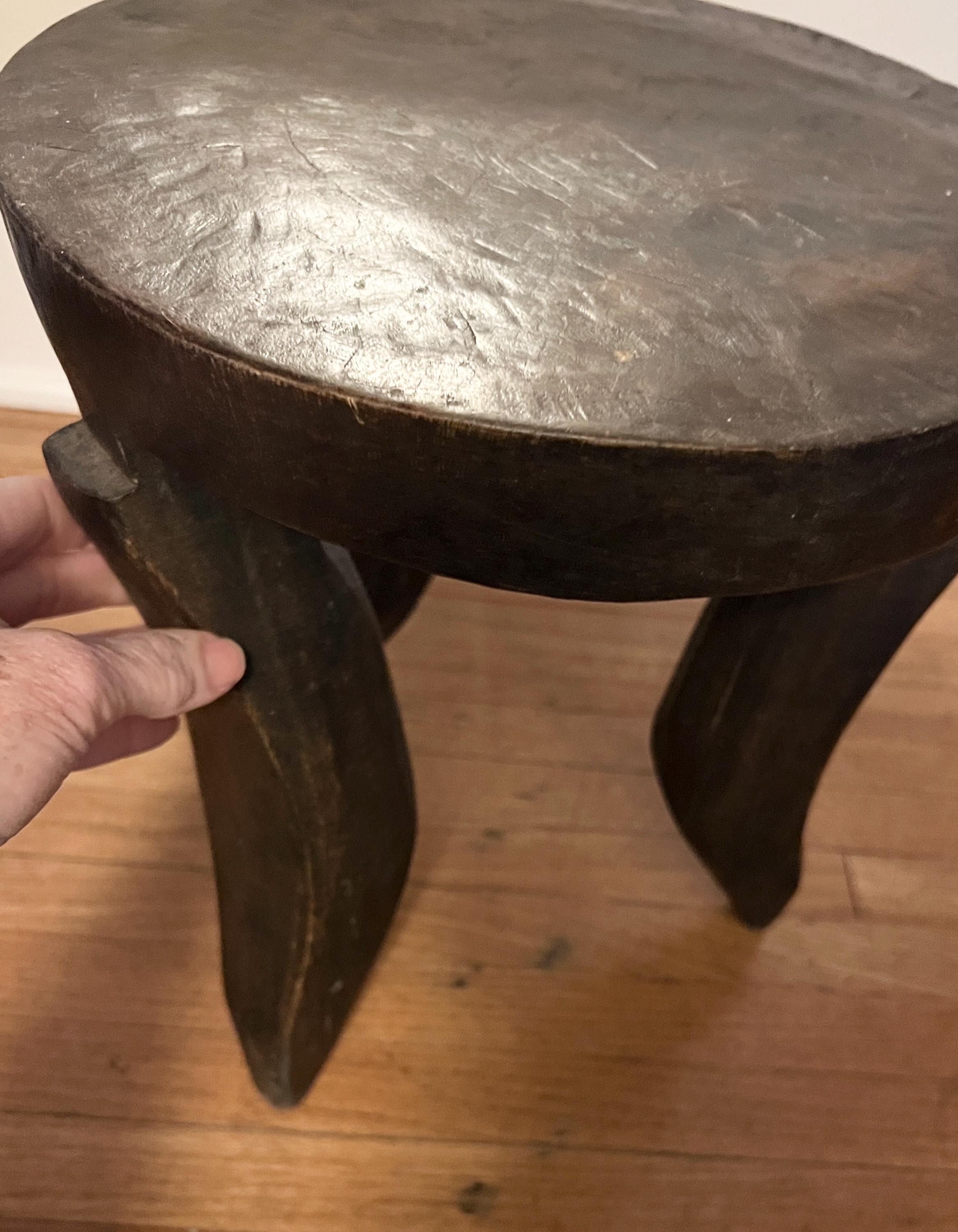 Hand carved African stool made of solid wood. Colored by hand to look like dark mahogany or ebony. This vintage rustic stool design will make an excellent plant stand or table top display accessory.