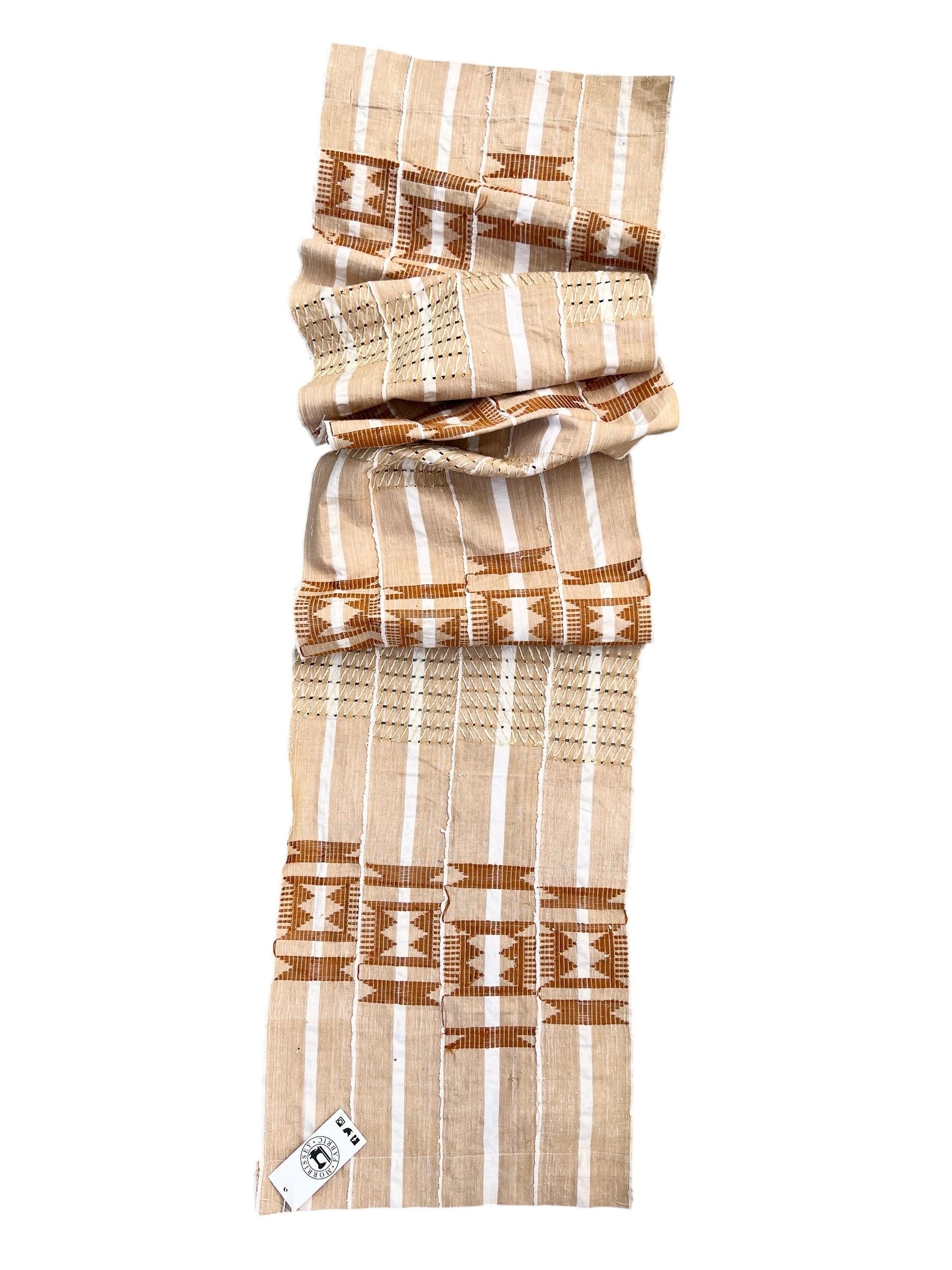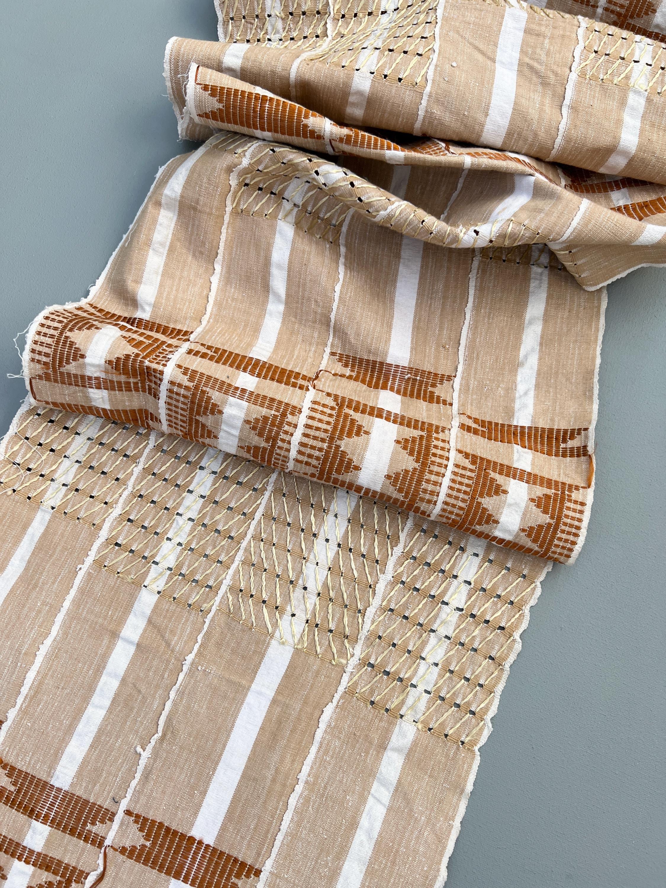 A hand crafted piece of African Aso Oke cloth like this will make one of a kind accent pillow covers, or use for upholstery, or on the foot of a bed. Crisp cotton hand with heavier areas where the designs are stitched. Good medium weight.