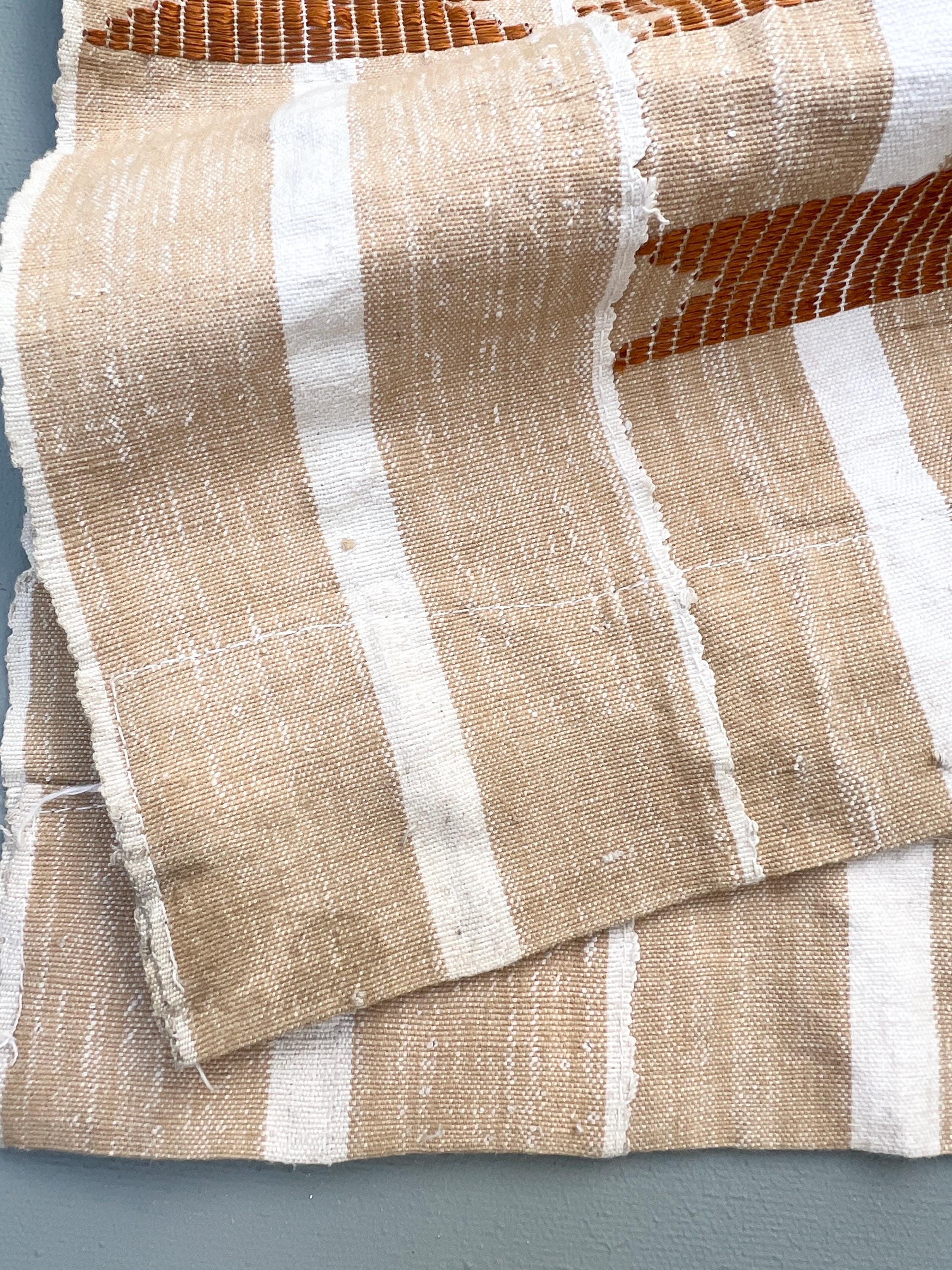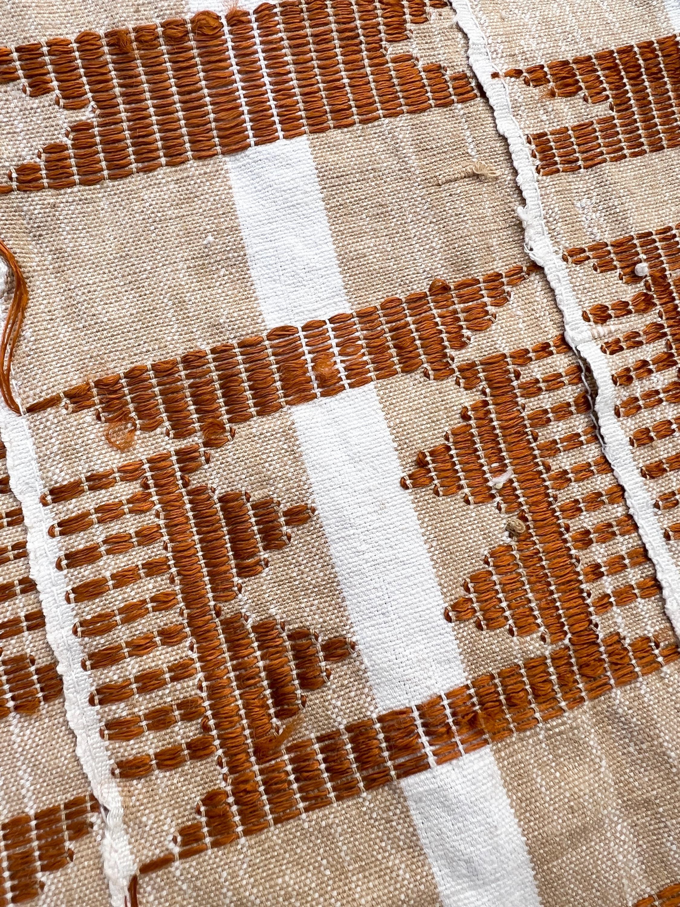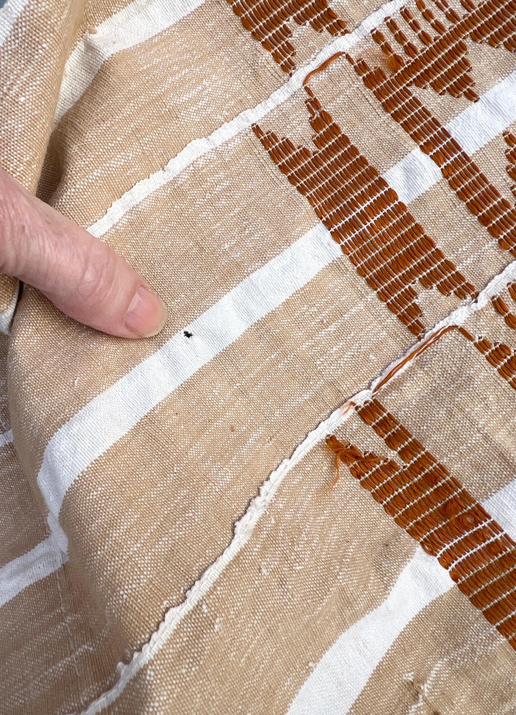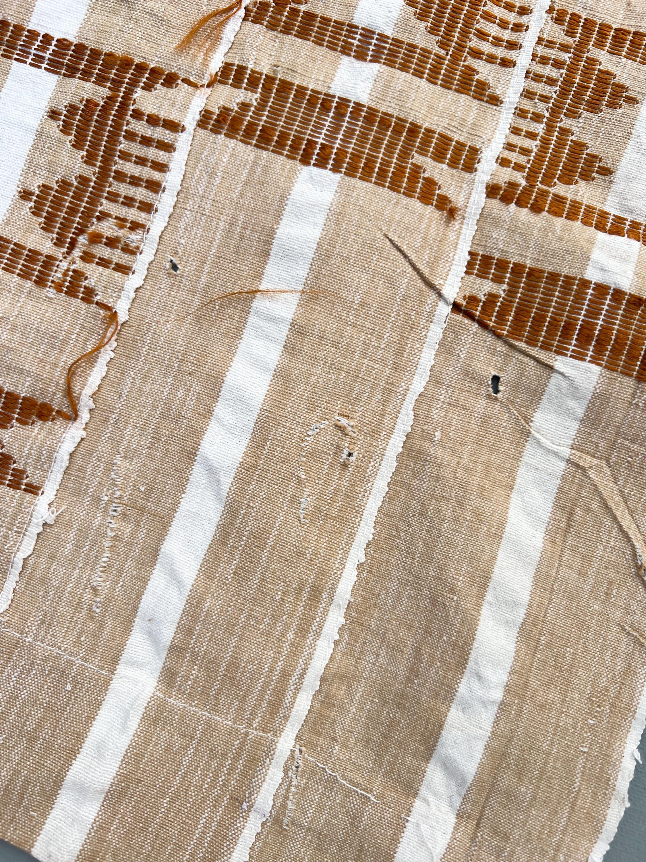 Neutral rust pattern woven on a warm beige and white yarn-dyed stripe backdrop. Tribal designs all stitched on top. Good vintage condition but please examine photos for some very small holes.