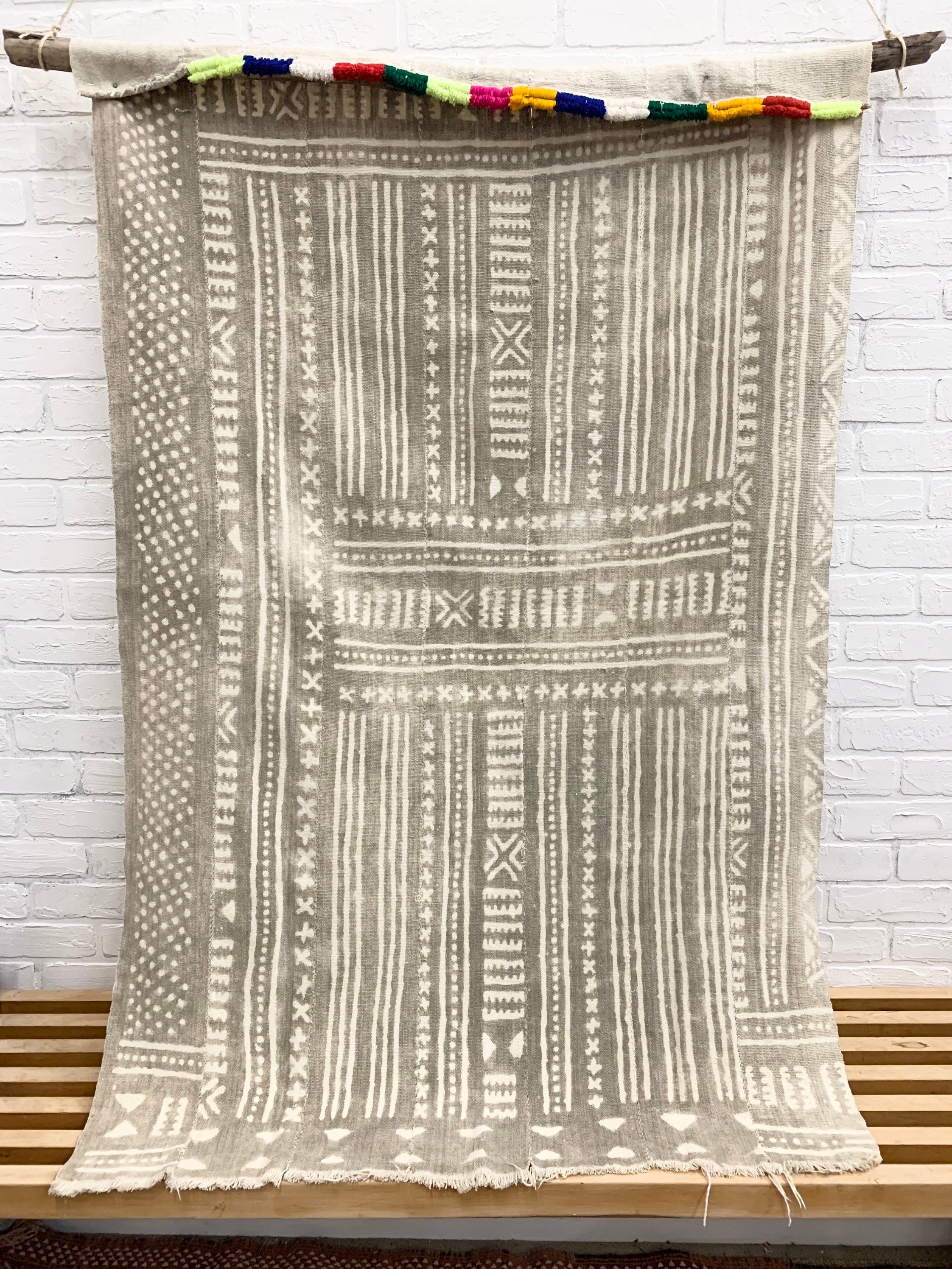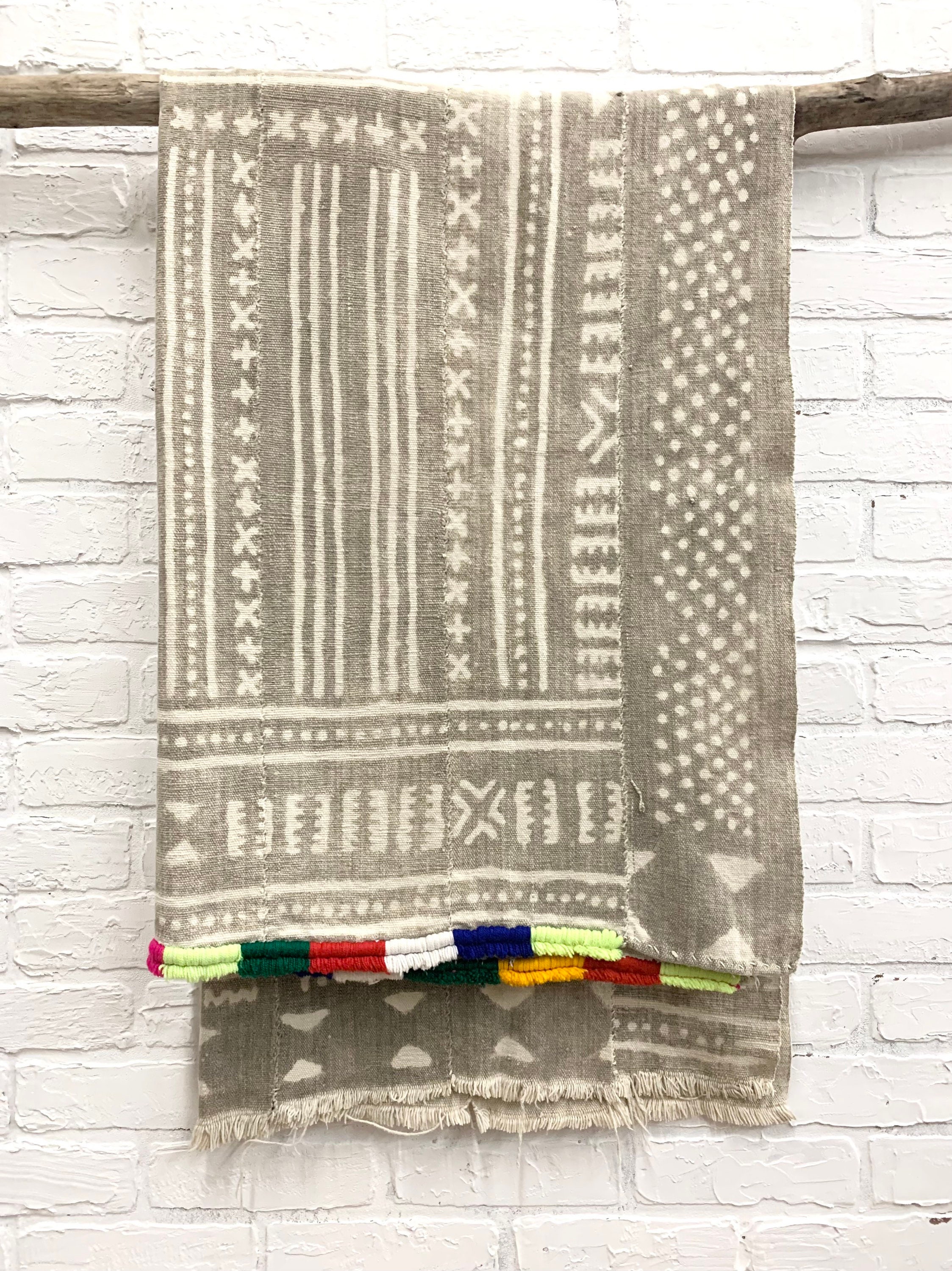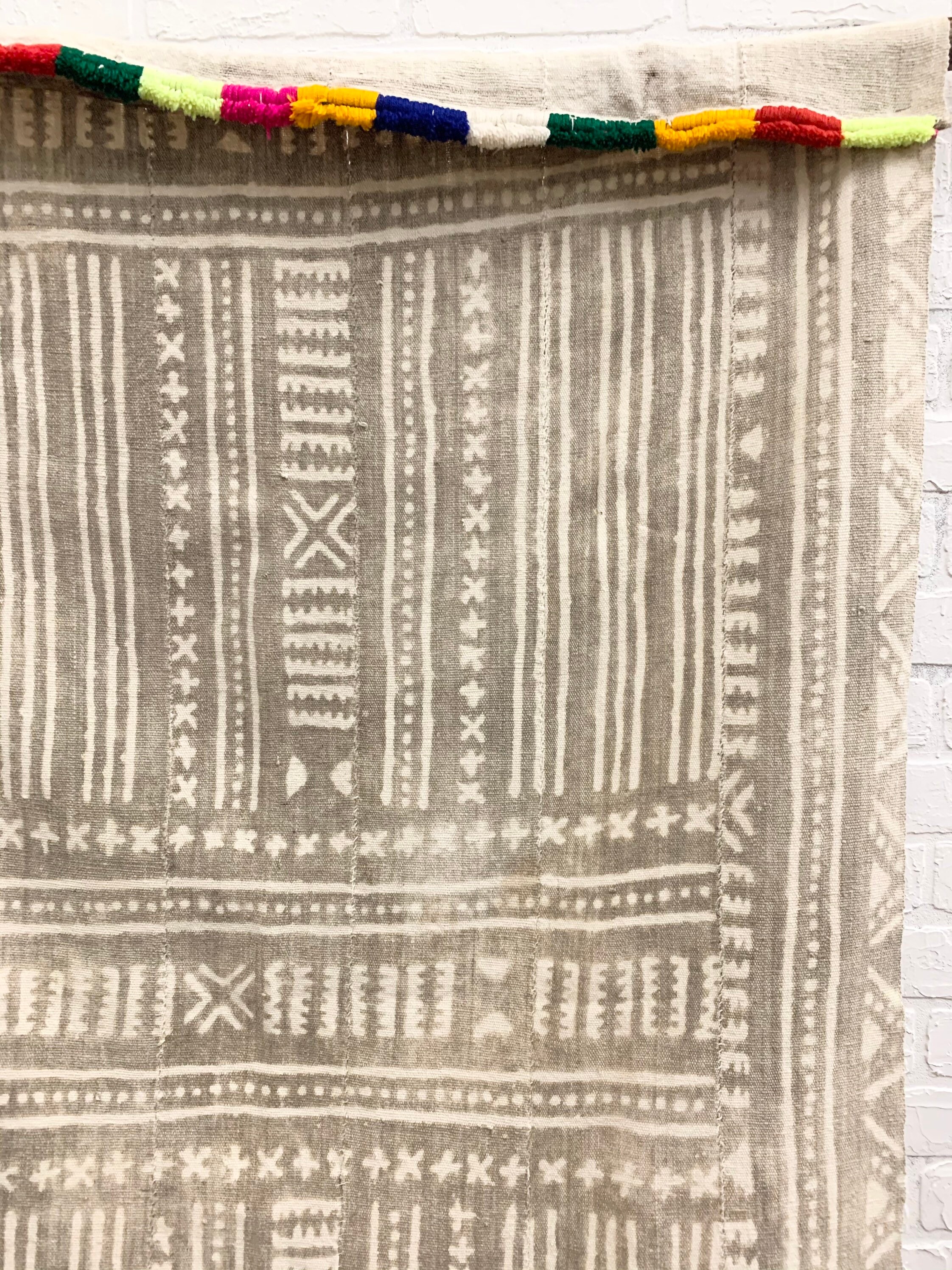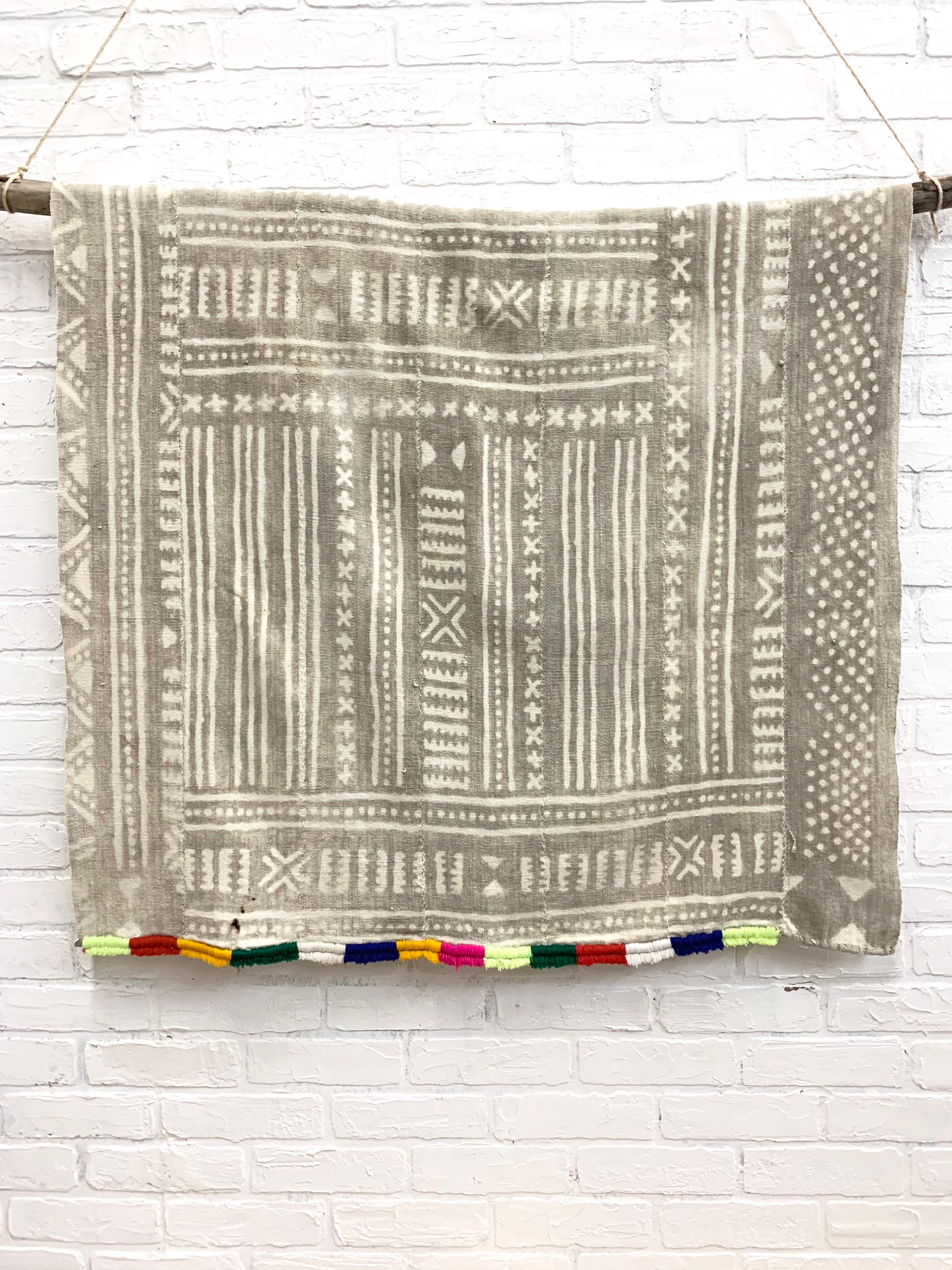 Authentic Vintage African Mud cloth textile. This is a one of a kind Bogolan with a colorful fringe at one end. These textiles originate from Mali, Africa.